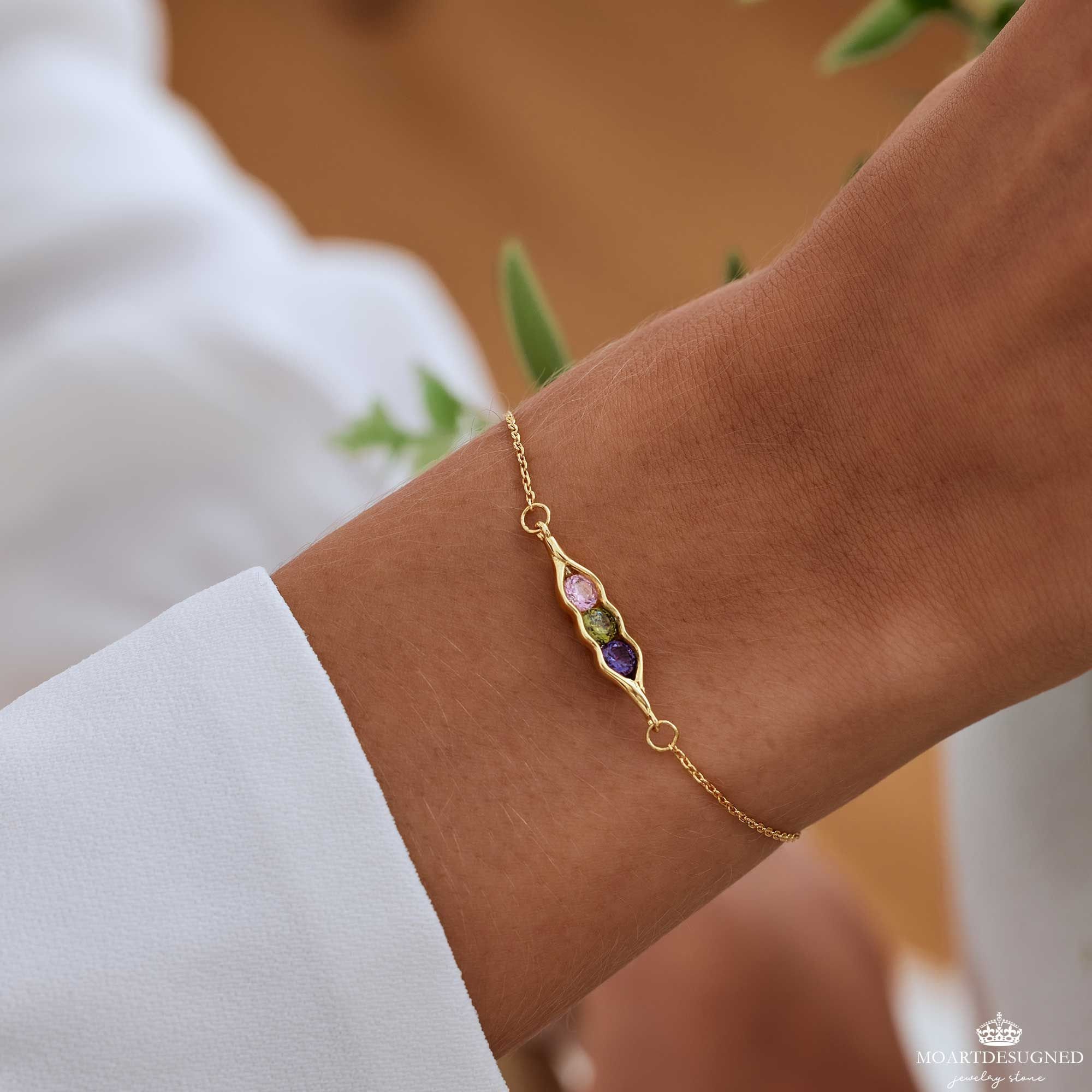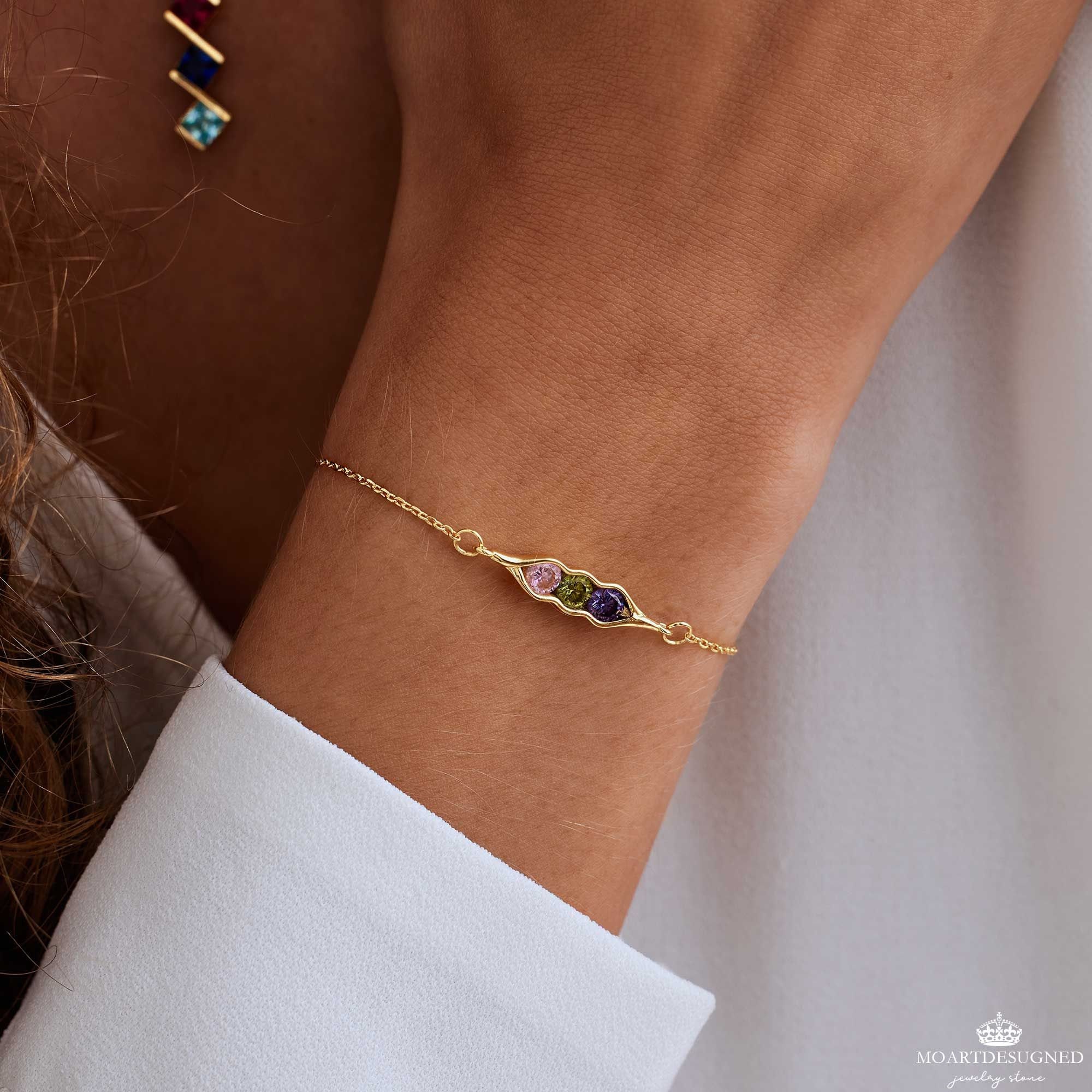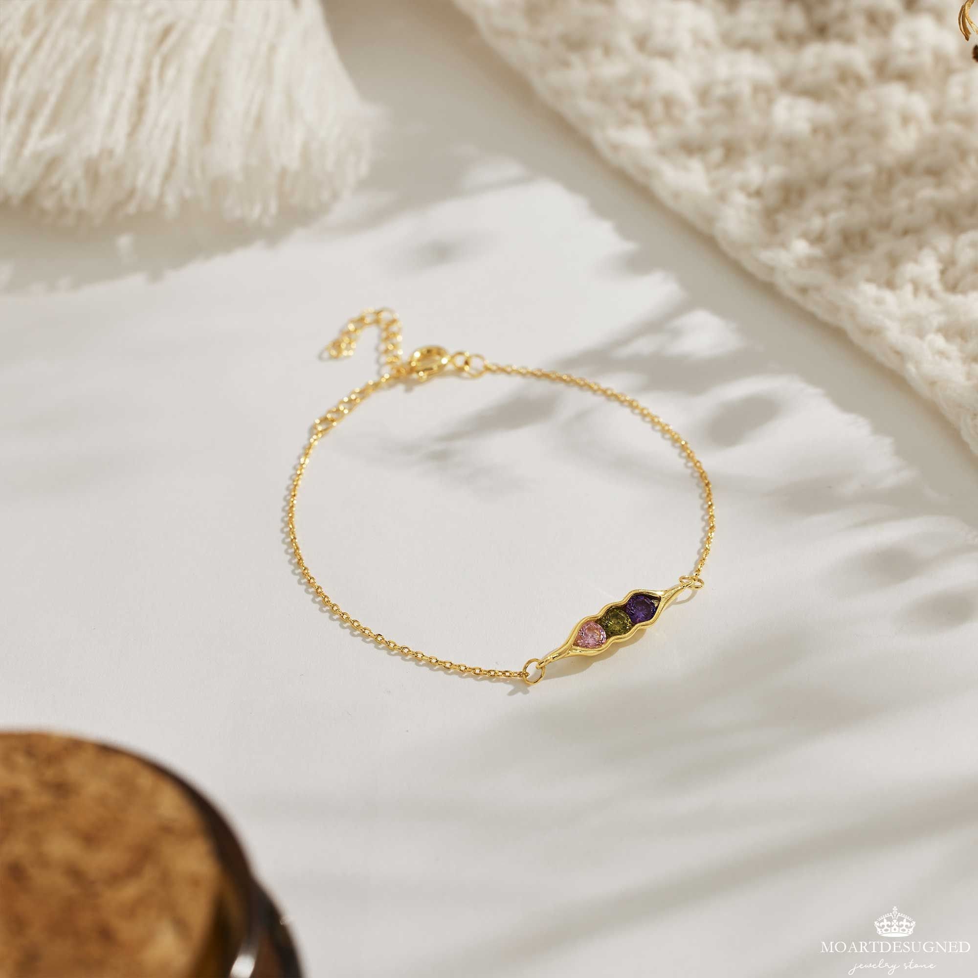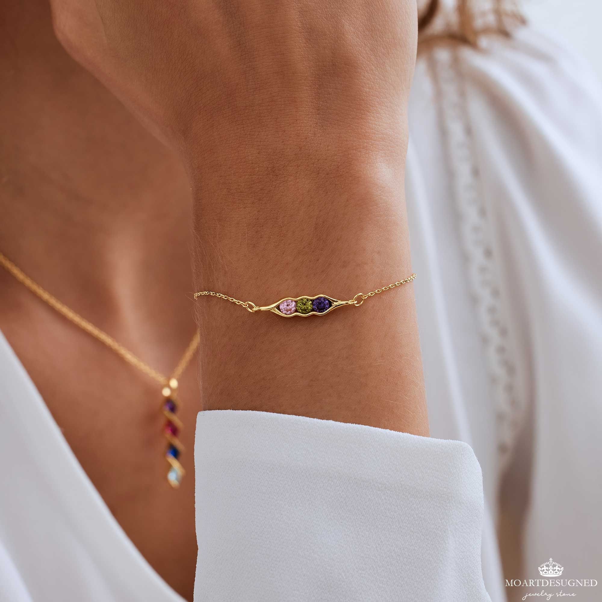 18k Gold Personalised Peas in a Pod Birthstone Bracelet,Dainty Bracelet, Family Bracelet, Anniversary Gift for Her,Mothers Day Gift for Mom