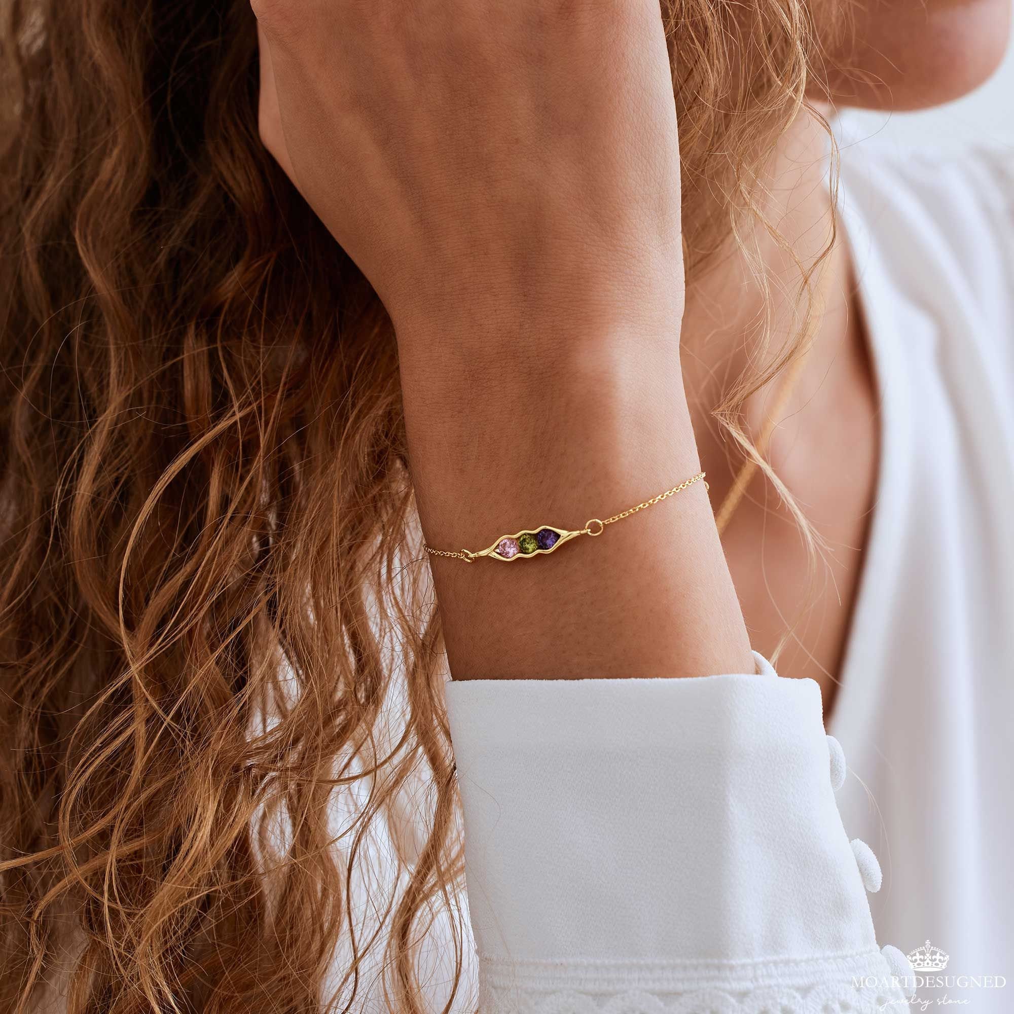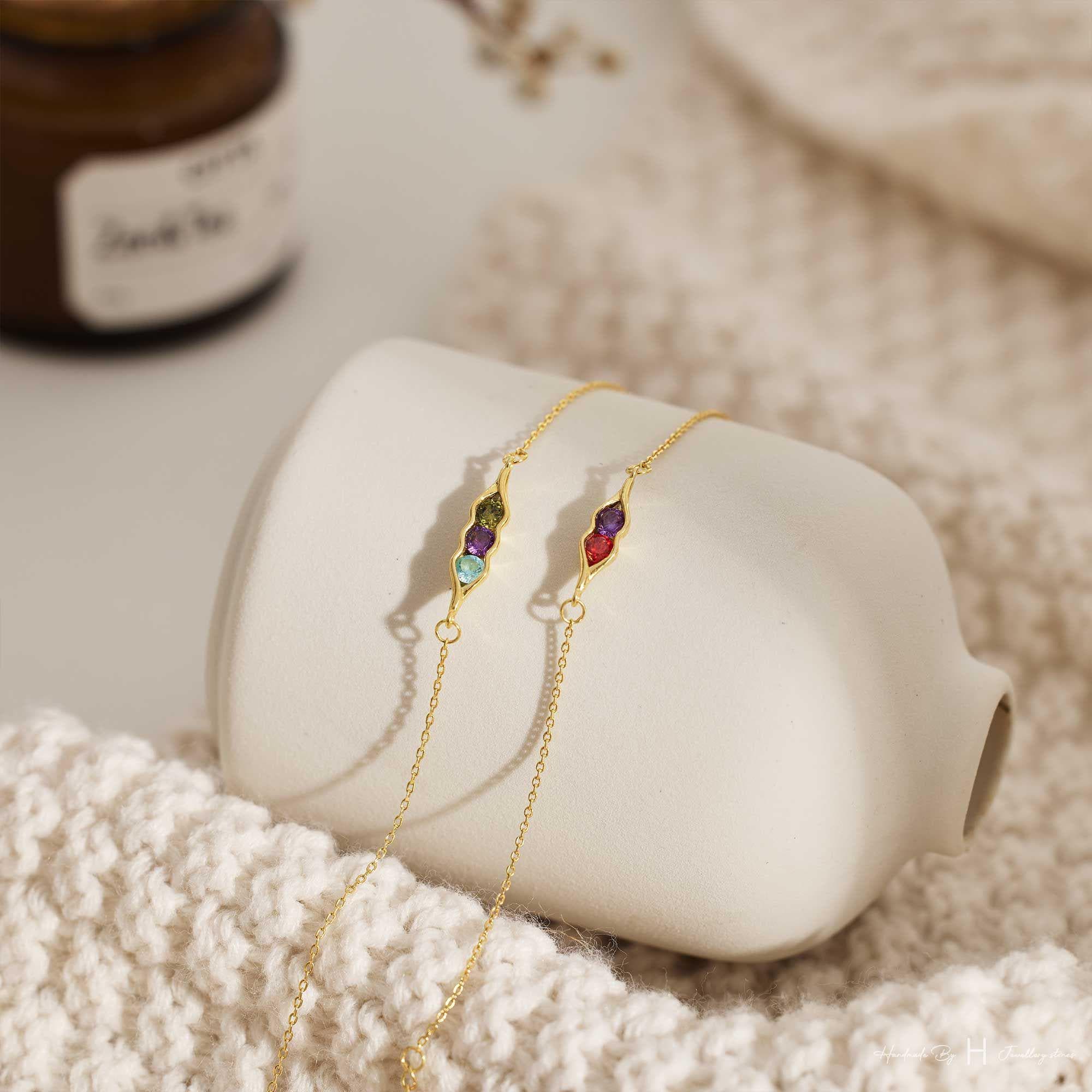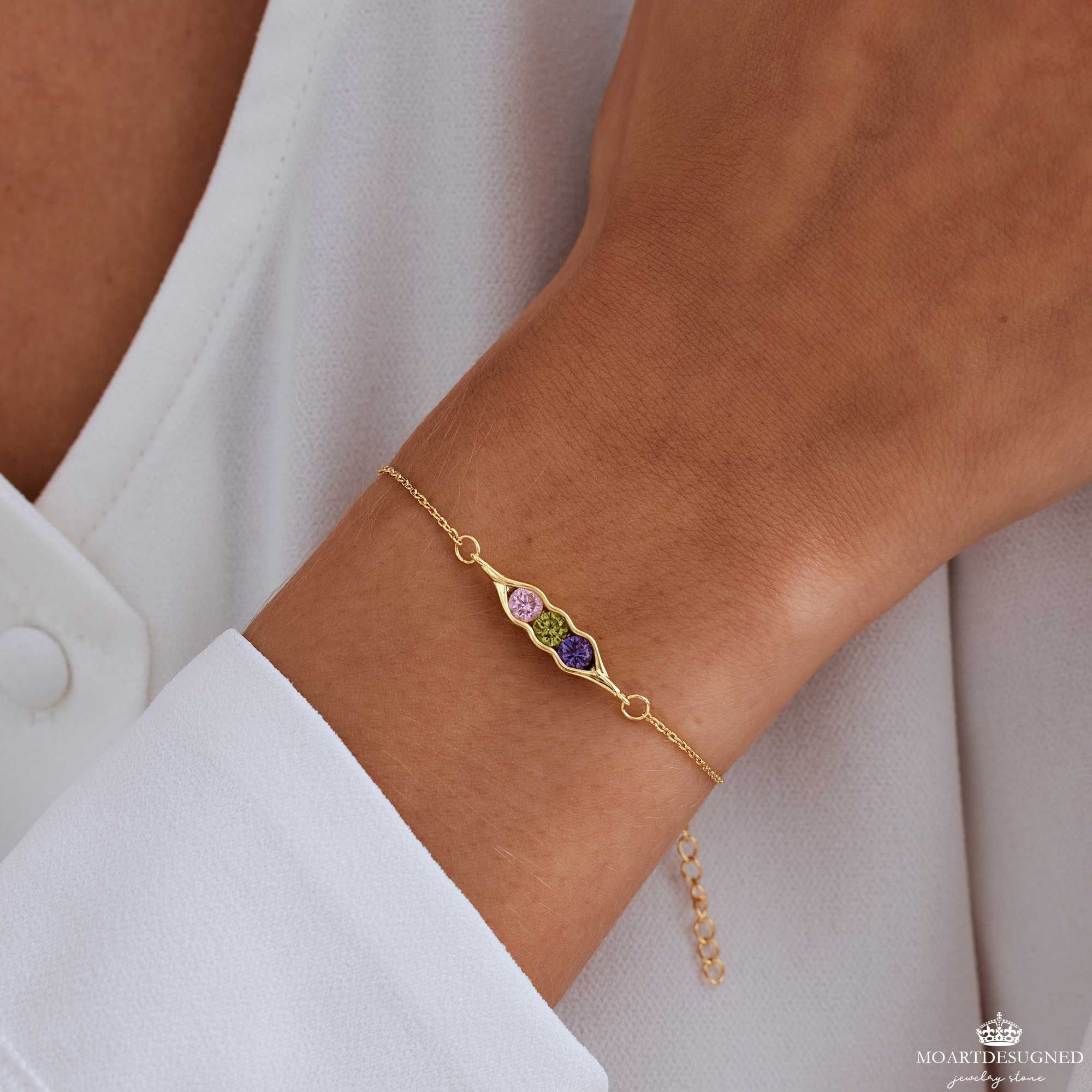 18k Gold Personalised Peas in a Pod Birthstone Bracelet,Dainty Bracelet, Family Bracelet, Anniversary Gift for Her,Mothers Day Gift for Mom
