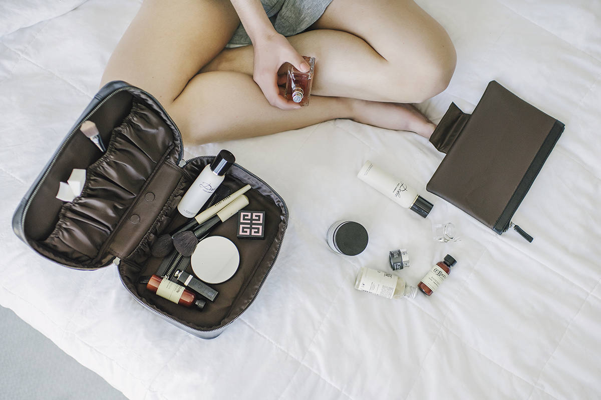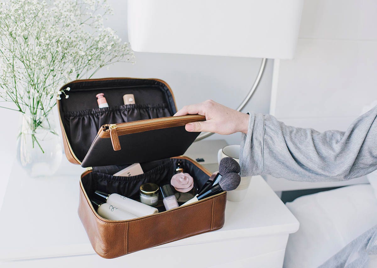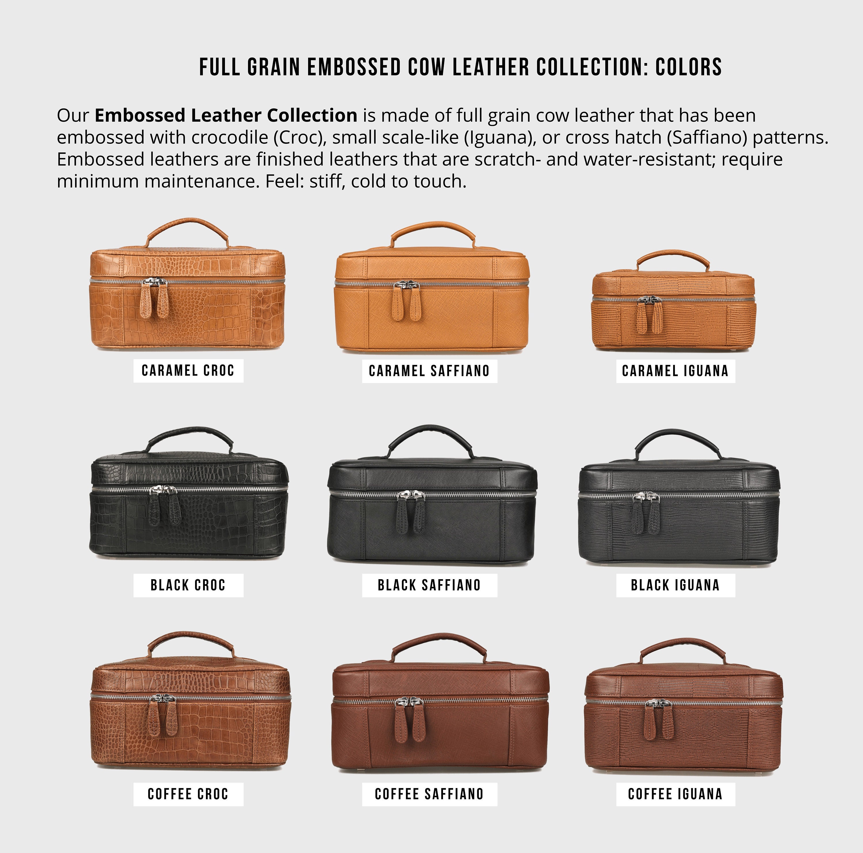 We crafted this elegant makeup bag from durable full-grain cowhide leather, industrial-strength gold and silver hardware, and a waterproof lining. This makeup bag is unisex and makes a great makeup bag or toiletry bag. It's large enough to hold all of your makeup and toiletries, and organized enough to keep everything in place. This makeup bag features 4 elastic pockets for bottles, tubes, razors, and more, a removable zippered pocket with magnetic button for intimate items, and 1 open elastic pocket for smaller essentials. This bag features a two-way industrial-strength zipper for easy locking, and padded handles that make it super easy to carry.