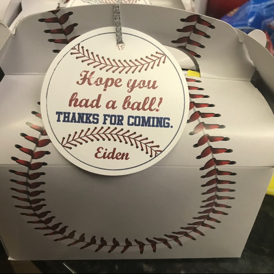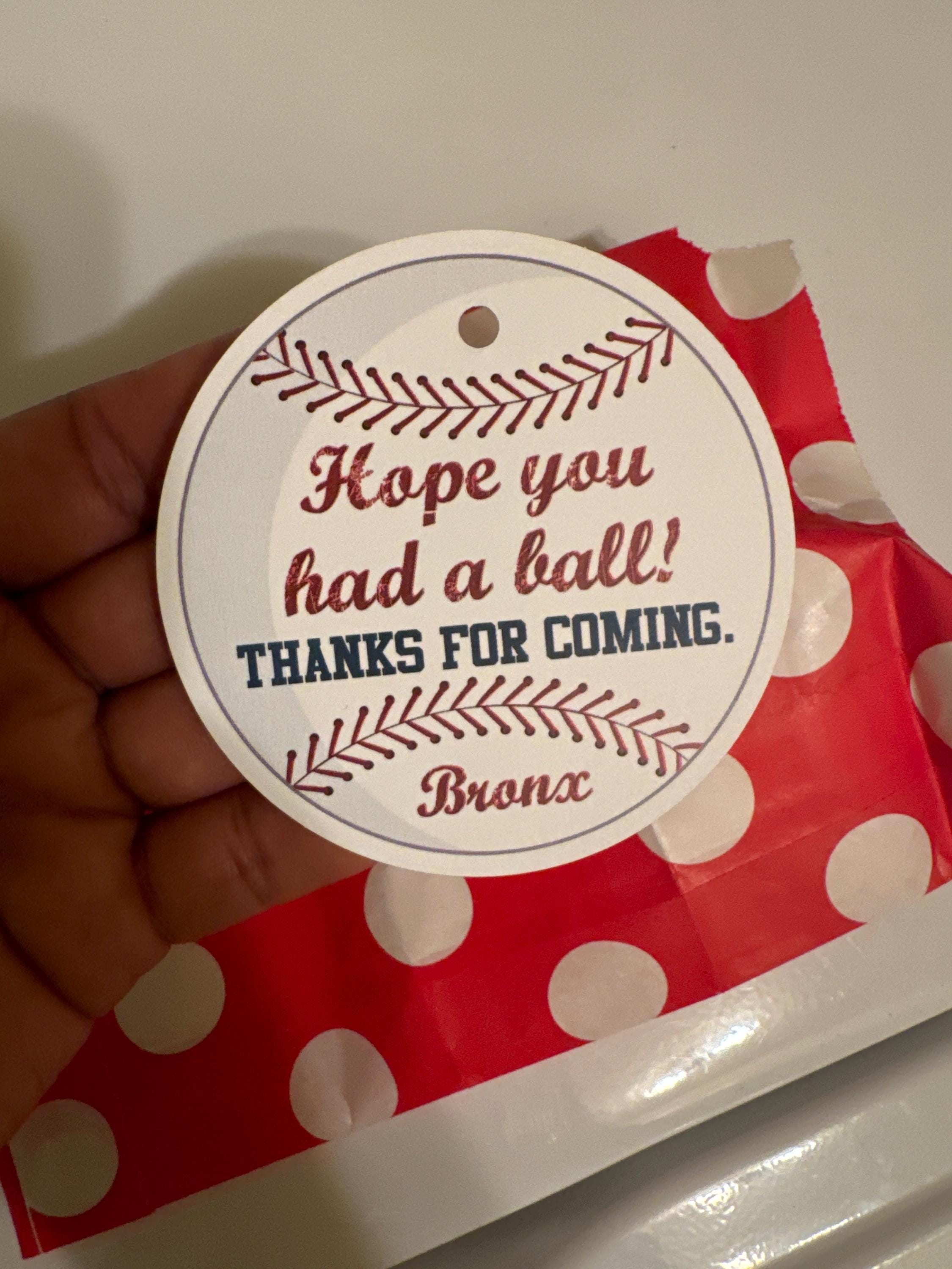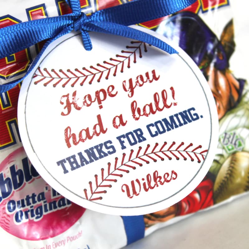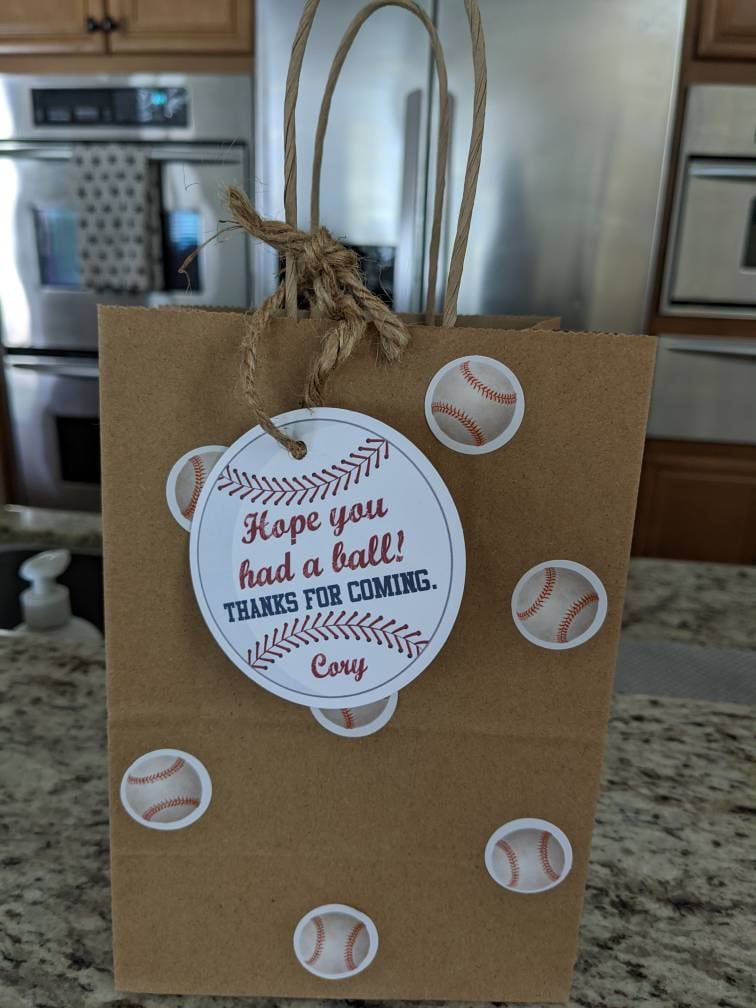 Each tag features a baseball image and personalized with the birthday child's name. The finished tag is 3" in diameter and comes with a hole punch at the top of the tag. Ribbon or baker's twine can threaded through and tied to your favor or snack.
