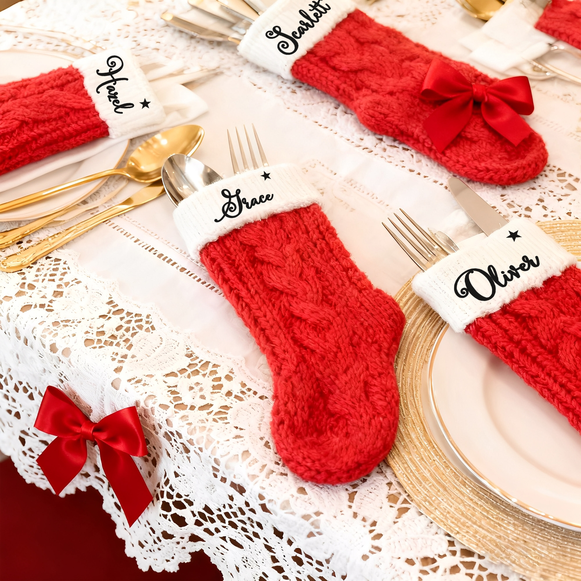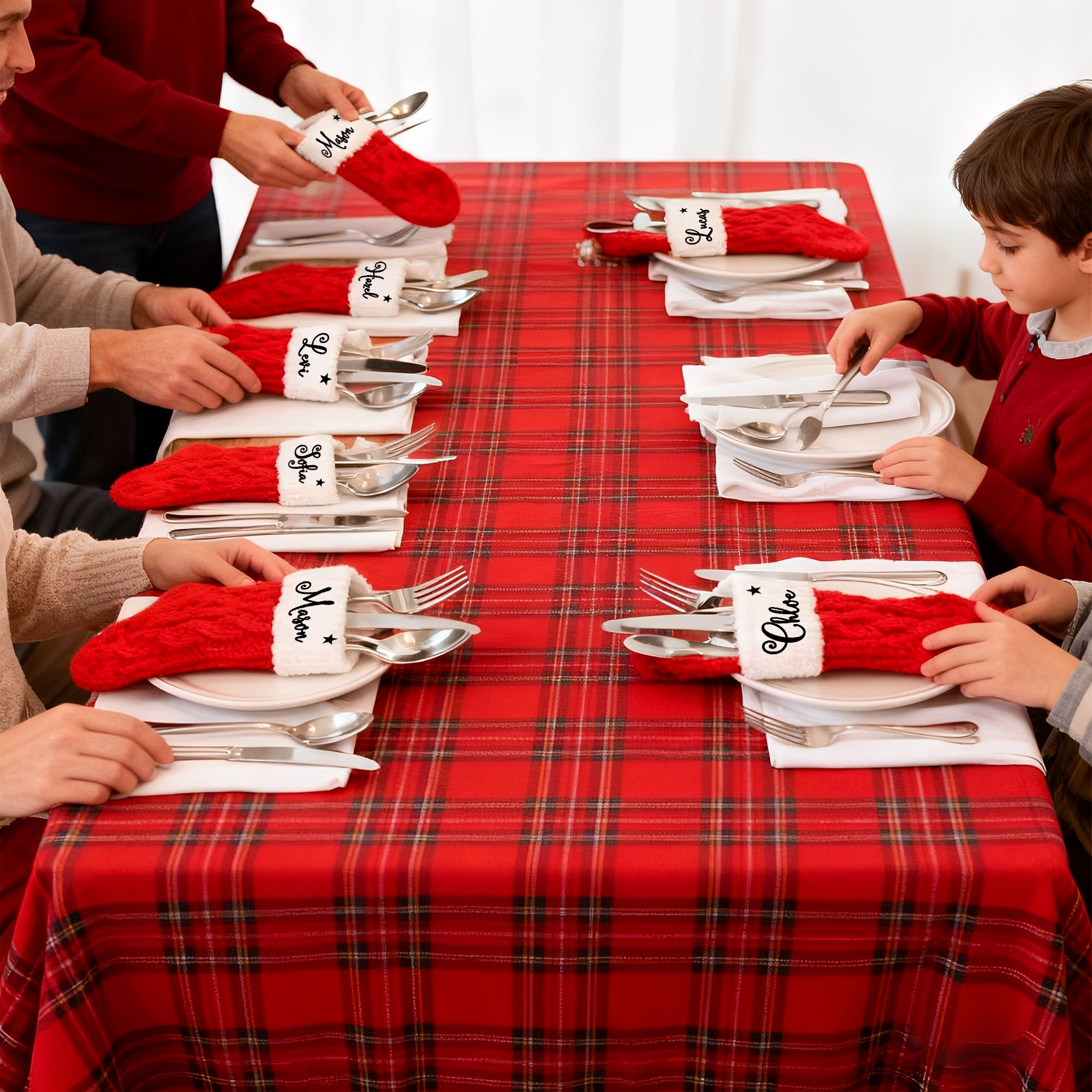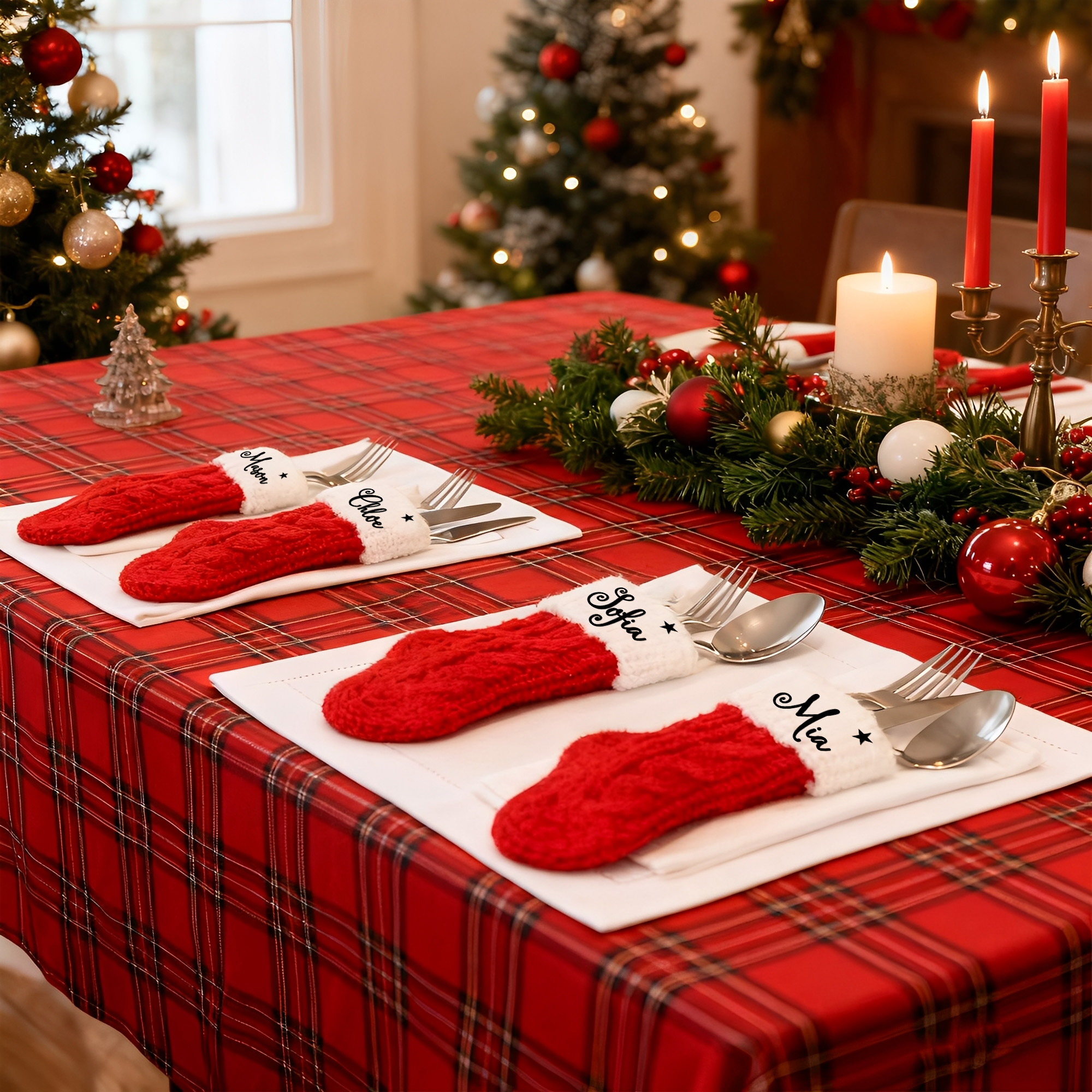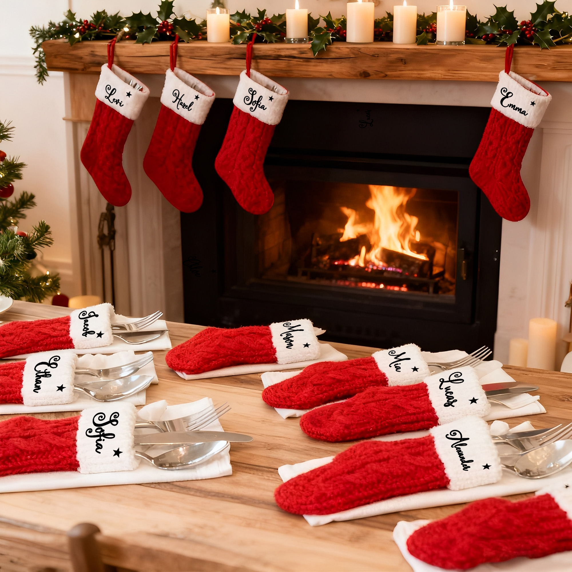 Each Christmas stocking cutlery holder is designed to accommodate a fork, knife, and spoon, making it perfect for your festive dinner or party. This unique piece enhances the holiday atmosphere, creating a warm and inviting setting for your family and guests. With personalized name tags, each setting becomes a special and memorable experience, making your table both practical and festive.