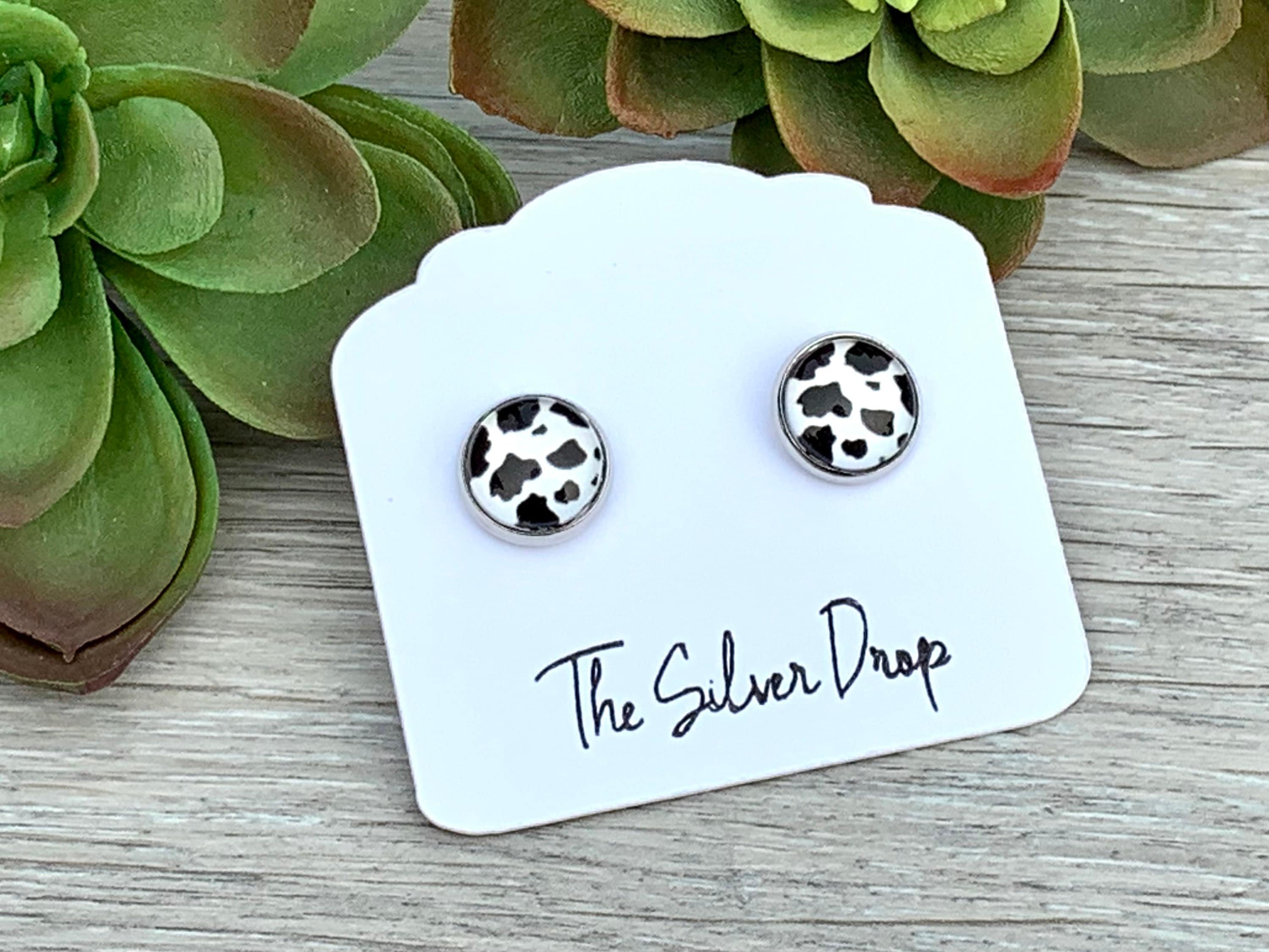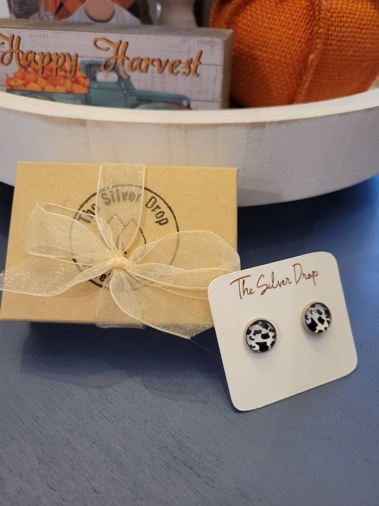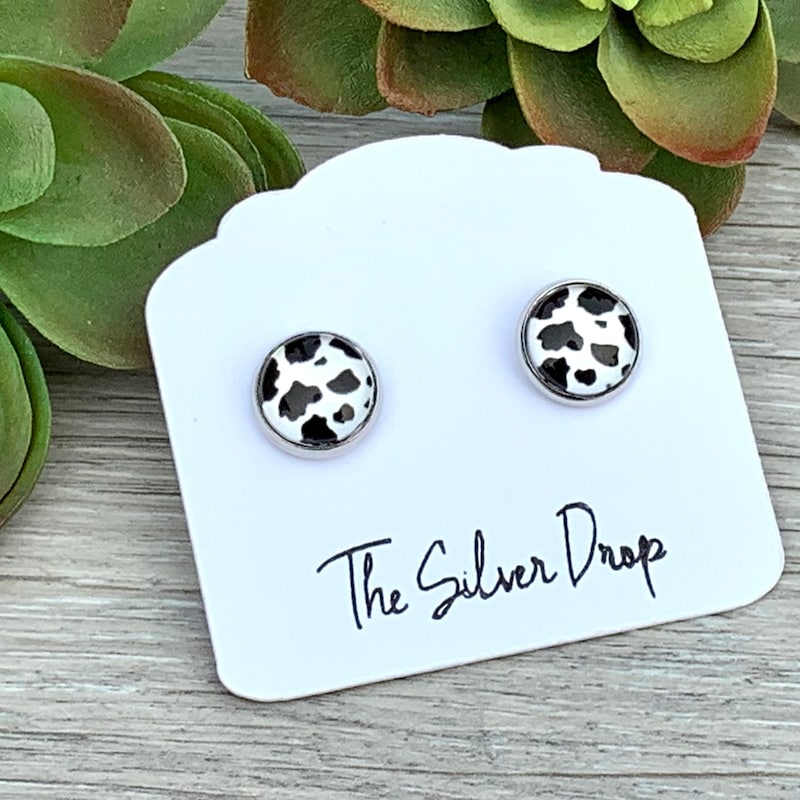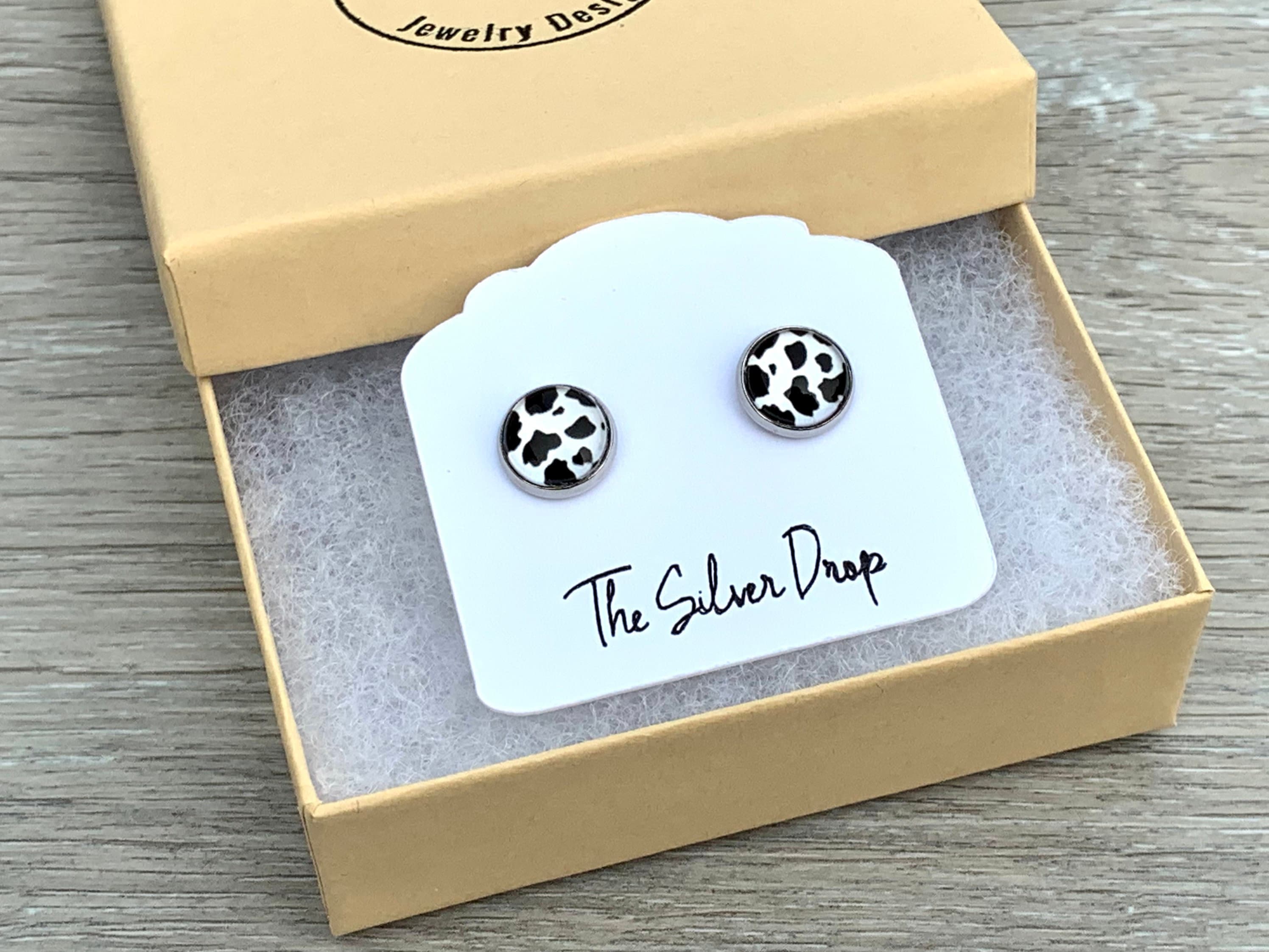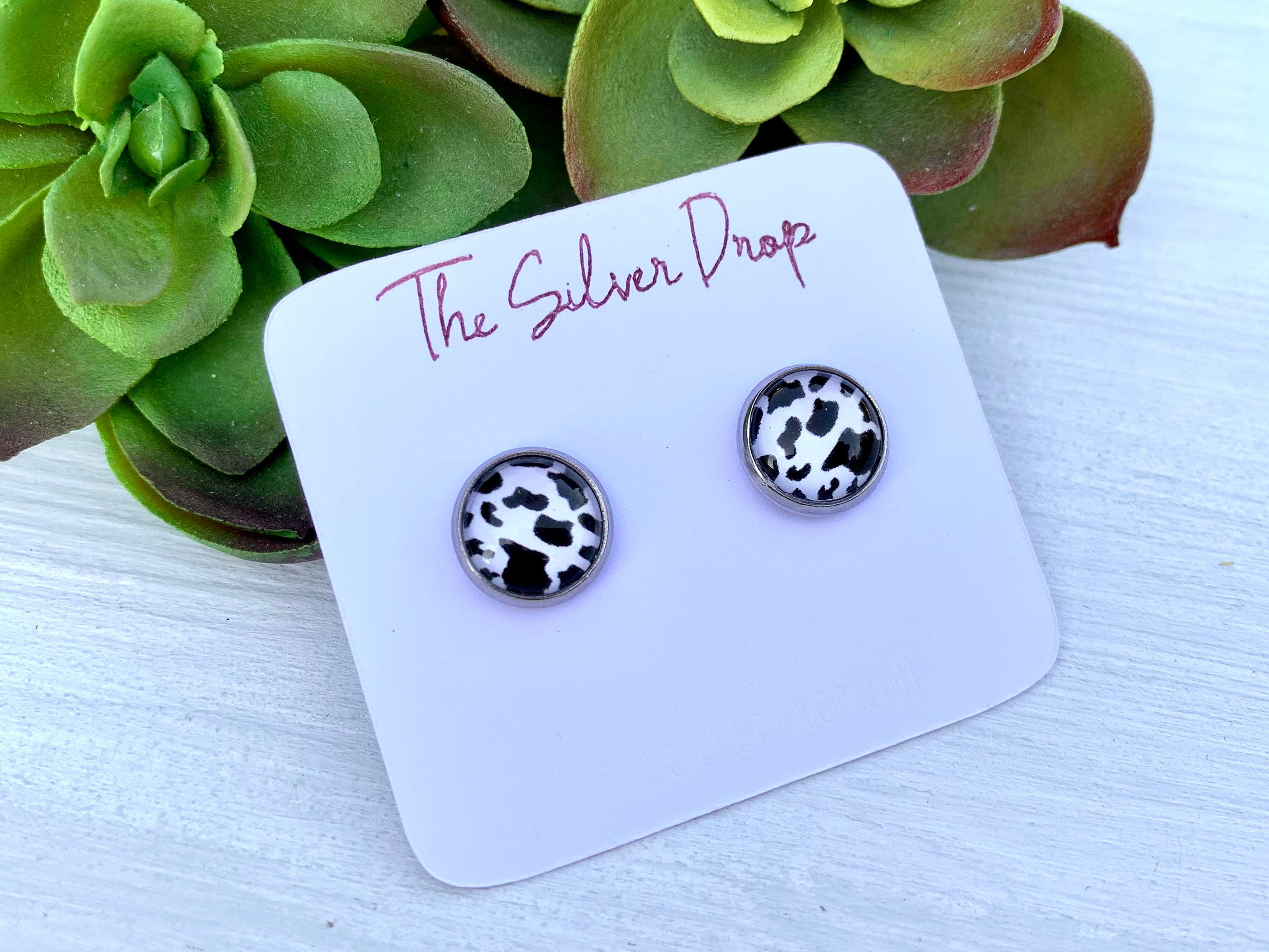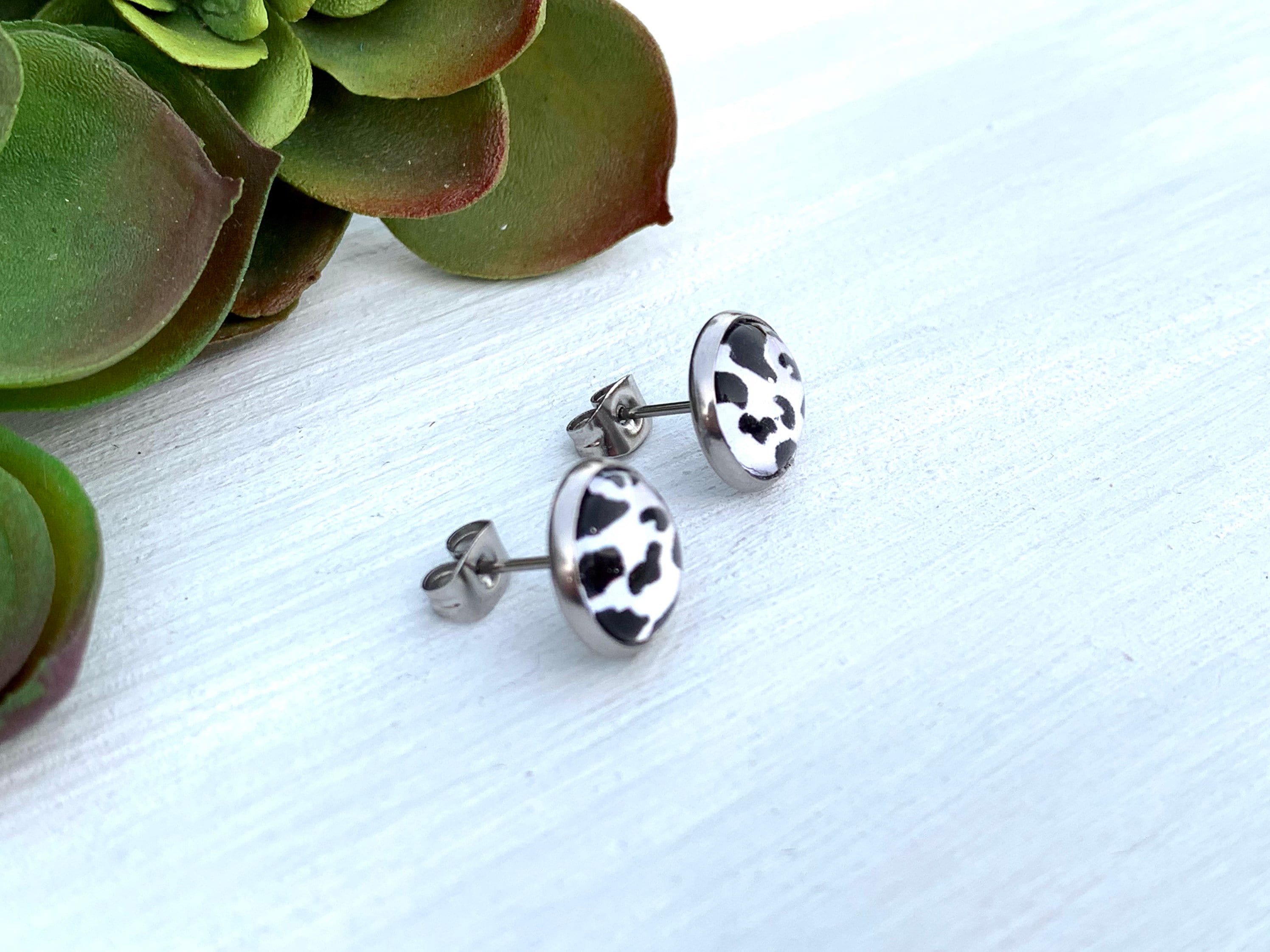 Cow Print Glass Dome Cabochon Stud Earrings. These handmade earrings are the perfect size, not too big or too small. They are so cute and perfect for gifting! The perfect gift for cow lovers!