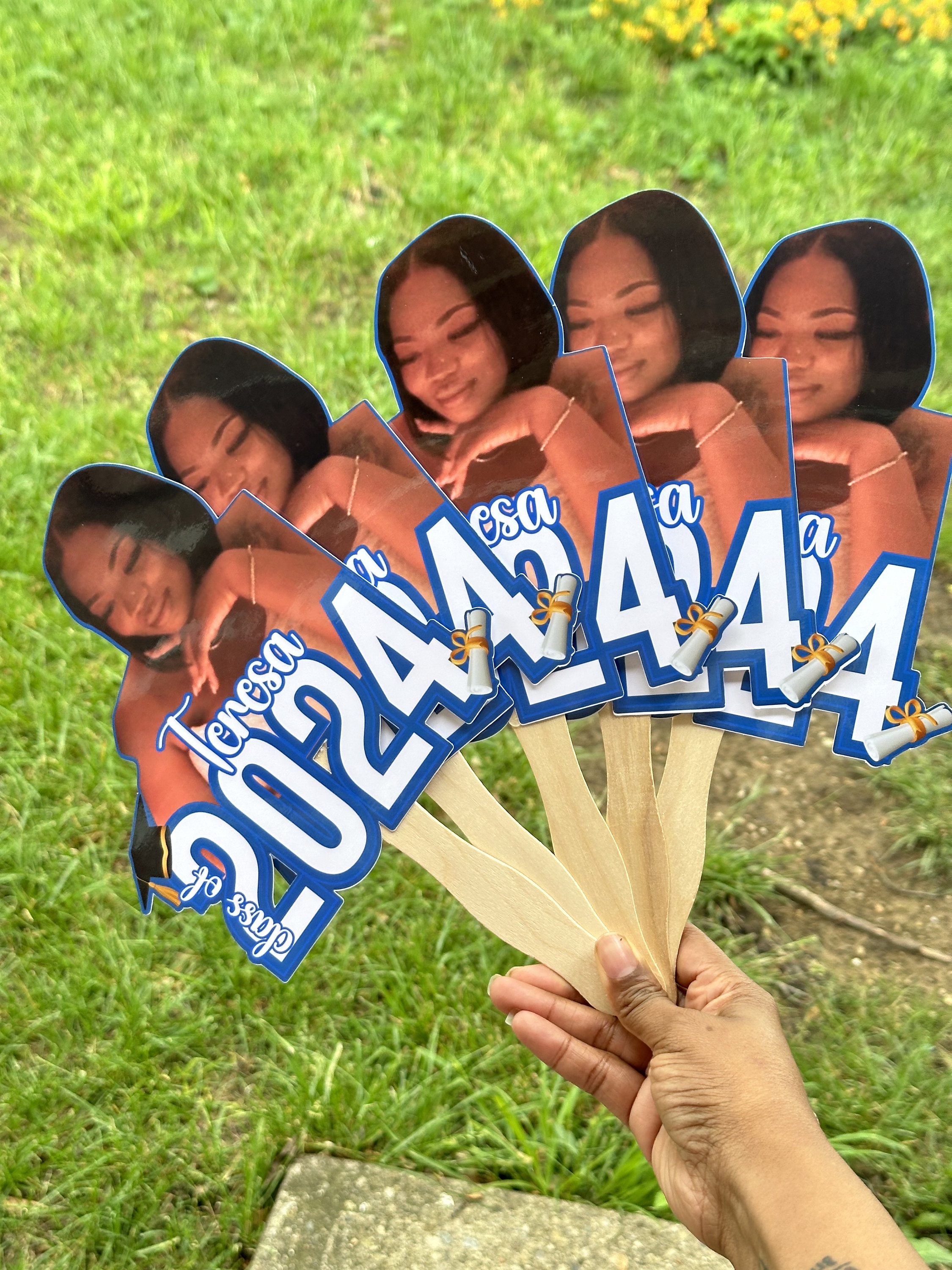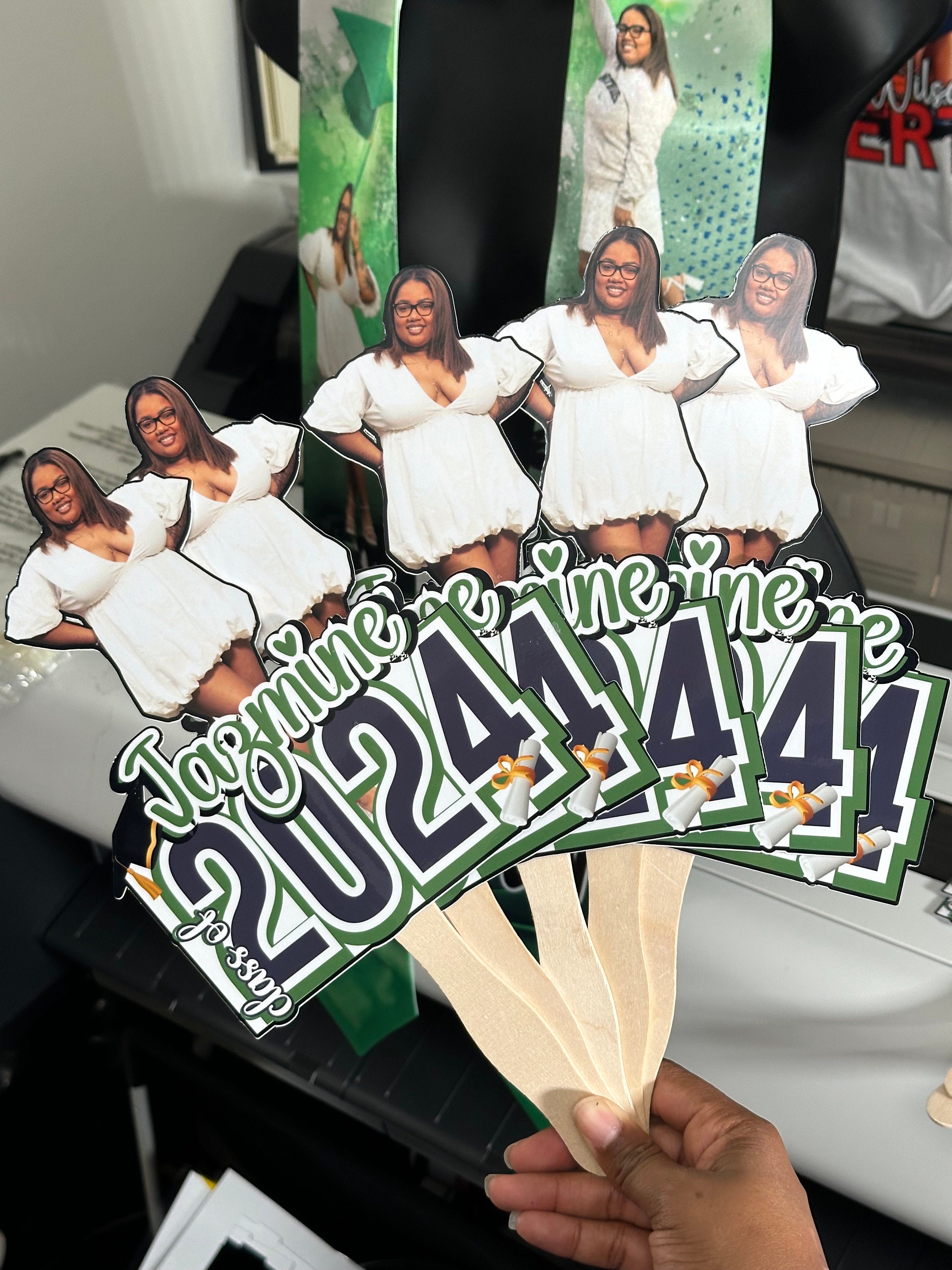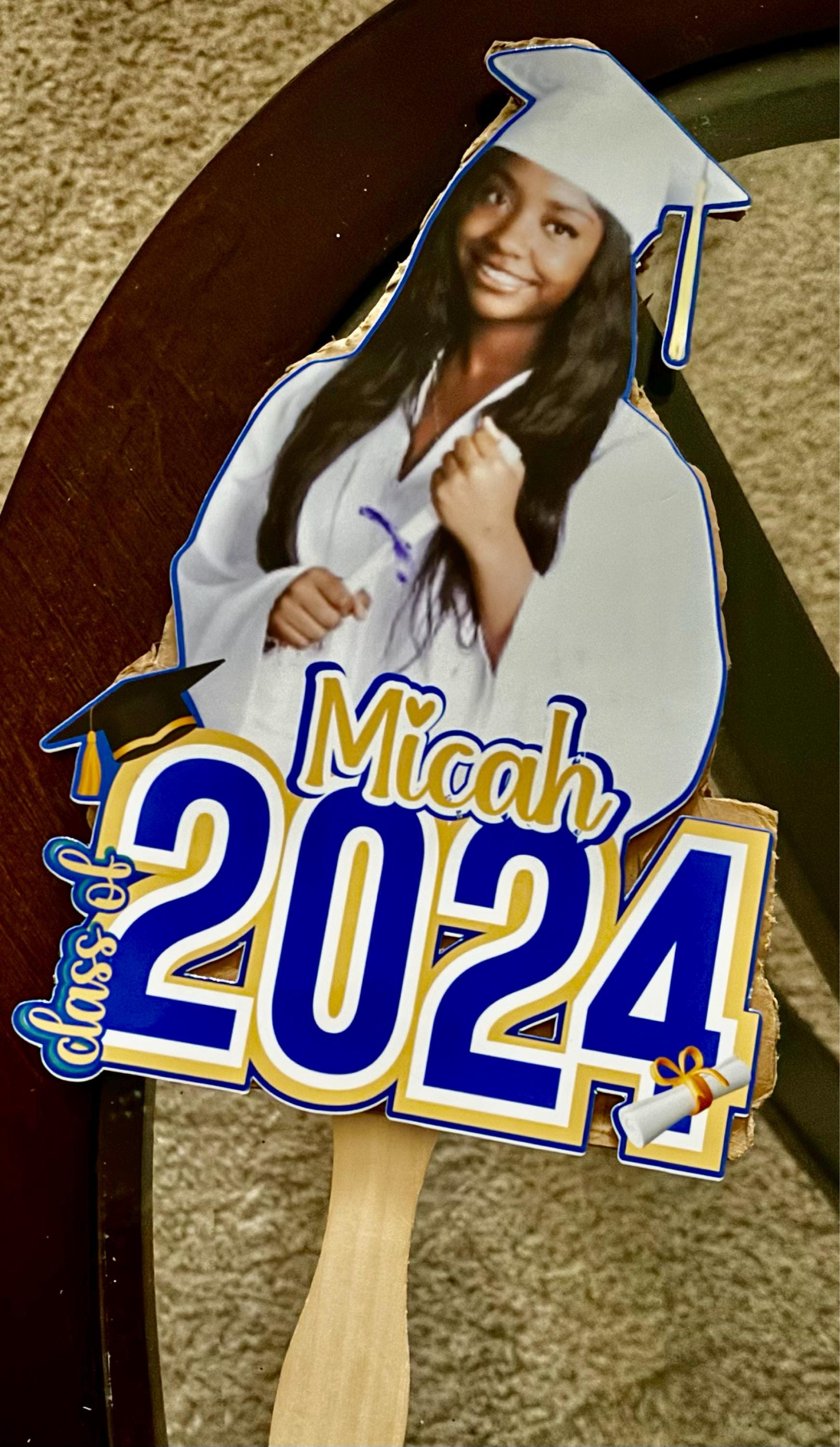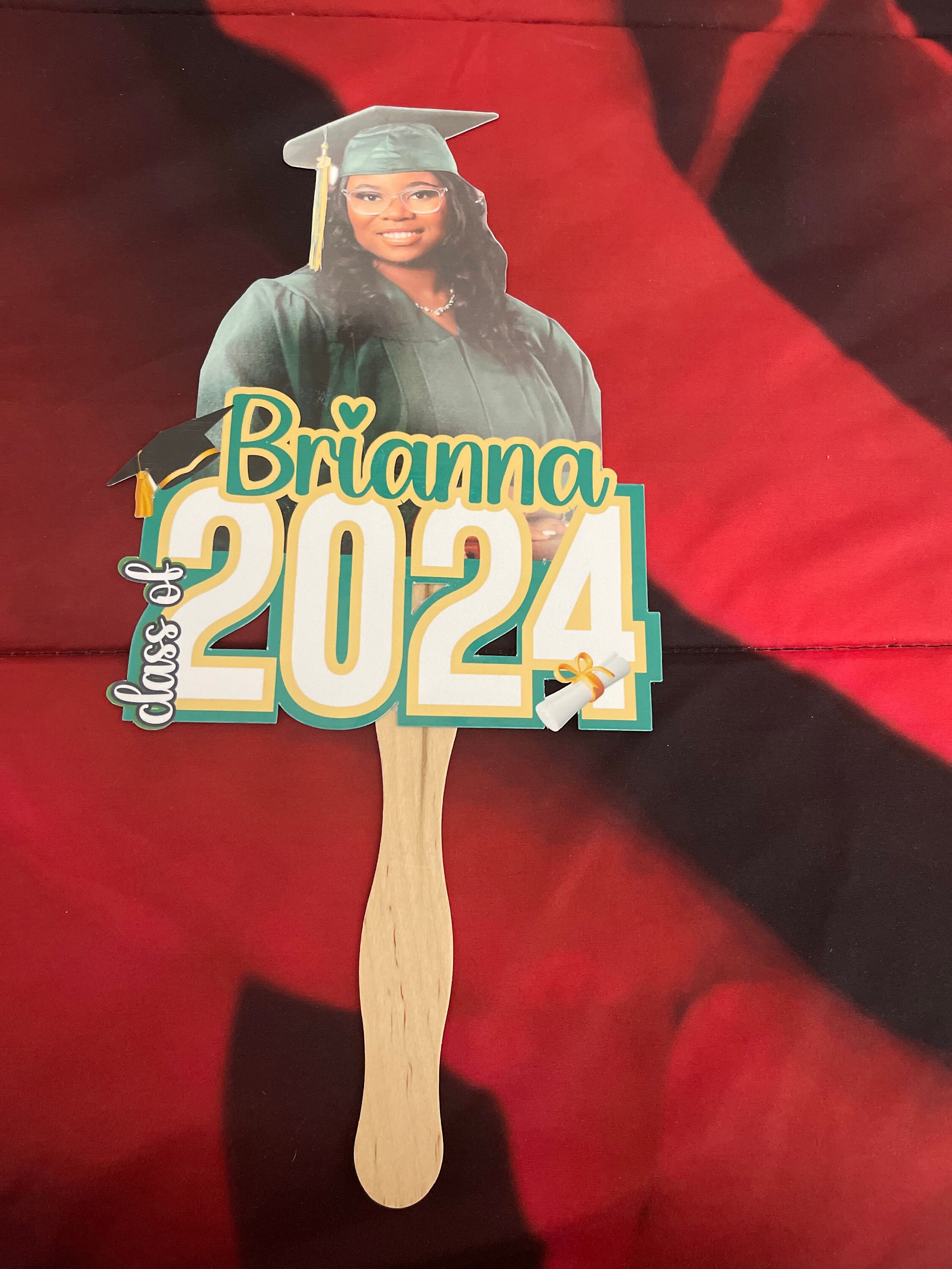 These photo fans are custom made. The fans are handmade and laminated. This is a creative and fun way to make your student's graduation stand out. This is a handheld fan that fills a standard 8.5"x11" sheet of paper.