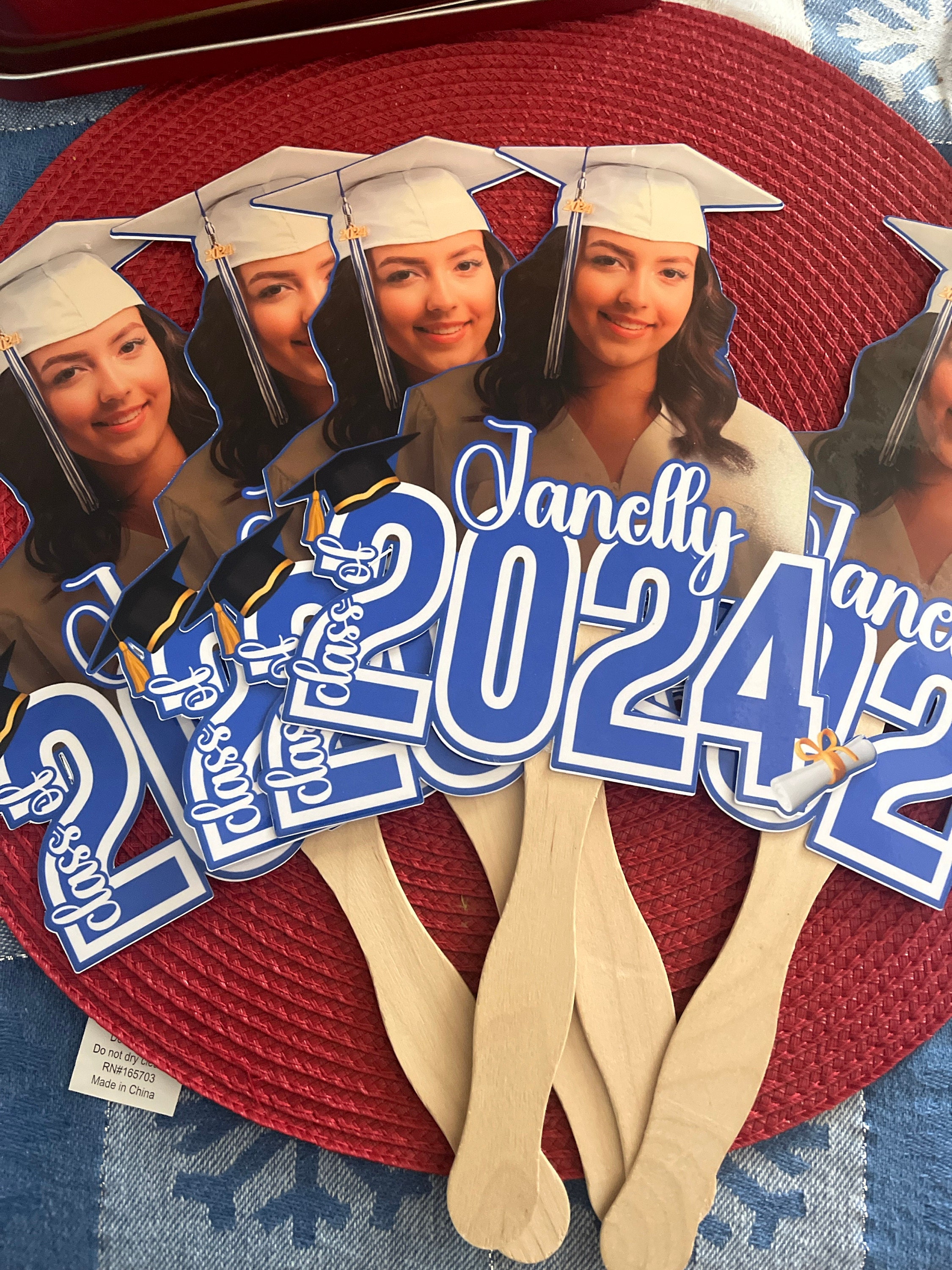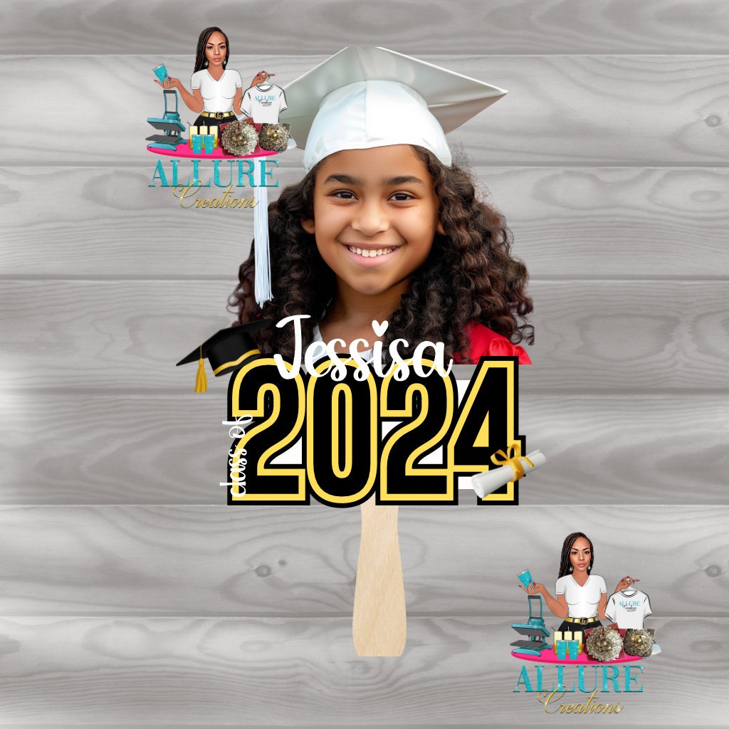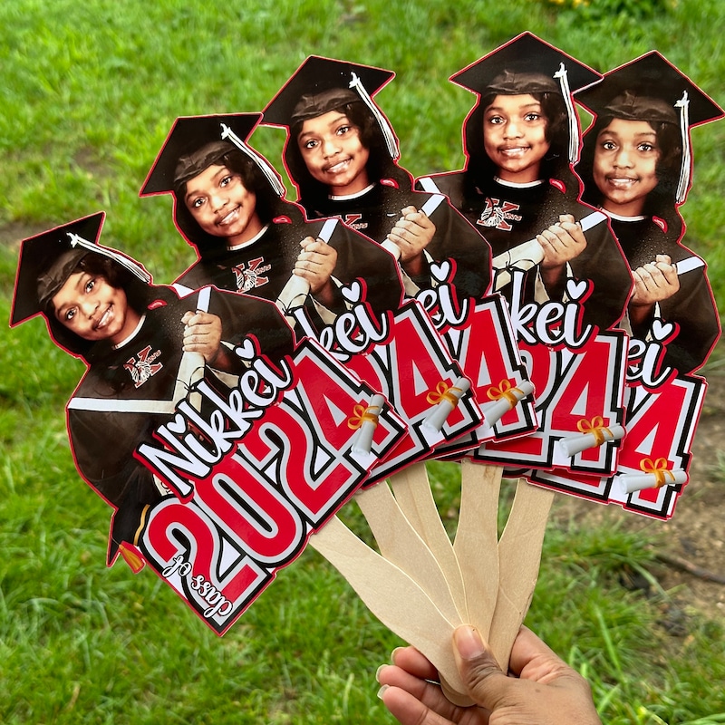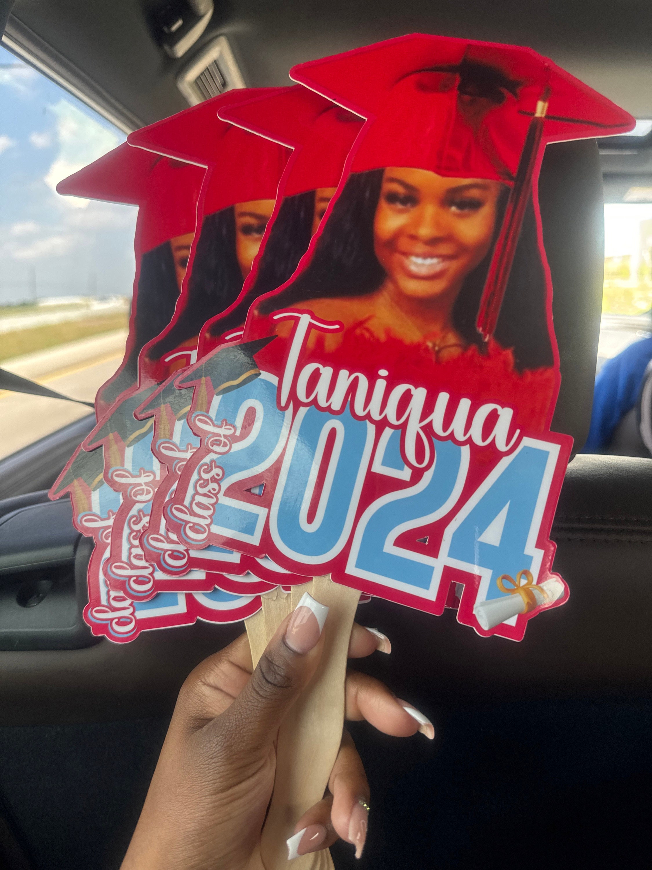 These photo fans are custom made. The fans are handmade and laminated. This is a creative and fun way to make your student's graduation stand out. This is a handheld fan that fills a standard 8.5"x11" sheet of paper.