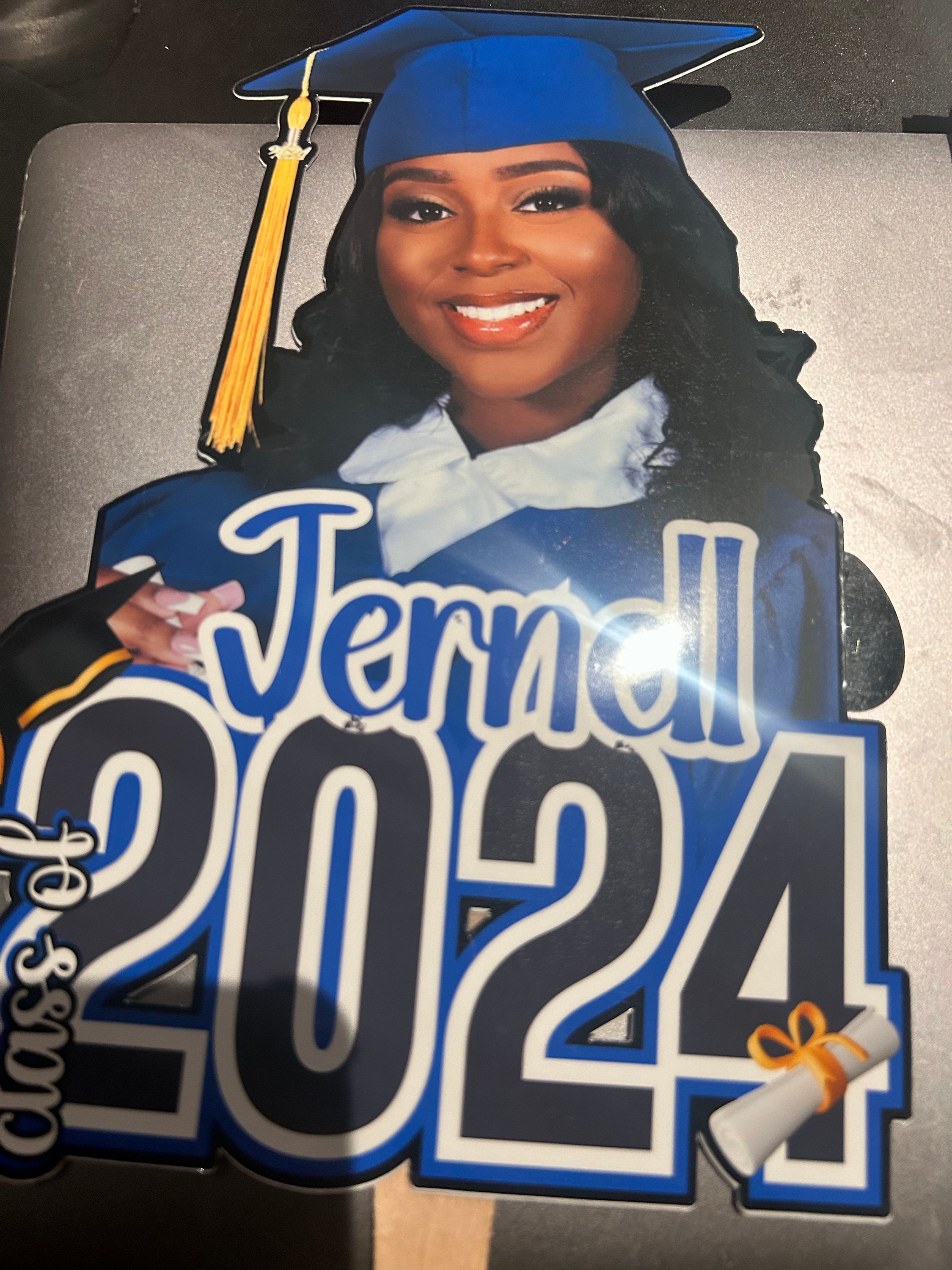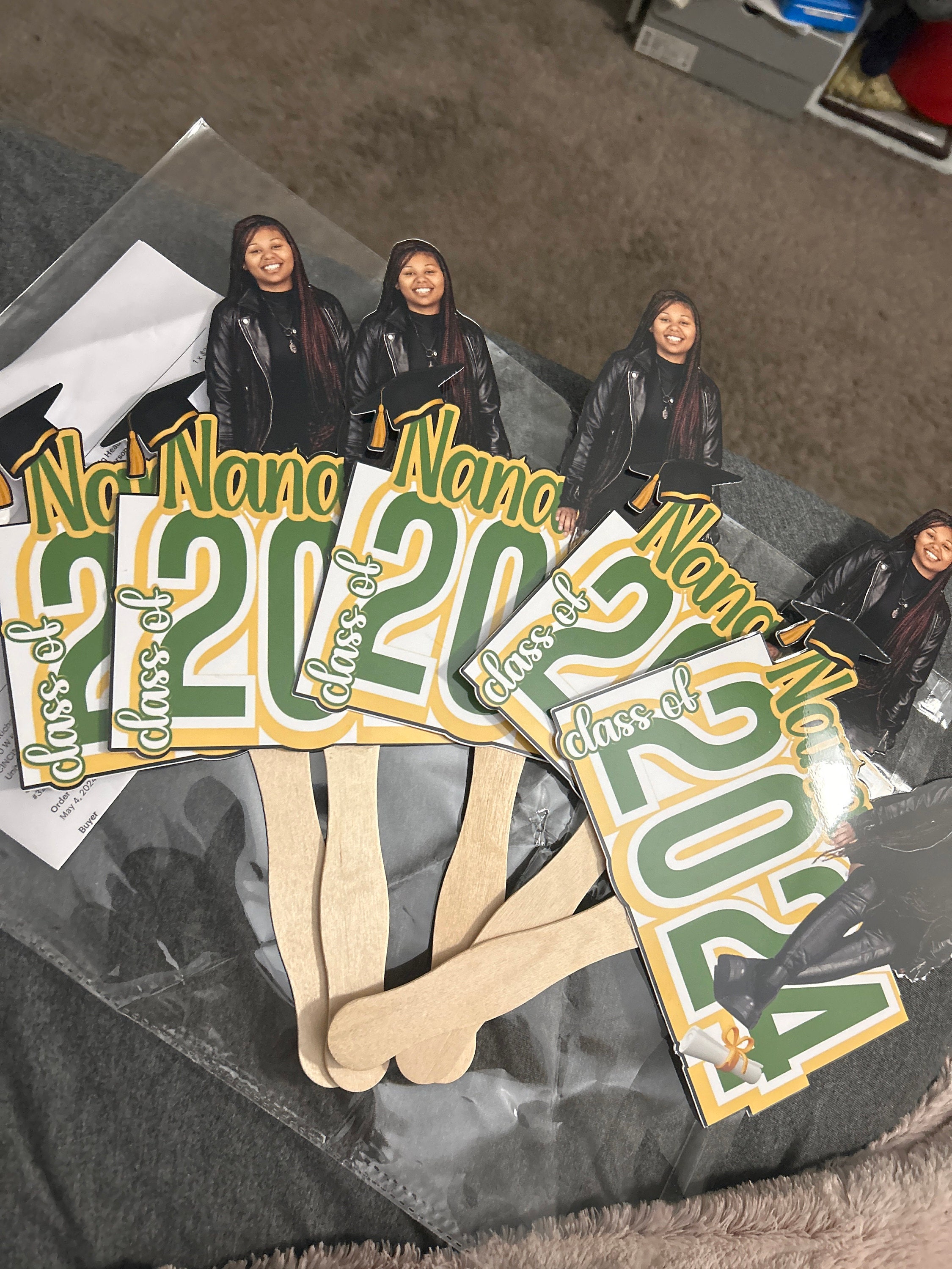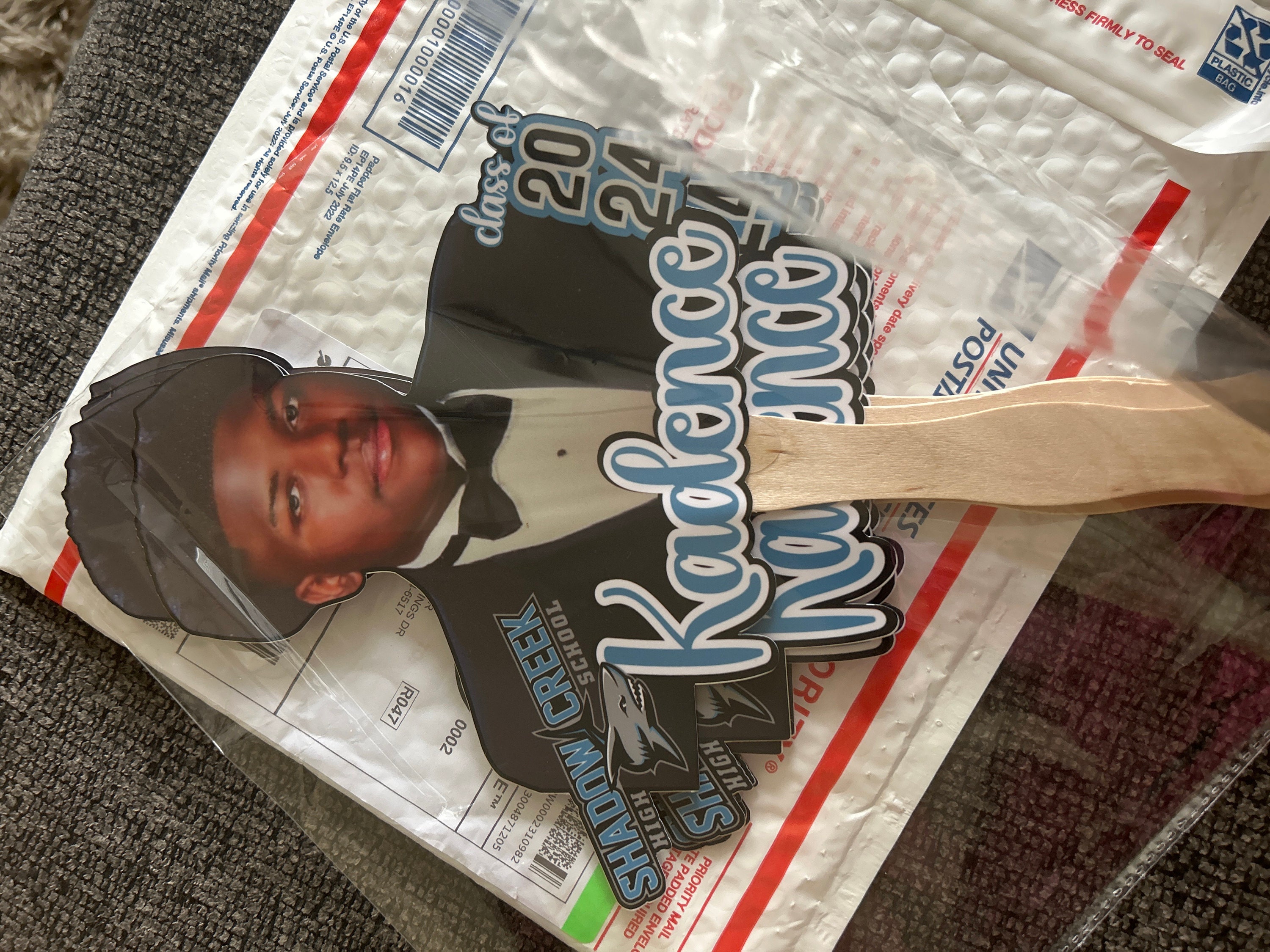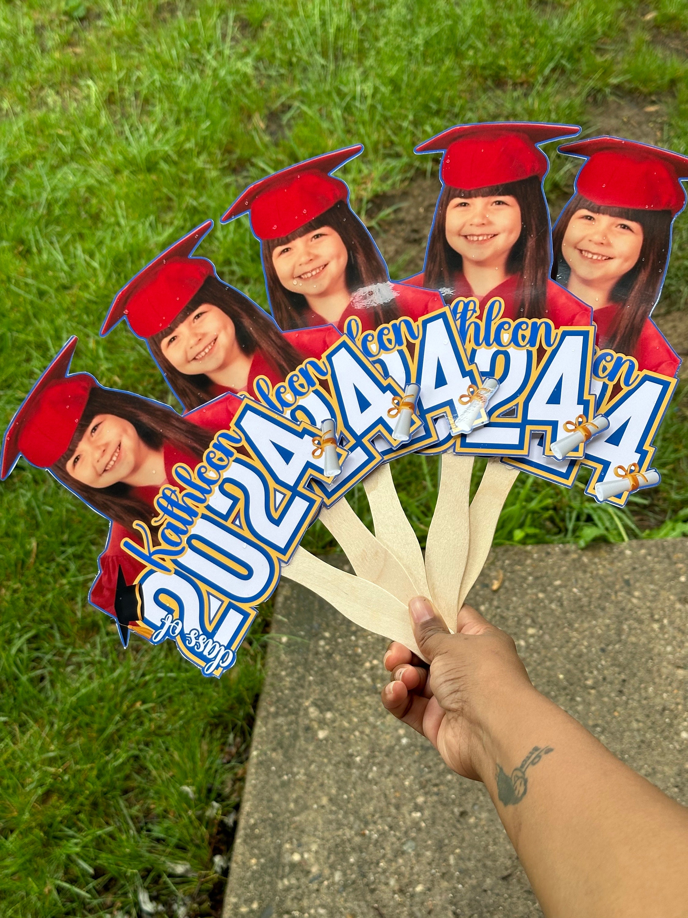 These photo fans are custom made. The fans are handmade and laminated. This is a creative and fun way to make your student's graduation stand out. This is a handheld fan that fills a standard 8.5"x11" sheet of paper.