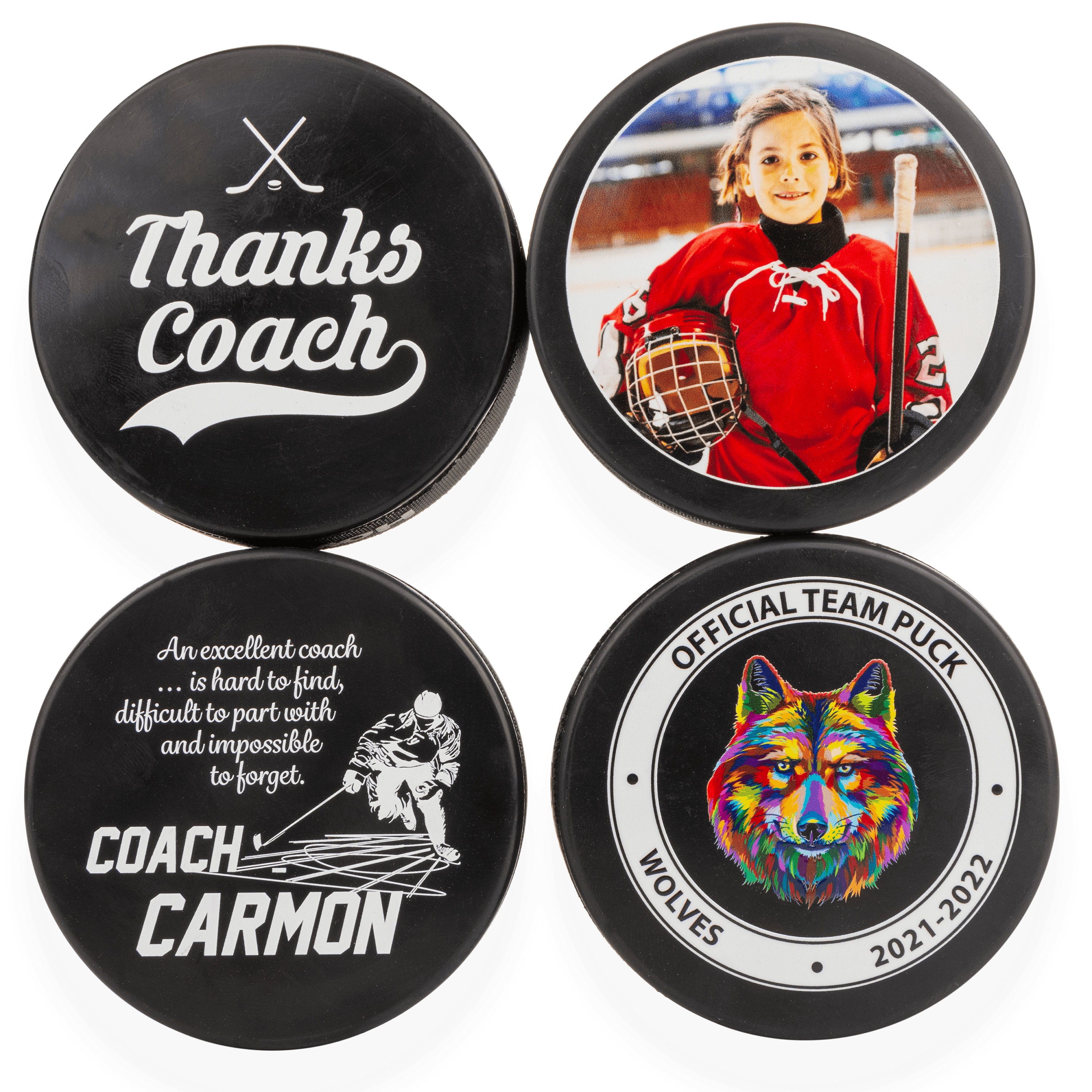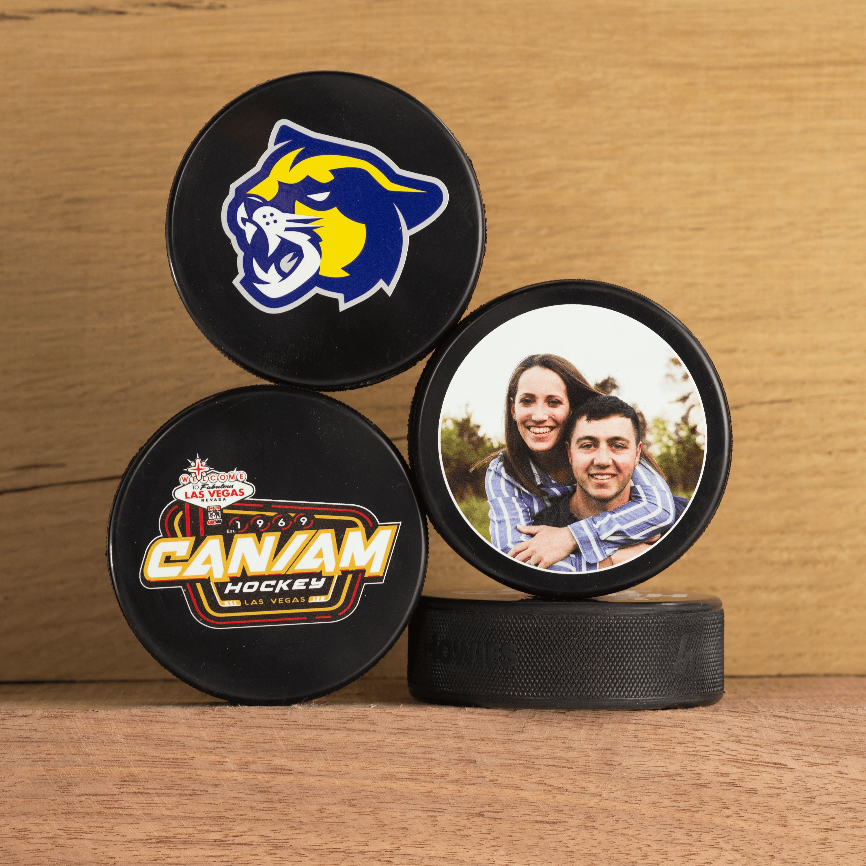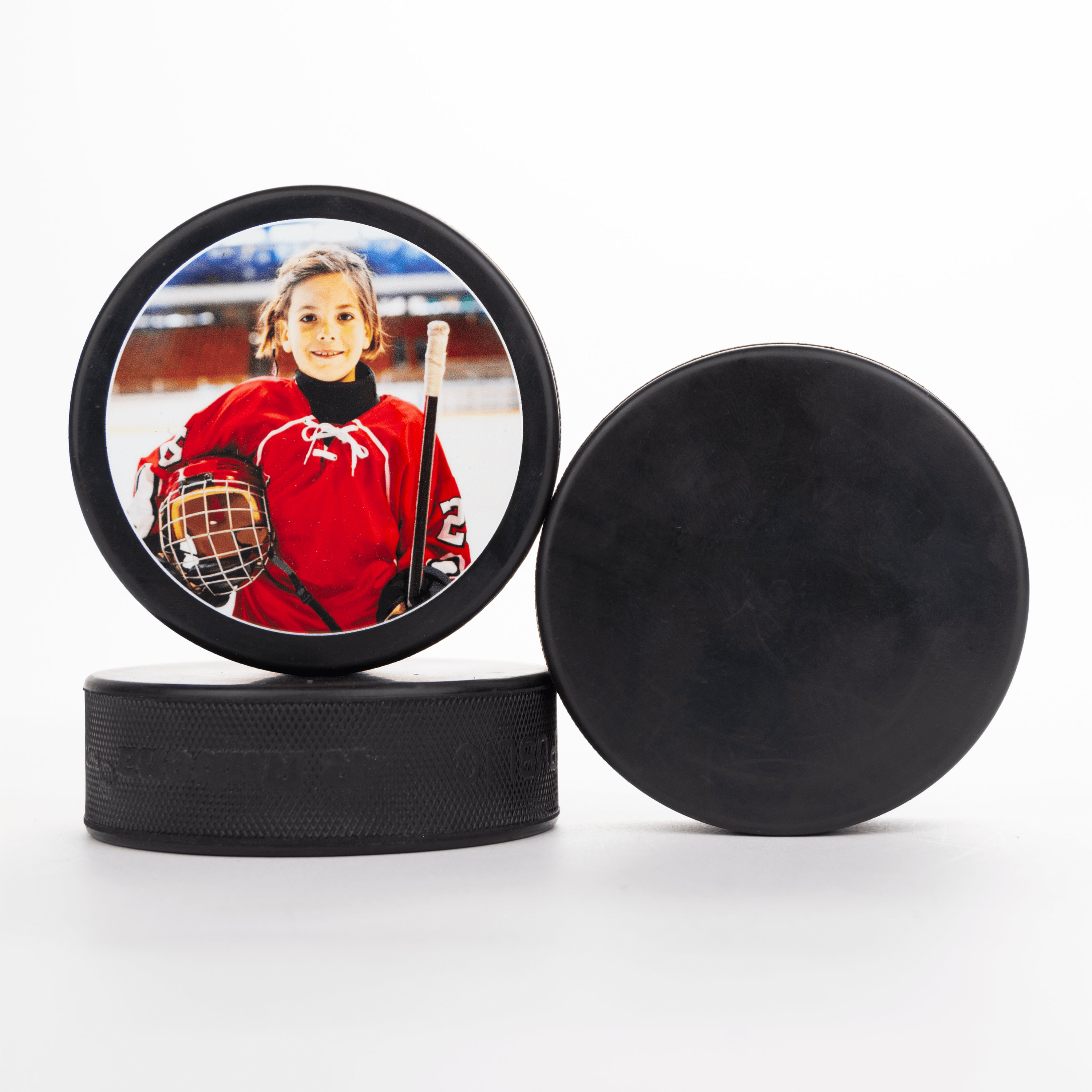 New, we've taken your standard hockey puck and added printed customization to suit your every need. Add your own photo, text, or logo - or choose one of our creative designs! This personalized puck can even double as a coaster or be used at your next hockey game.