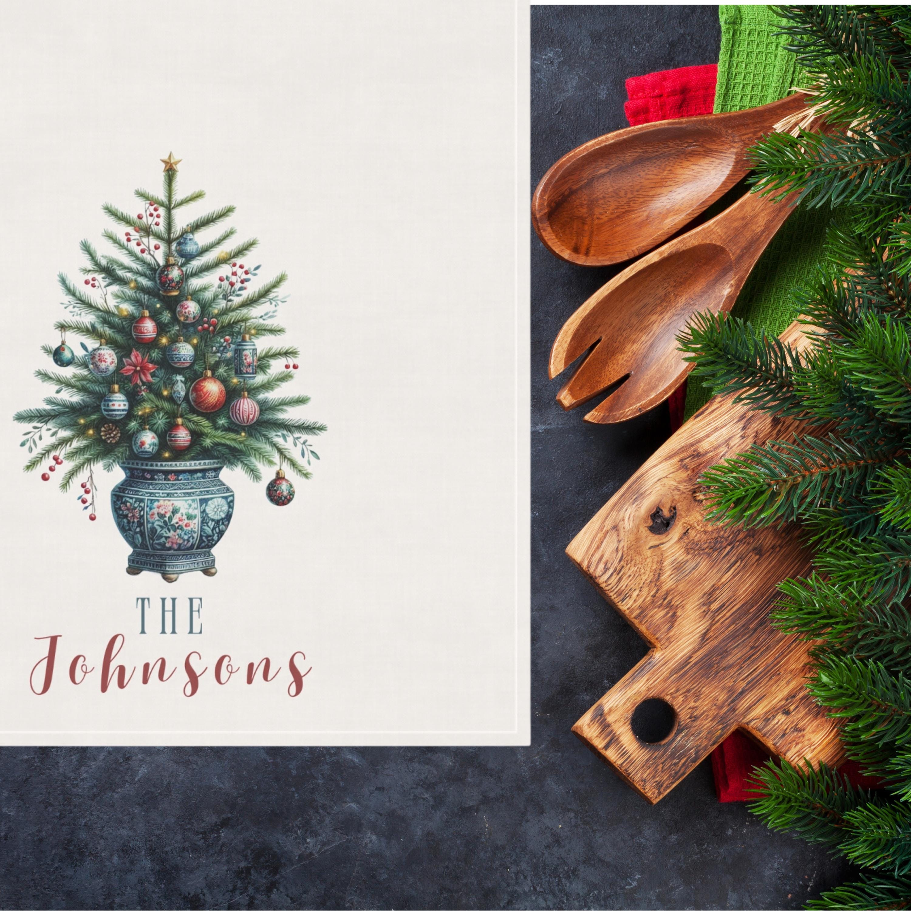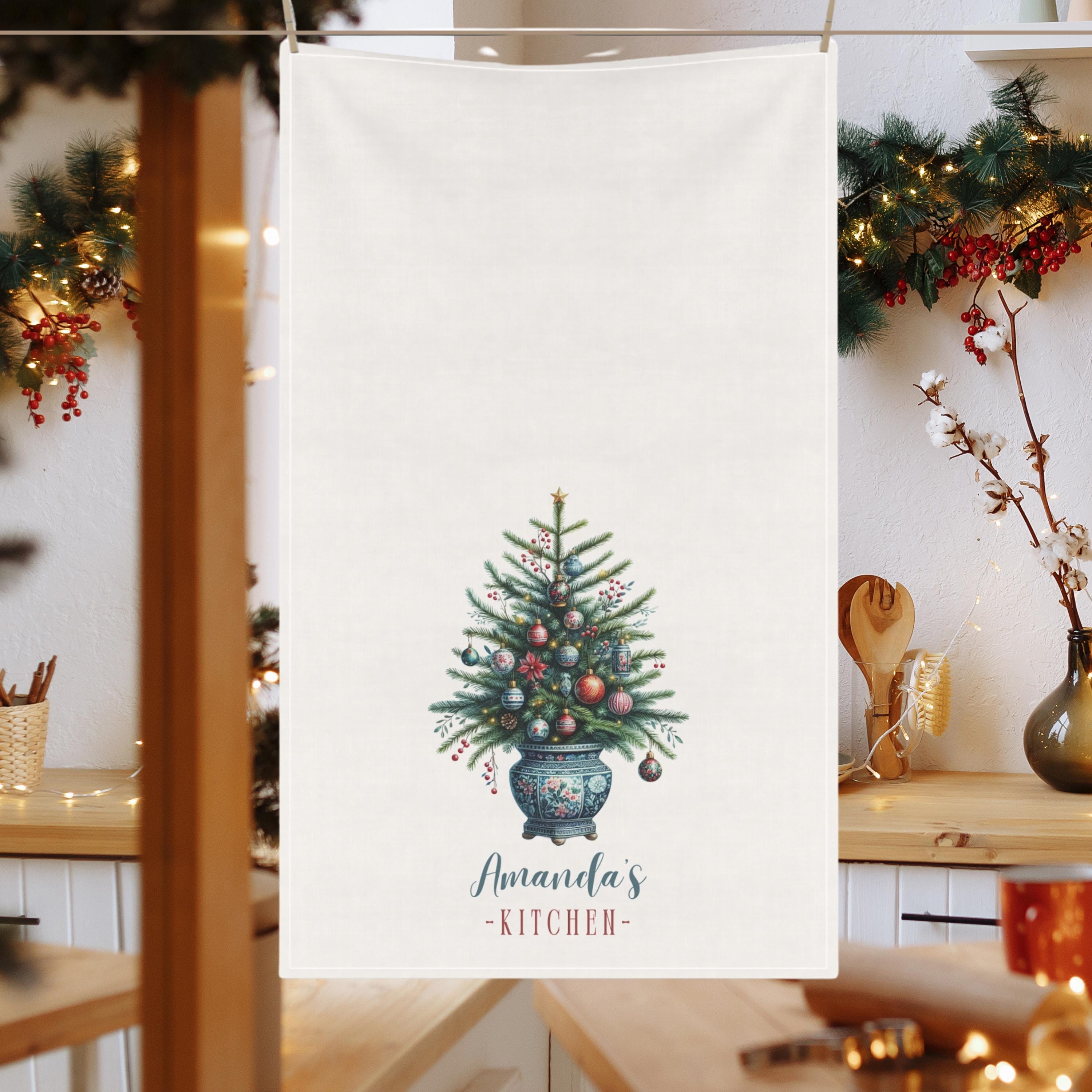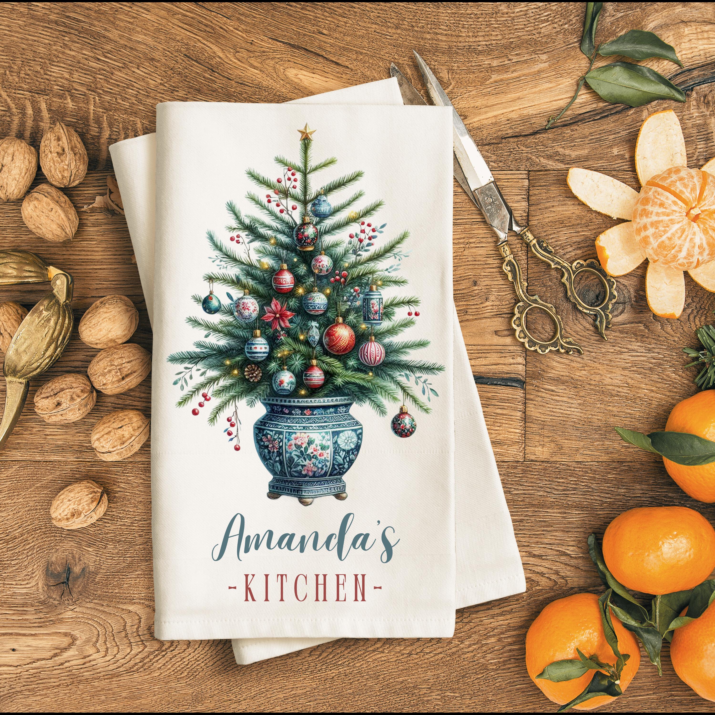 Custom Kitchen Towel Personalized Tea Towel Christmas Towel Chinoiserie Christmas Tree Gift Custom Name Towels Towel with Family Name