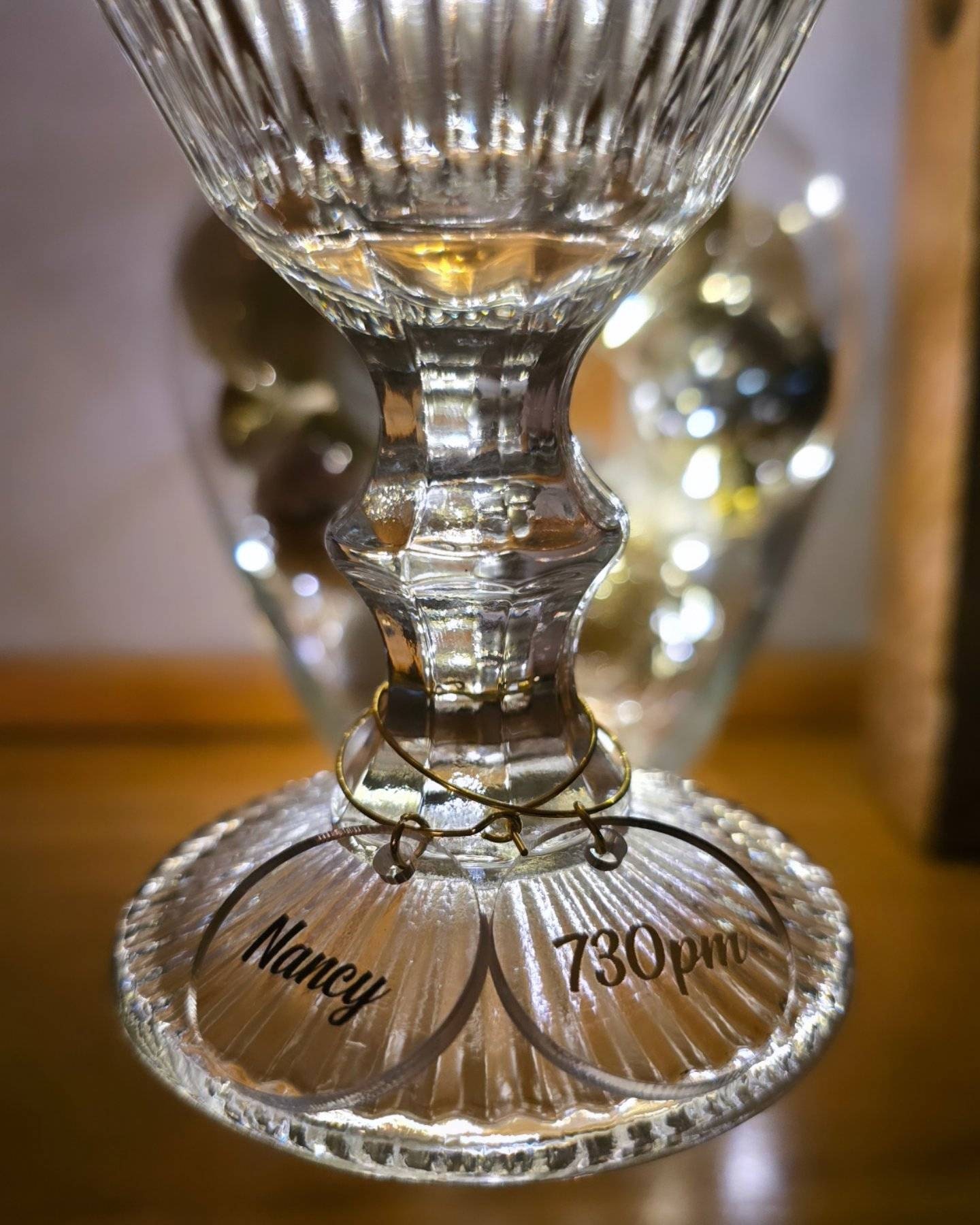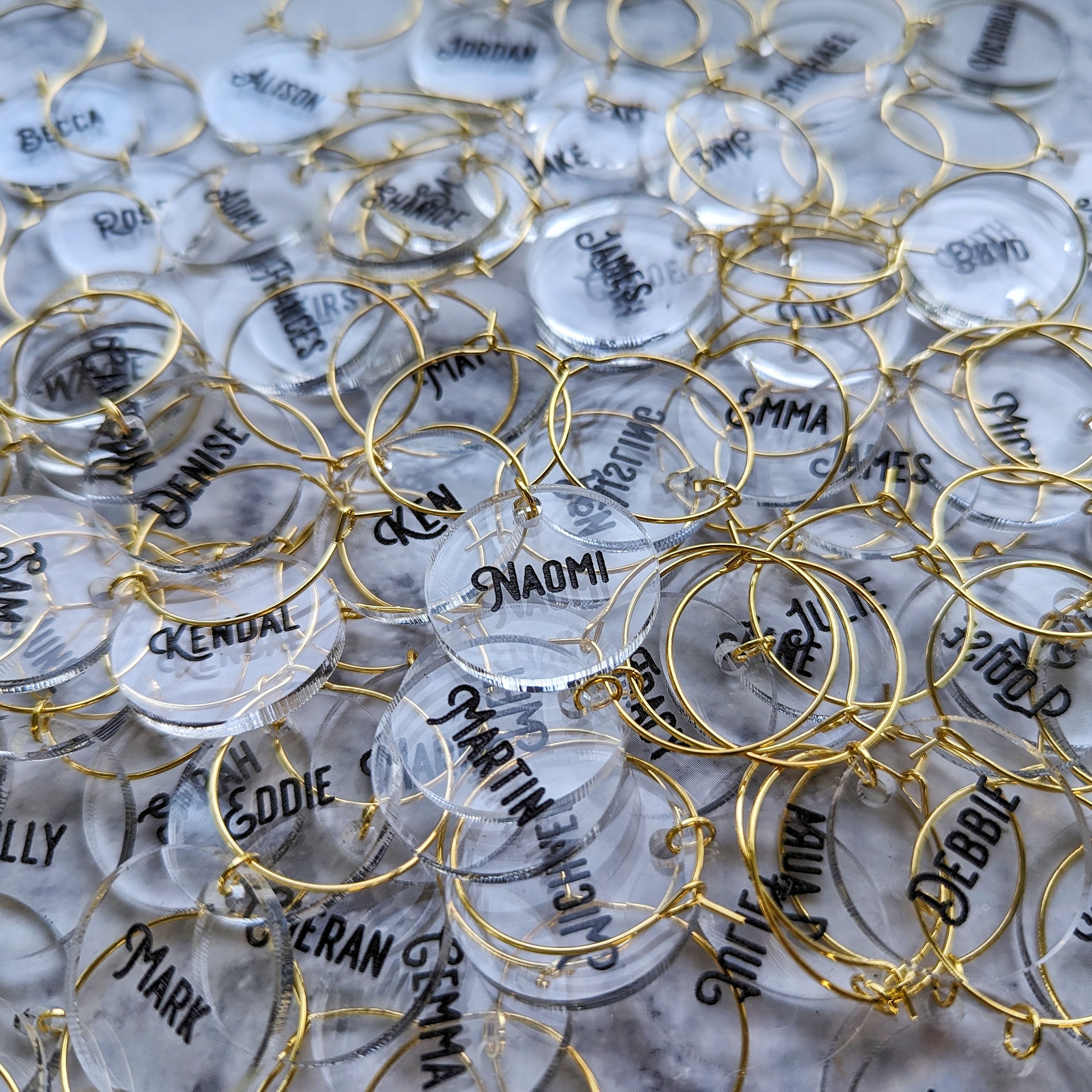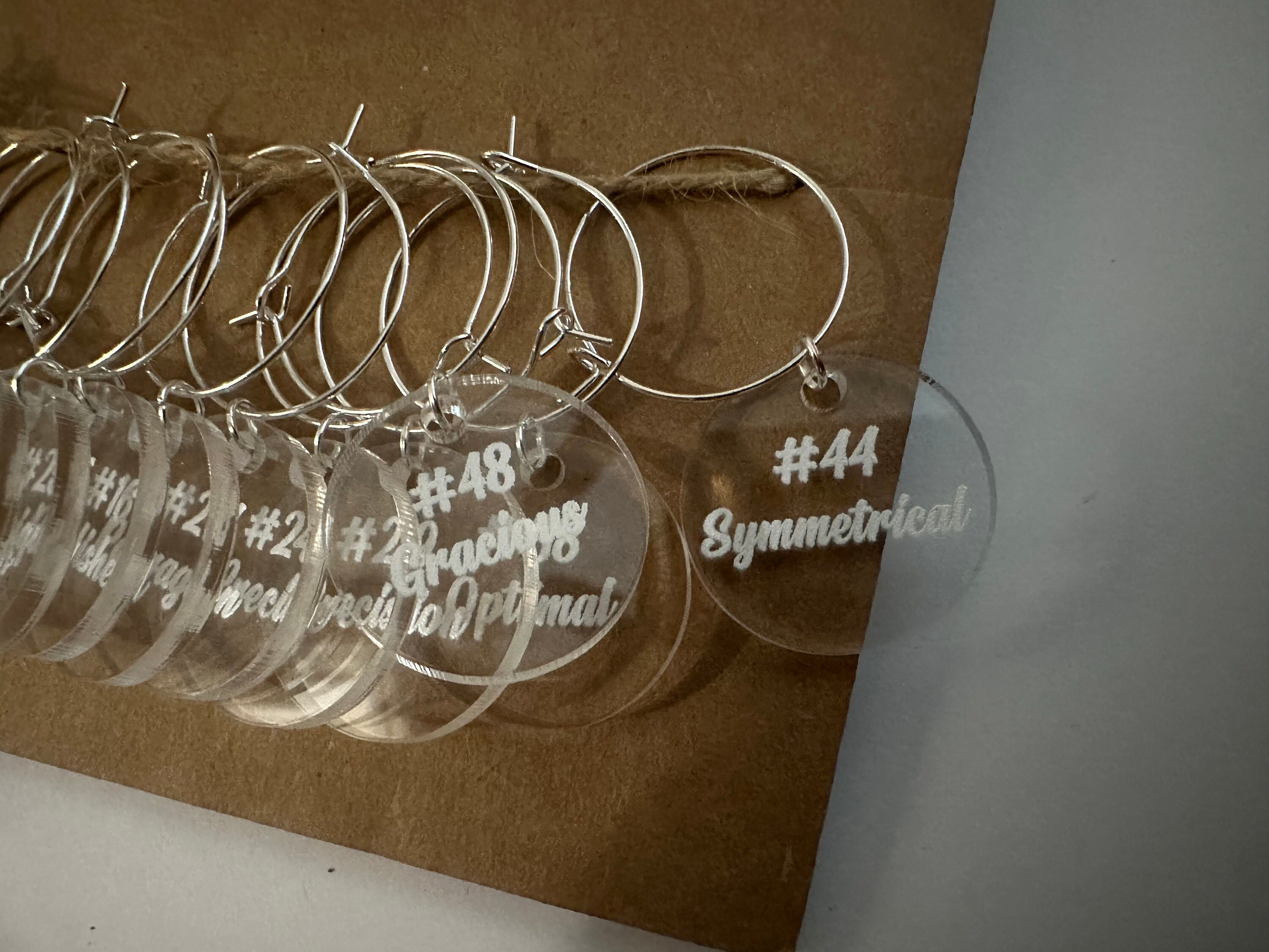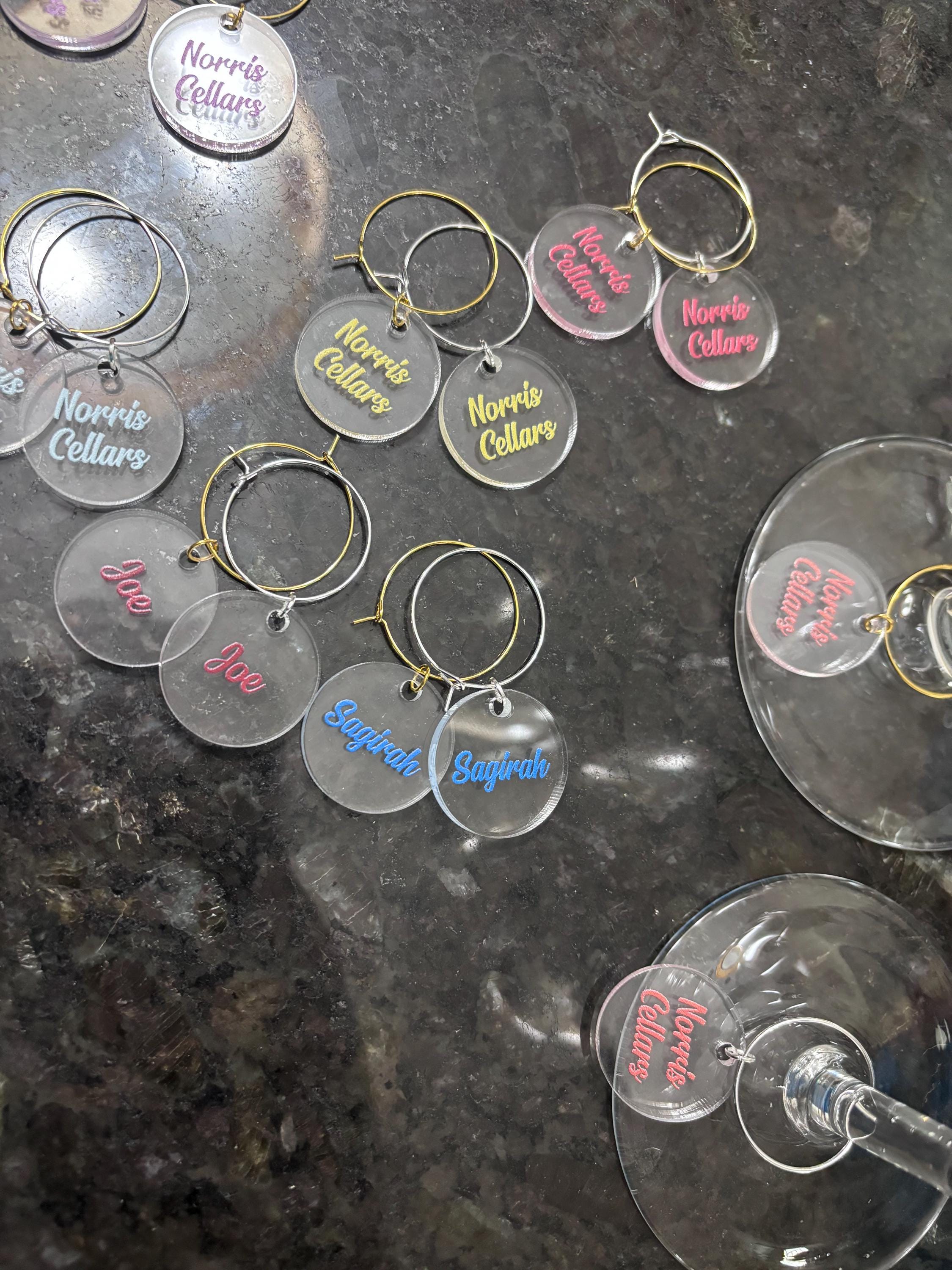 Enhance your wine tasting experience with our 1" round acrylic custom printed name wine stem charms. Order now and make your wine glasses stand out with personalized elegance and style. Cheers to unforgettable moments and great conversations!