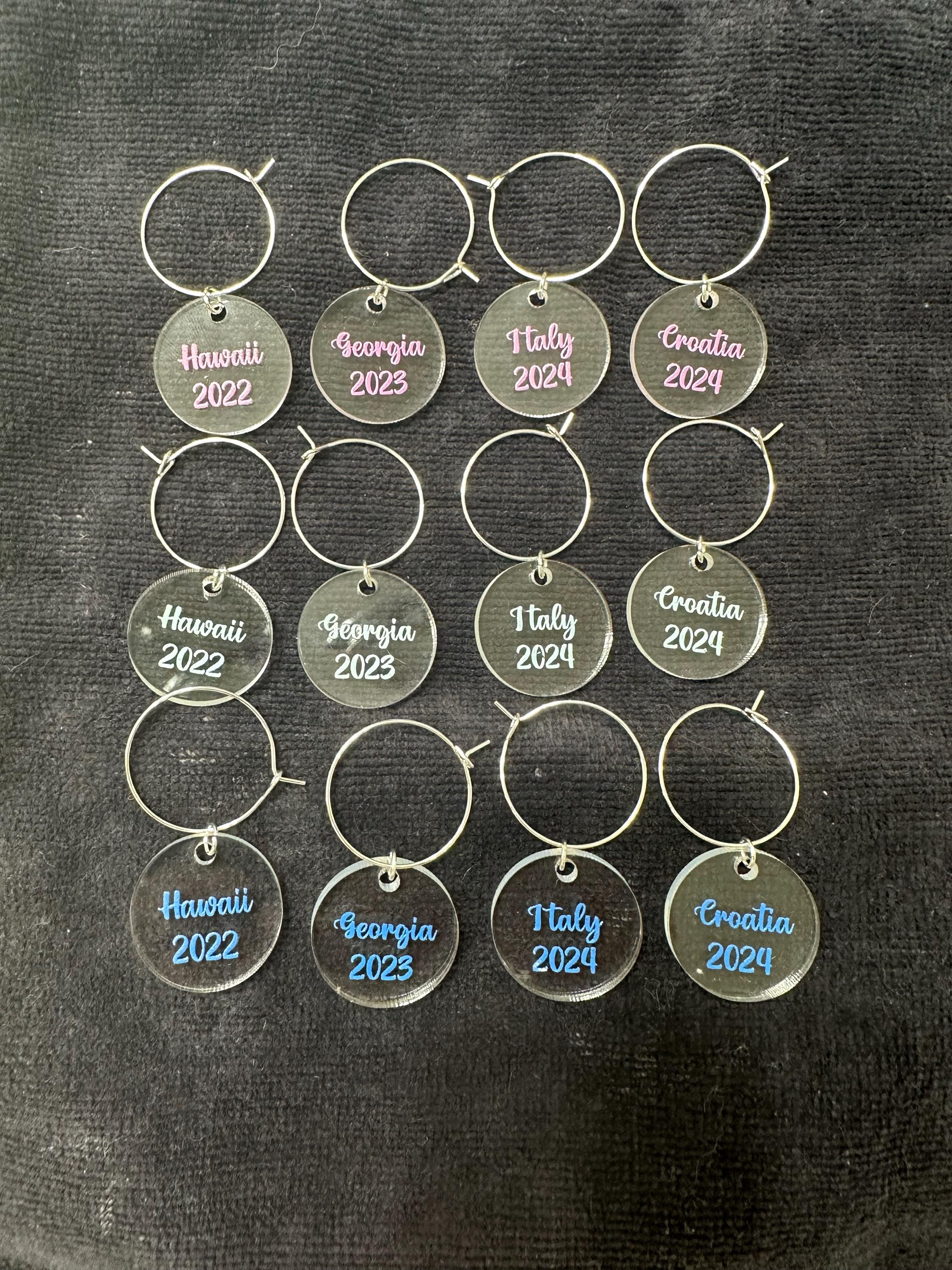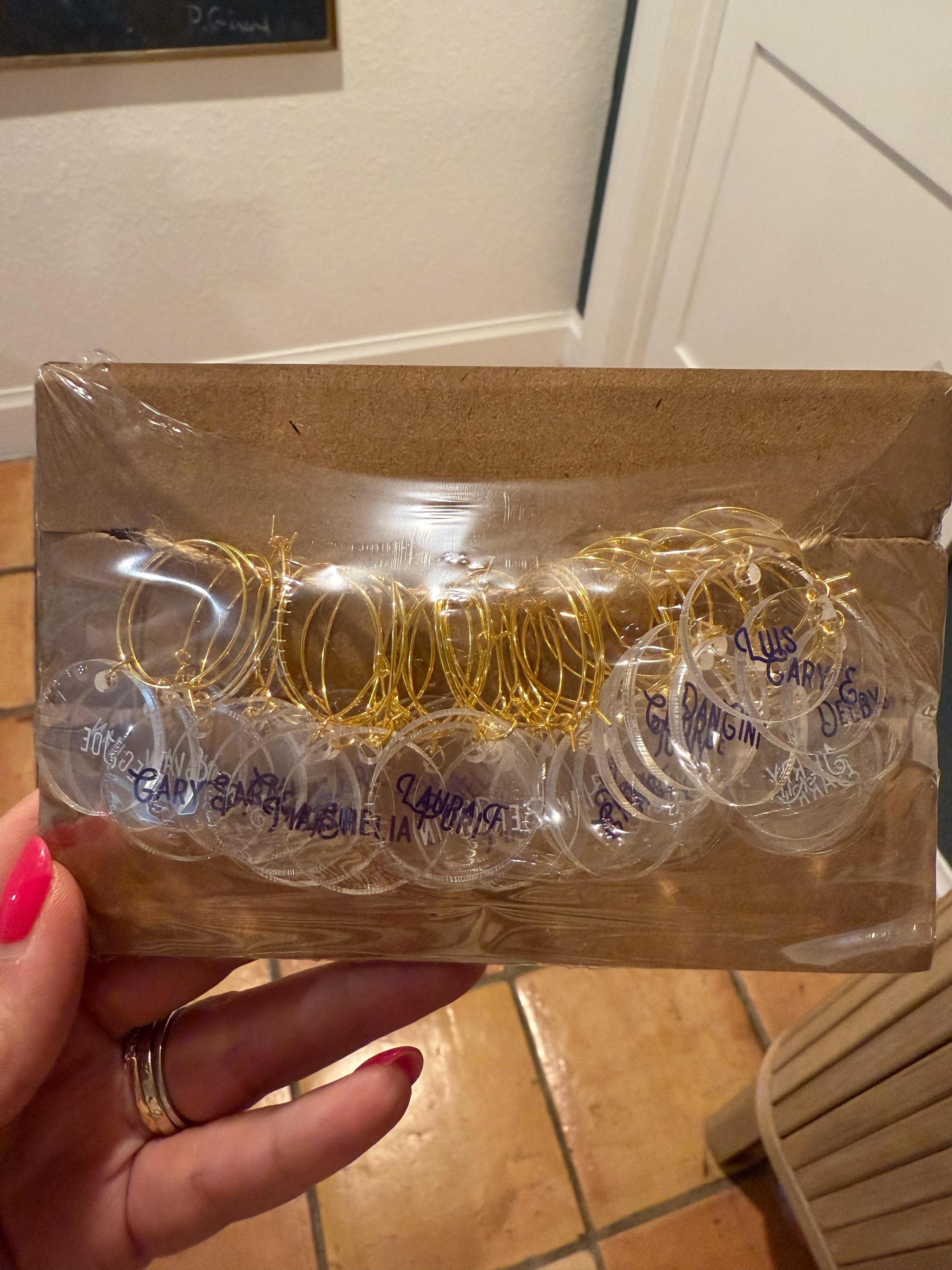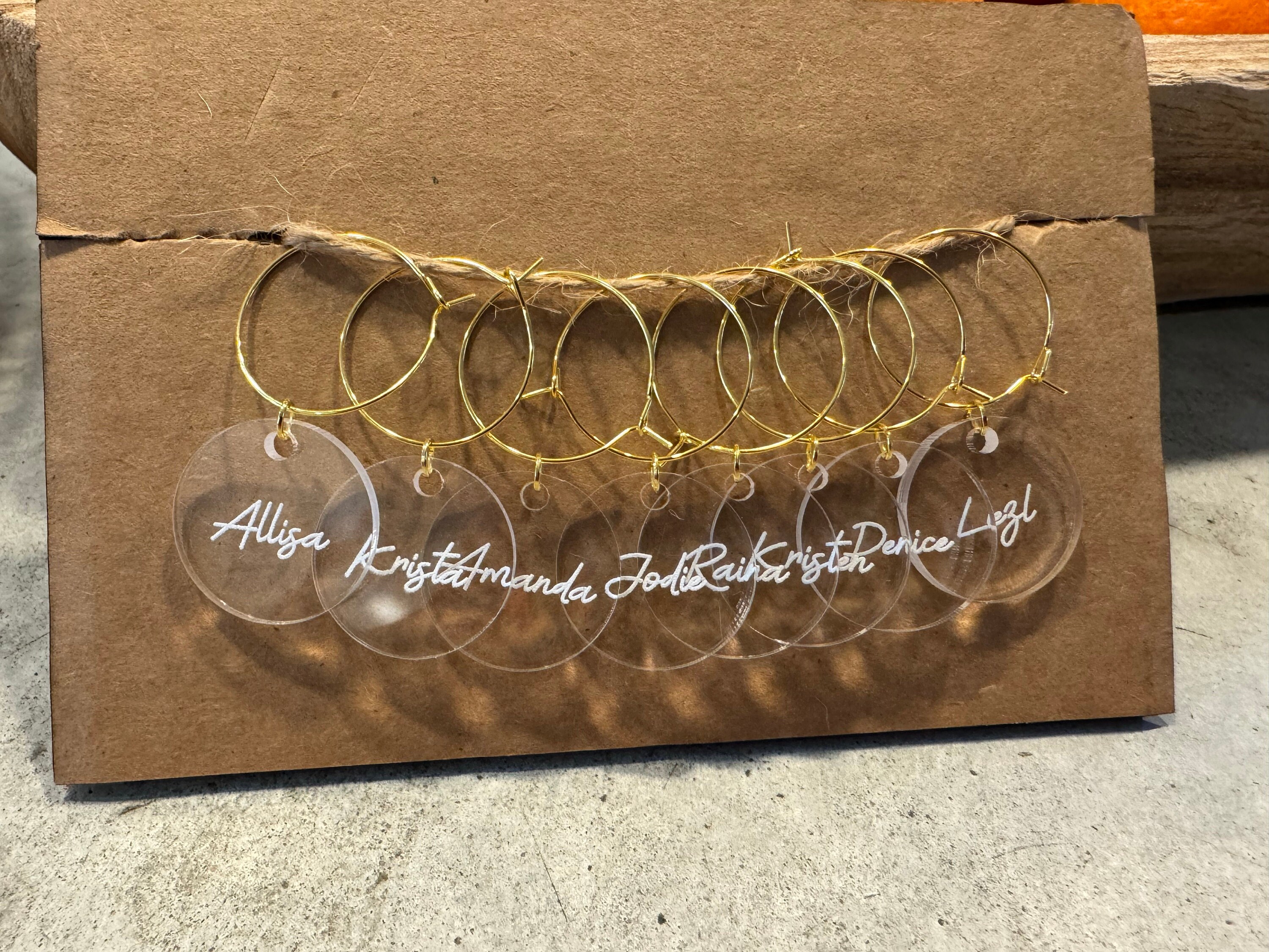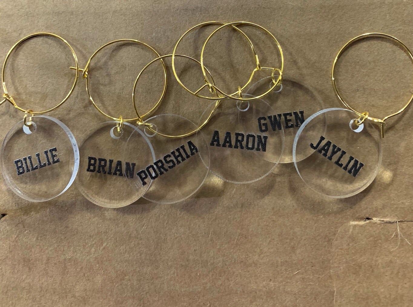 Enhance your wine tasting experience with our 1" round acrylic custom printed name wine stem charms. Order now and make your wine glasses stand out with personalized elegance and style. Cheers to unforgettable moments and great conversations!
