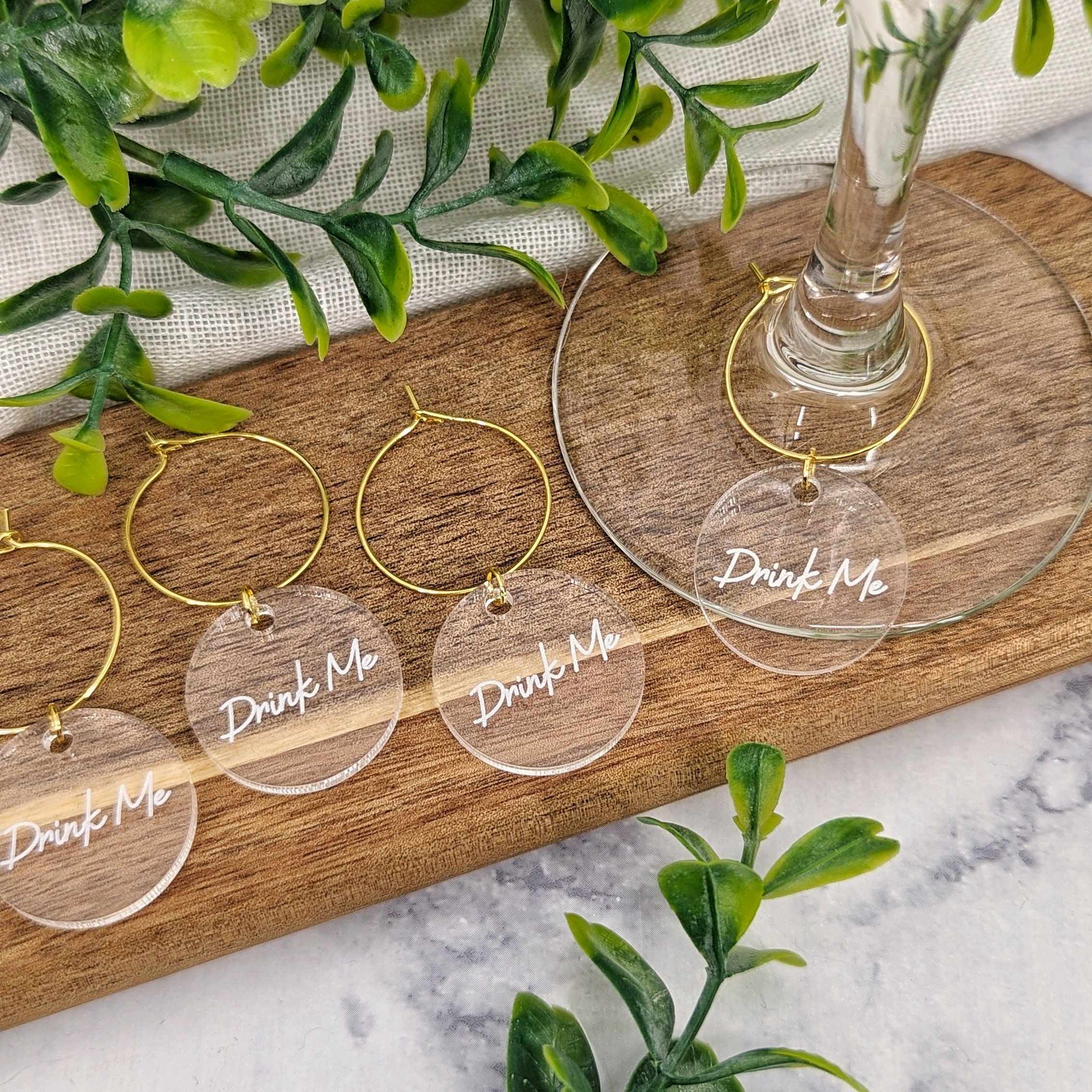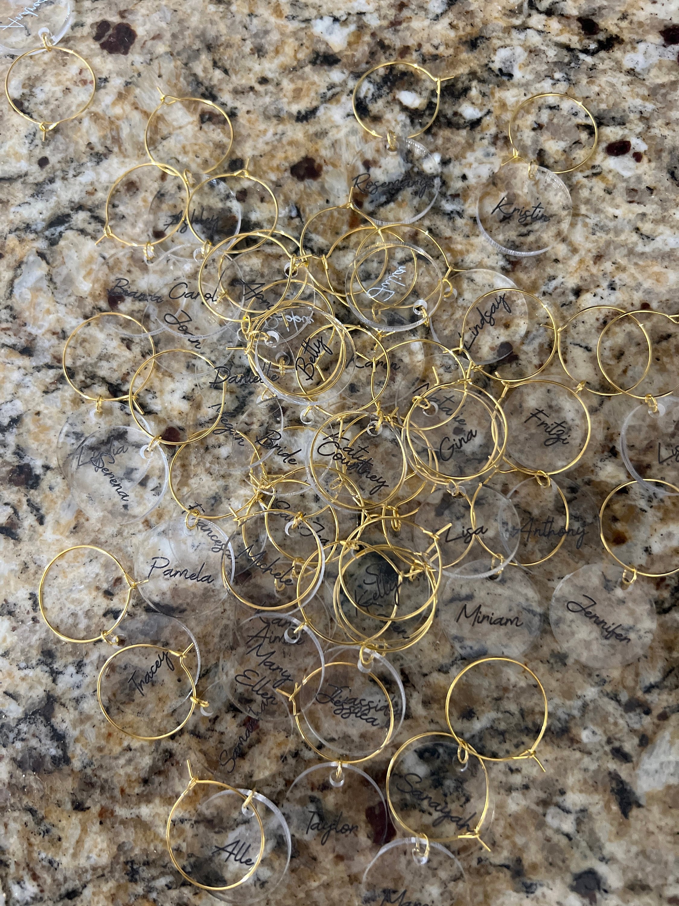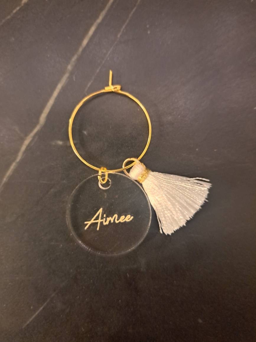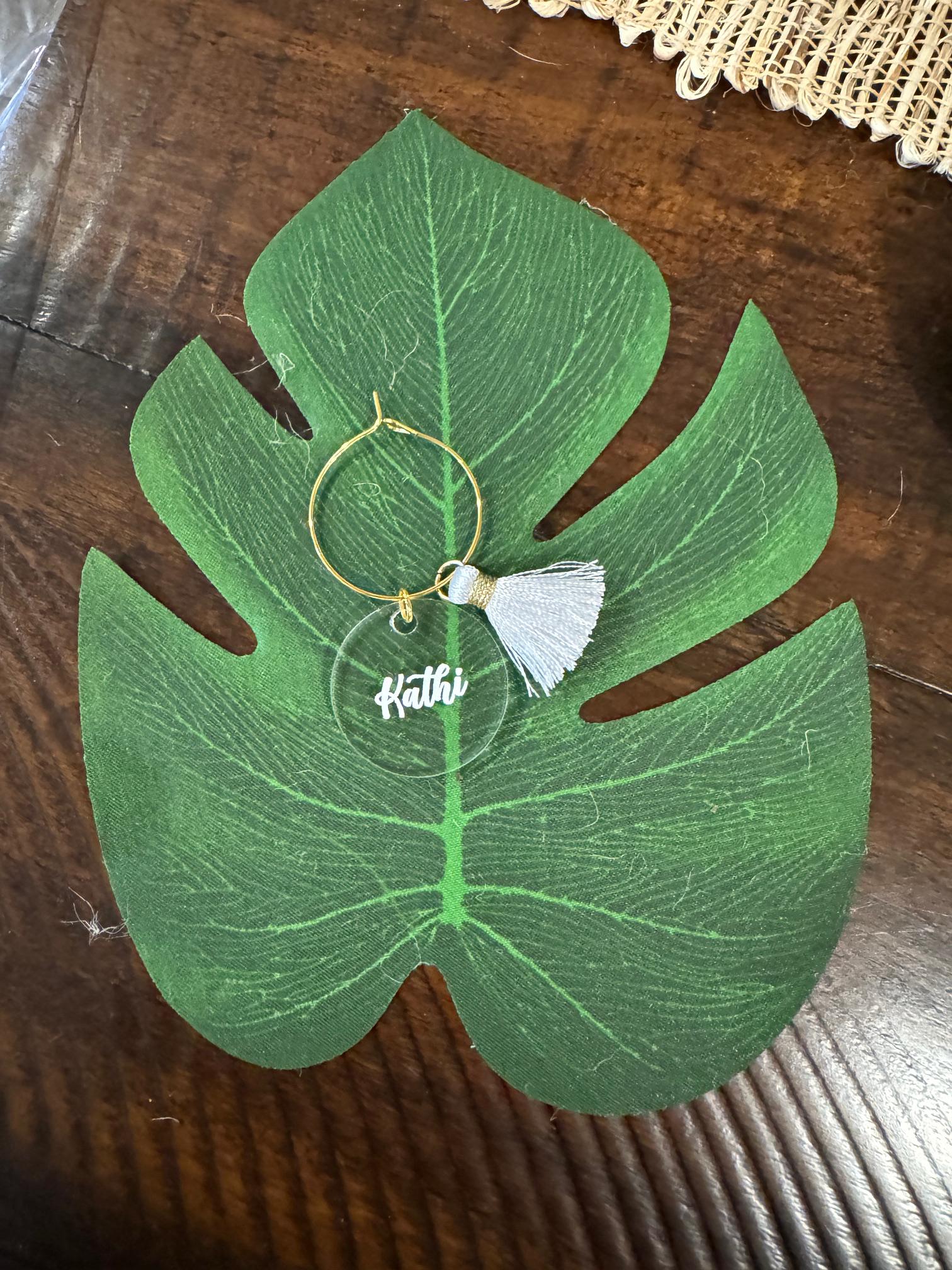 Enhance your wine tasting experience with our 1" round acrylic custom printed name wine stem charms. Order now and make your wine glasses stand out with personalized elegance and style. Cheers to unforgettable moments and great conversations!