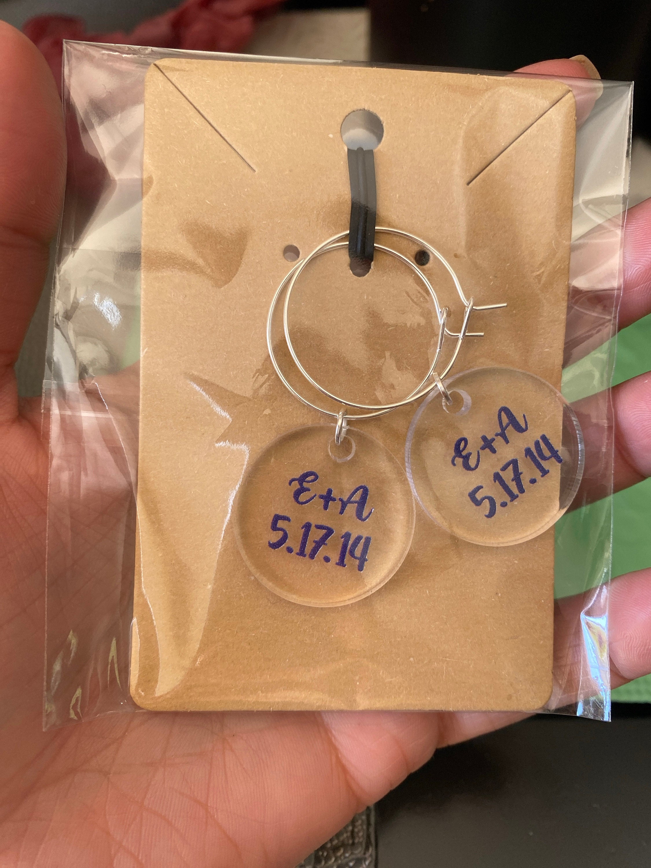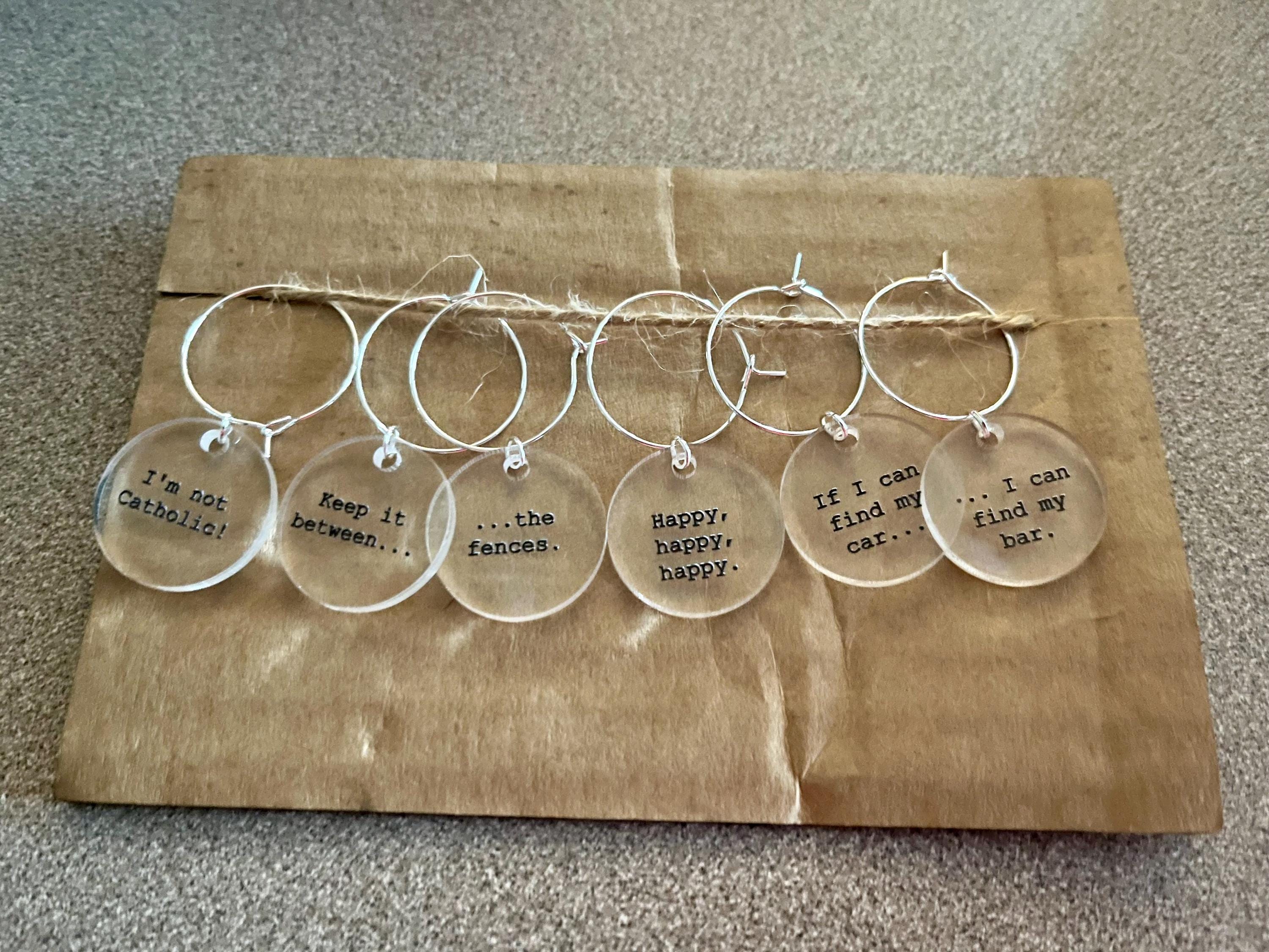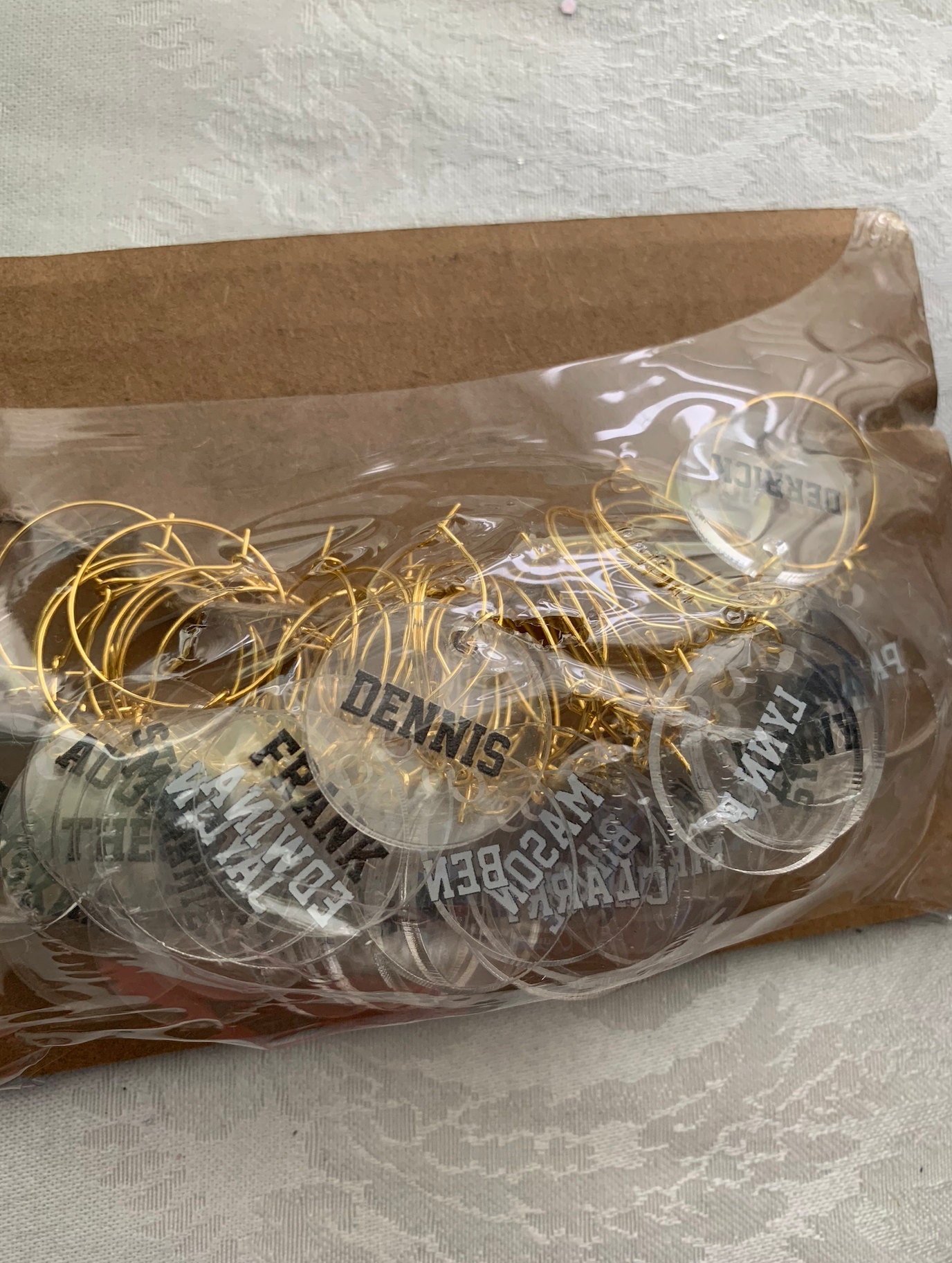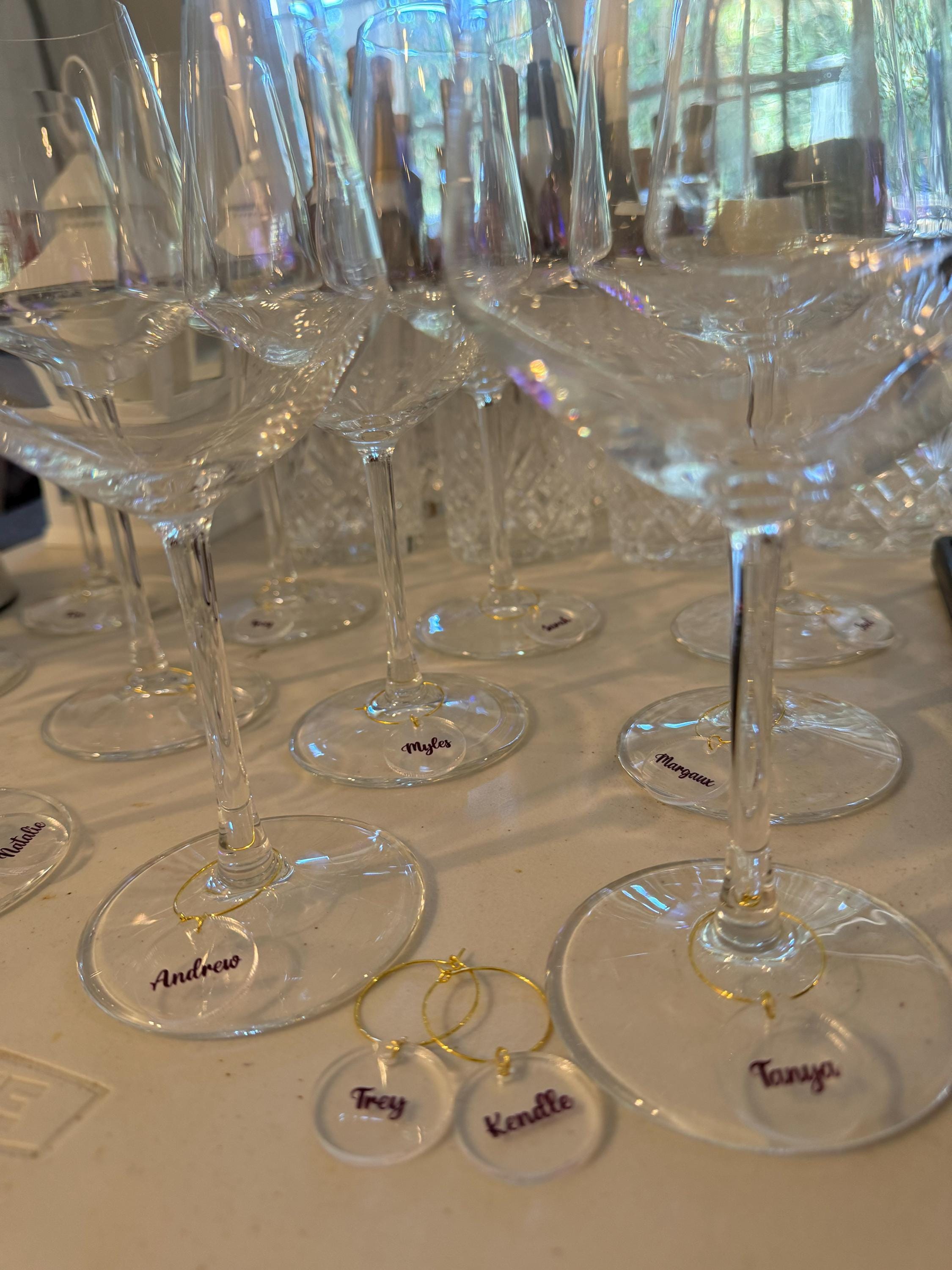 Enhance your wine tasting experience with our 1" round acrylic custom printed name wine stem charms. Order now and make your wine glasses stand out with personalized elegance and style. Cheers to unforgettable moments and great conversations!