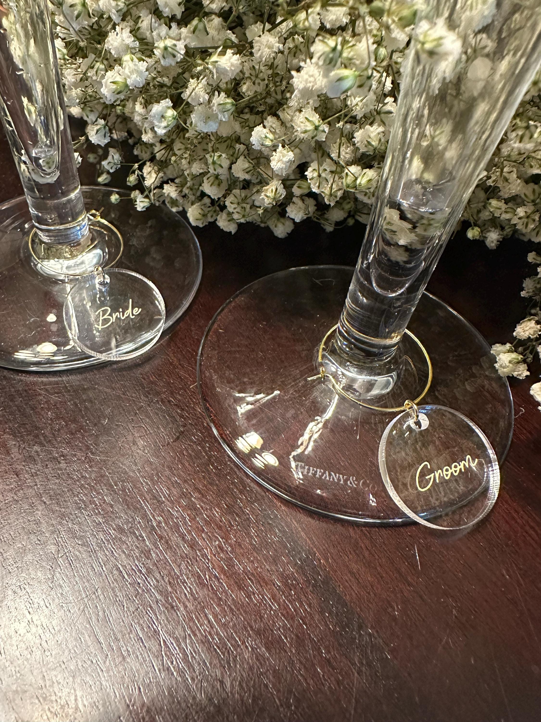 What makes our wine stem charms truly special is the option for custom engraving. Each charm can be personalized with a custom name of your choice, elegantly etched onto the surface. This personalization adds a unique and thoughtful element to your wine glasses, making them easily distinguishable and adding a touch of sophistication to any occasion.