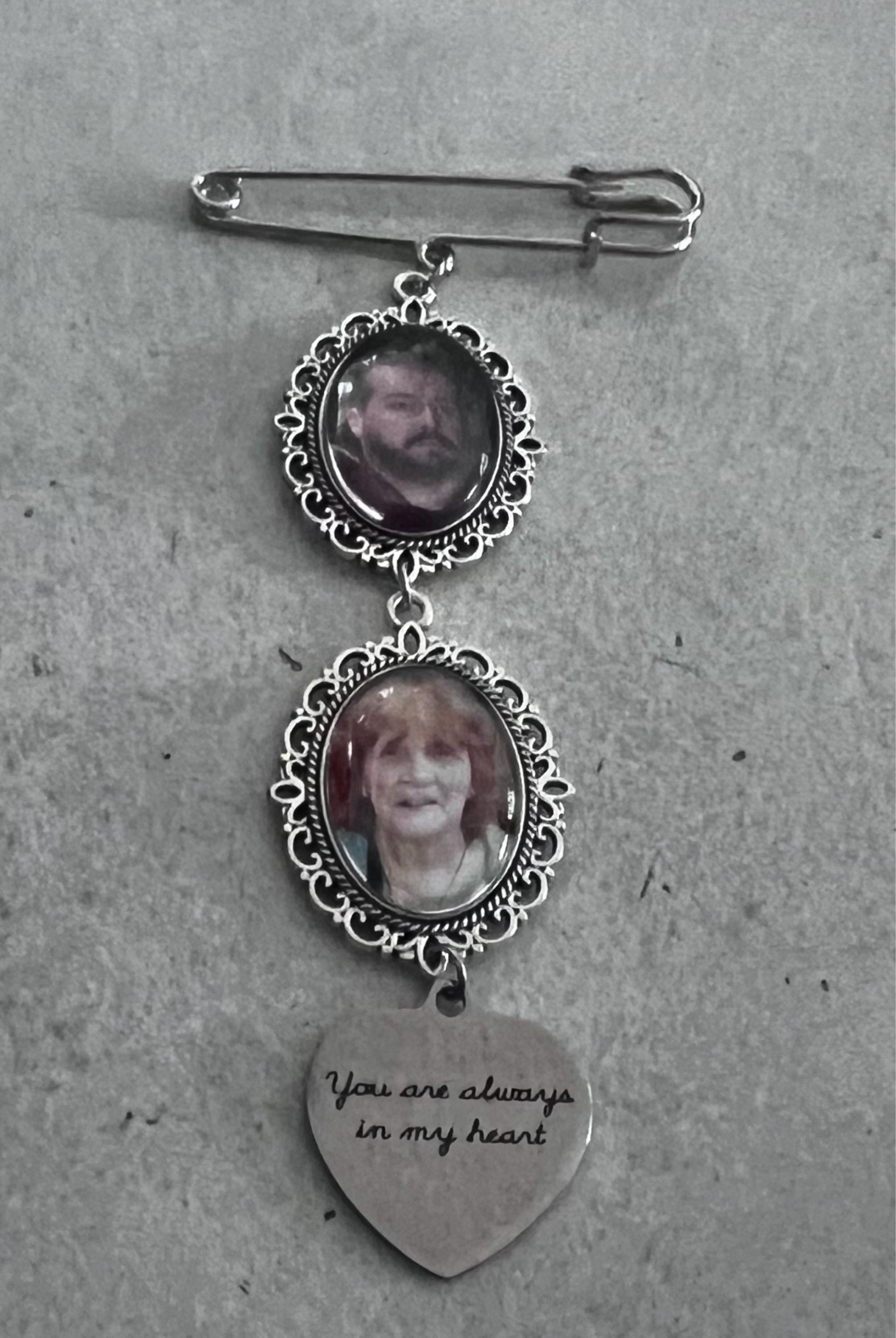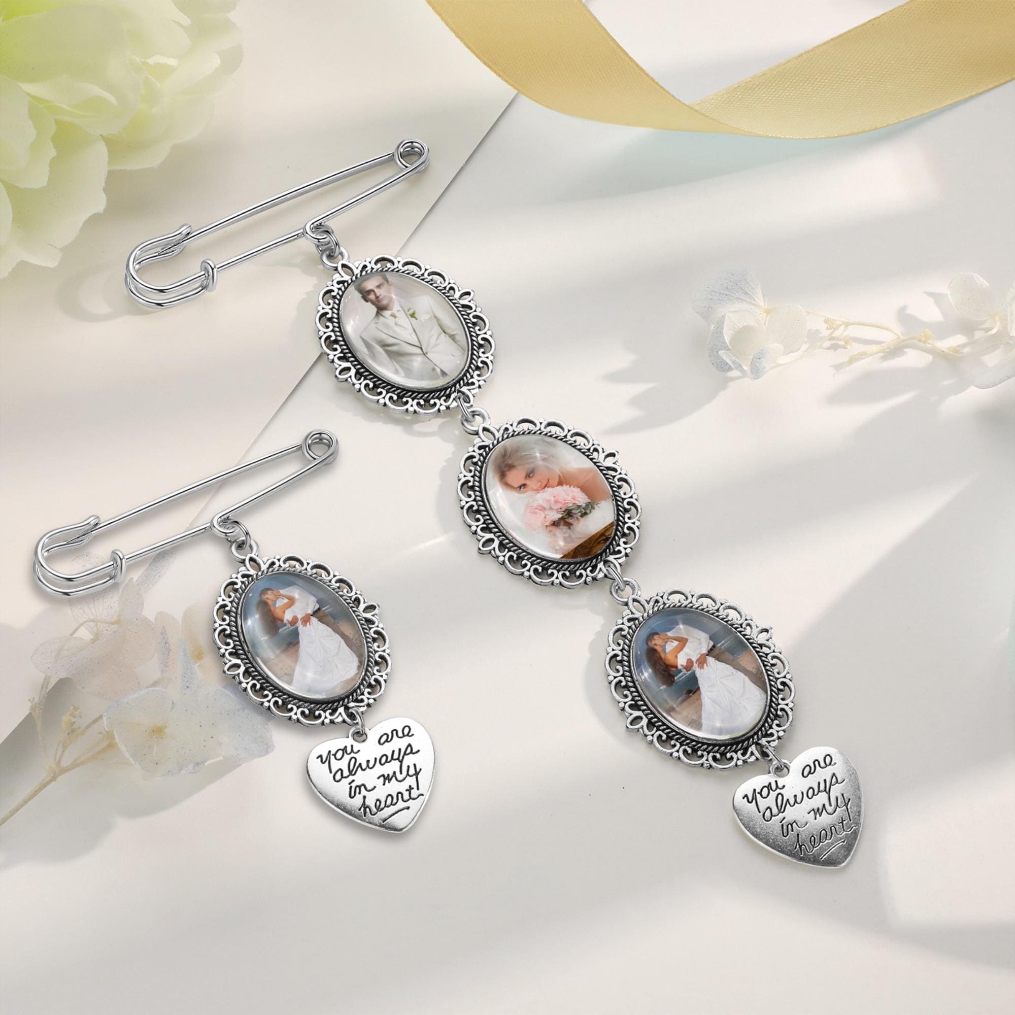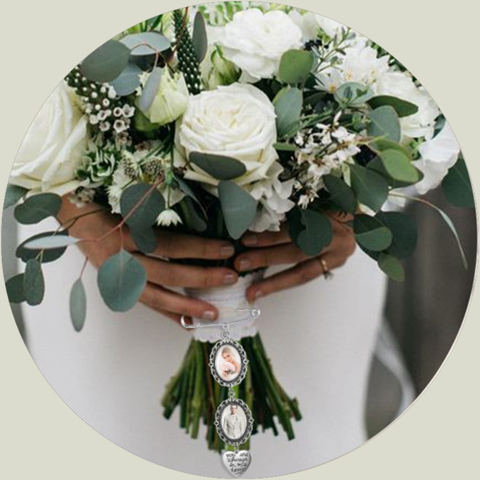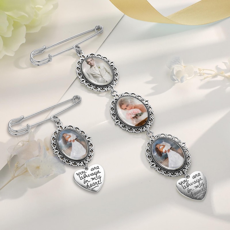 This memorial bridal bouquet ornament is the perfect way to bring your loved ones together on their special day. These lapel pins can be customized with 1-3 cherished photos, making them an intimate keepsake that captures special memories. It can be tied or pinned to the bouquet so their memories are close at hand. Your photo is printed directly onto the ornament, creating a lasting keepsake. It will be ready to use, this is not a DIY kit.