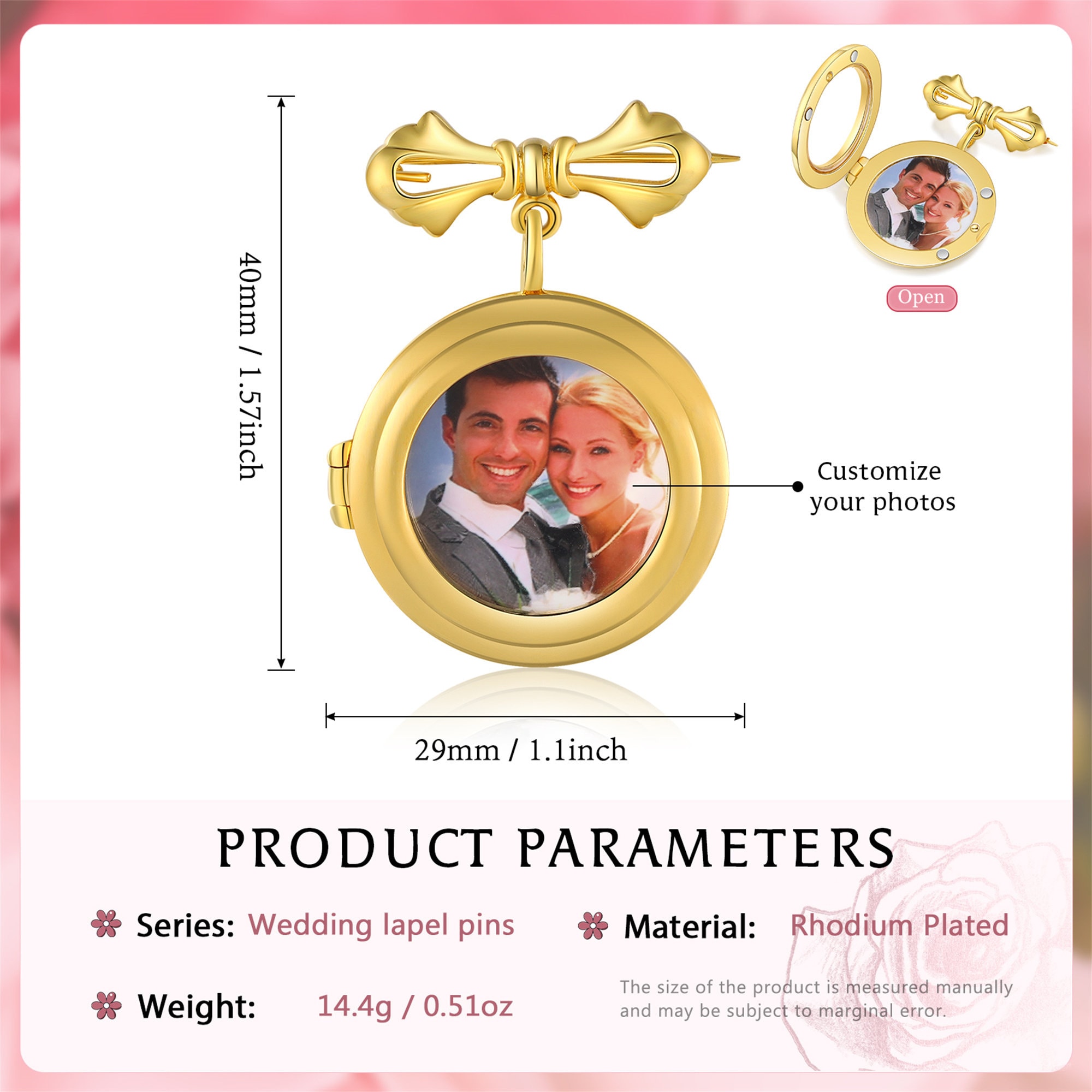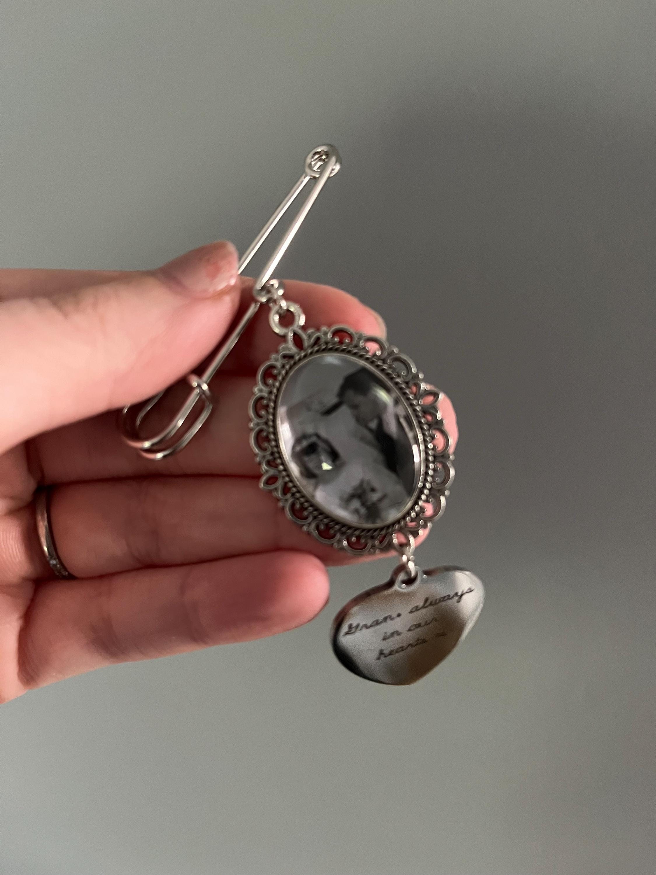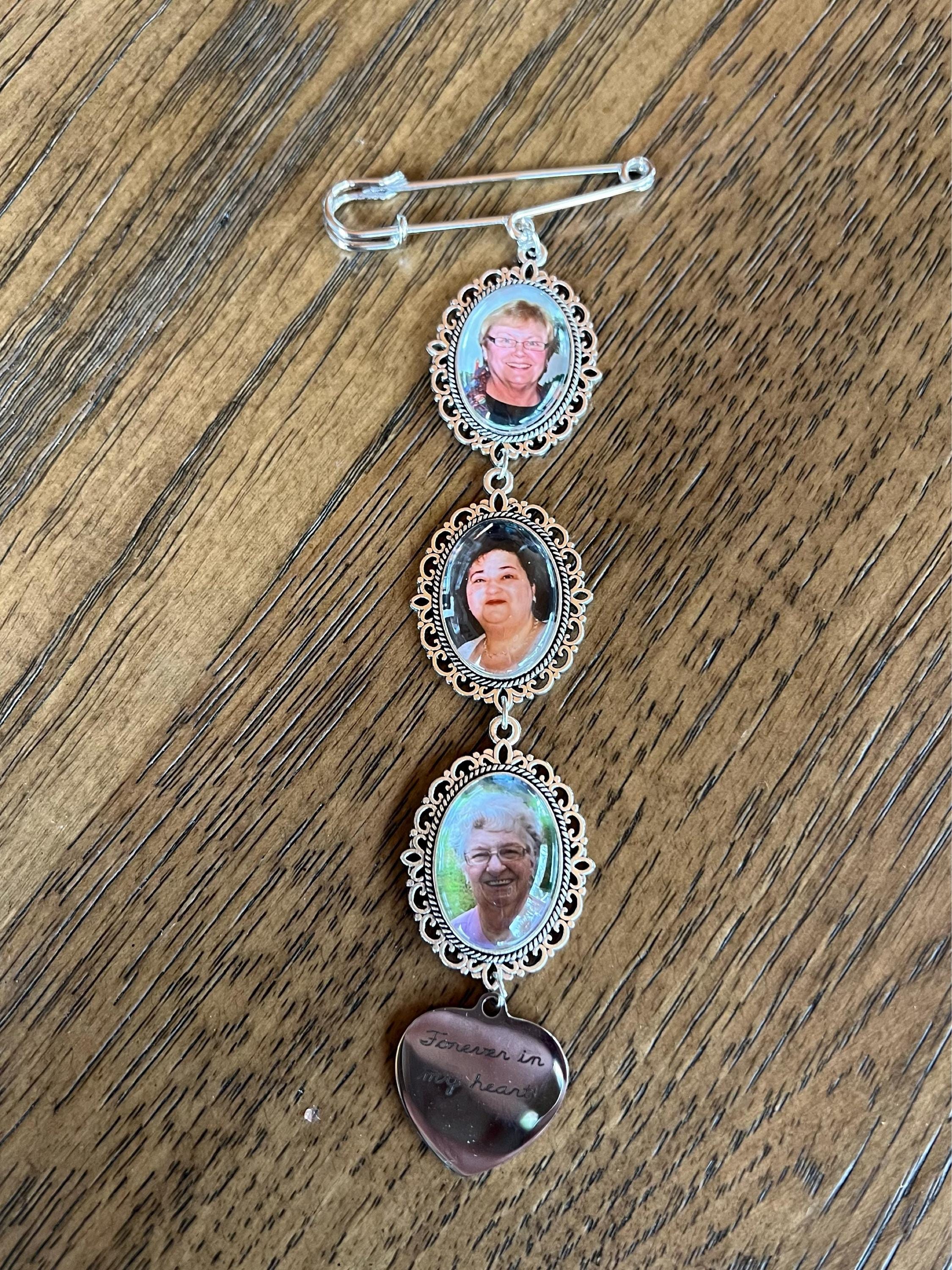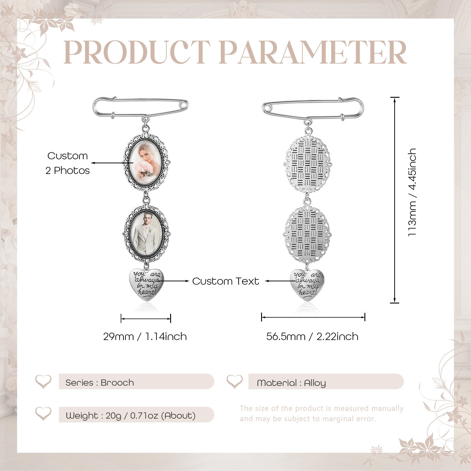 This memorial bridal bouquet ornament is the perfect way to bring your loved ones together on their special day. These lapel pins can be customized with 1-3 cherished photos, making them an intimate keepsake that captures special memories. It can be tied or pinned to the bouquet so their memories are close at hand. Your photo is printed directly onto the ornament, creating a lasting keepsake. It will be ready to use, this is not a DIY kit.