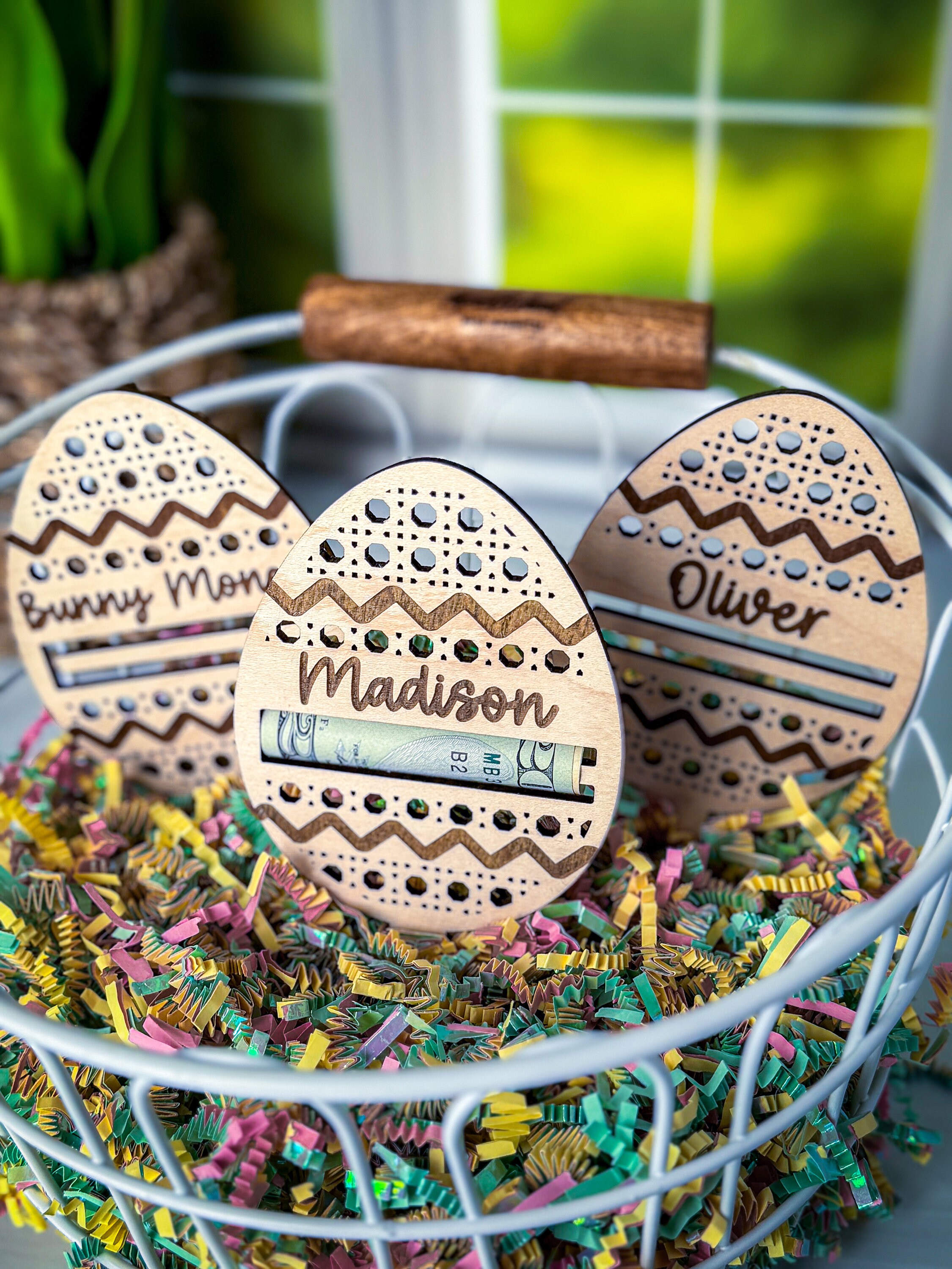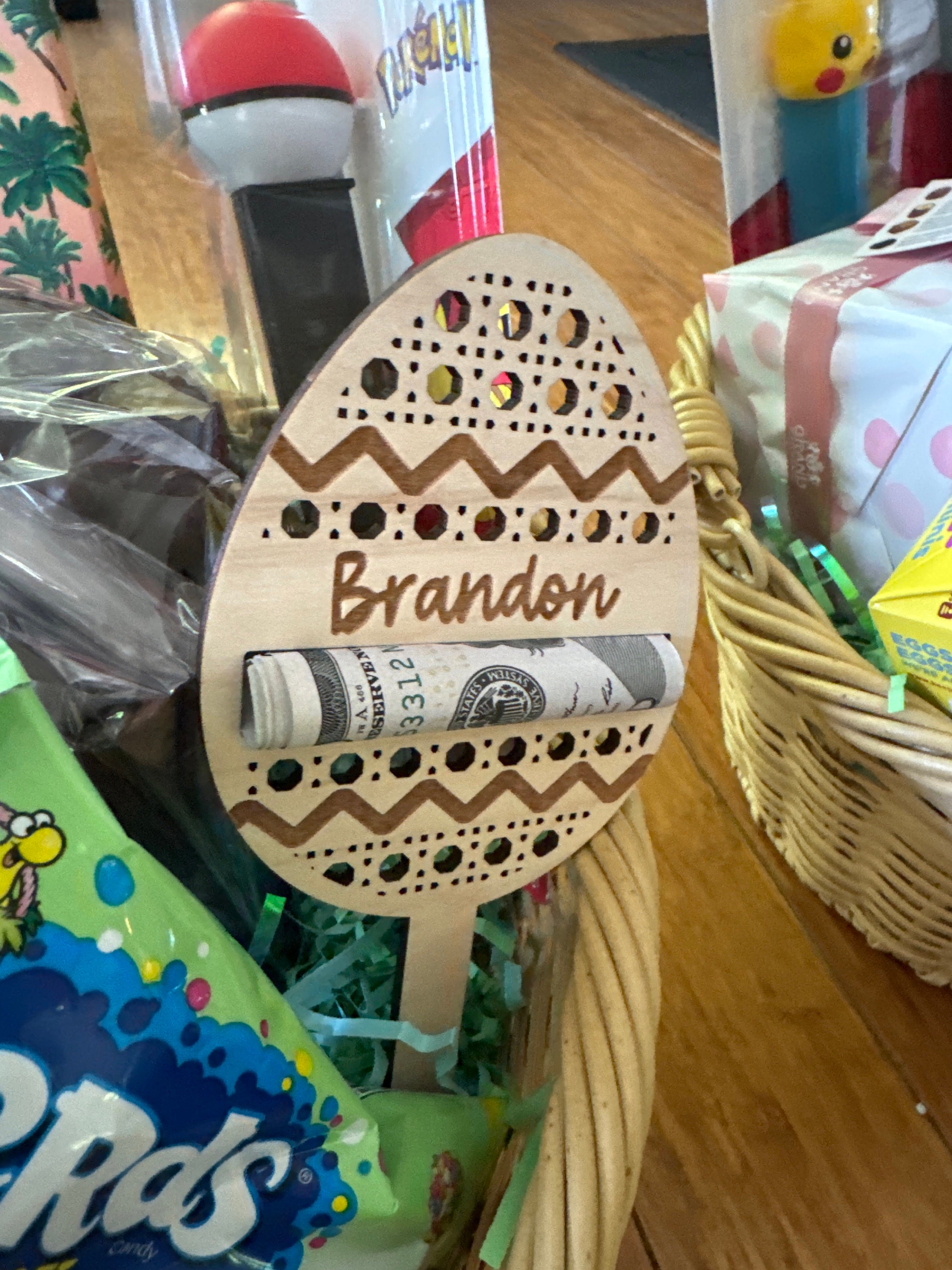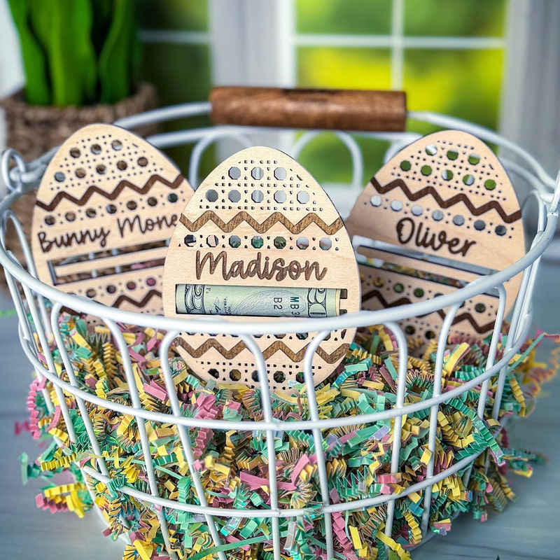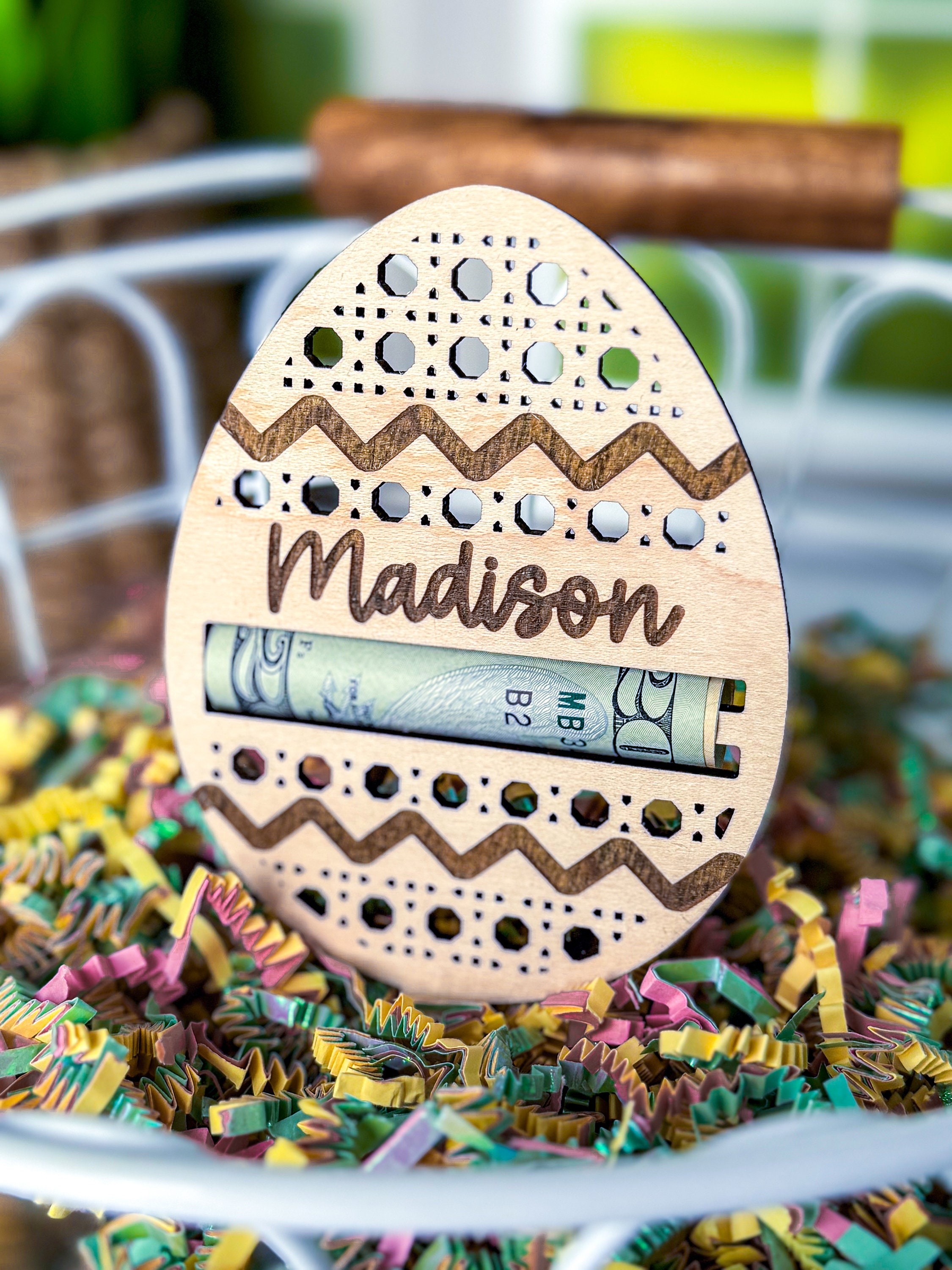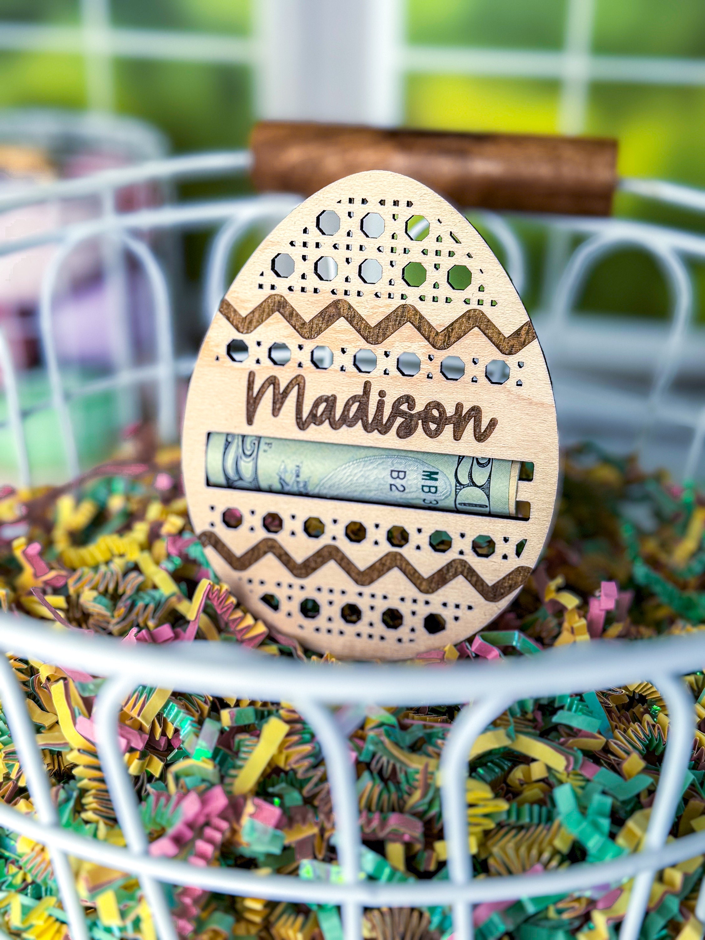 These personalized easter egg money holders feature a name and a slot to put money. They are the perfect touch for an easter basket and make the perfect Easter Basket stuffer. Perfect gift for your teen, boy, or girl! They also have a stake on them so they can easily be stuck in the easter basket grass.