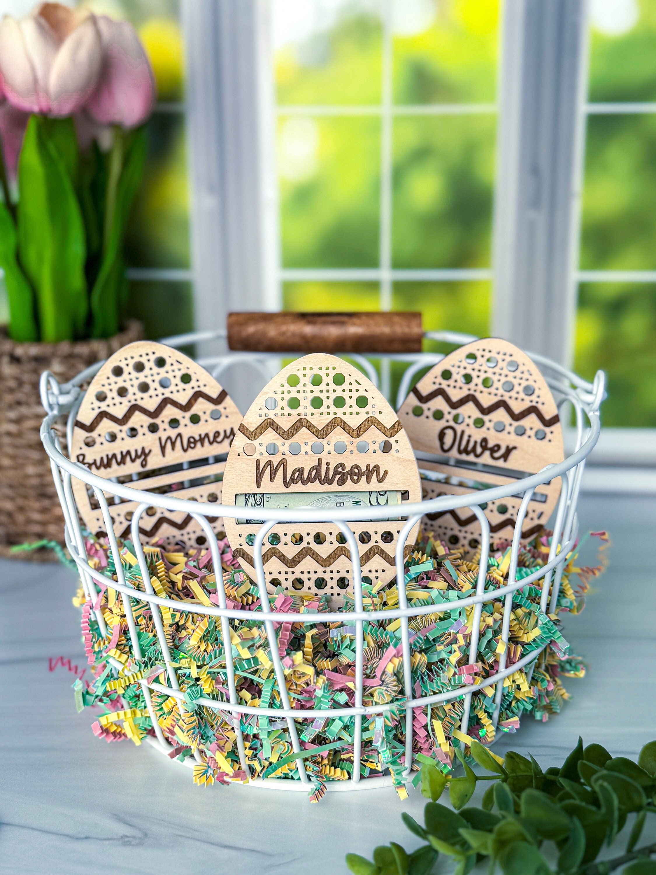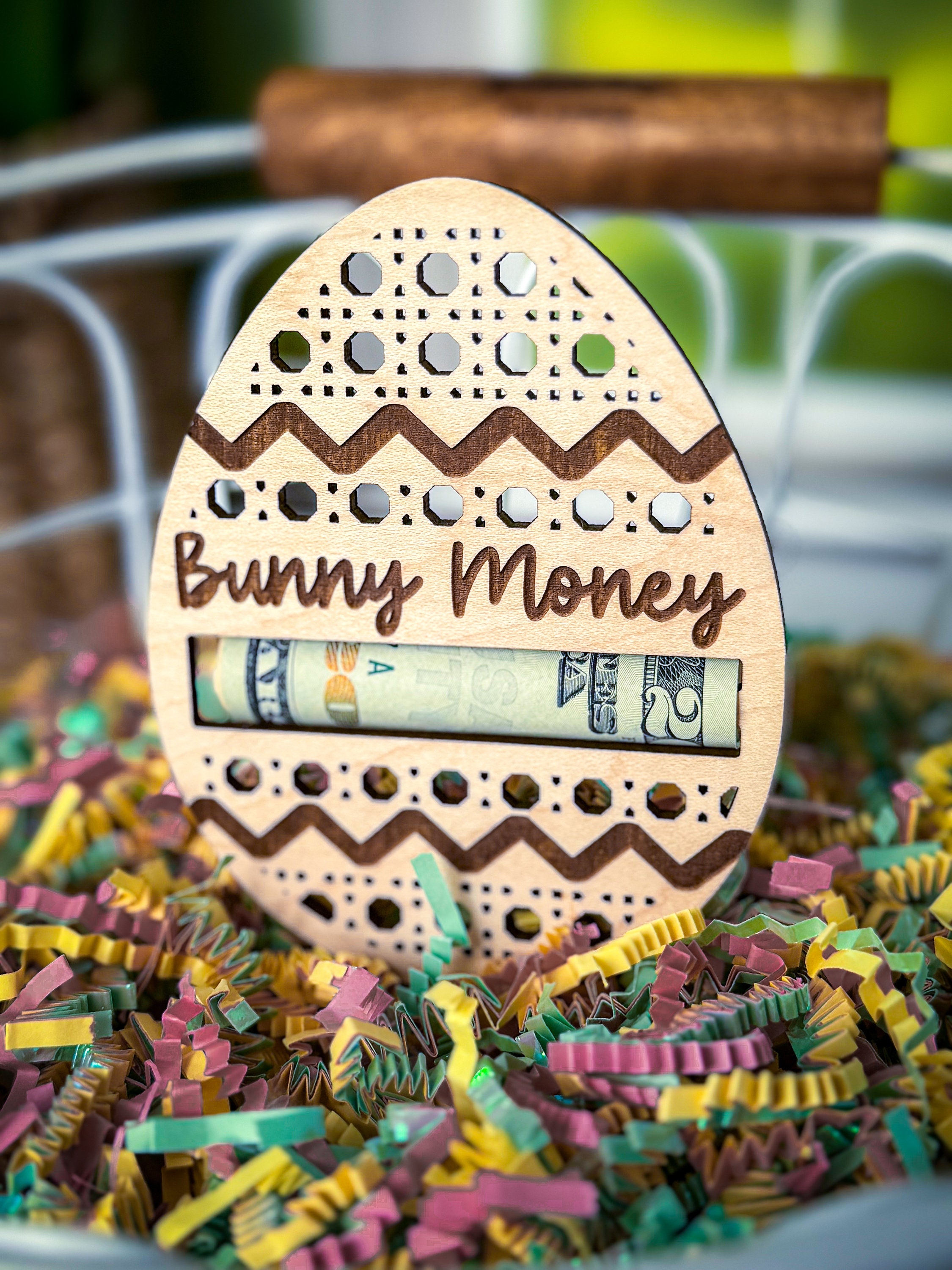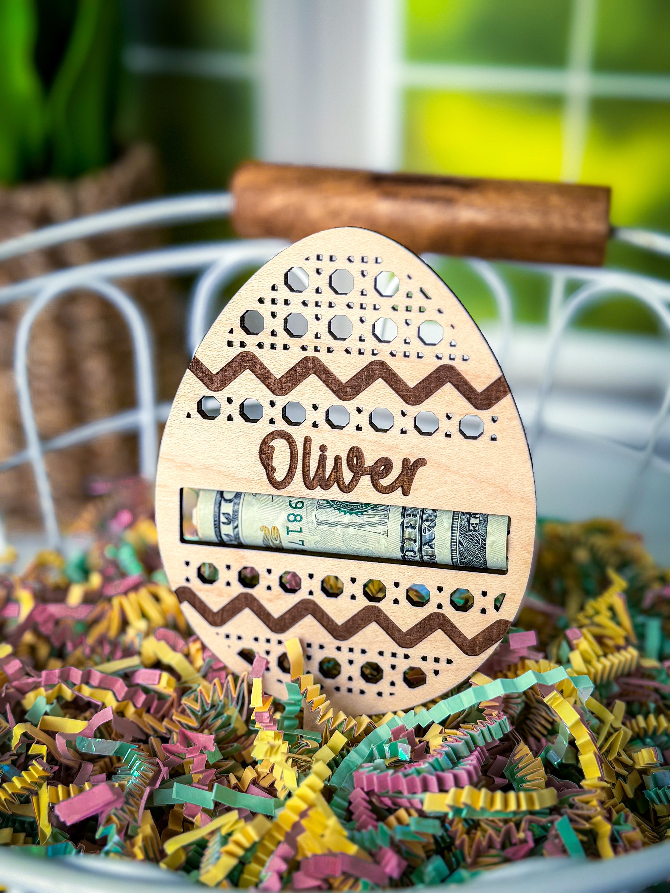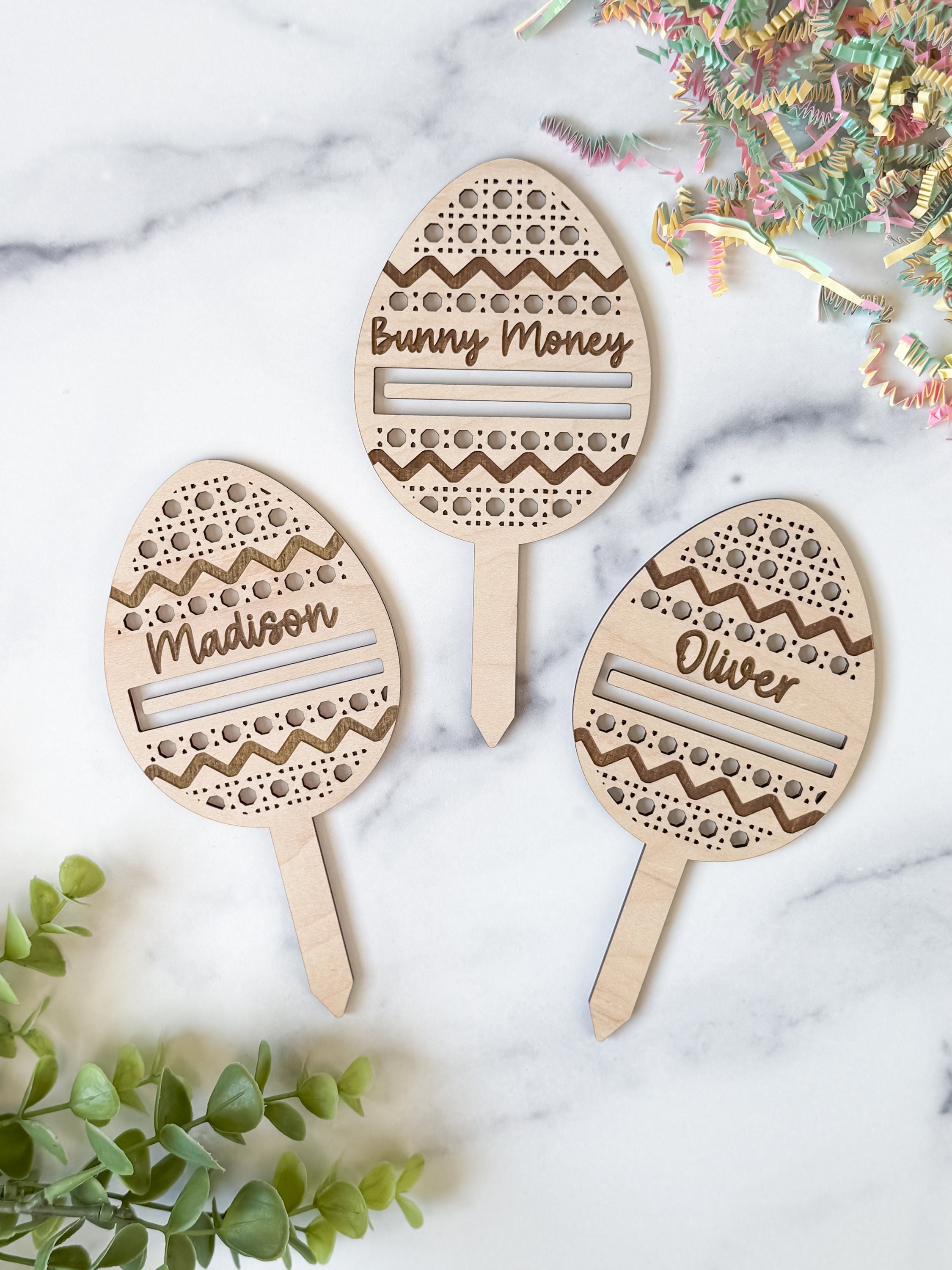 These personalized easter egg money holders feature a name and a slot to put money. They are the perfect touch for an easter basket and make the perfect Easter Basket stuffer. Perfect gift for your teen, boy, or girl! They also have a stake on them so they can easily be stuck in the easter basket grass.