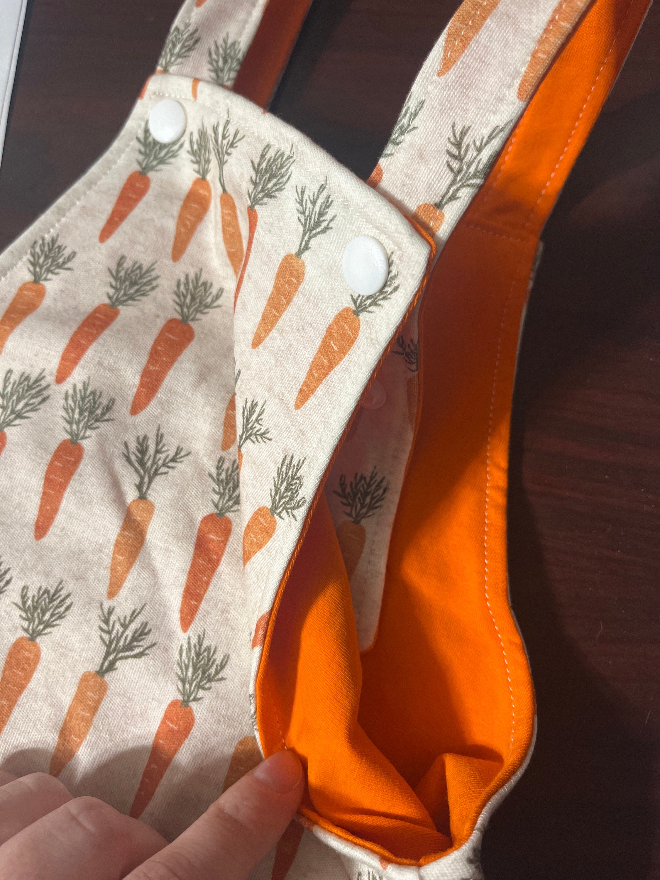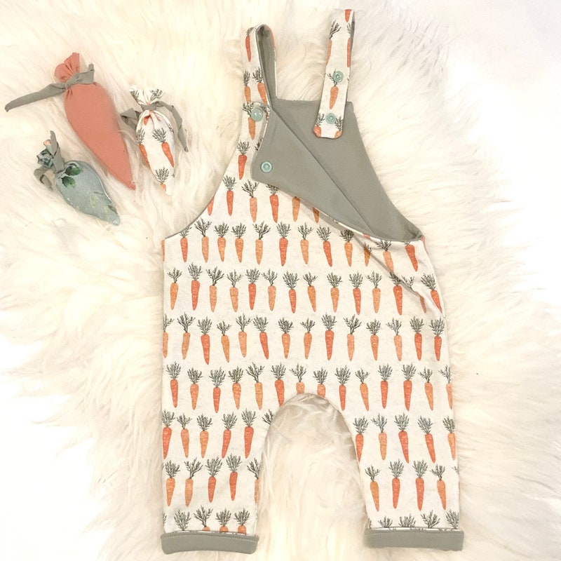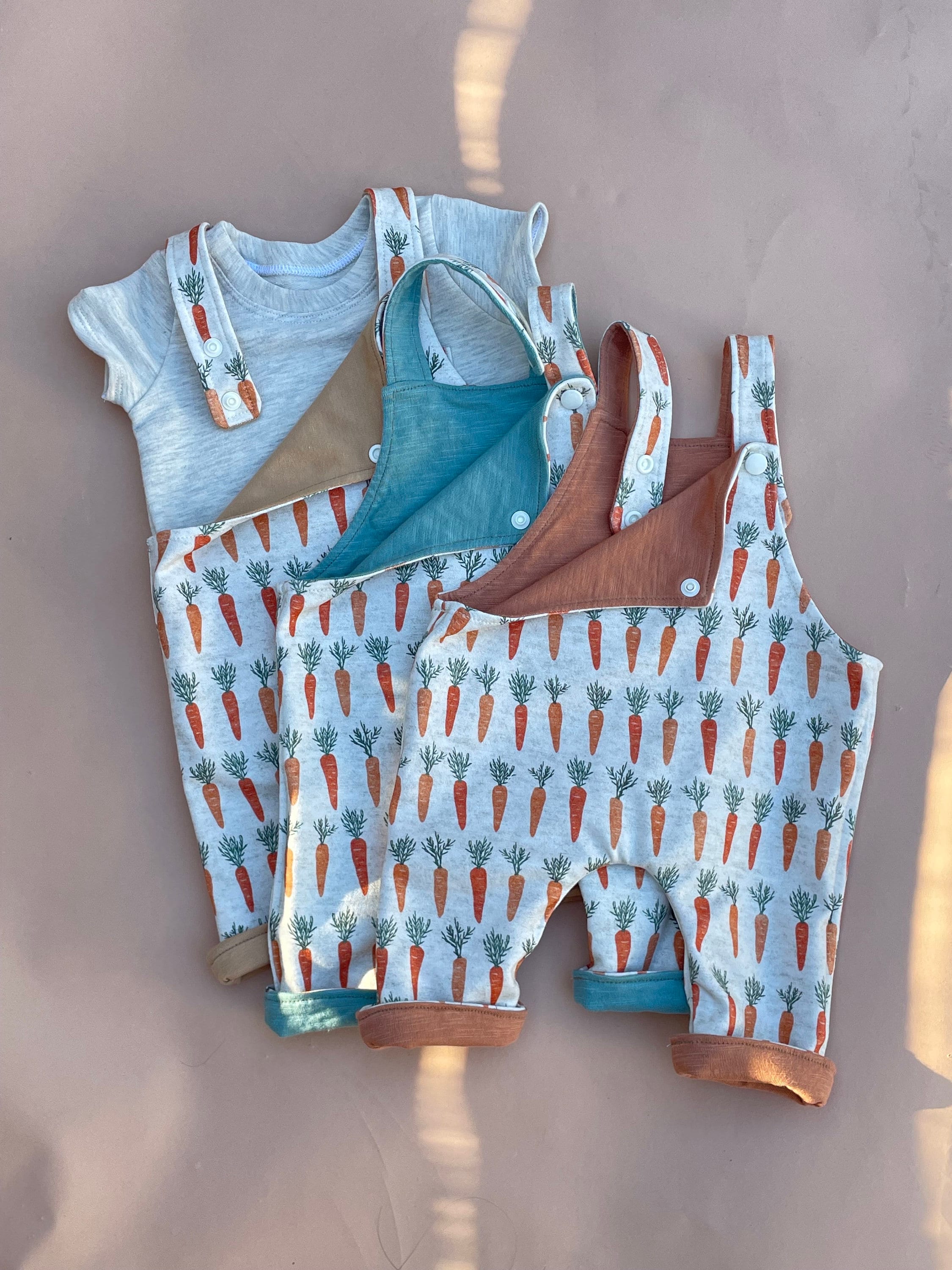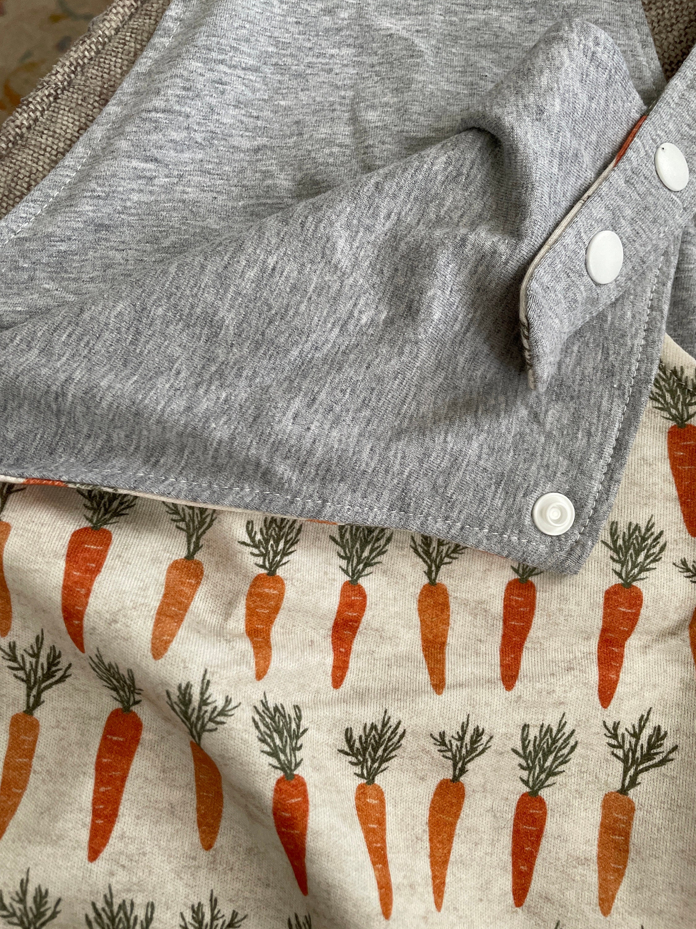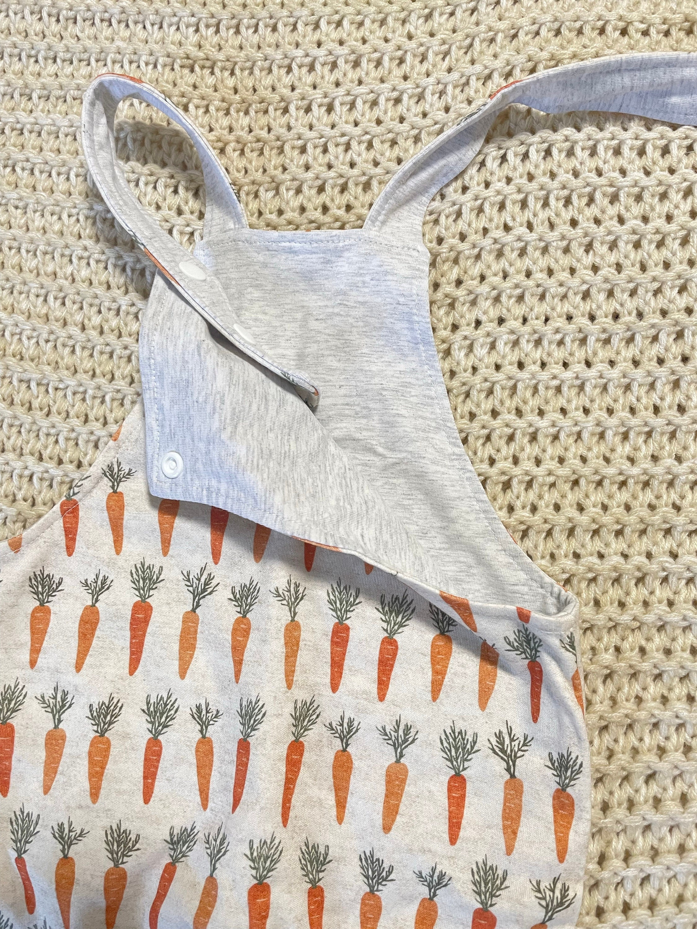 This reversible onesie has two sides, one side has a carrot pattern and the other side is a soft knit and slub fabric.