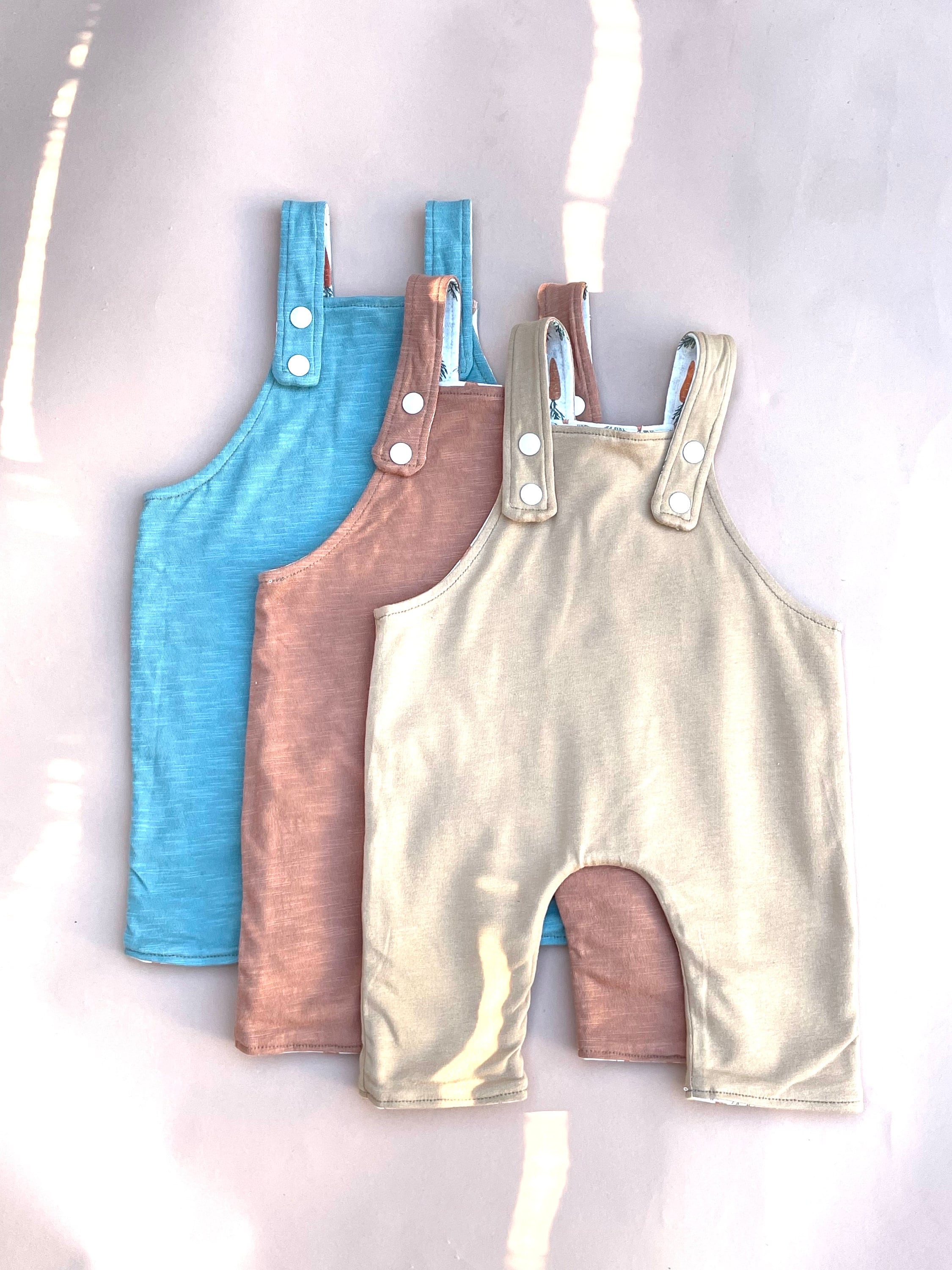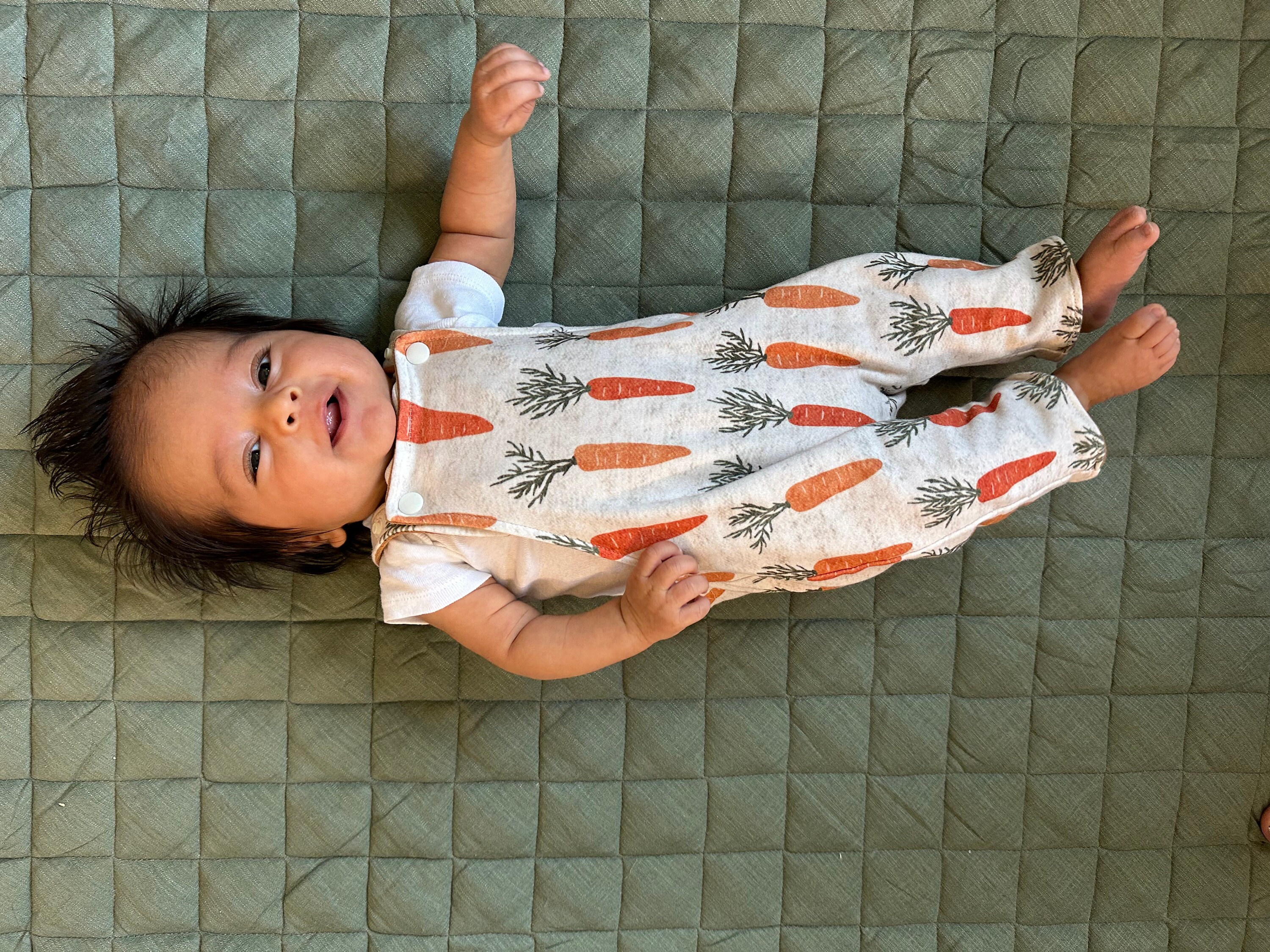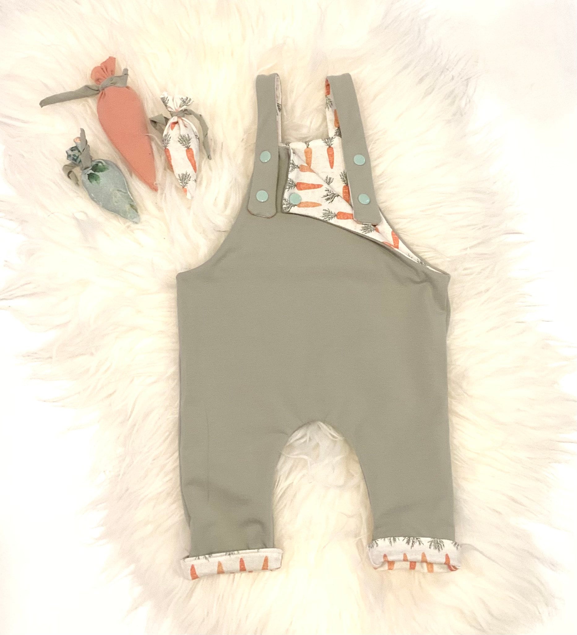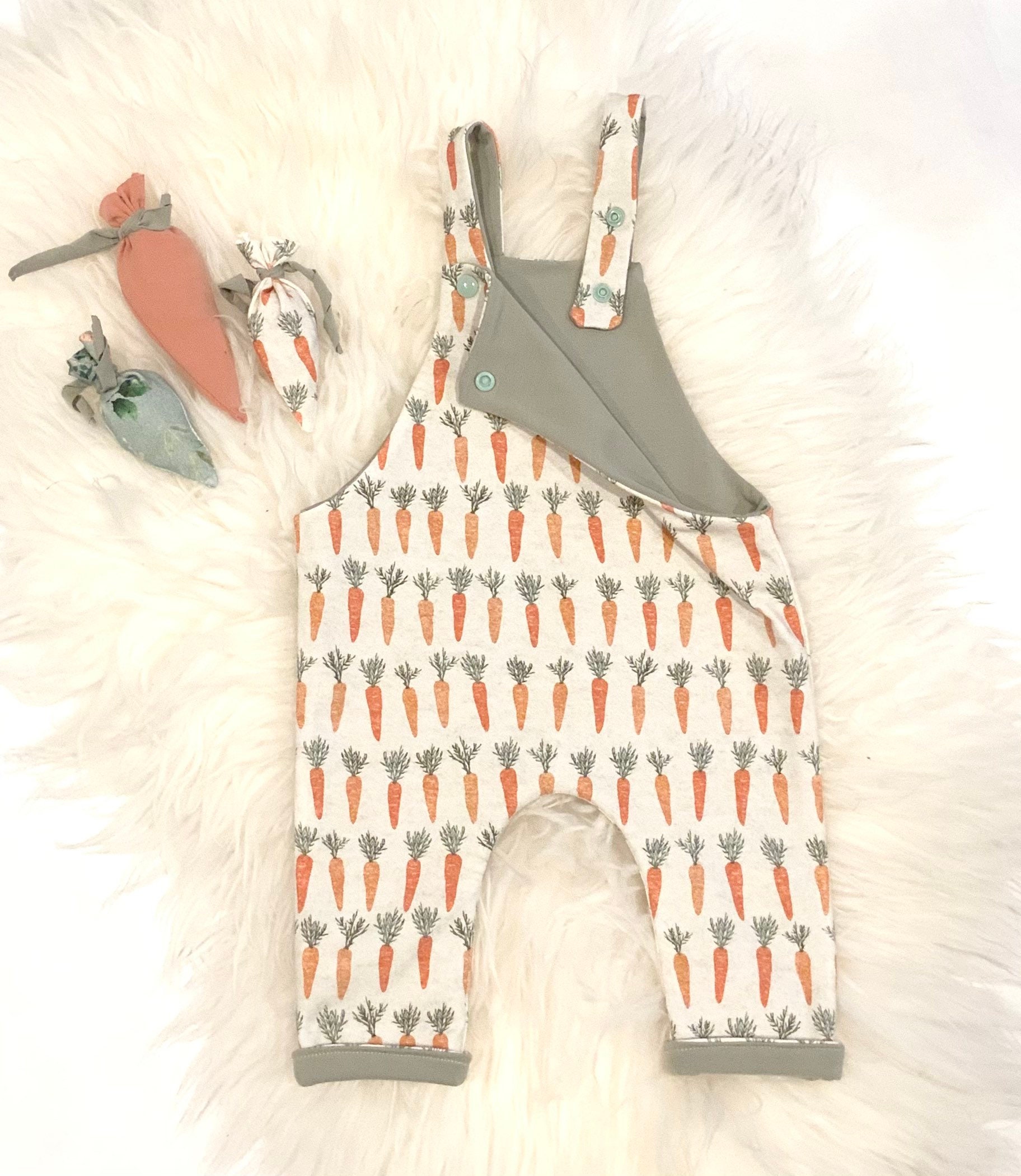 This reversible onesie has two sides, one side has a carrot pattern and the other side is a soft knit and slub fabric.