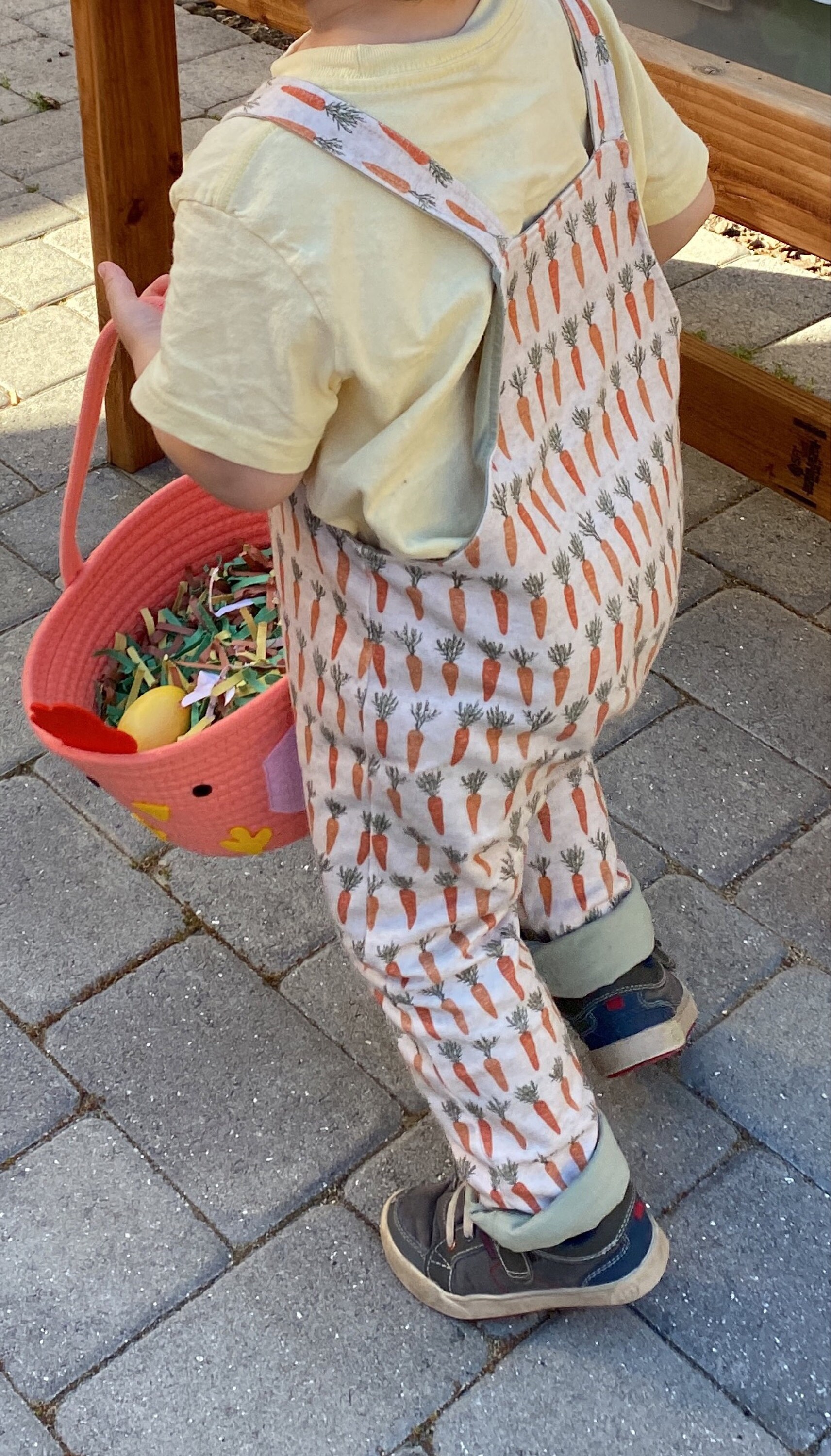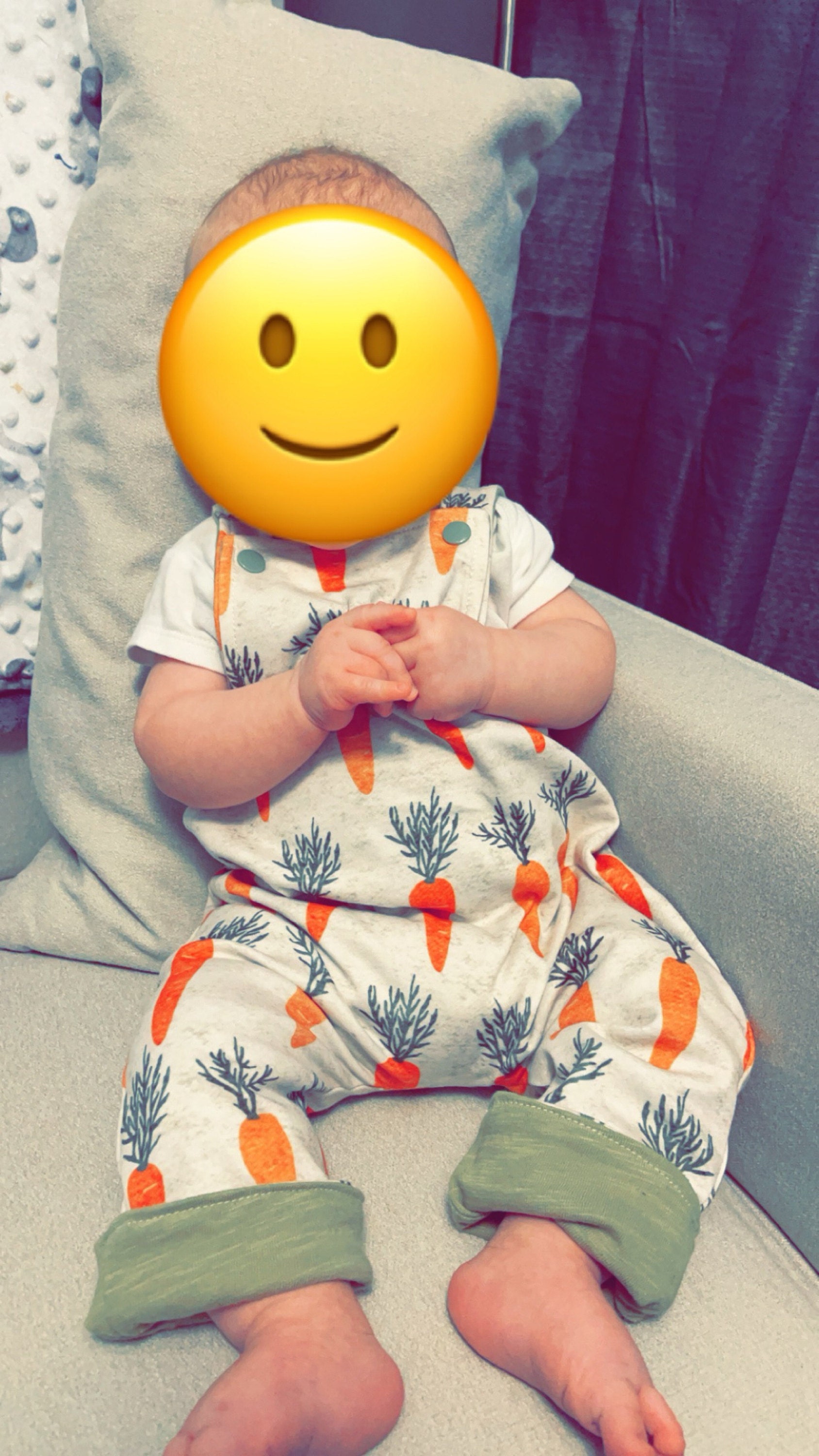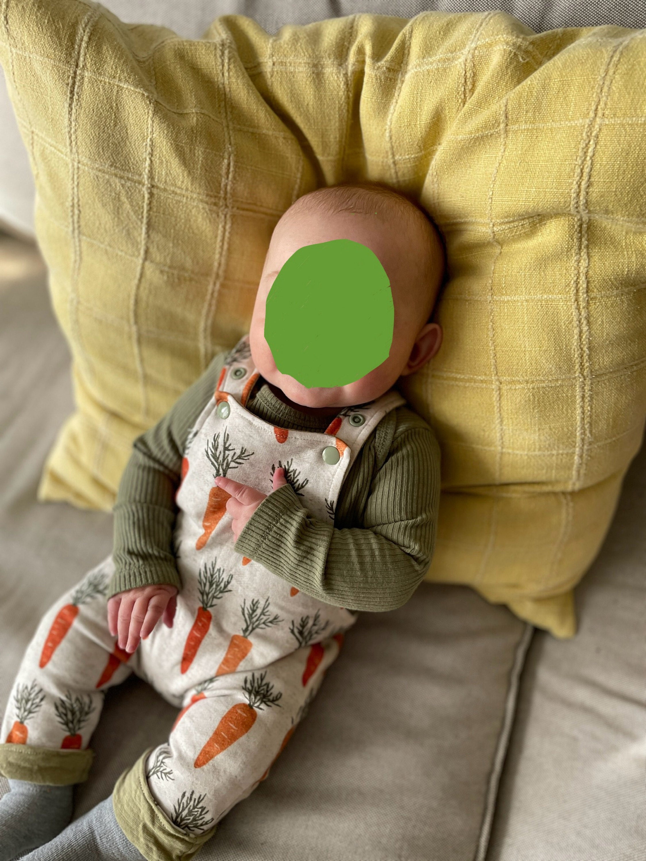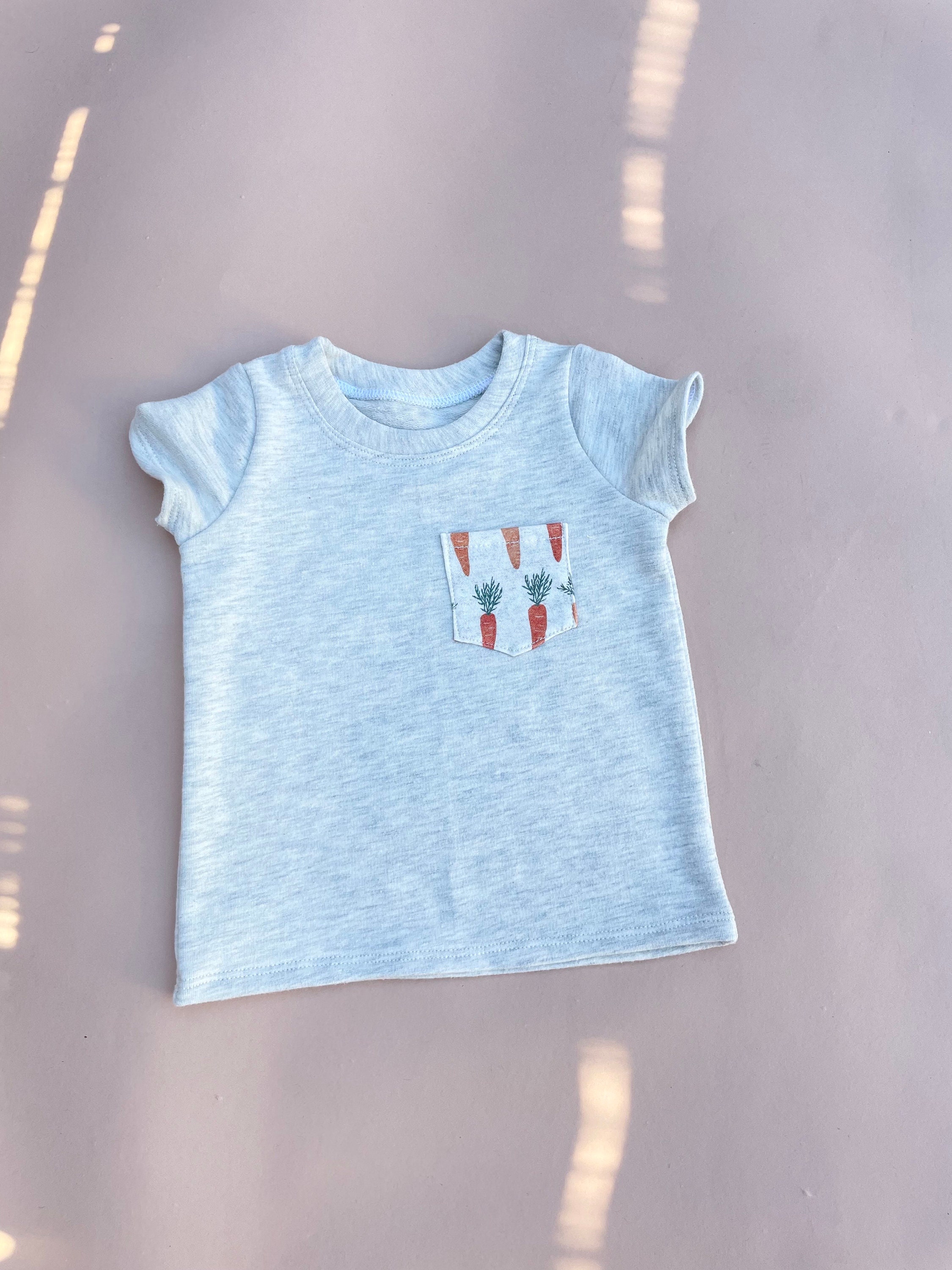 This reversible onesie has two sides, one side has a carrot pattern and the other side is a soft knit and slub fabric.