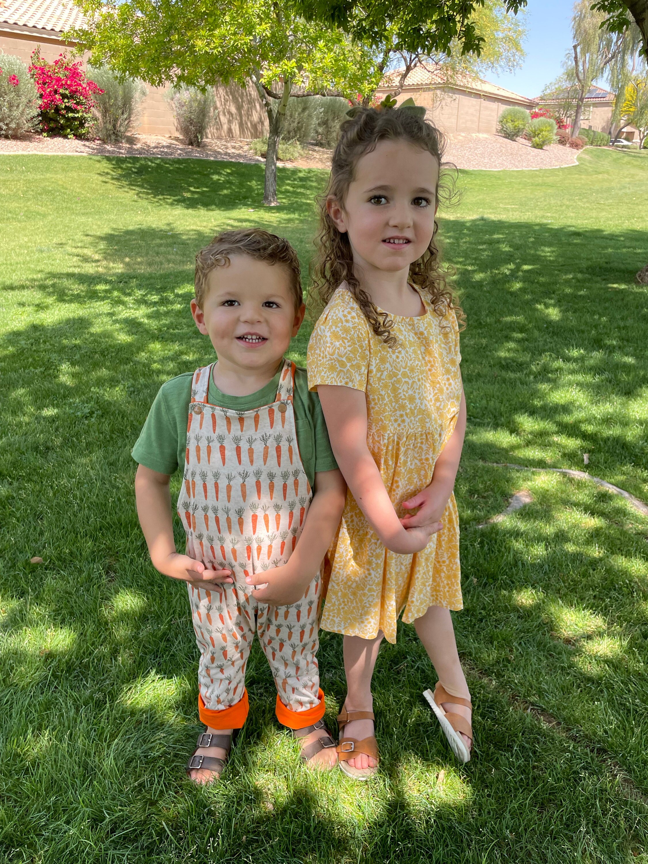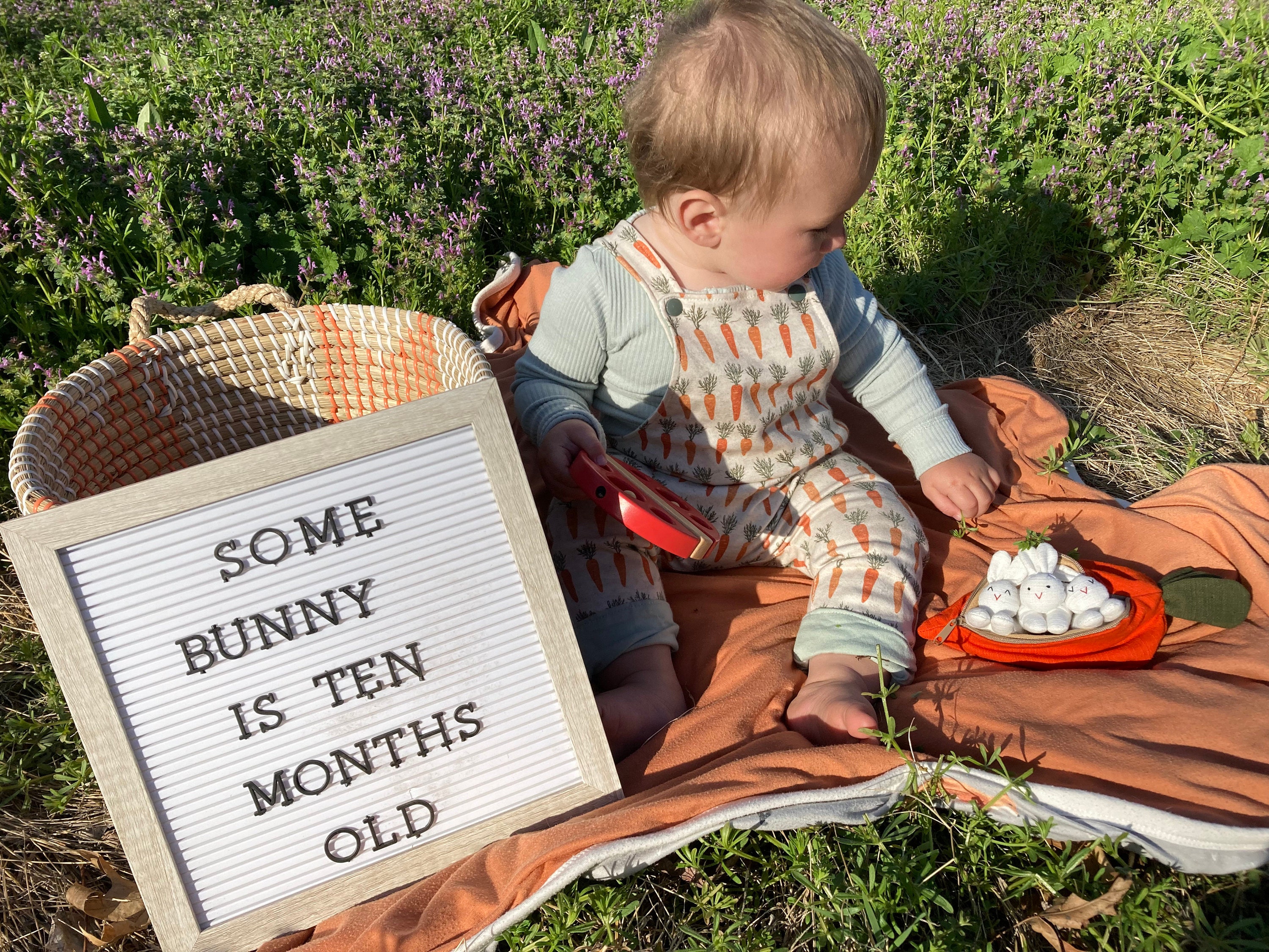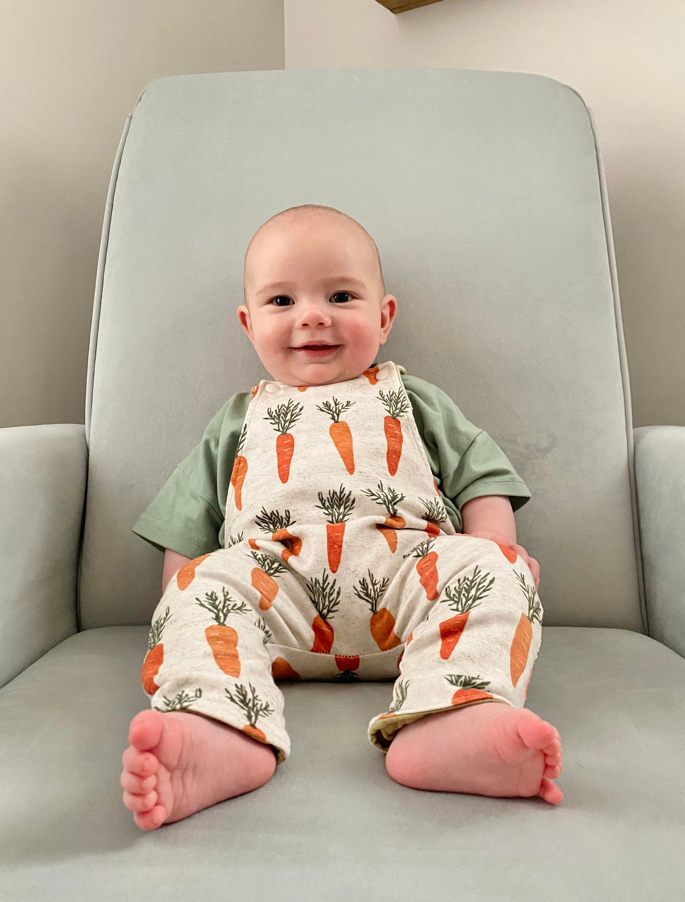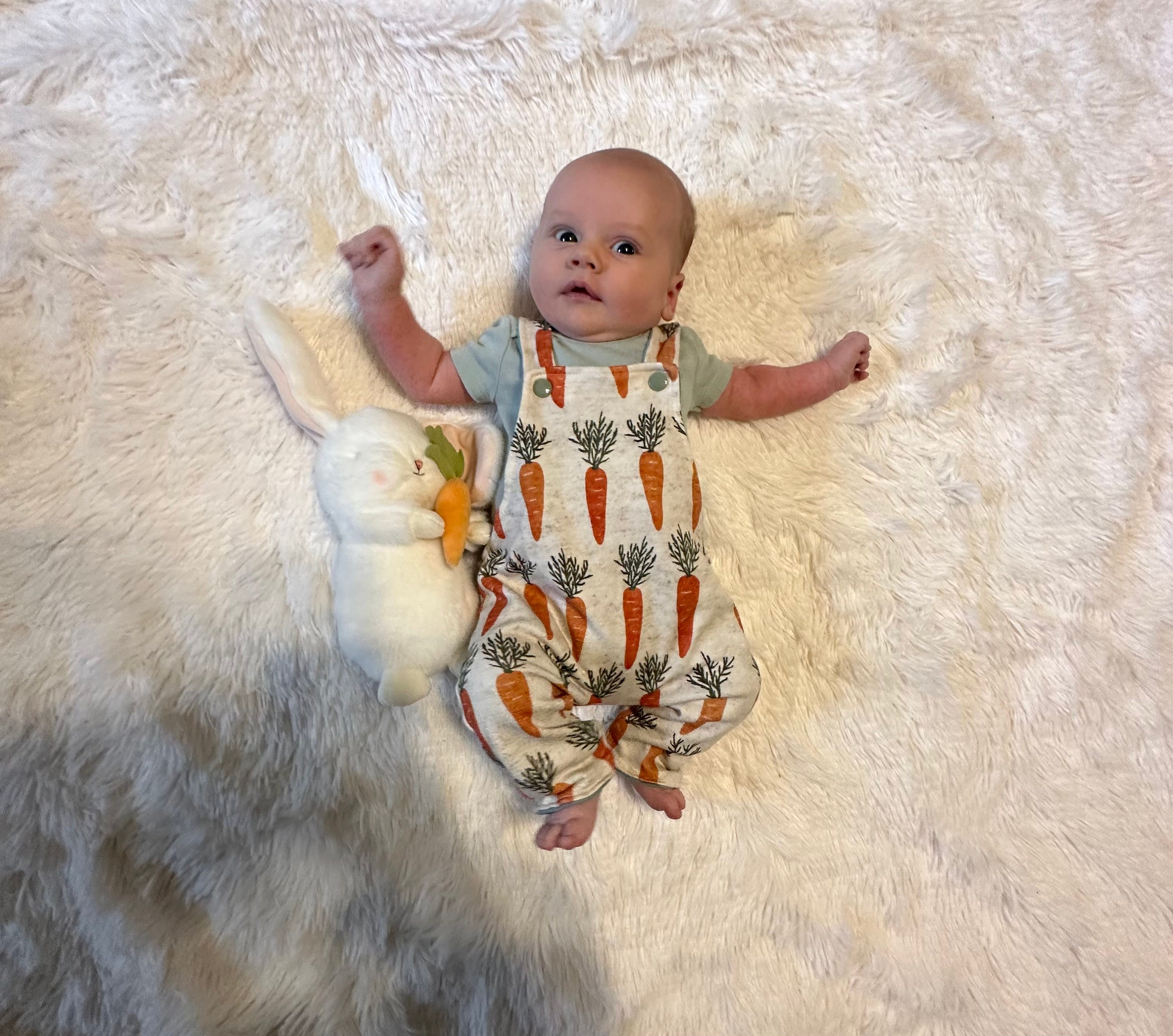 This reversible onesie has two sides, one side has a carrot pattern and the other side is a soft knit and slub fabric.