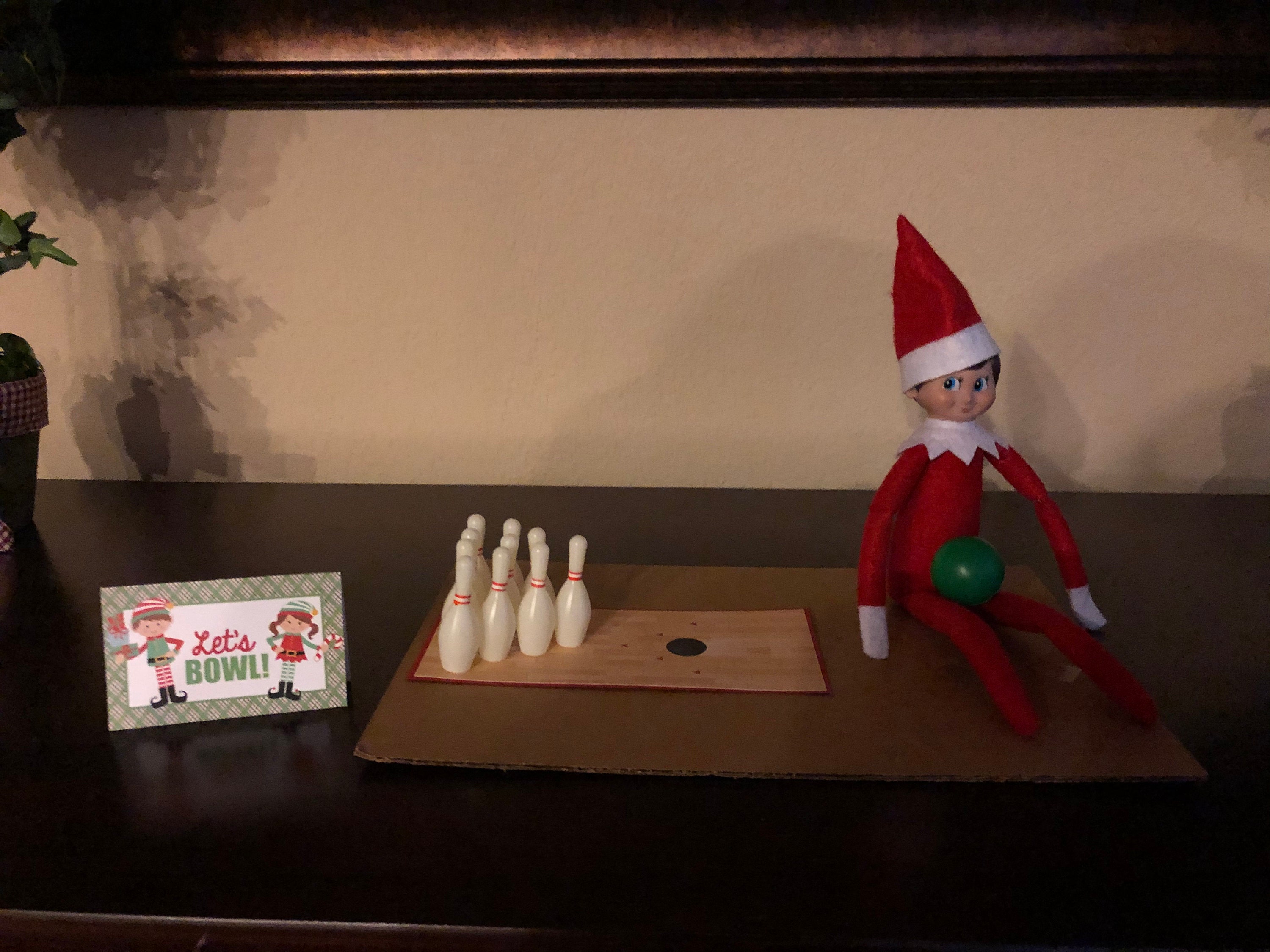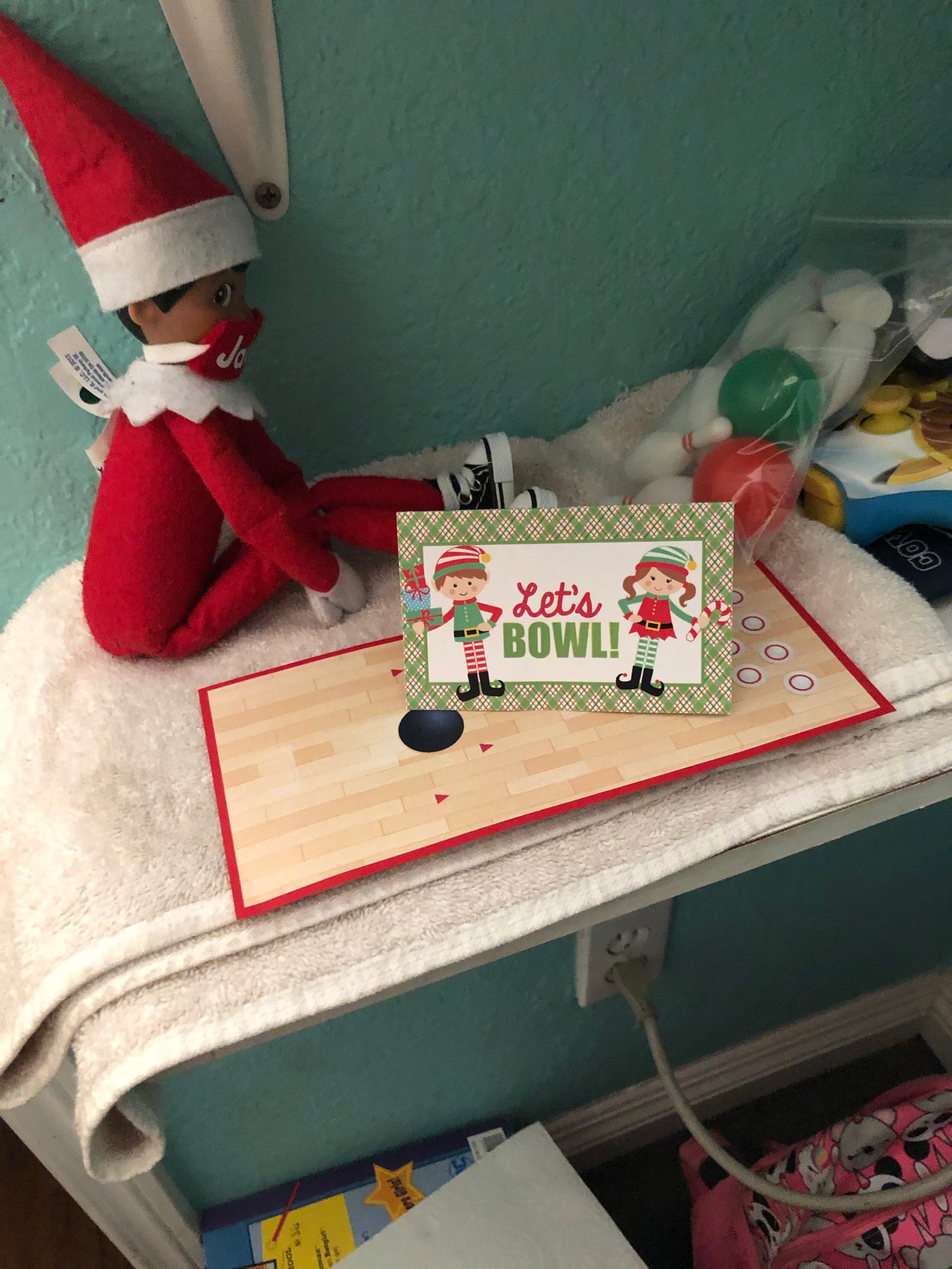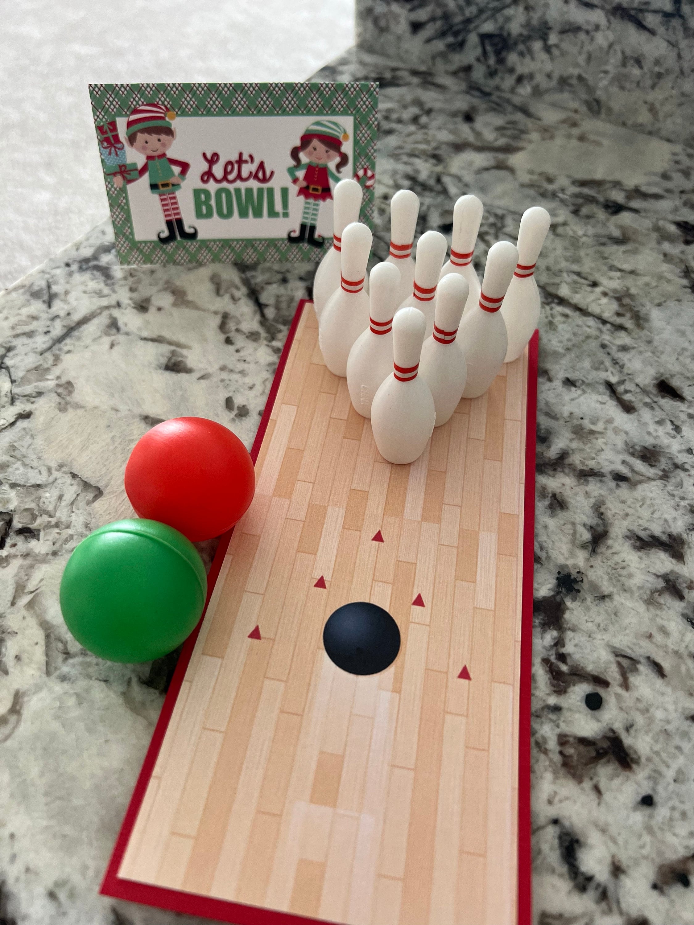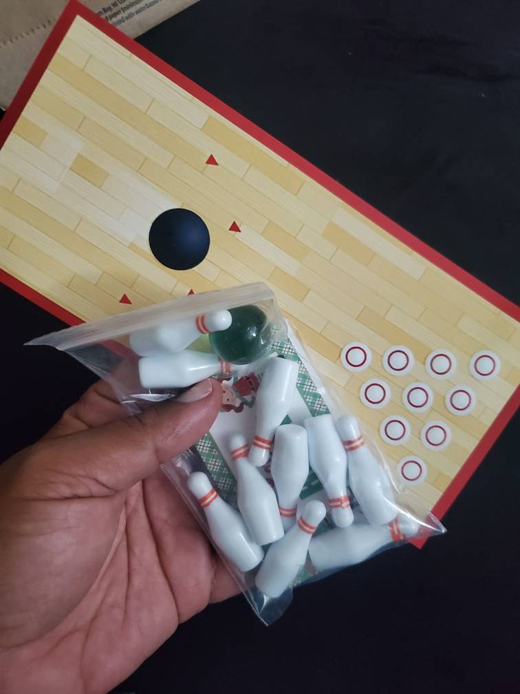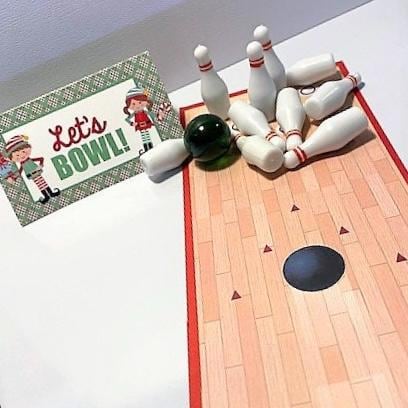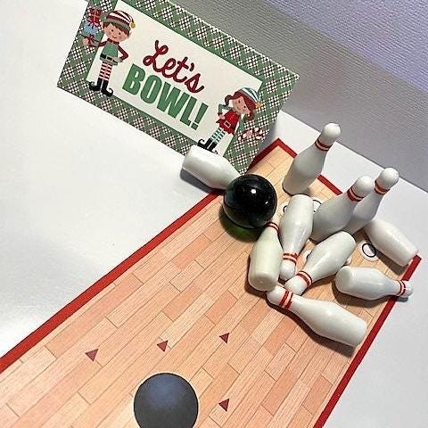 Bring out the bowler in your elf and stage with an elf sized bowling set including 10 bowling pins, 2 bowling balls, printed alley and LET'S BOWL printed tent card as shown to use for fun. Each set includes ten 2 1/4" plastic mini bowling pins and two 1 1/4" mini bowling balls. THE BOWLING ALLEY PLACED INSIDE A CARDBOARD FOLDER INSIDE THE BAG.