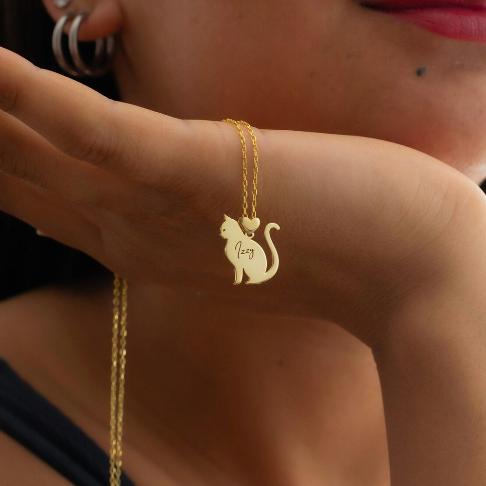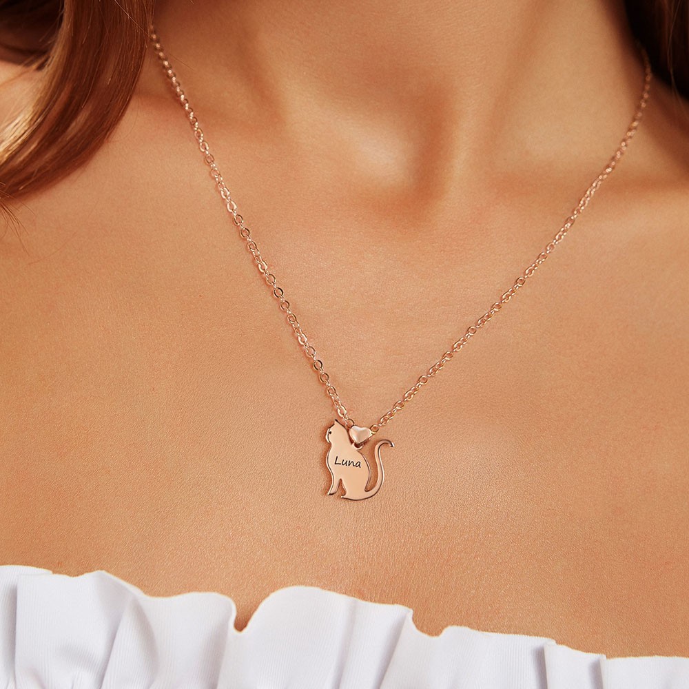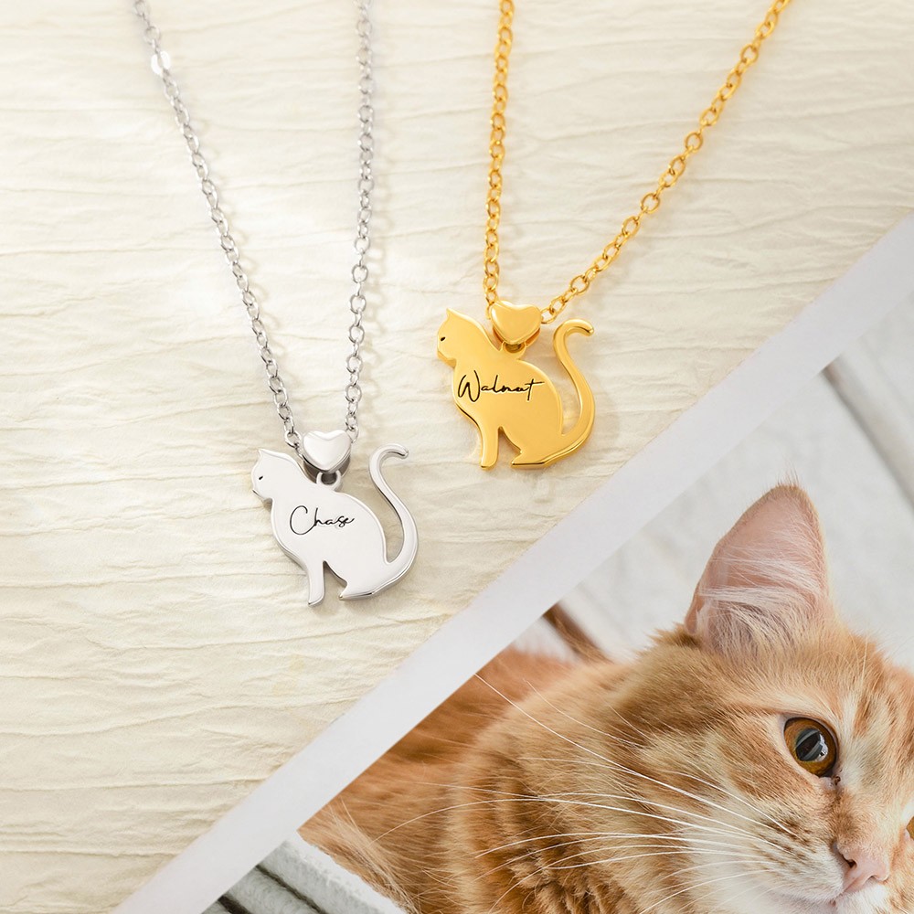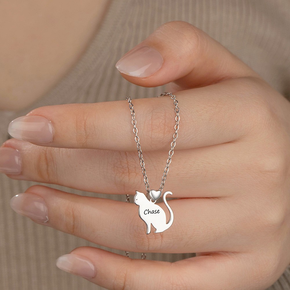 Celebrate your love for your feline friend with our Personalized Name Cat Silhouette Heart Necklace! Crafted from fine metal and featuring a charming cat silhouette in a heart-shaped interior, this elegant piece of pet jewelry is the perfect gift for any pet lover, cat mom or cat dad. Personalize it with your cat's name to add sentiment to the style in a unique way. Perfect for birthdays, anniversaries or just because, this necklace is a wonderful way to keep your furry companion close to your heart!