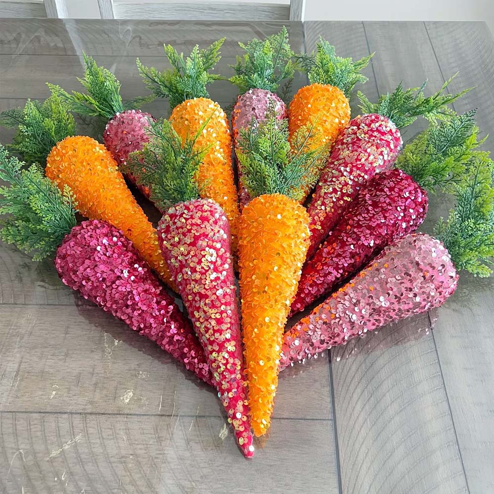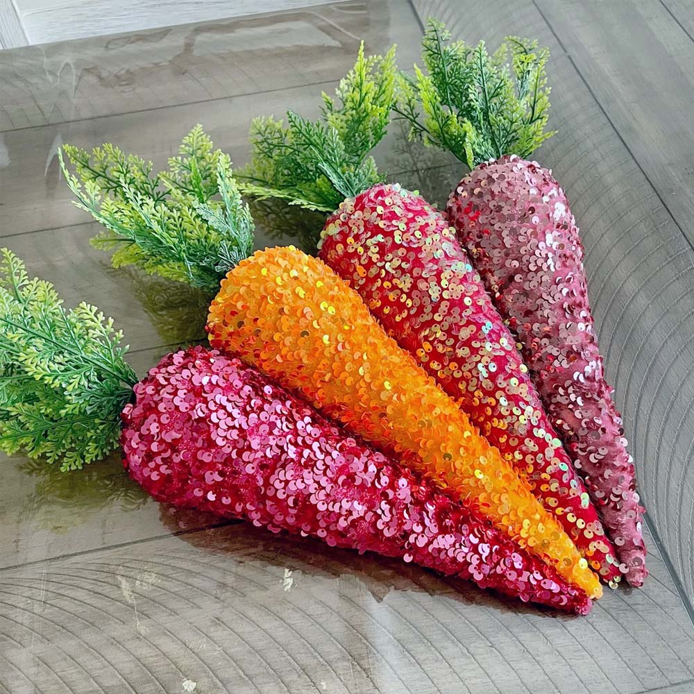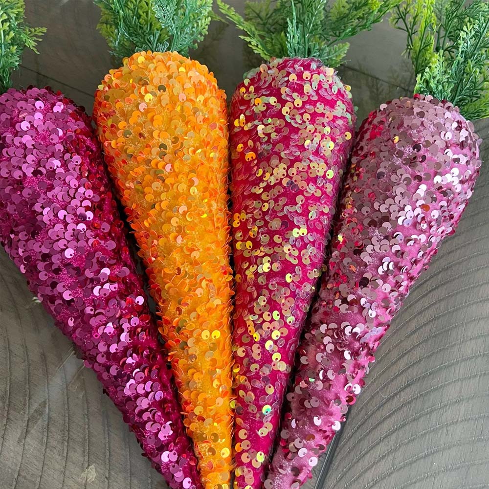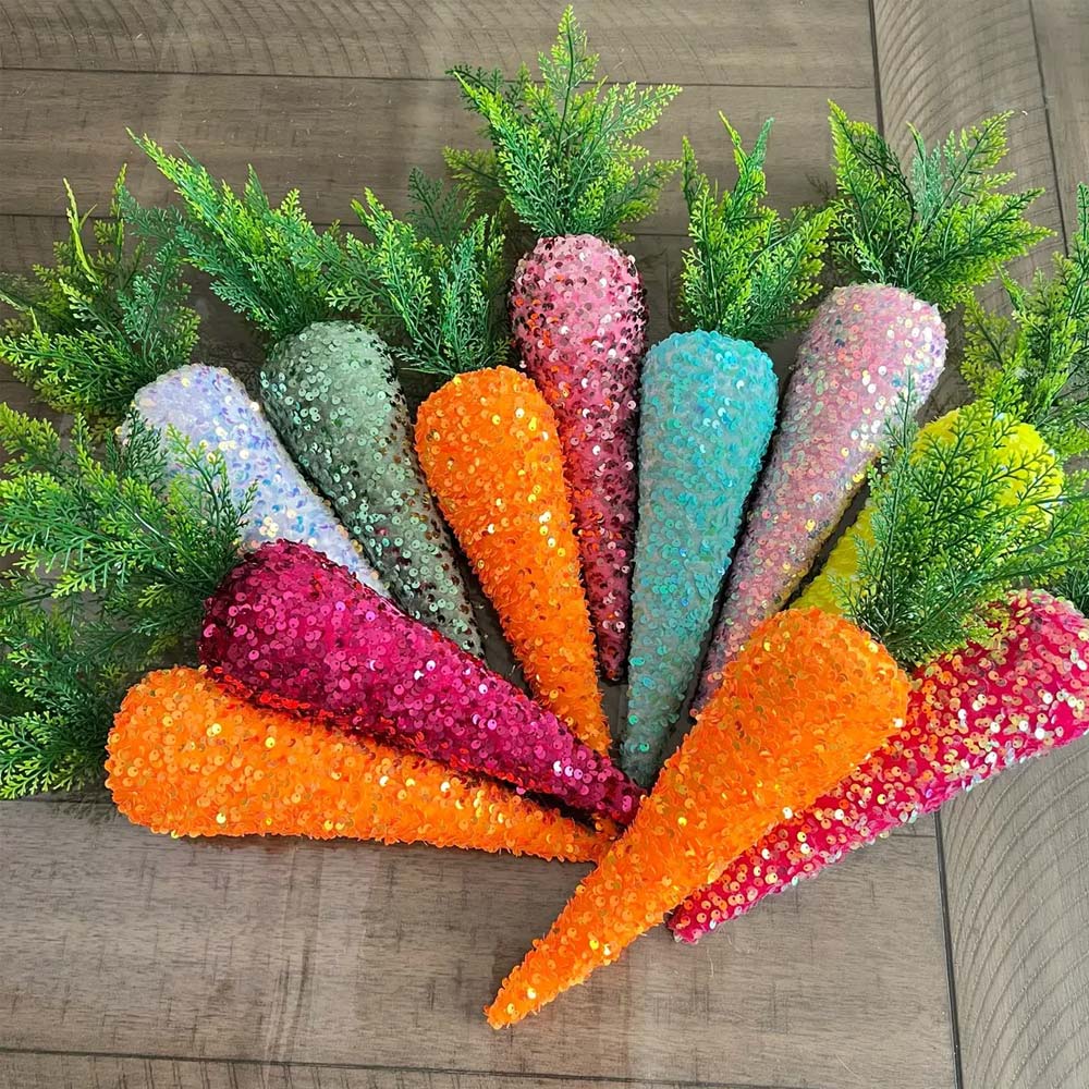 Unique design - Enhance your Easter decor with our stunning Glitter Velvet Carrots, featuring multi-color sequin accents. Made from soft velvet with a luxurious glitter finish, these carrots catch the eye and add a touch of elegance to your Easter decor. Each carrot is adorned with vibrant, multi-color sequins that shimmer and shine, creating a playful and festive look.