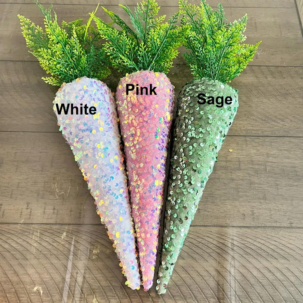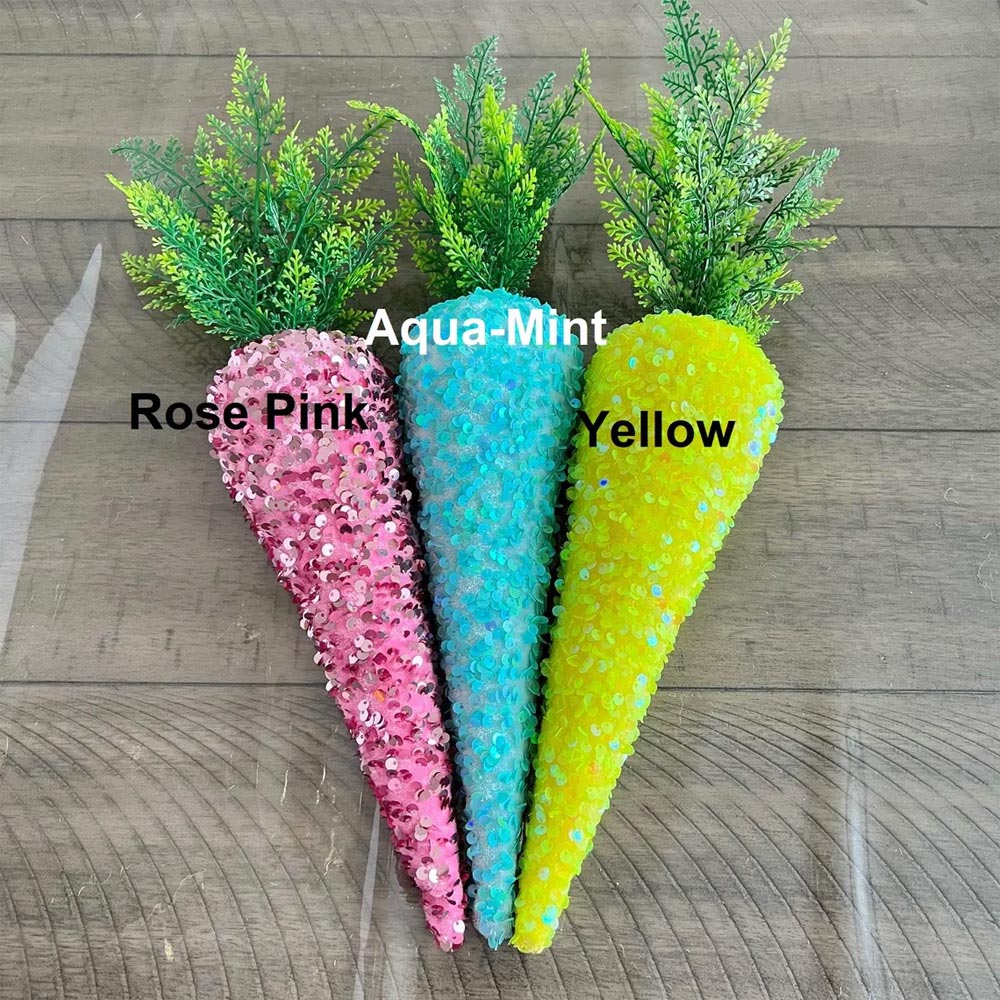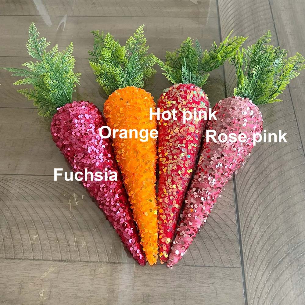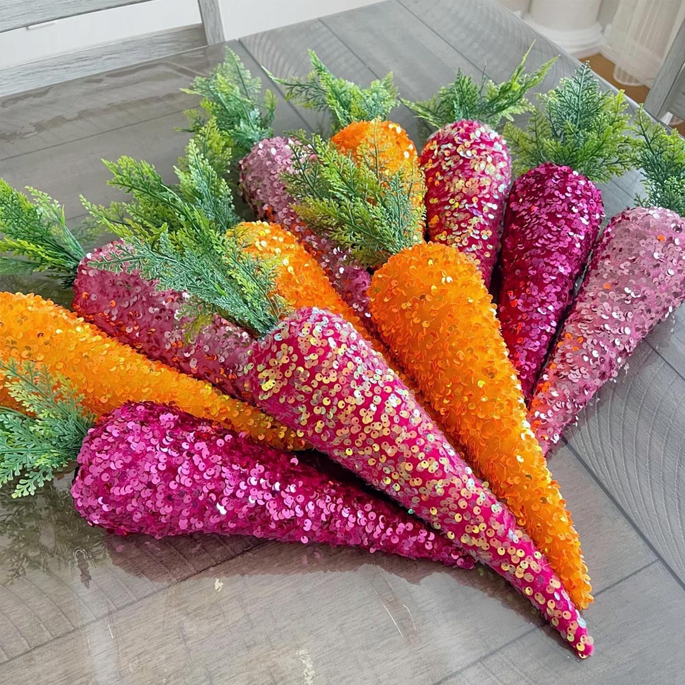 Unique design - Enhance your Easter decor with our stunning Glitter Velvet Carrots, featuring multi-color sequin accents. Made from soft velvet with a luxurious glitter finish, these carrots catch the eye and add a touch of elegance to your Easter decor. Each carrot is adorned with vibrant, multi-color sequins that shimmer and shine, creating a playful and festive look.