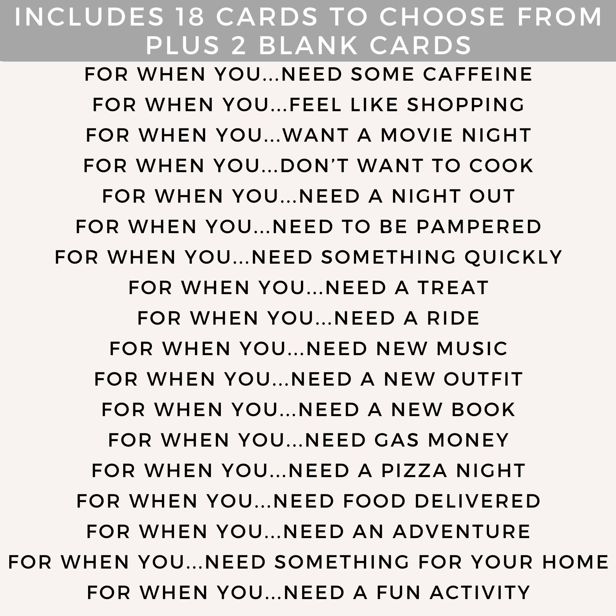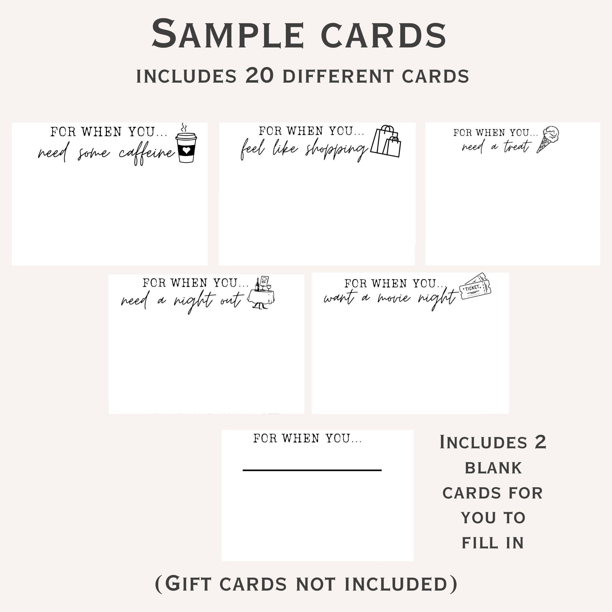 18 of the cards are printed and 2 are blank so you can handwrite your own thoughts. Choose the cards you want to include. Simply remove the cards you don't want. Includes removable stickers to stick gift cards or cash. Gift cards/cash not included.