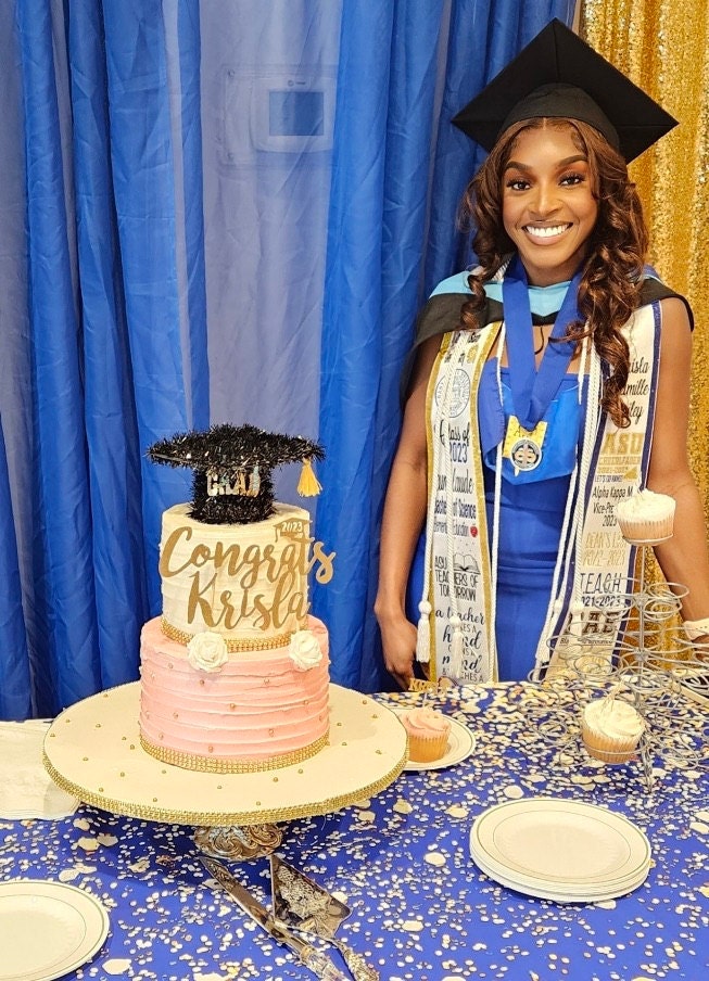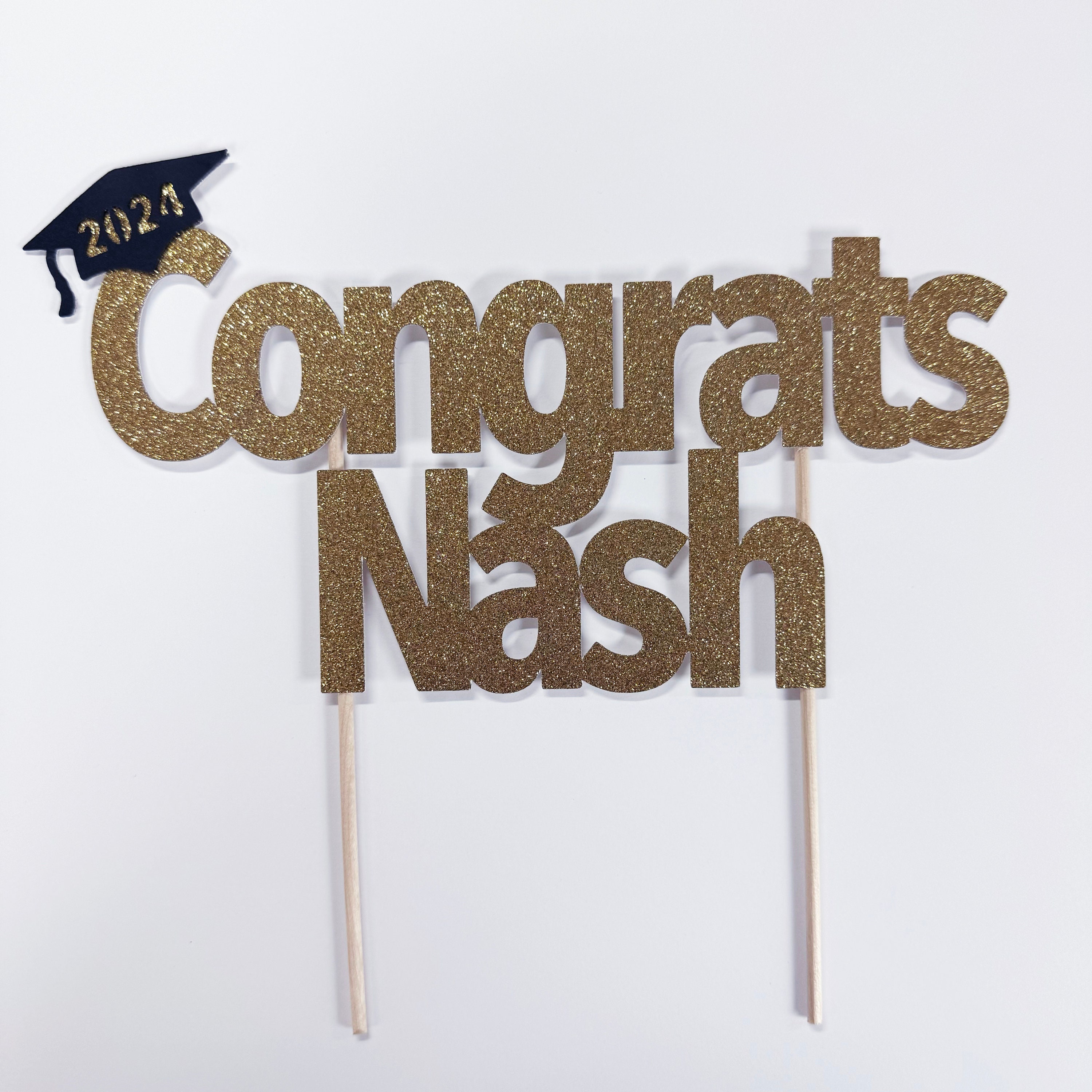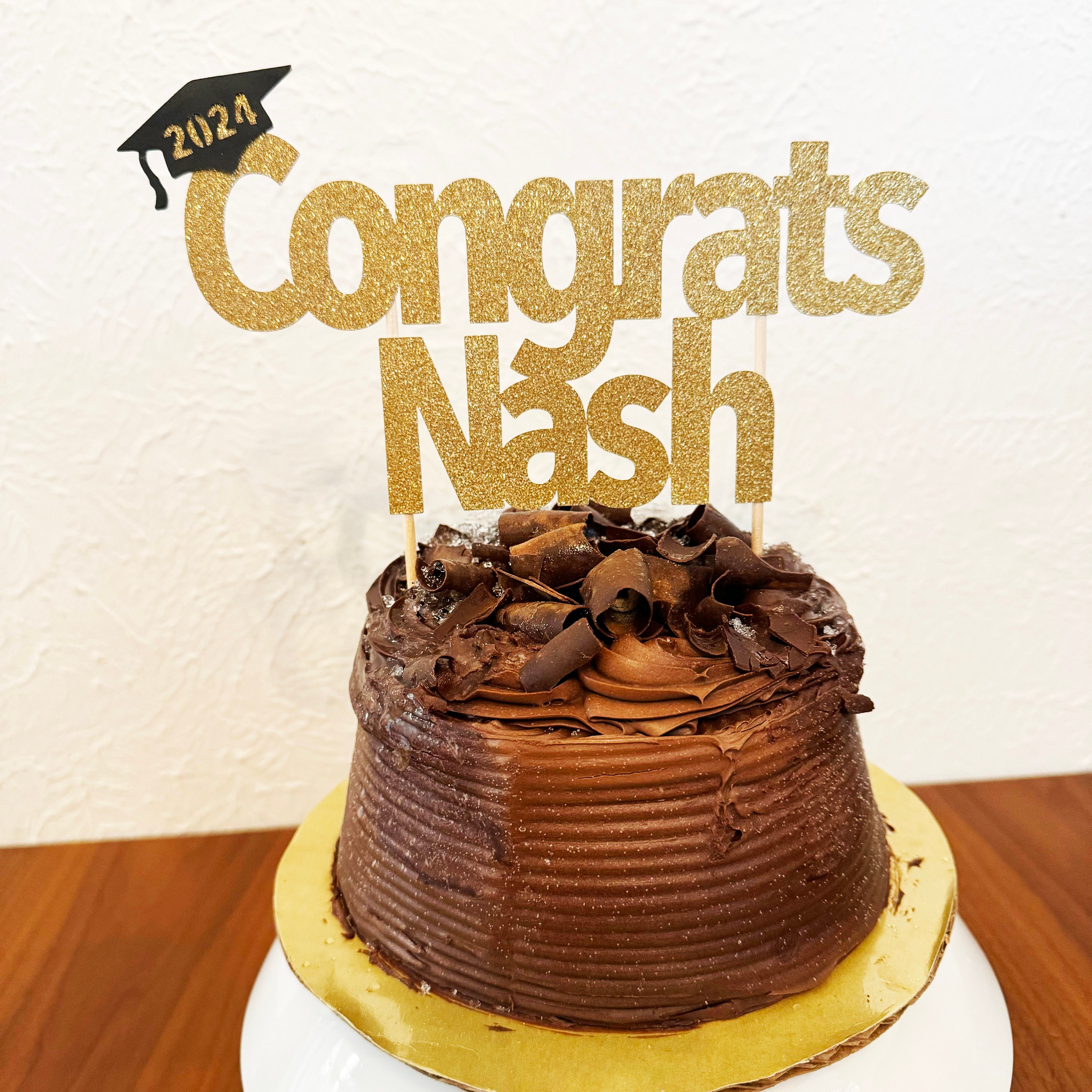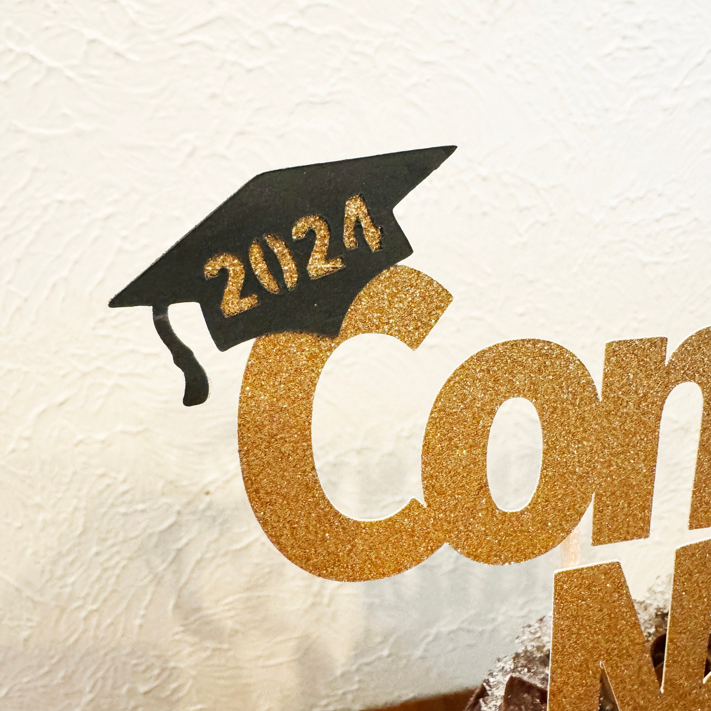 Graduation is a very important occasion that deserves a big celebration, and you can't celebrate without a cake, and you can't have a cake without a cake topper! This custom cake topper comes in 3 sizes and comes with a graduation hat printed with 2024 and the graduate's name. We can make it in any color you can think of.