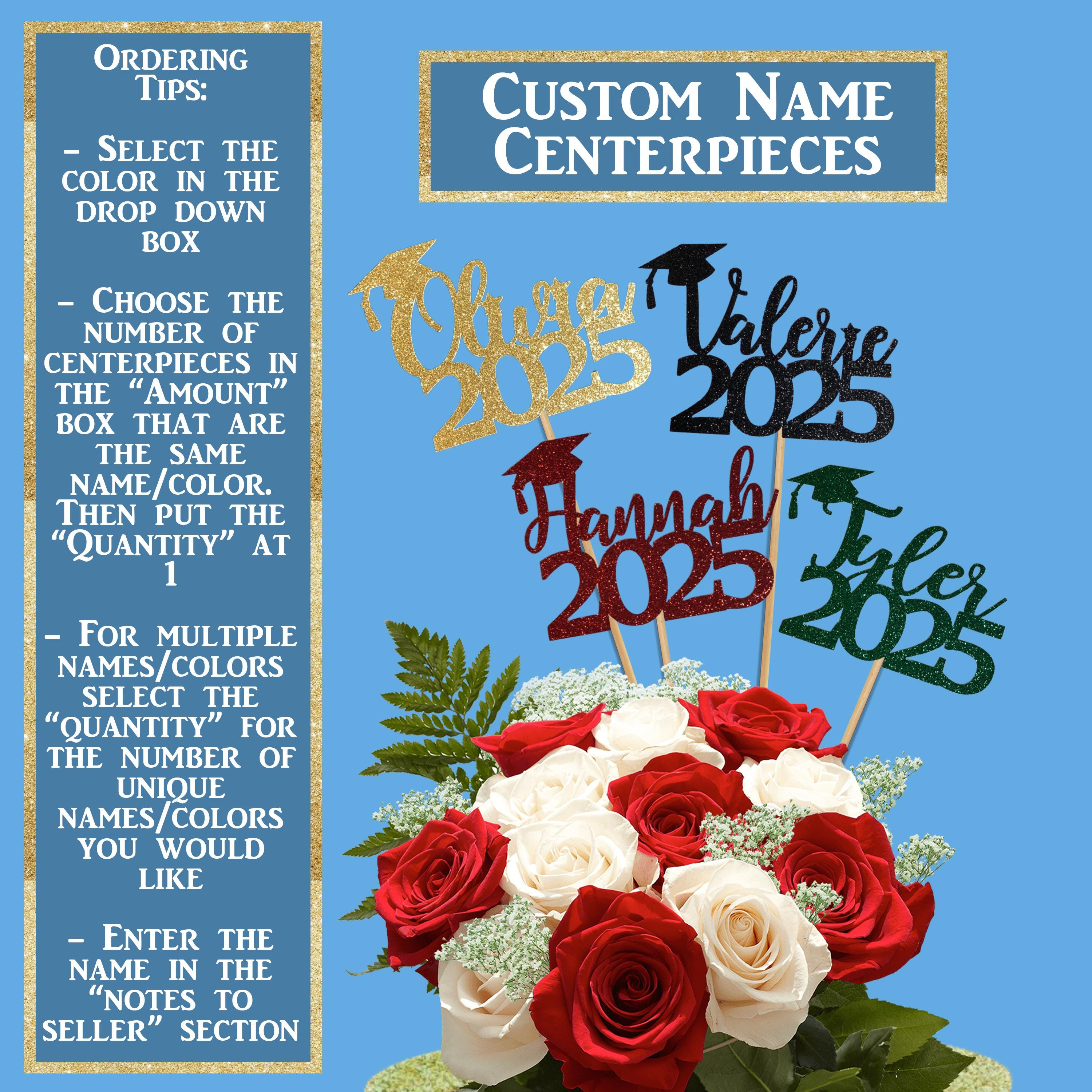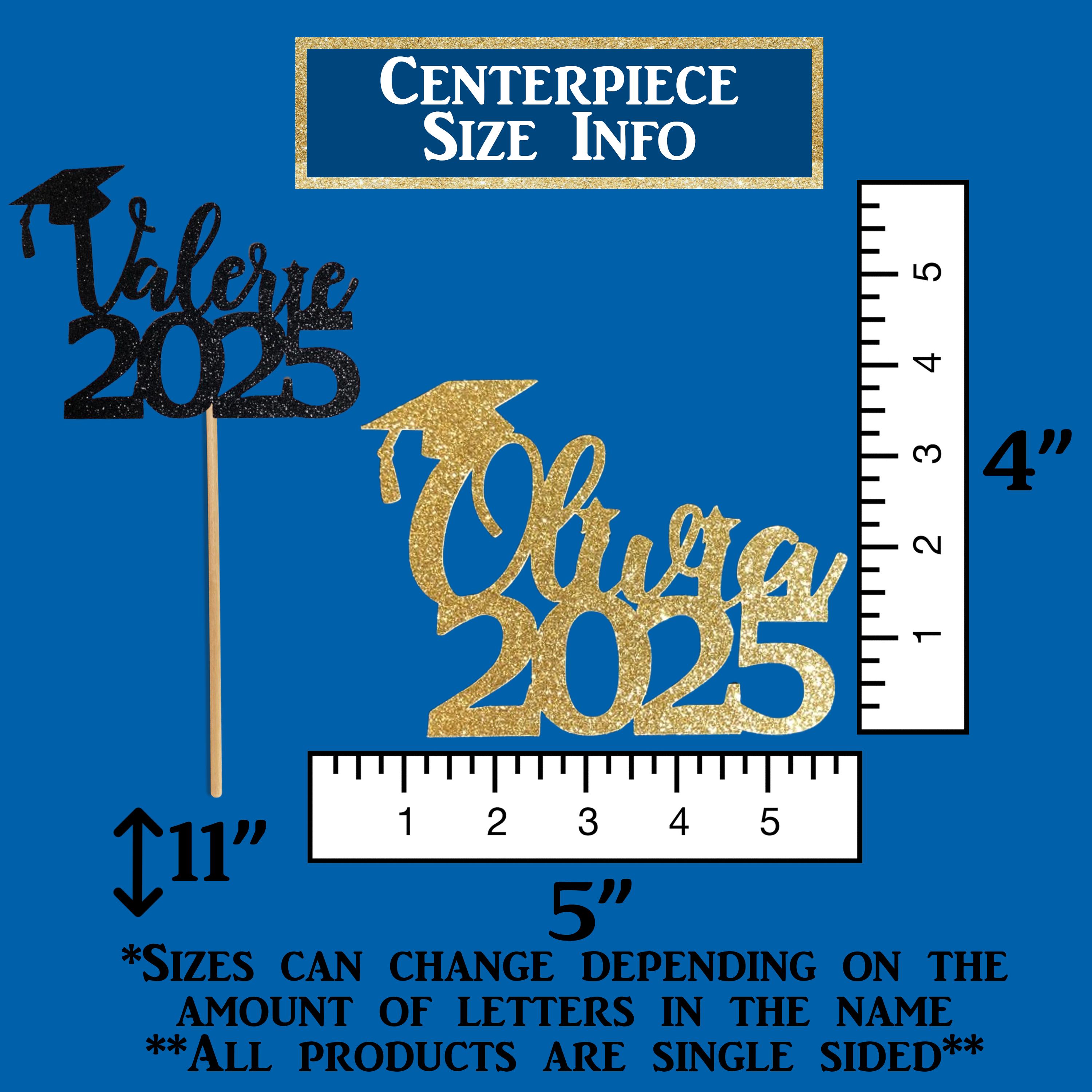 Each centerpiece is over 5 inches wide and 4 inches long. They are adhered to a 9 inch bamboo stick. Made from heavyweight glitter cardstock with a white backing.