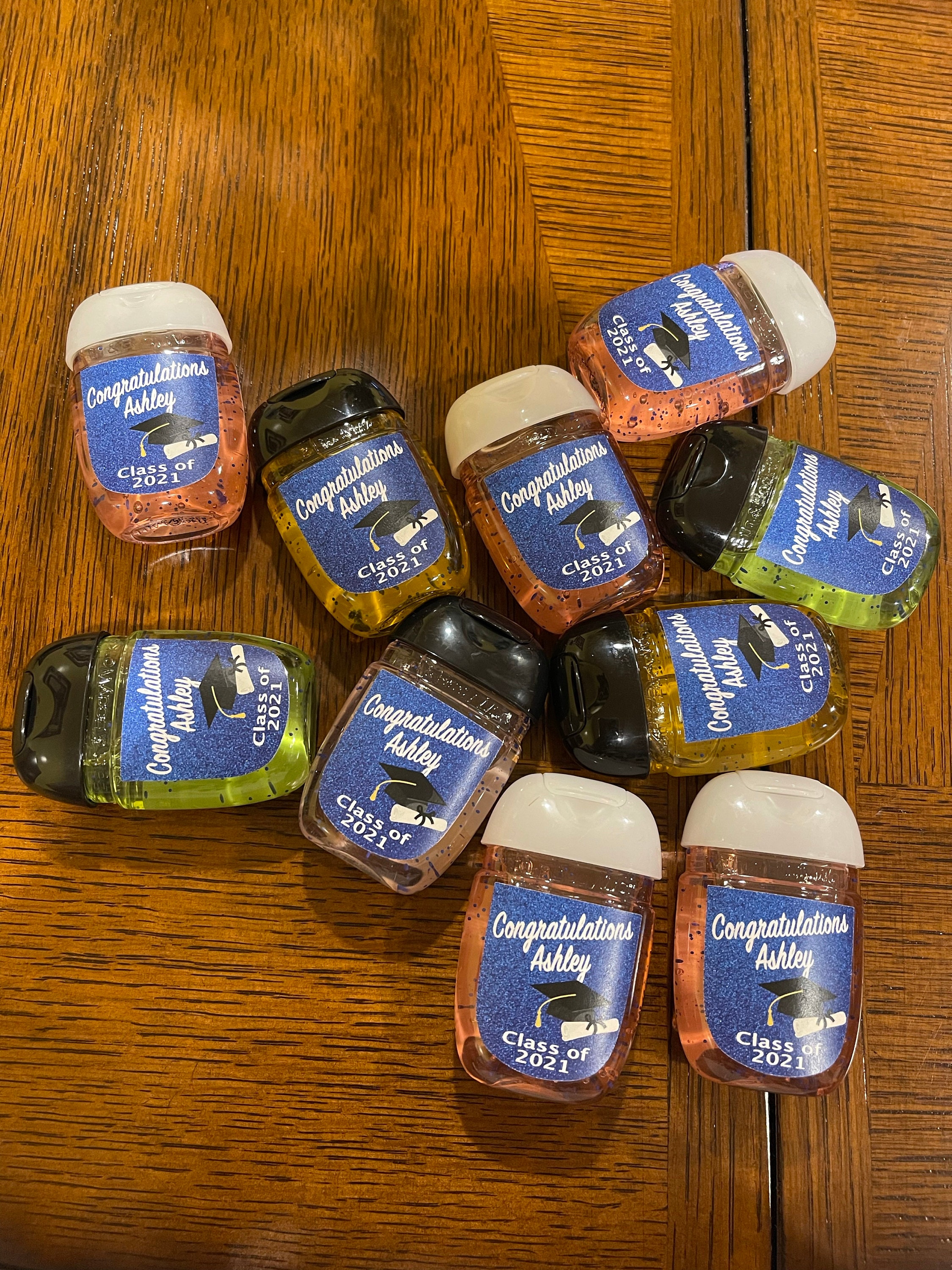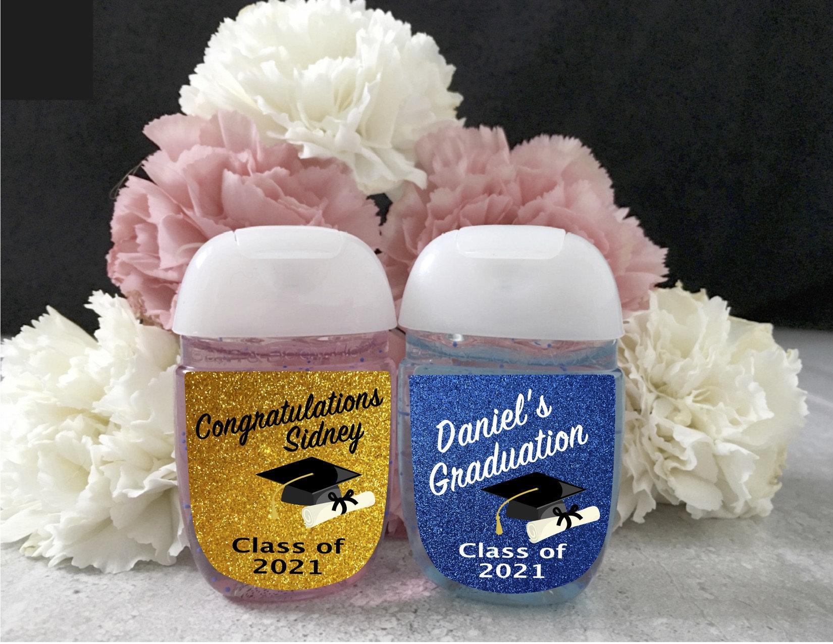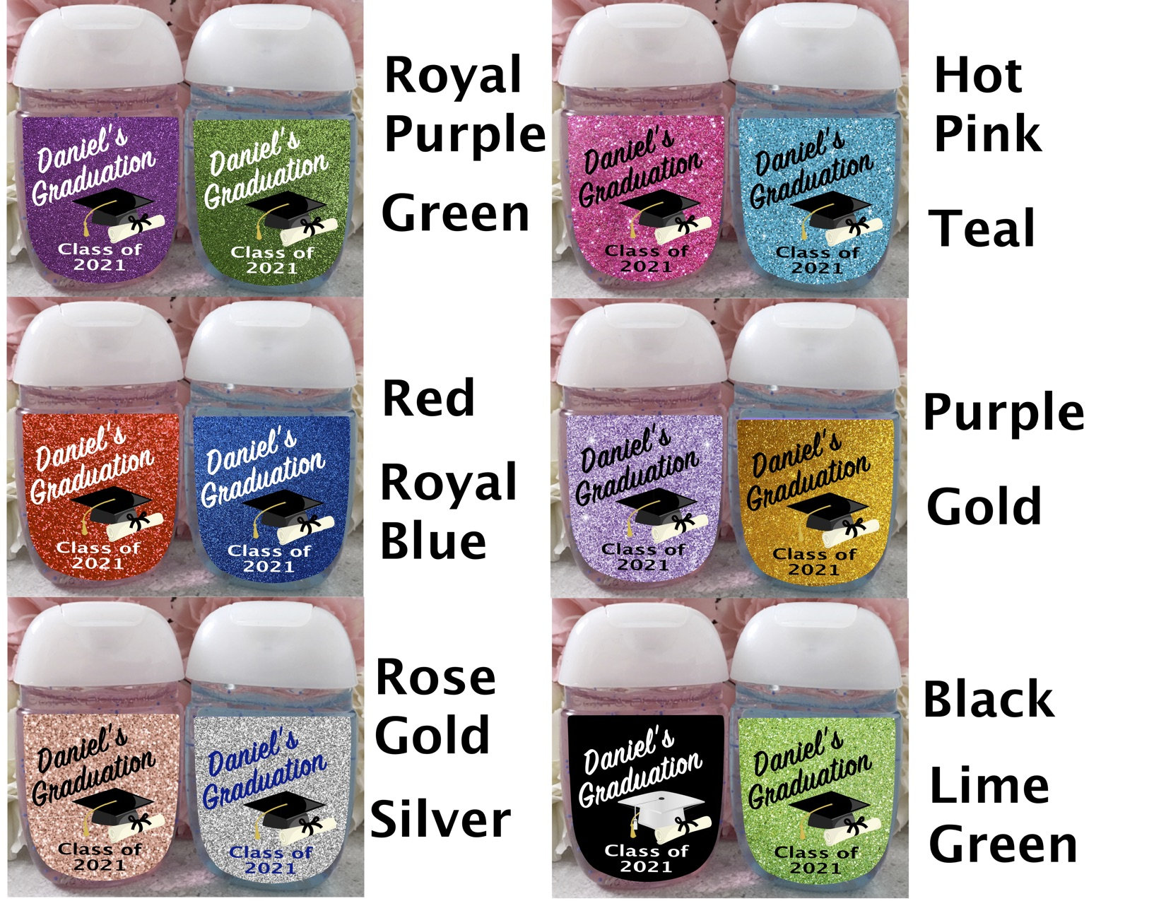 Graduation is something worth celebrating! Let us help you do just that with our personalized graduation party hand sanitizer gift tags! These labels fit Bath & Body Works PocketBac bottles. You can carefully place the labels on top of the existing labels, or for best results, remove the existing labels and replace with these. This listing is for the peel and stick labels (i.e. the hand sanitizer labels are not included). Please note: These are not real glitter - the vinyl stickers are a printed glitter simulation and will not have any texture.