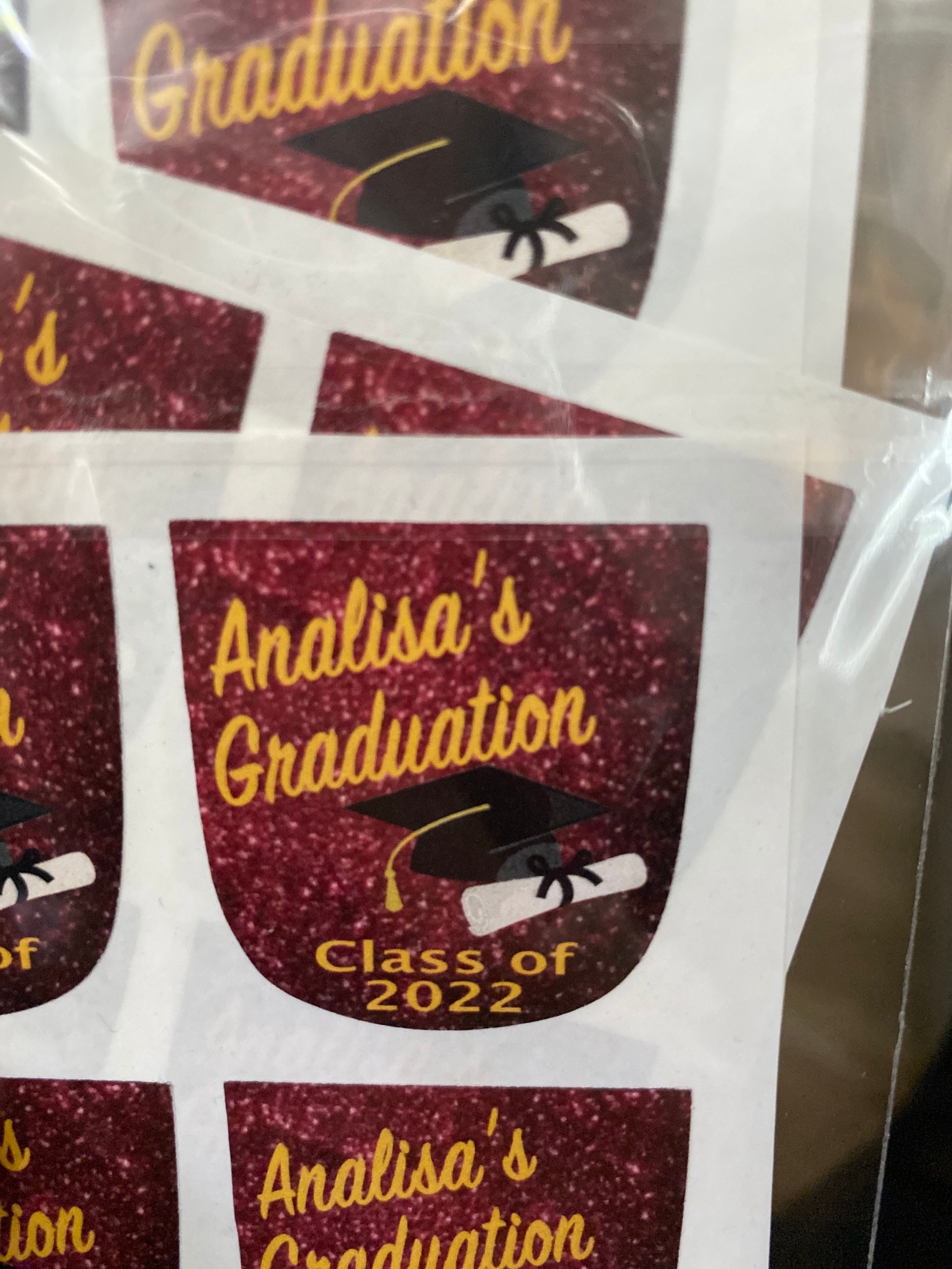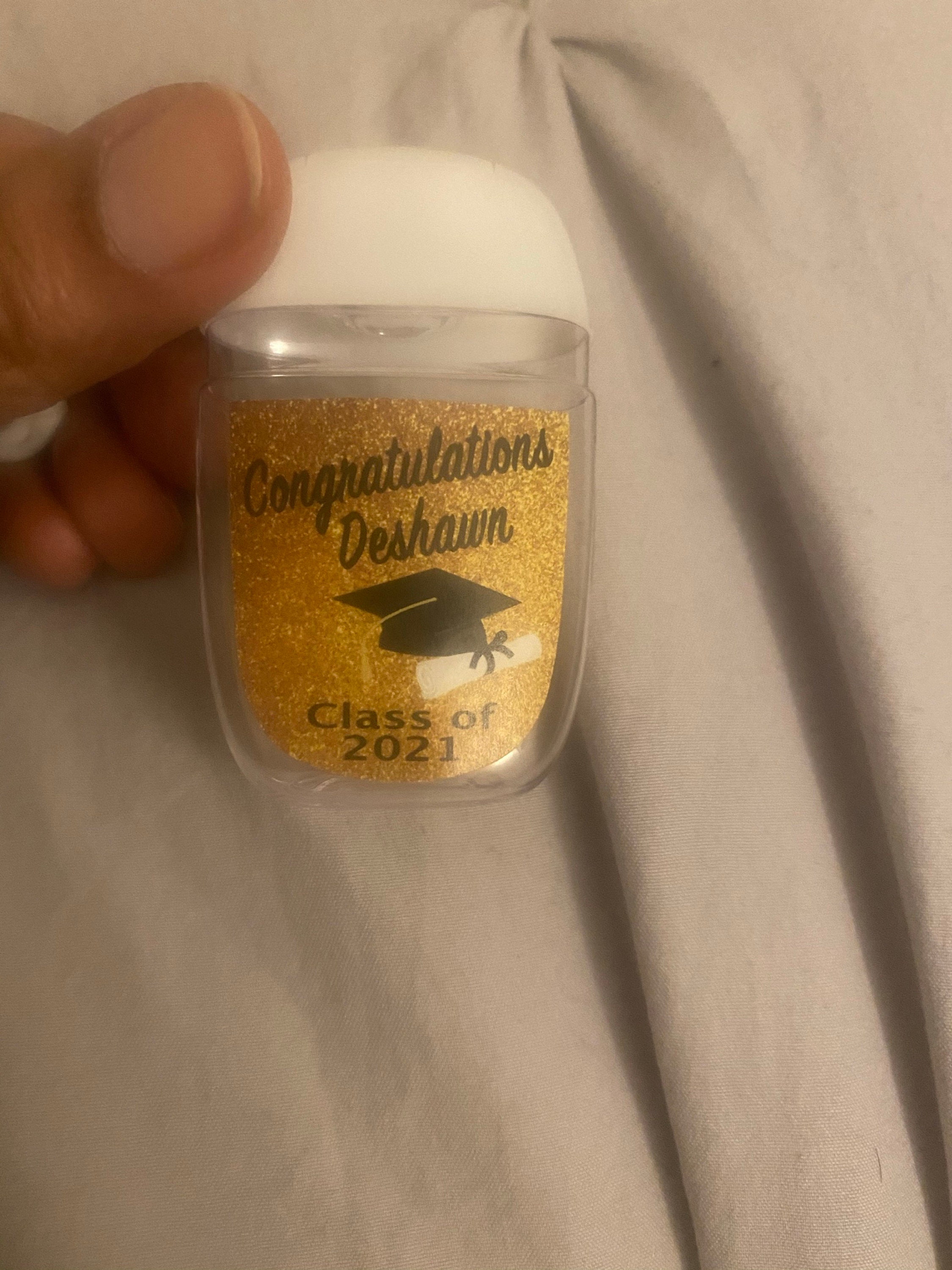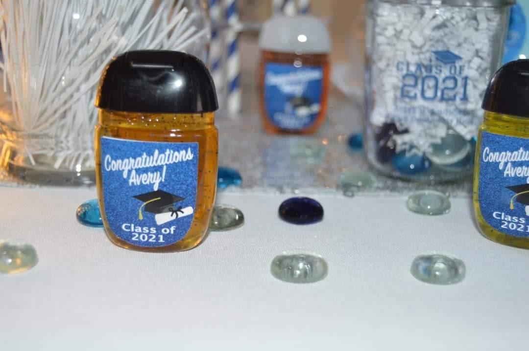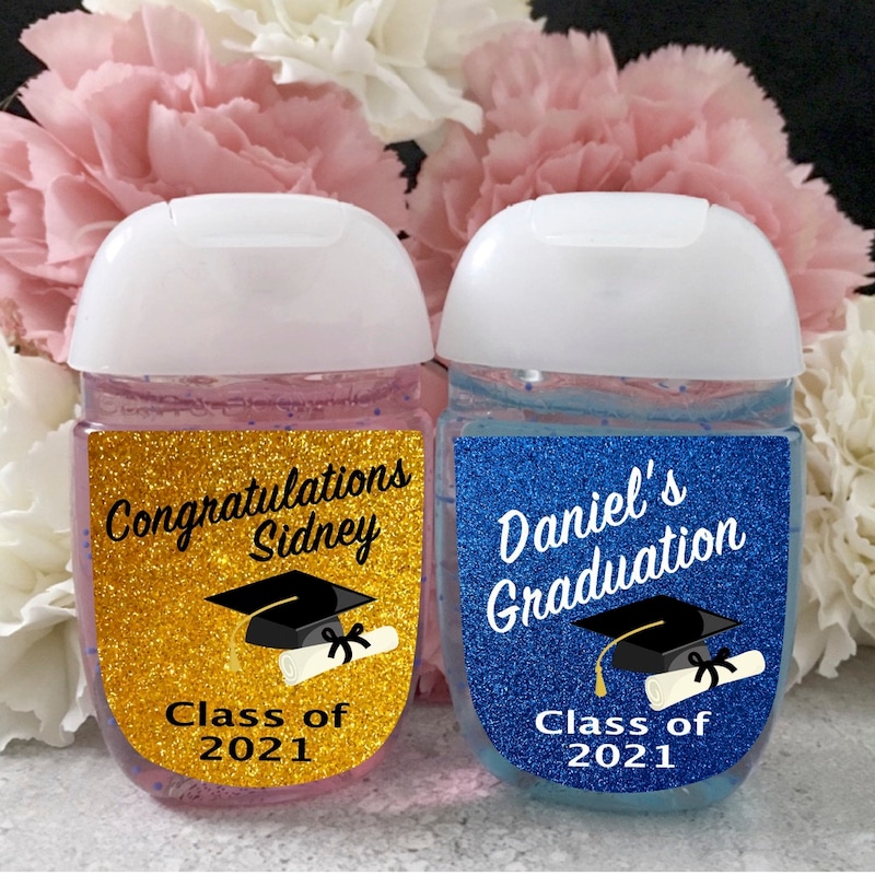 Graduation is something worth celebrating! Let us help you do just that with our personalized graduation party hand sanitizer gift tags! These labels fit Bath & Body Works PocketBac bottles. You can carefully place the labels on top of the existing labels, or for best results, remove the existing labels and replace with these. This listing is for the peel and stick labels (i.e. the hand sanitizer labels are not included). Please note: These are not real glitter - the vinyl stickers are a printed glitter simulation and will not have any texture.
