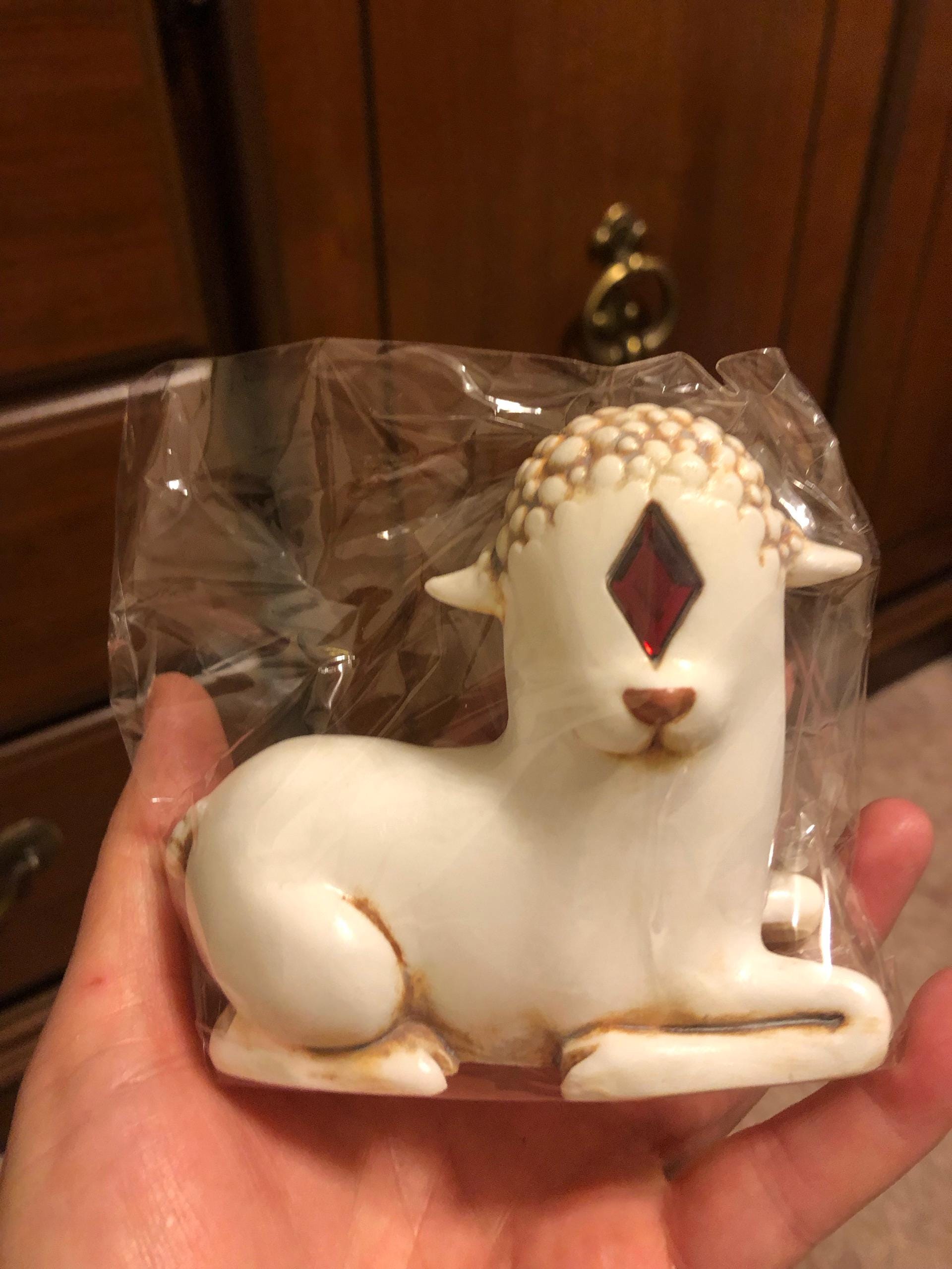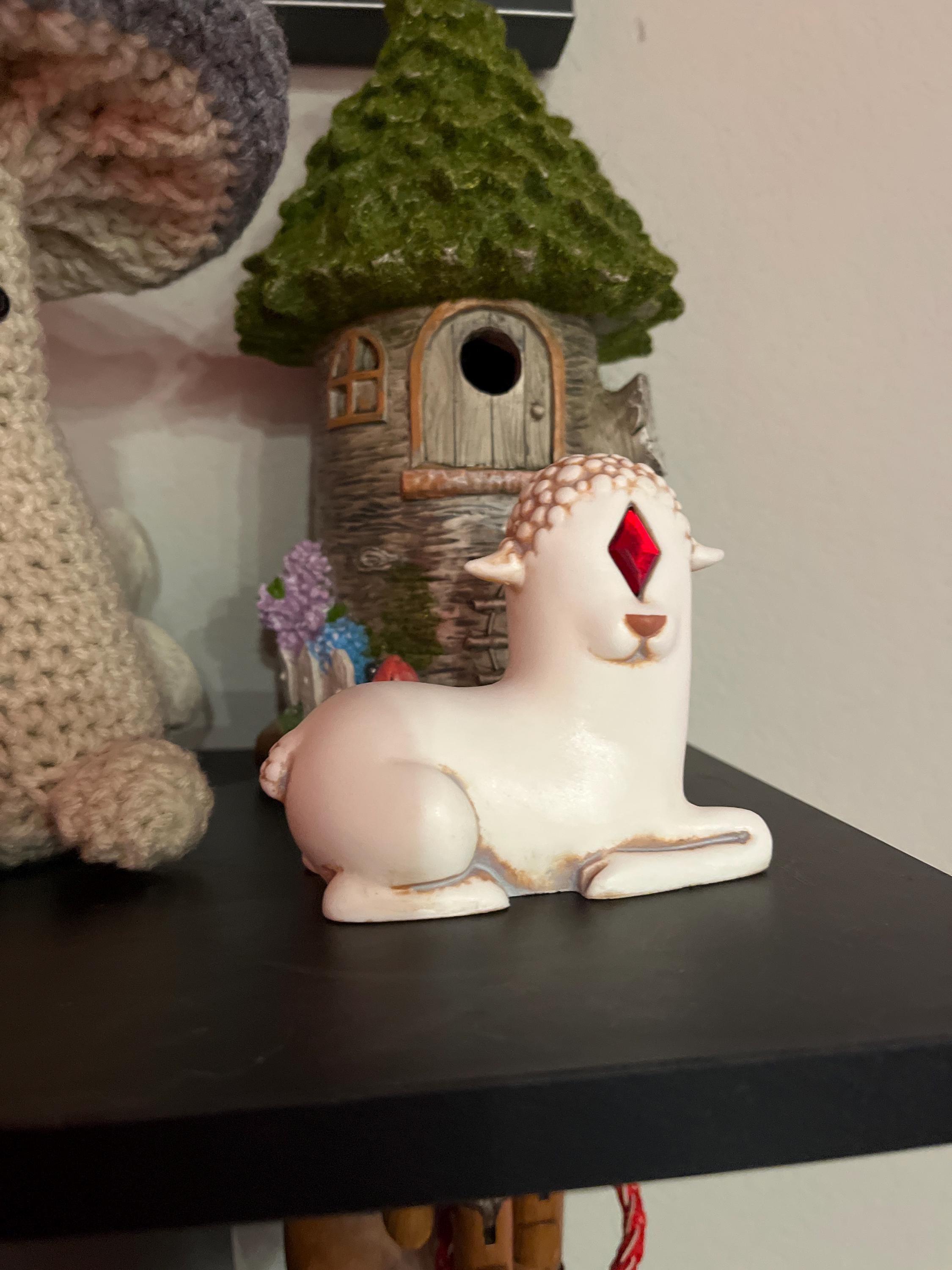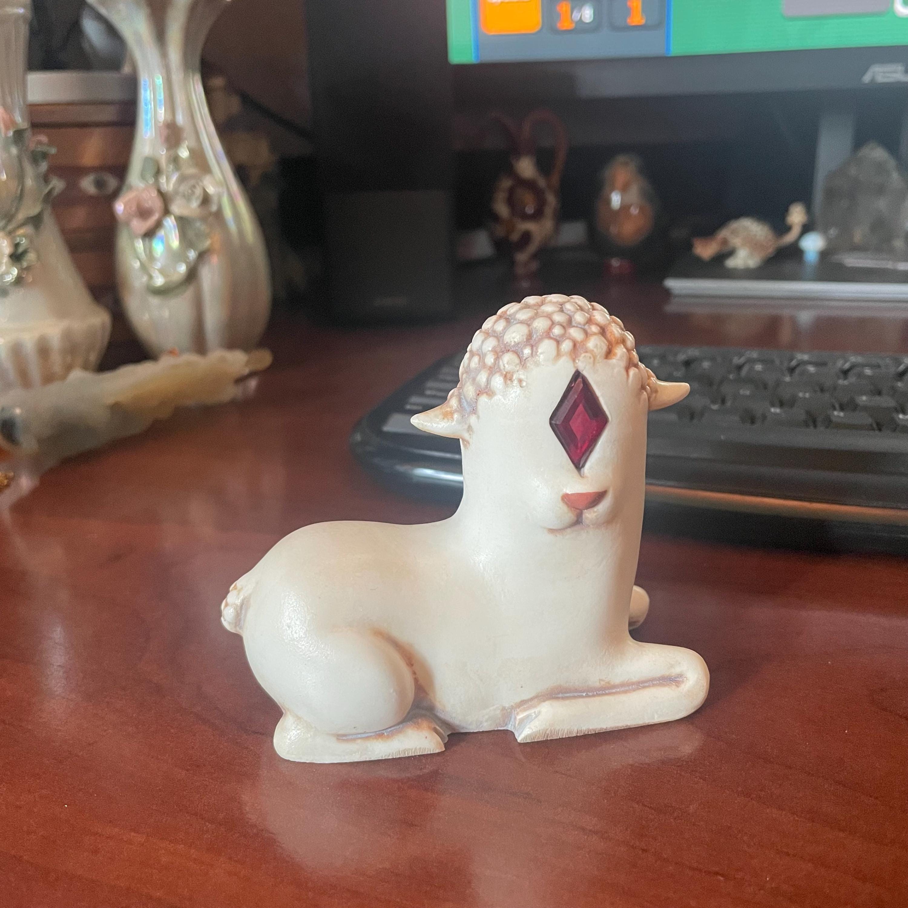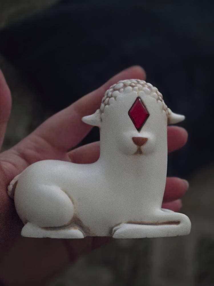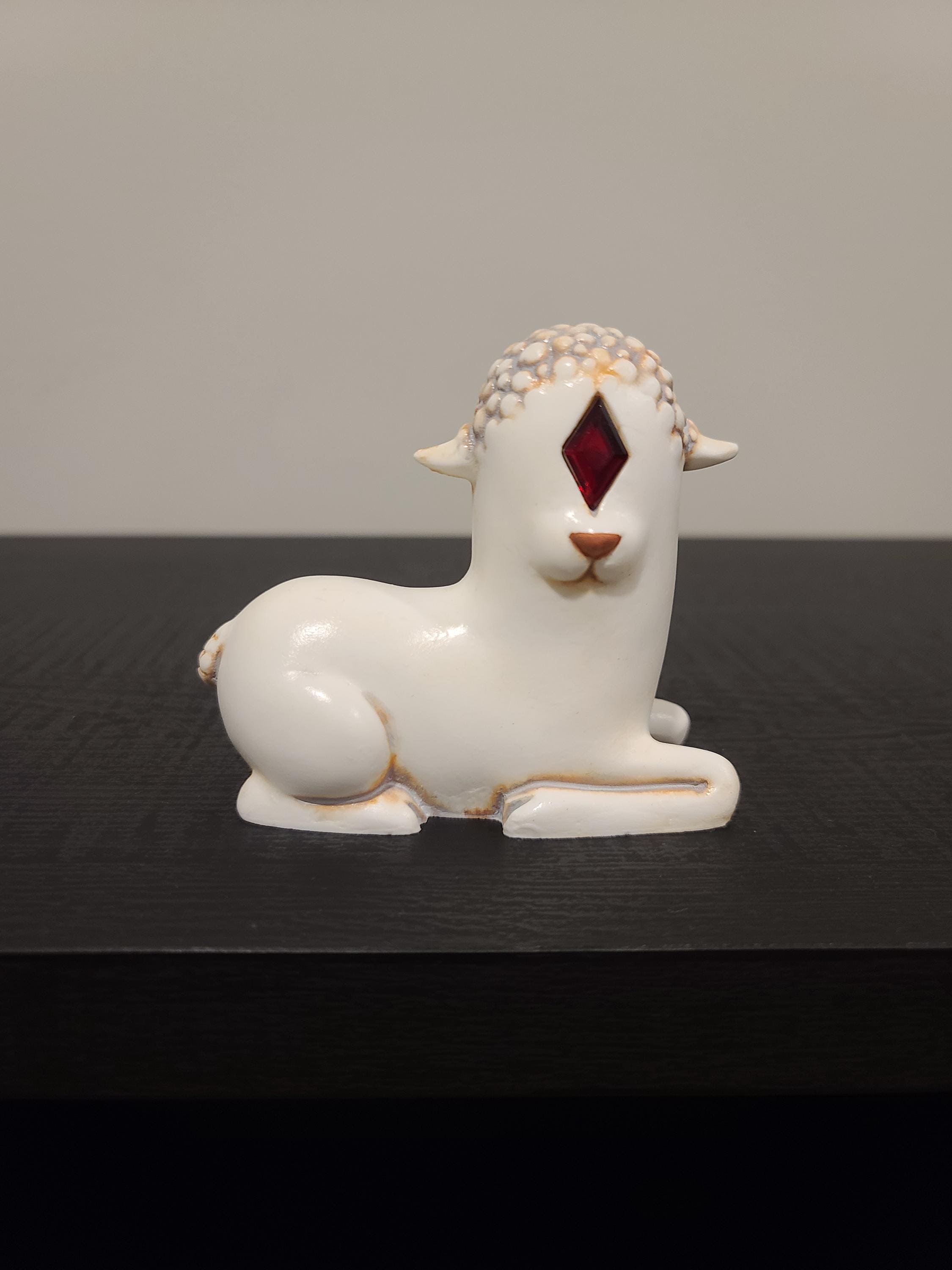 This is a sculpture of Relic Lamb. It was sculpted by Macsorro. EACH ONE IS casted in resin and hand painted. The Lamb is mysterious artifact found in a cave.
