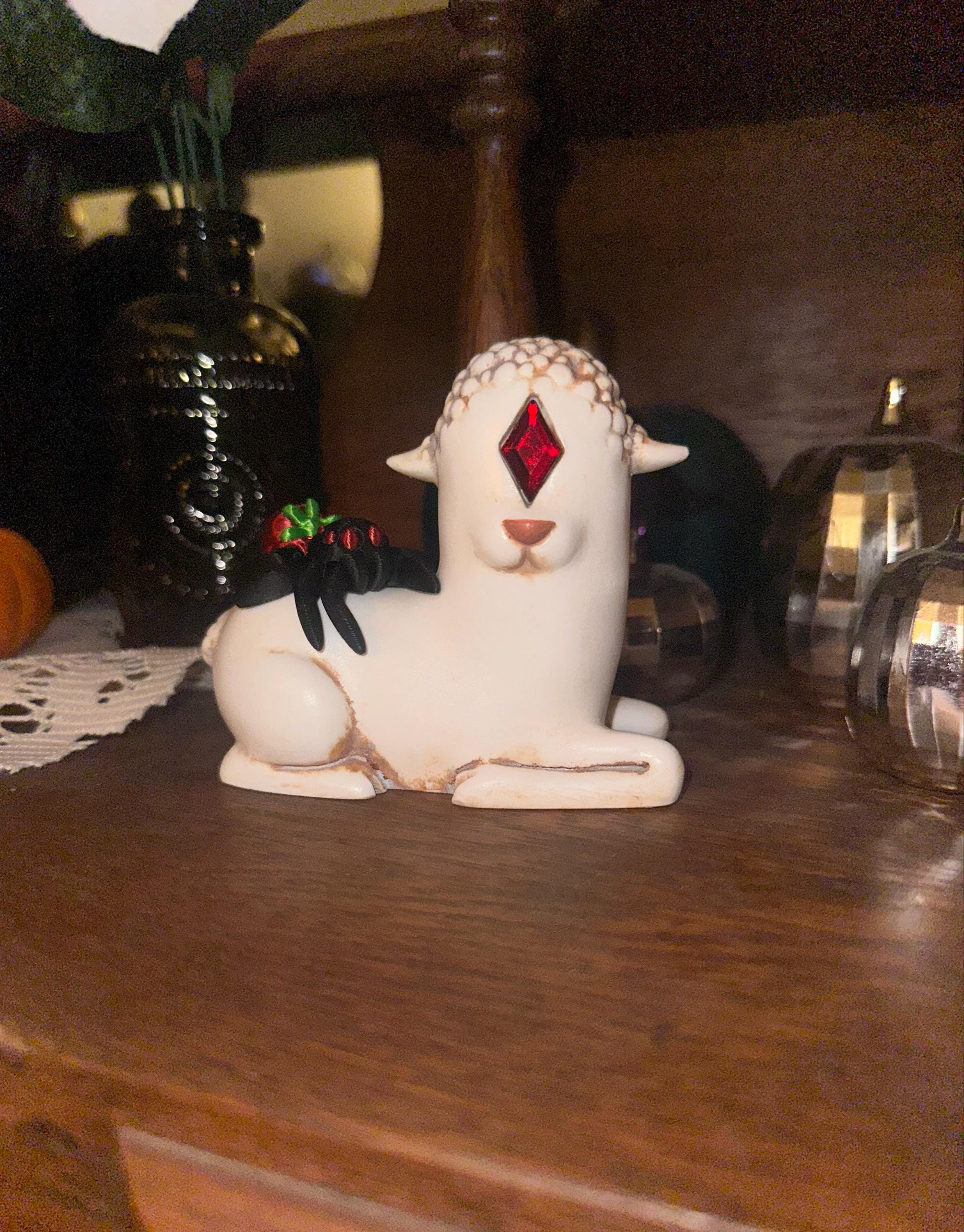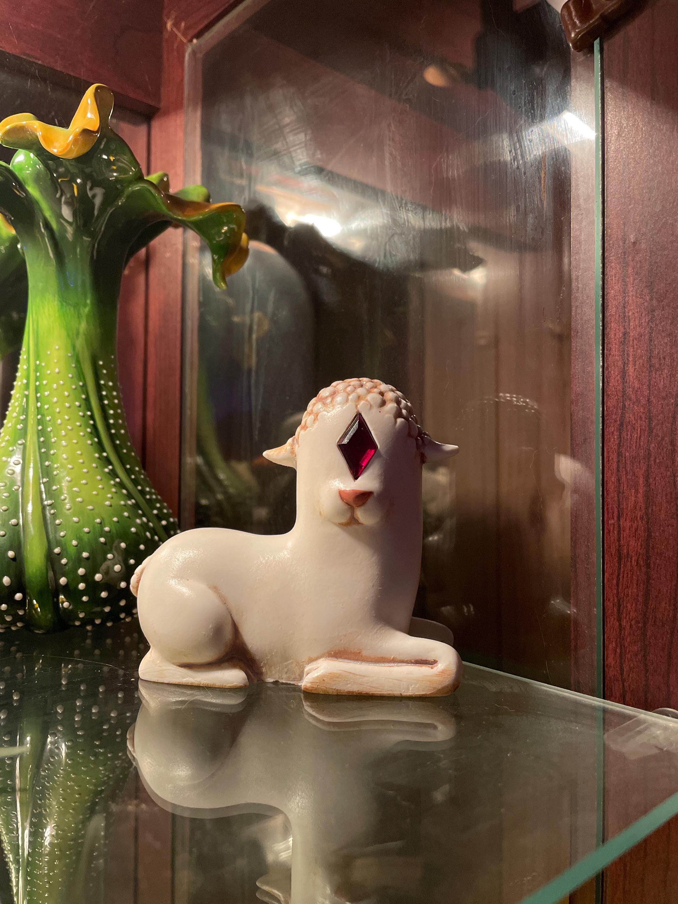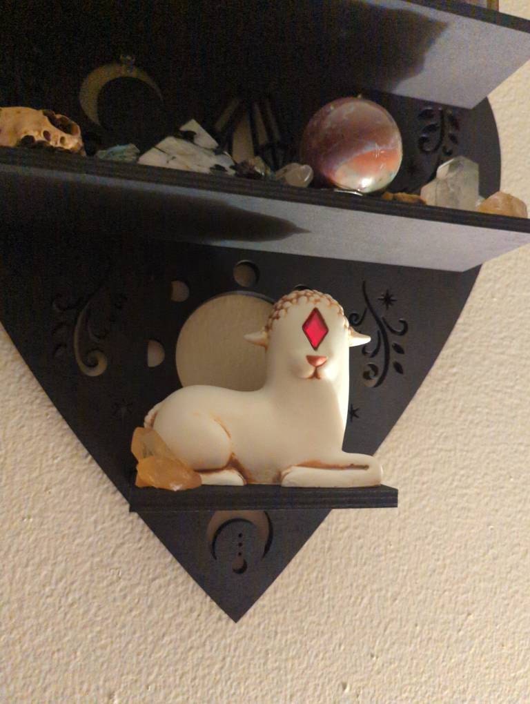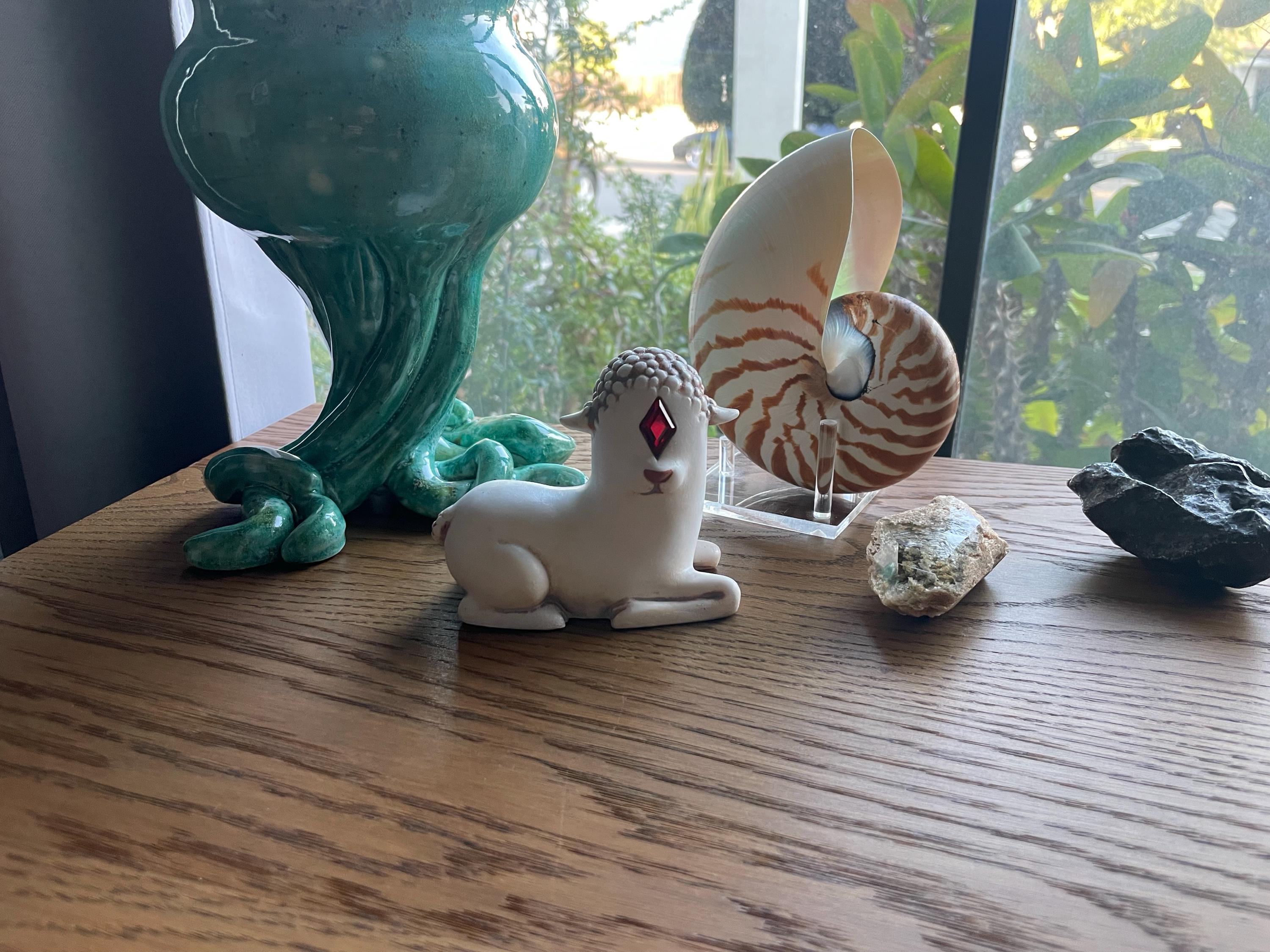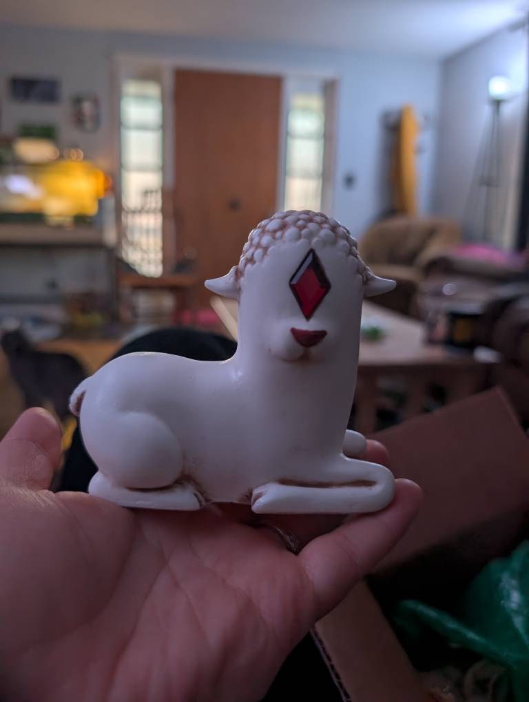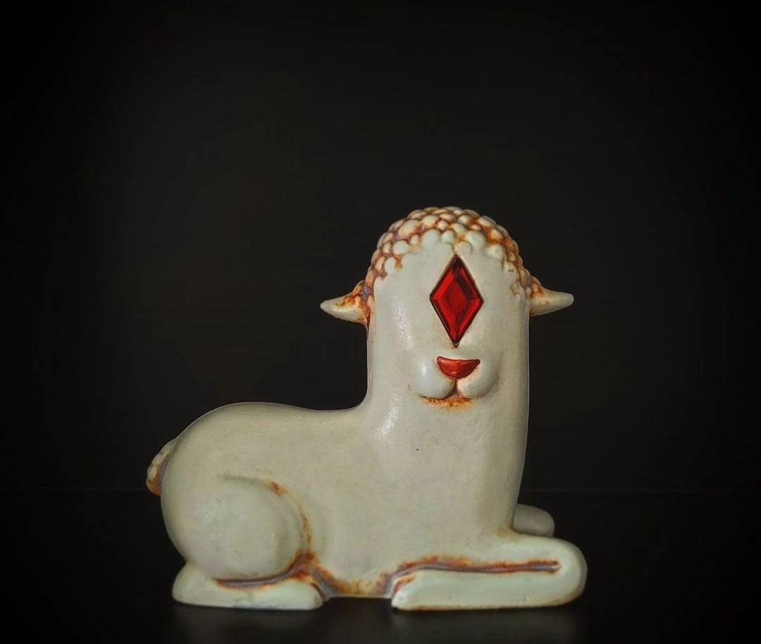 This is a sculpture of Relic Lamb. It was sculpted by Macsorro. EACH ONE IS casted in resin and hand painted. The Lamb is mysterious artifact found in a cave.