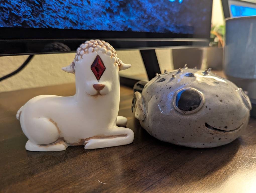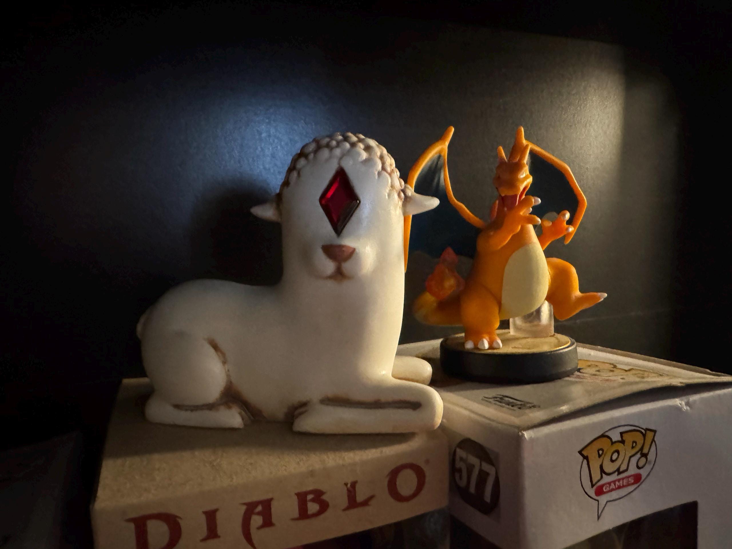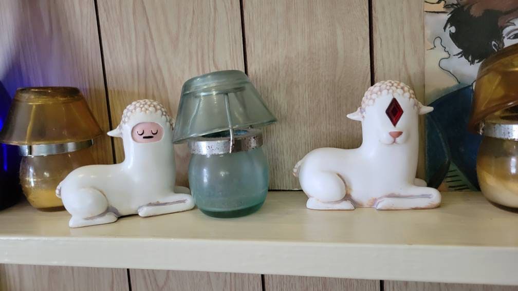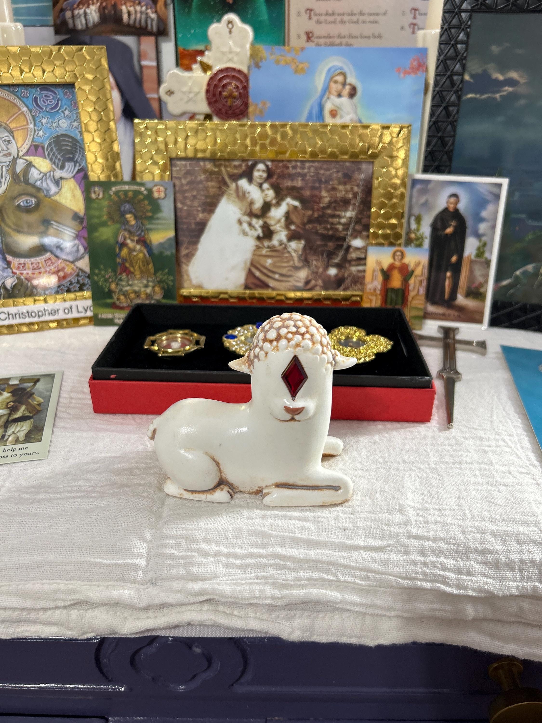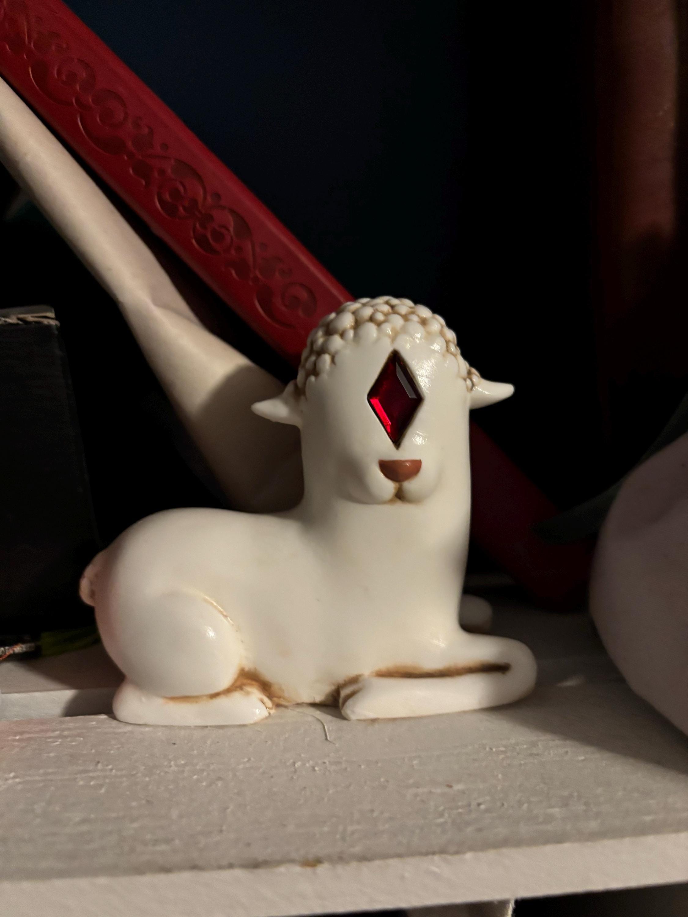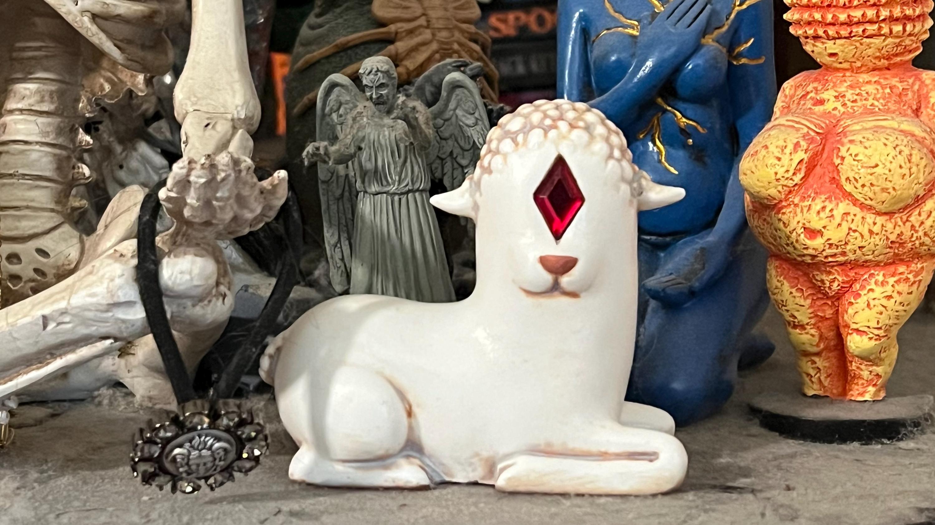 This is a sculpture of Relic Lamb. It was sculpted by Macsorro. EACH ONE IS casted in resin and hand painted. The Lamb is mysterious artifact found in a cave.