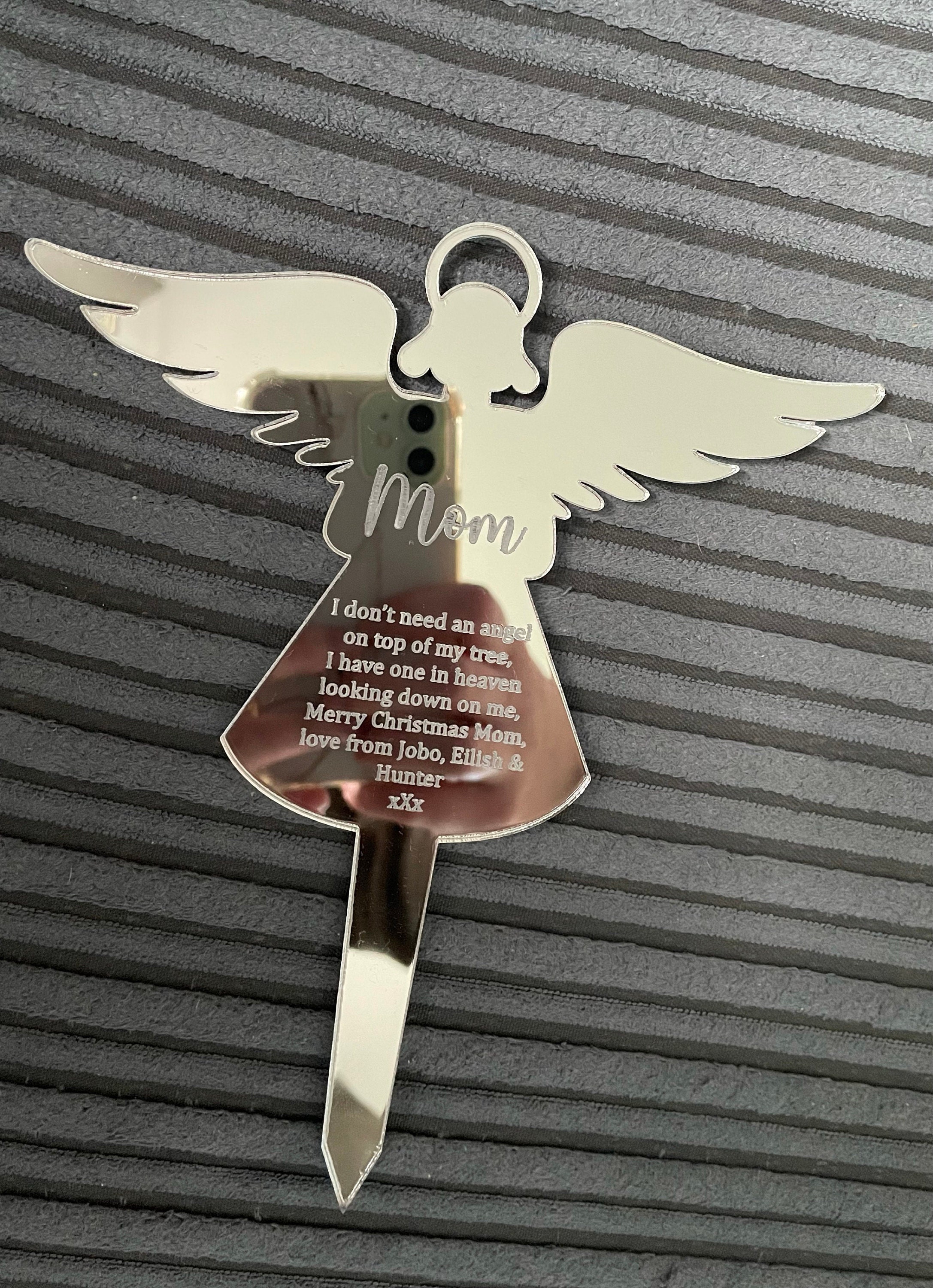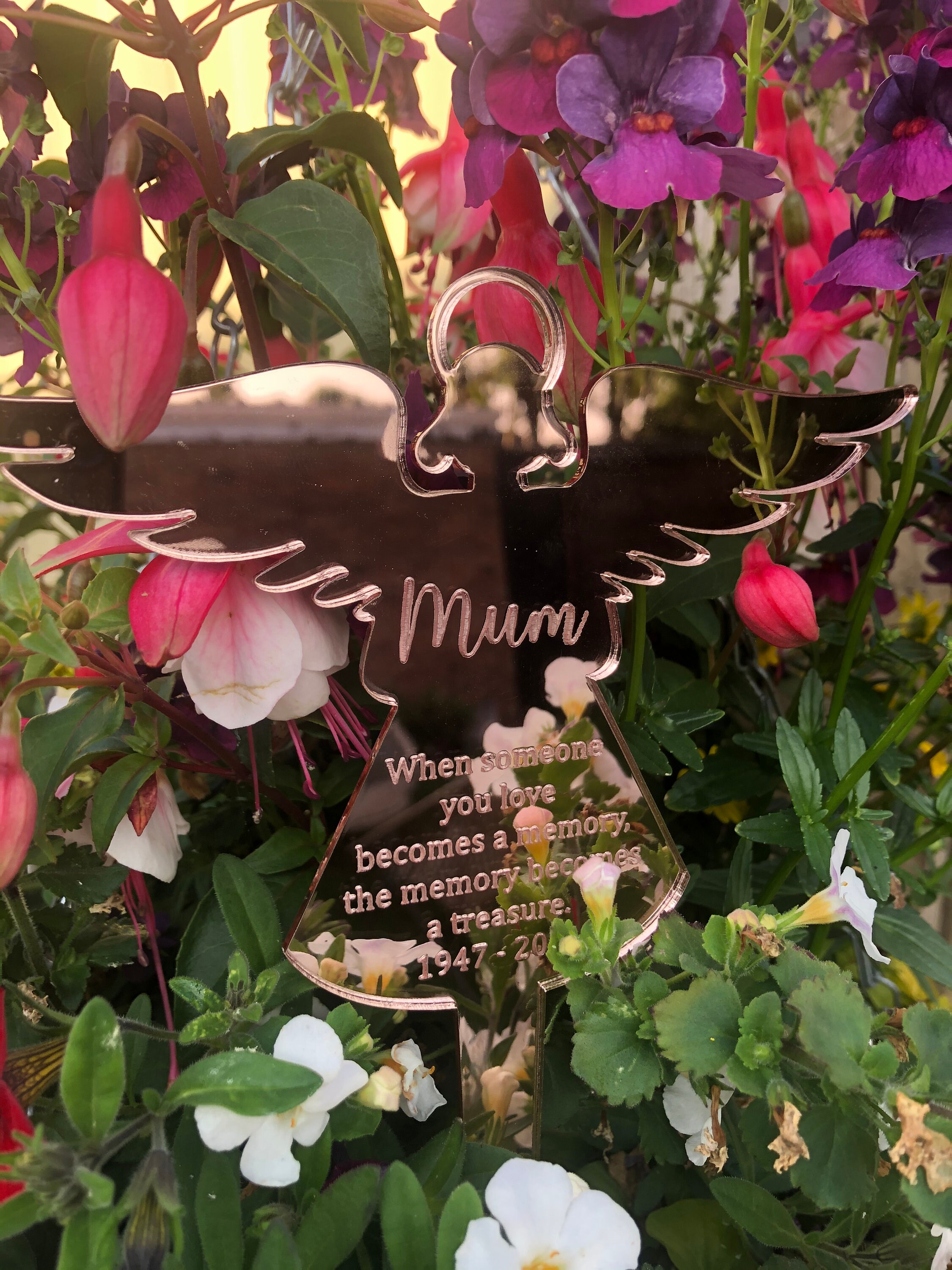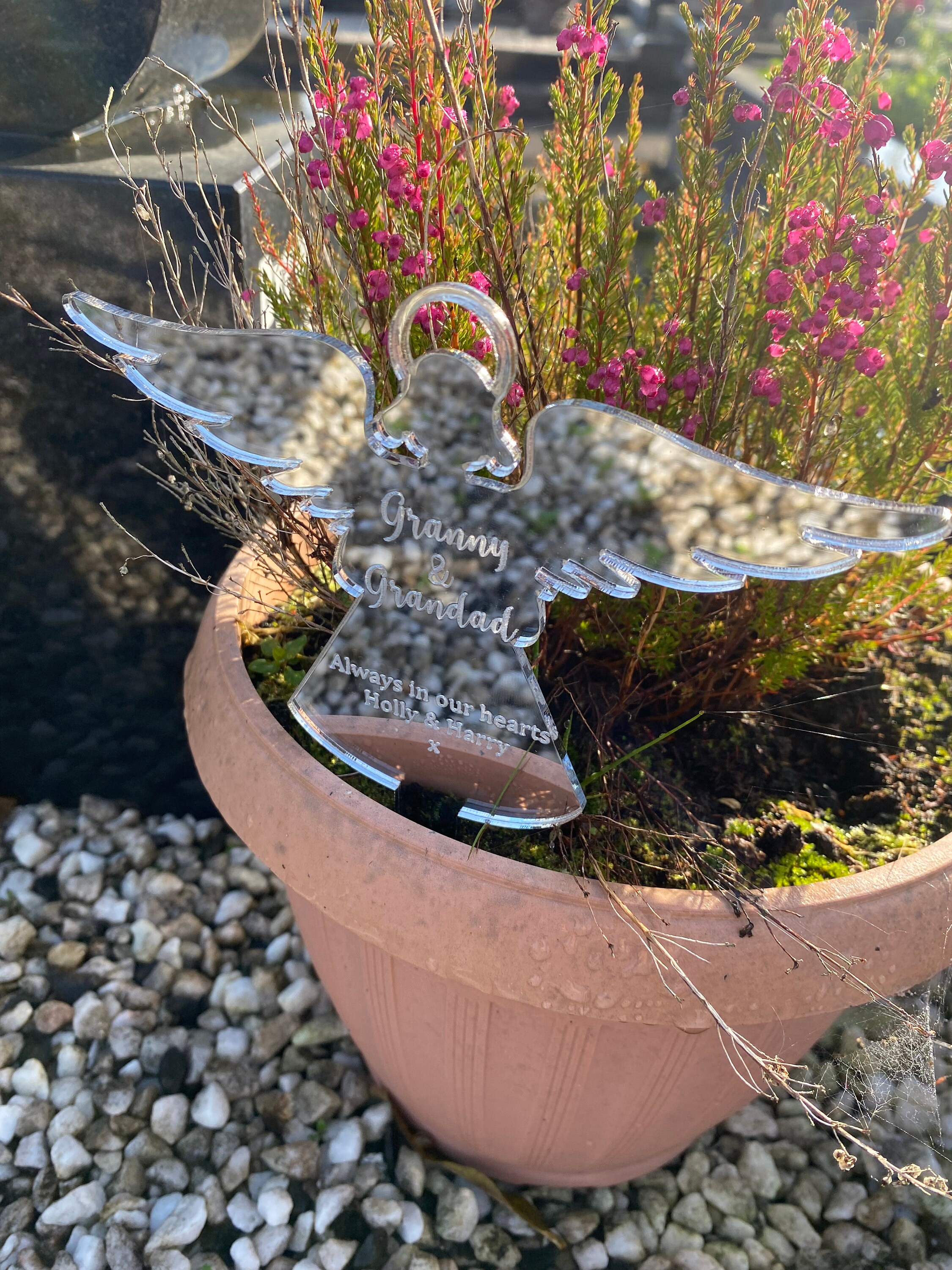 A beautiful personalised memorial angel with the personalisation of your choice and comes with a stake so that it can be placed in a garden, planter or by a grave.