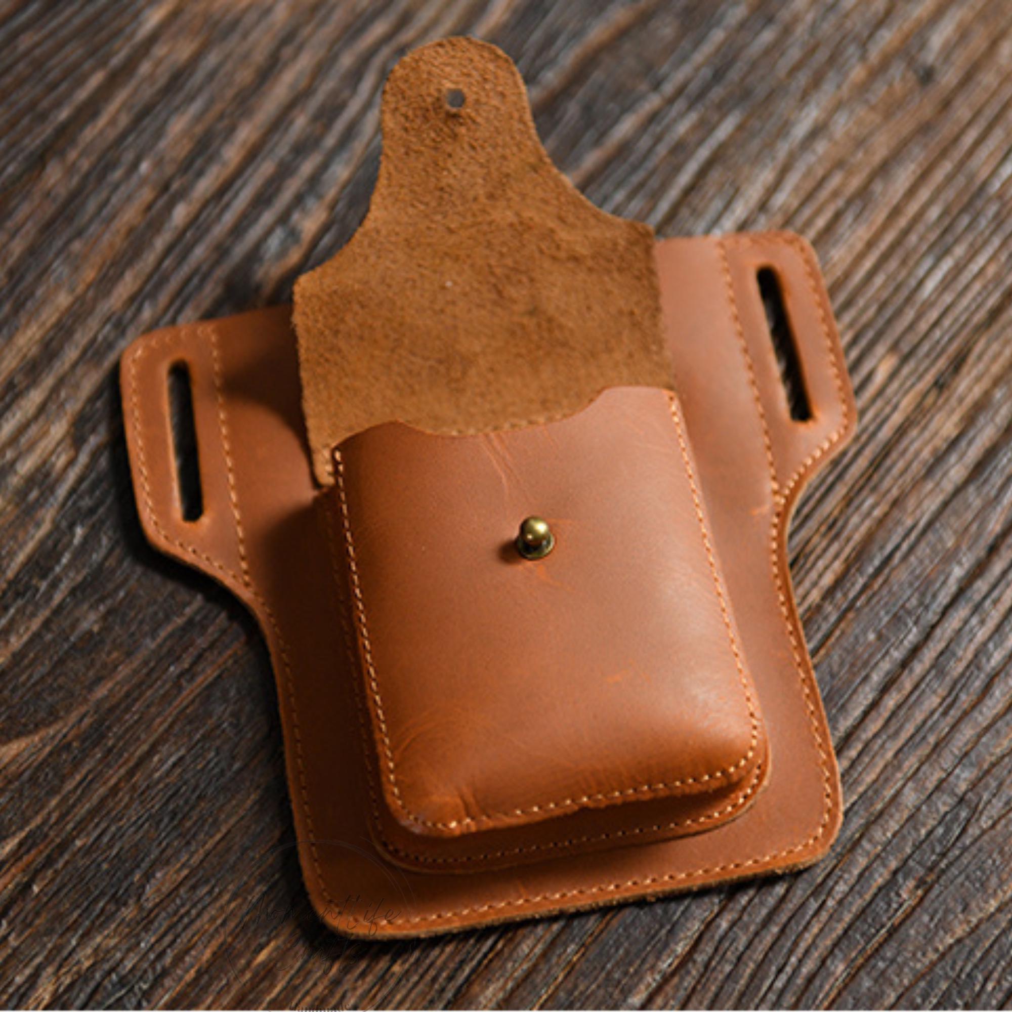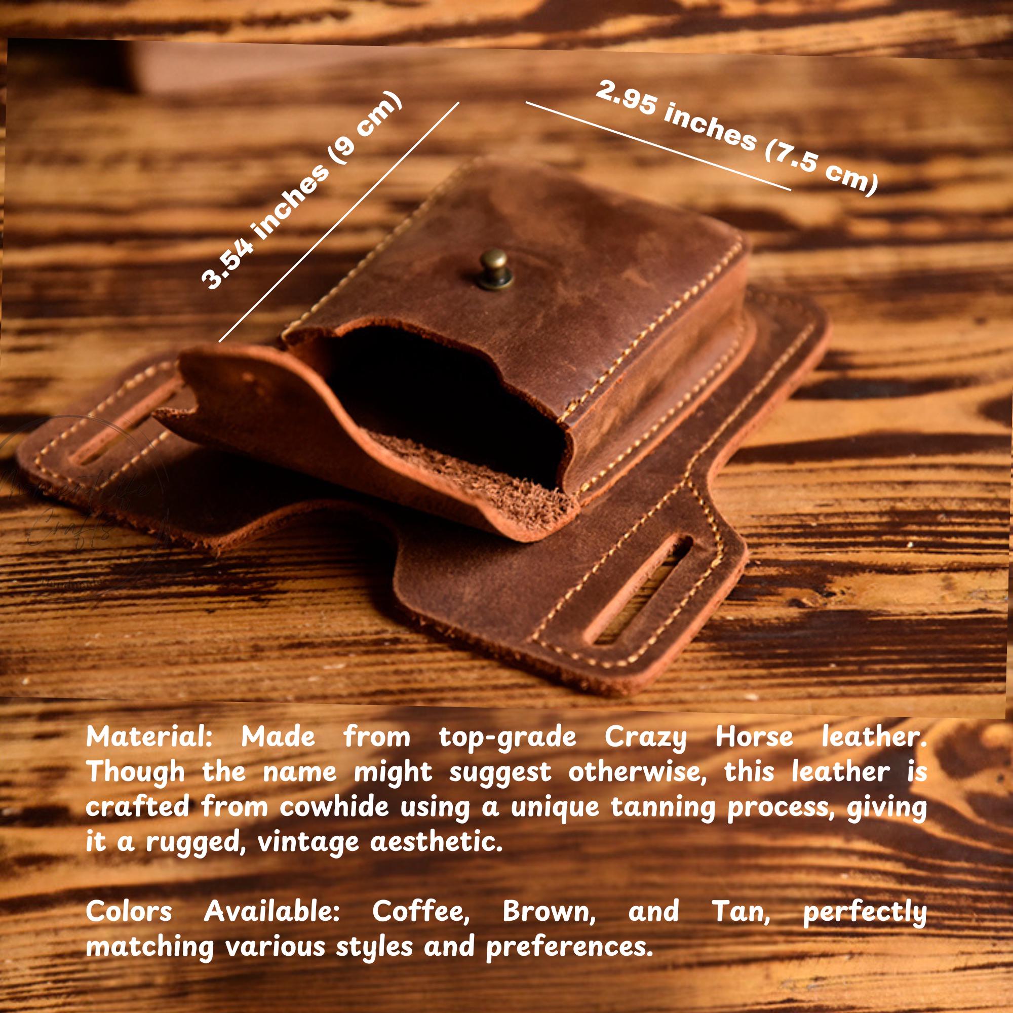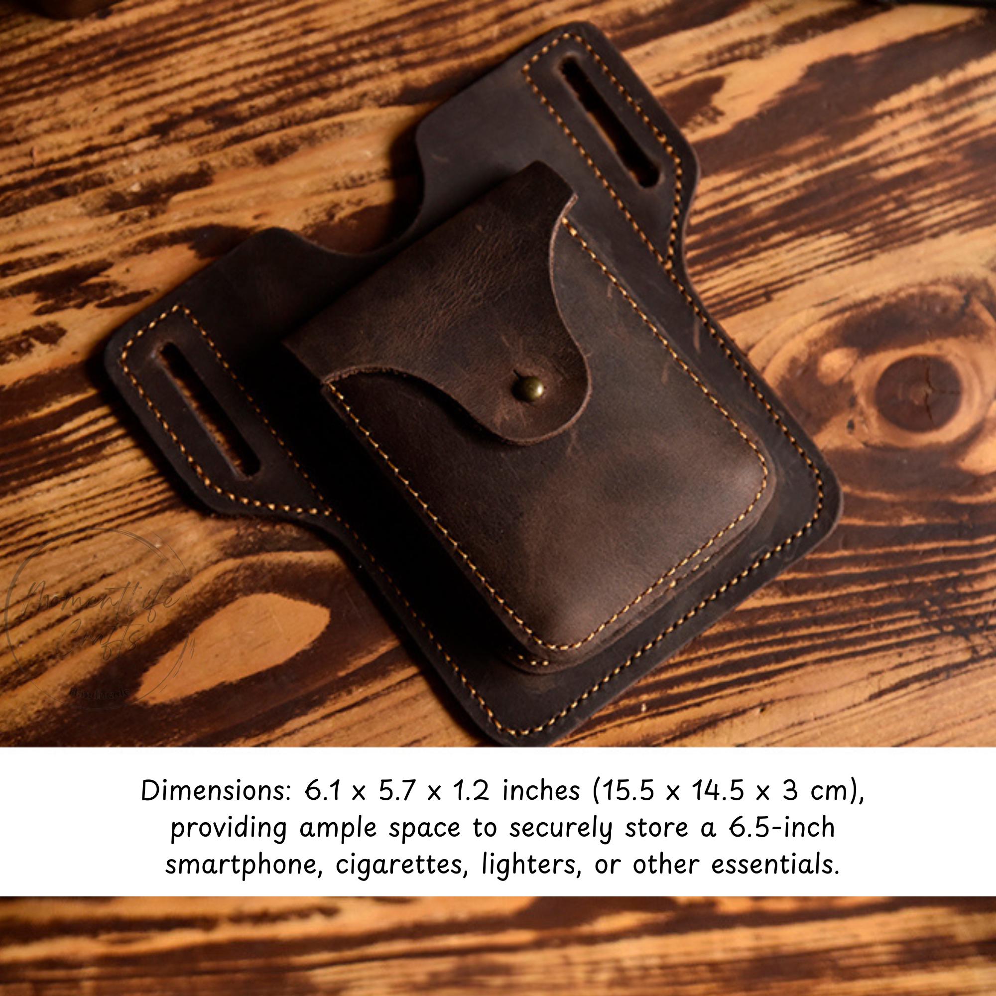 Dimensions: 6.1 x 5.7 x 1.2 inches (15.5 x 14.5 x 3 cm), providing ample space to securely store a 6.5-inch smartphone, cigarettes, lighters, or other essentials. Material: Made from top-grade Crazy Horse leather. Though the name might suggest otherwise, this leather is crafted from cowhide using a unique tanning process, giving it a rugged, vintage aesthetic.