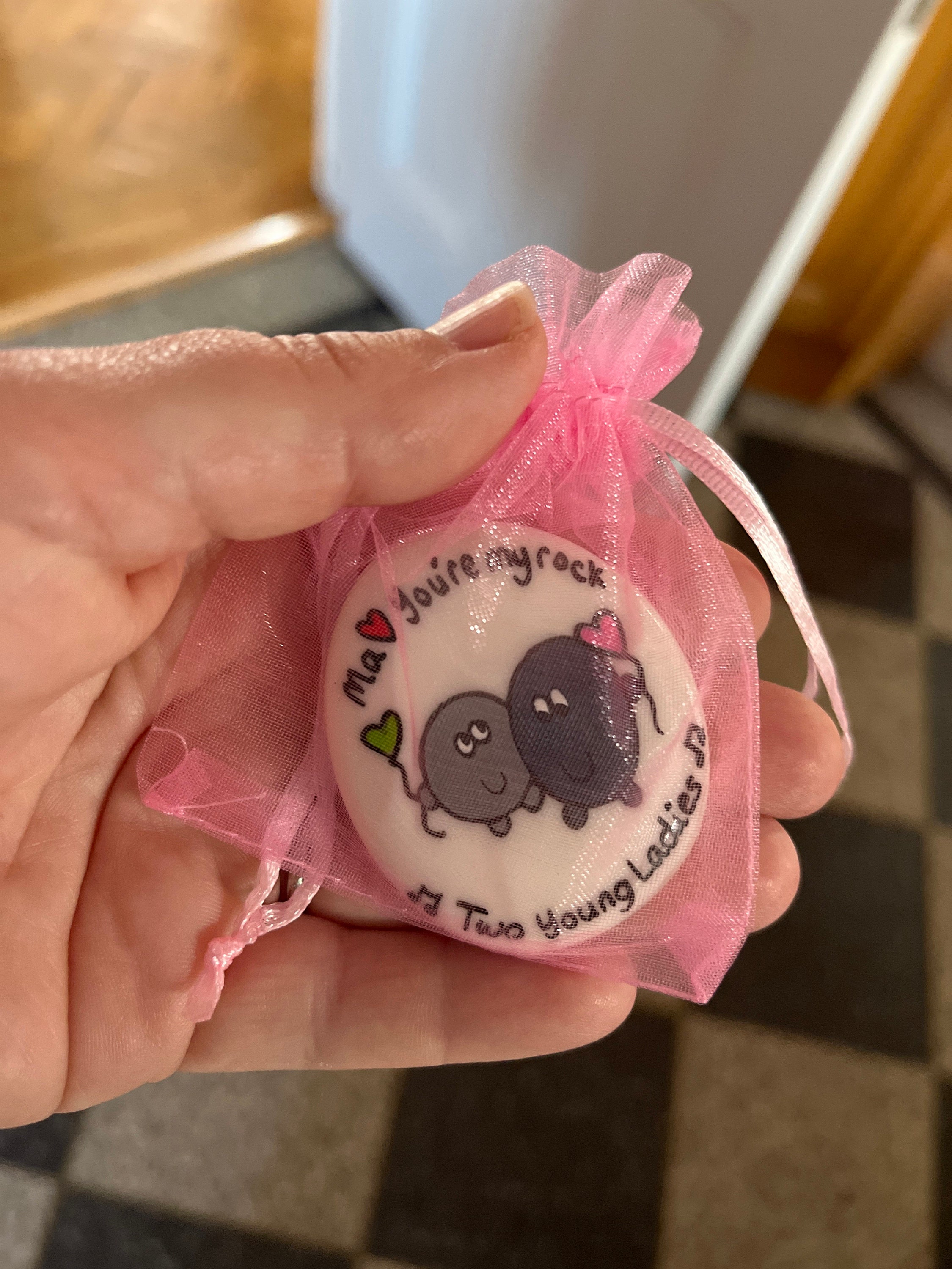 All keepsake pebbles are wrapped in tissue paper, affixed with stickers and placed in a small drawstring bag.