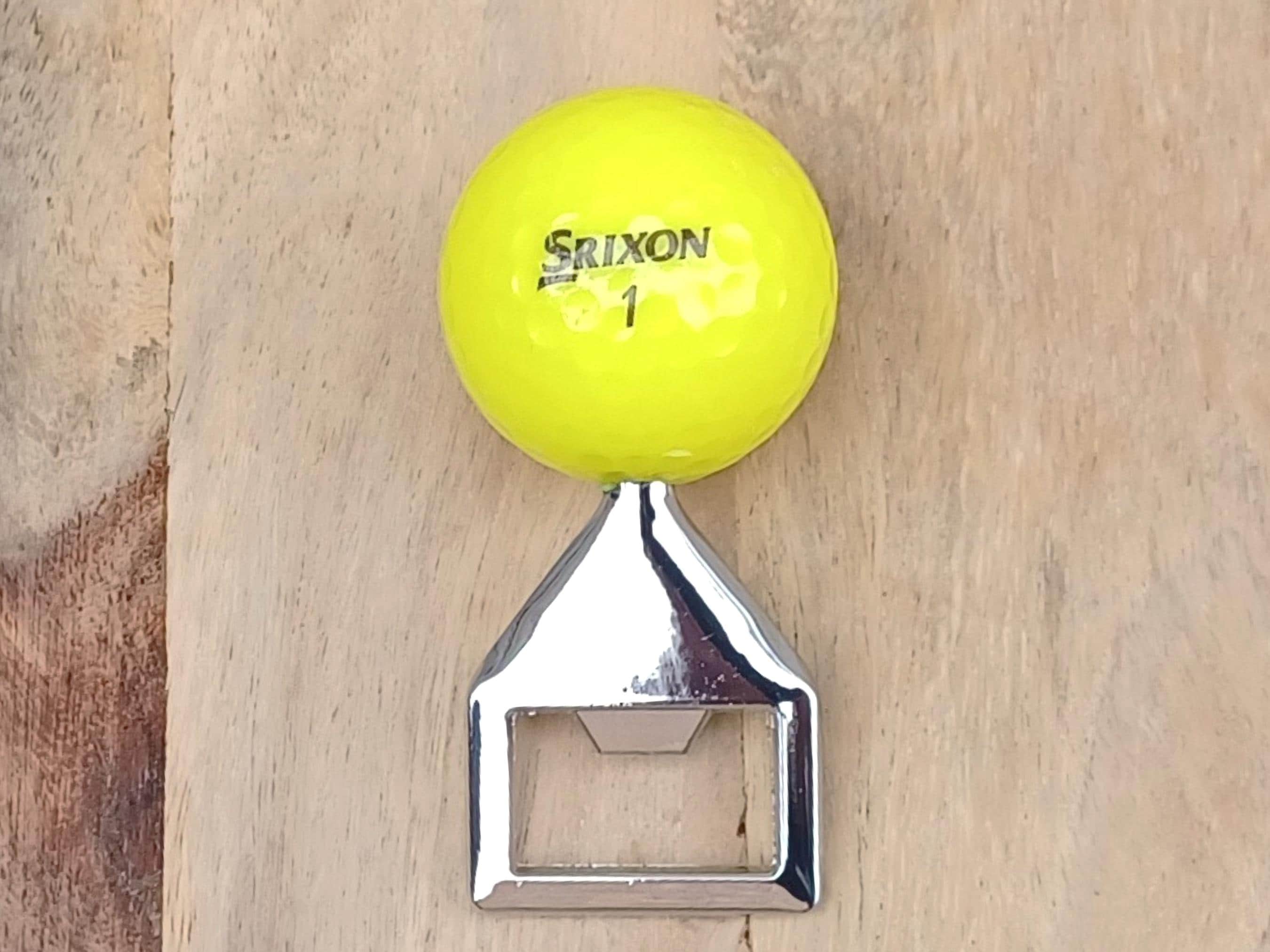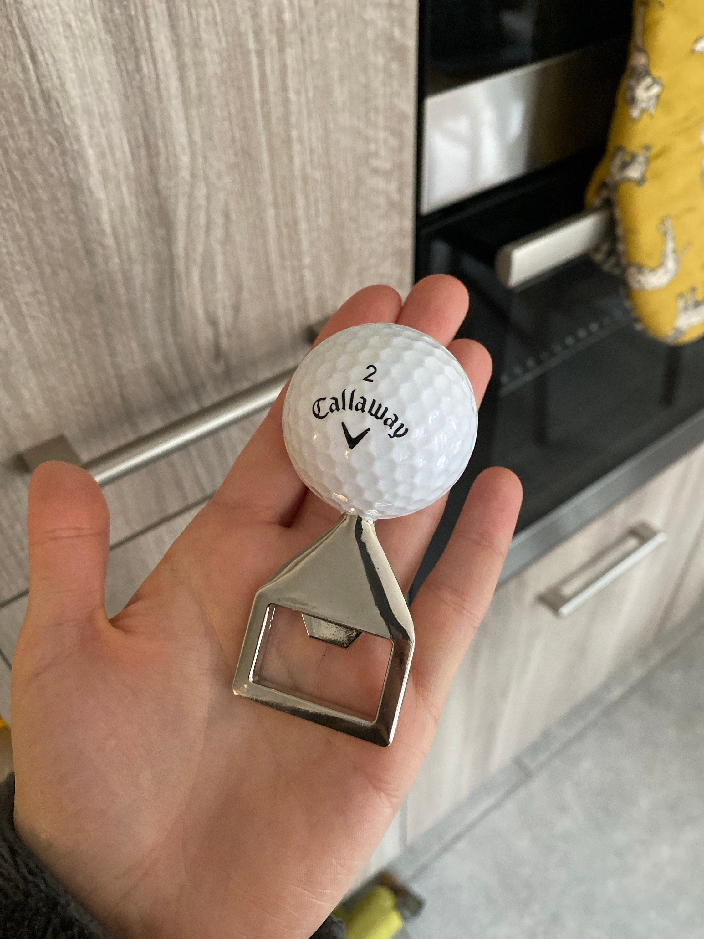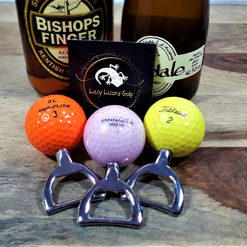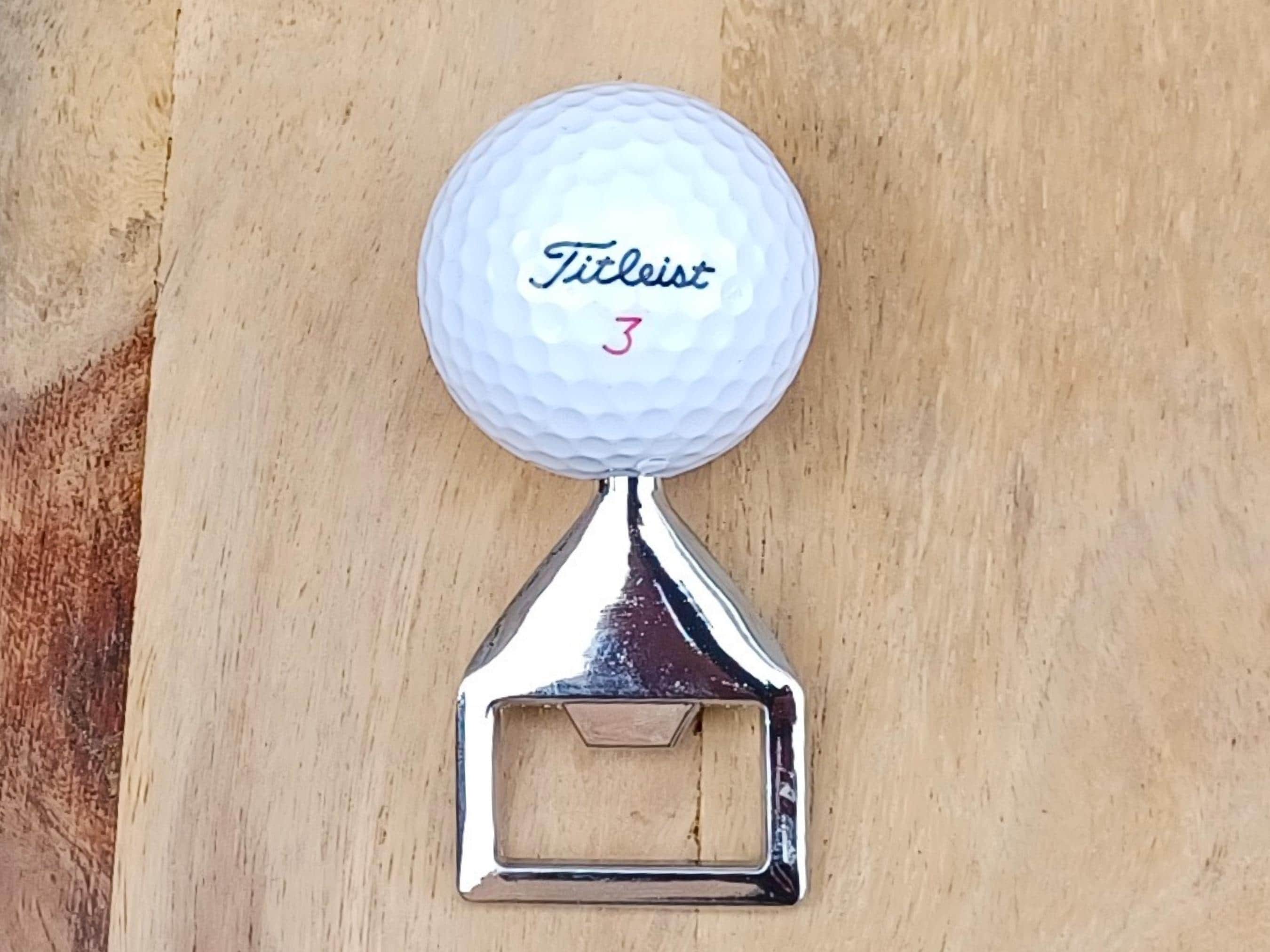 Golf ball repurposed as a unique bottle opener. Ideal Christmas stocking filler, man or woman caves, BBQs, indoor or outdoor bars, house parties. Throw it in your golf bag for beer occasions!