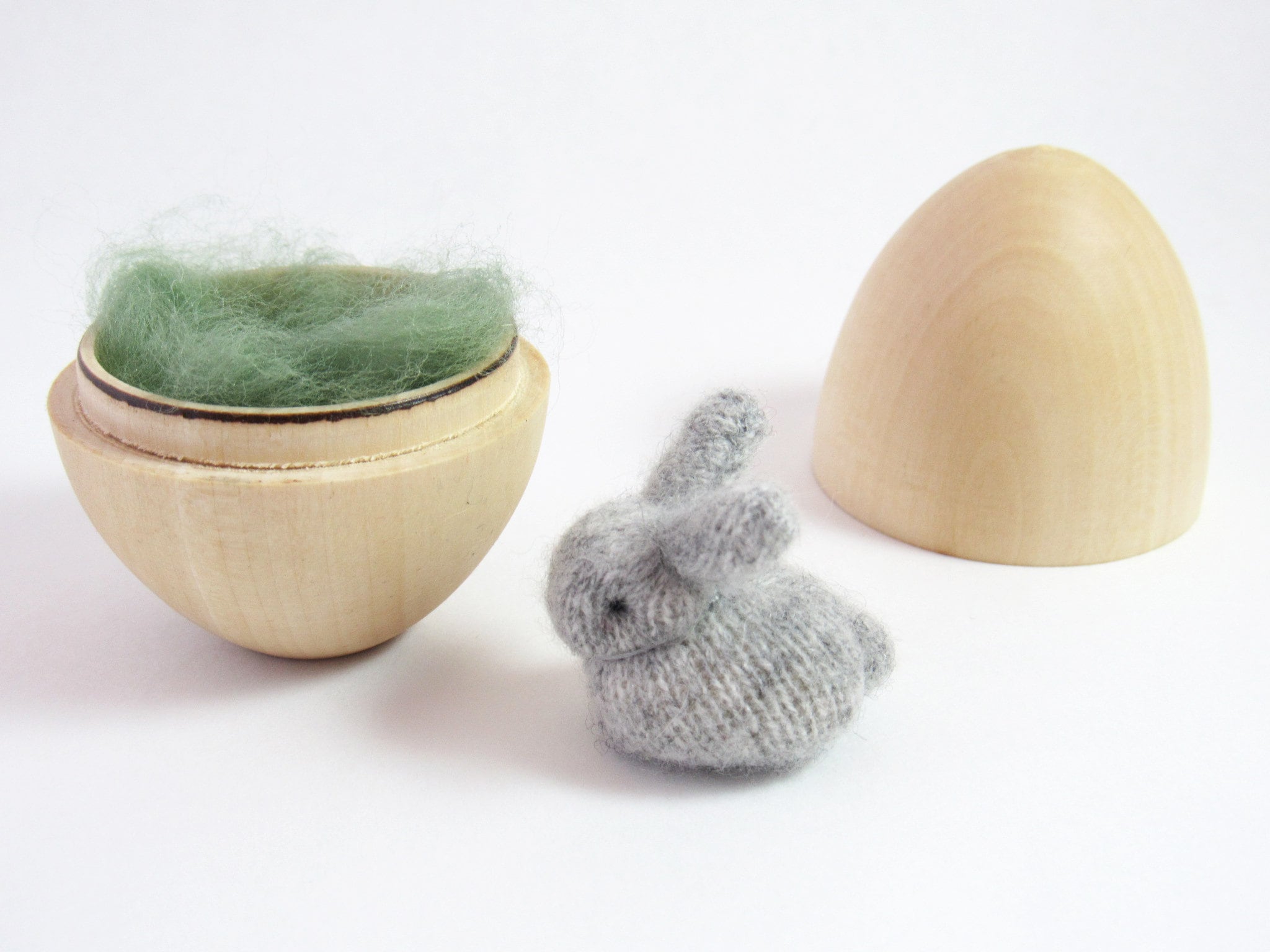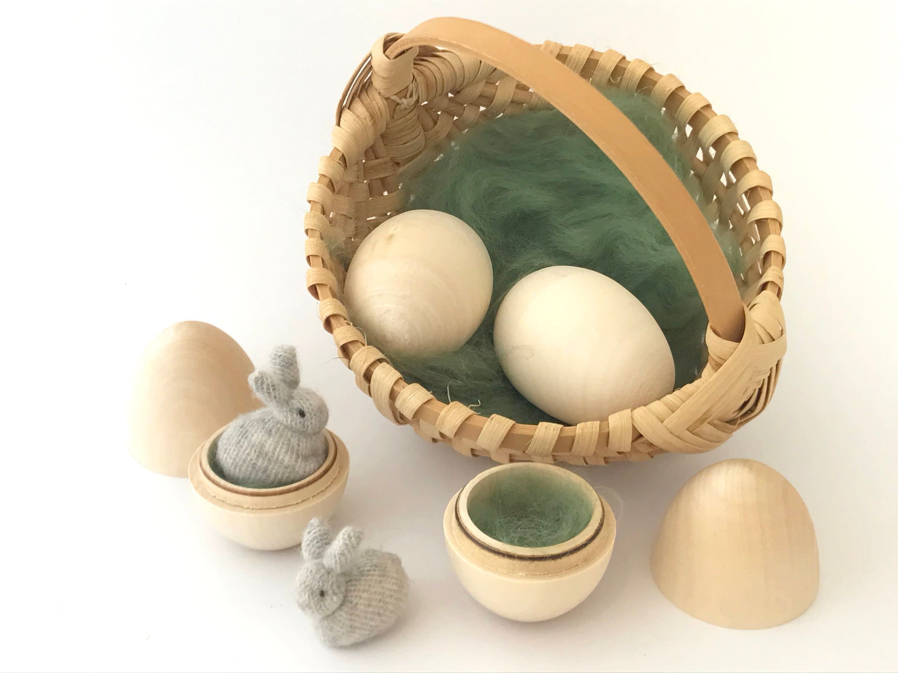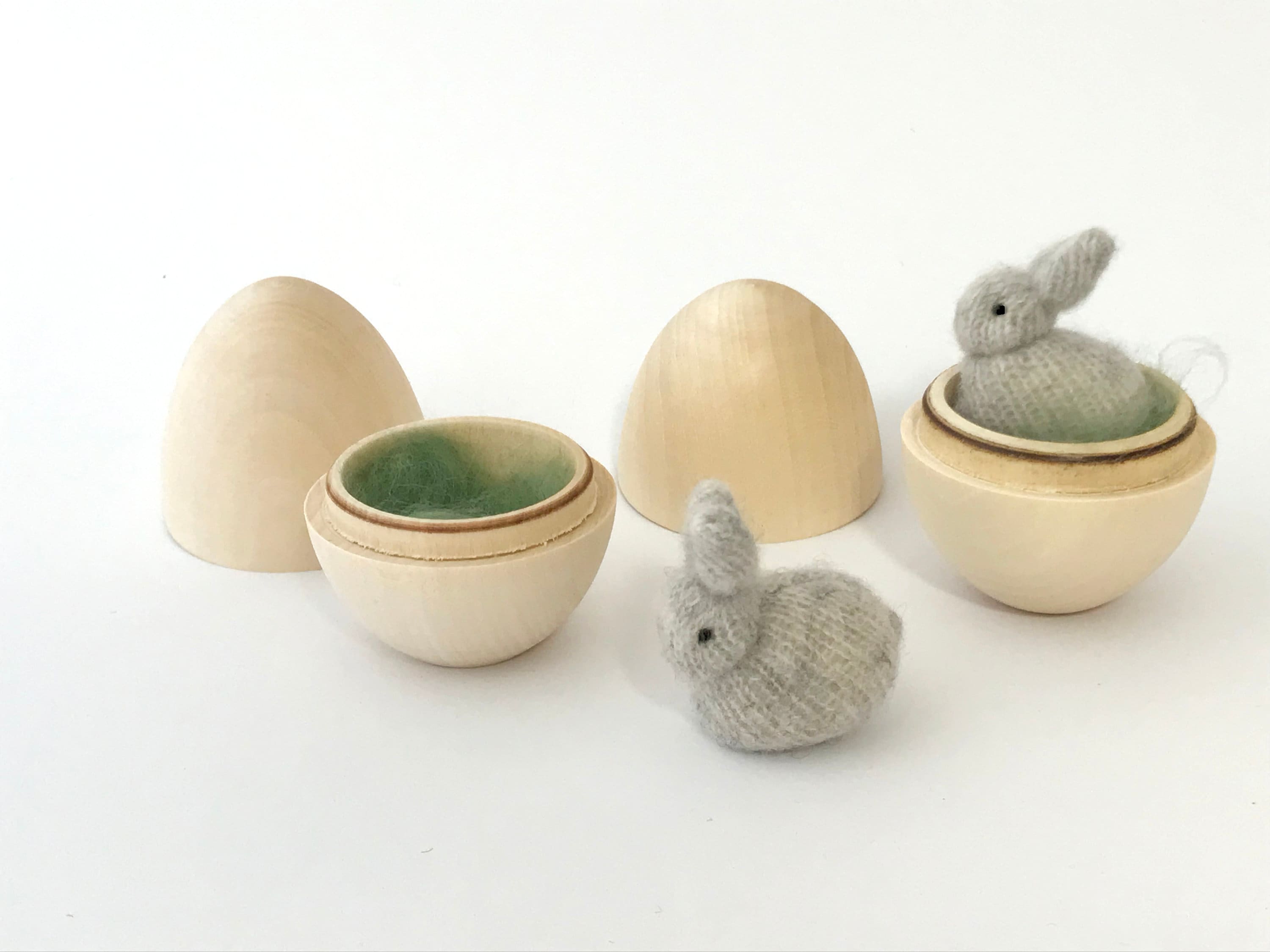 The gift set includes TWO hollow linden wood Easter eggs that each open up to reveal an adorable mini cashmere bunny inside, nestled in a bed of soft green wool batting. The egg is sanded smooth and left completely natural (they could be painted, oiled, or enjoyed as is). Eggs are unique in shape and coloration and are approximately 2 3/4" tall and 2 1/8" in diameter. Some may have slight color inconsistencies or faint knots.
