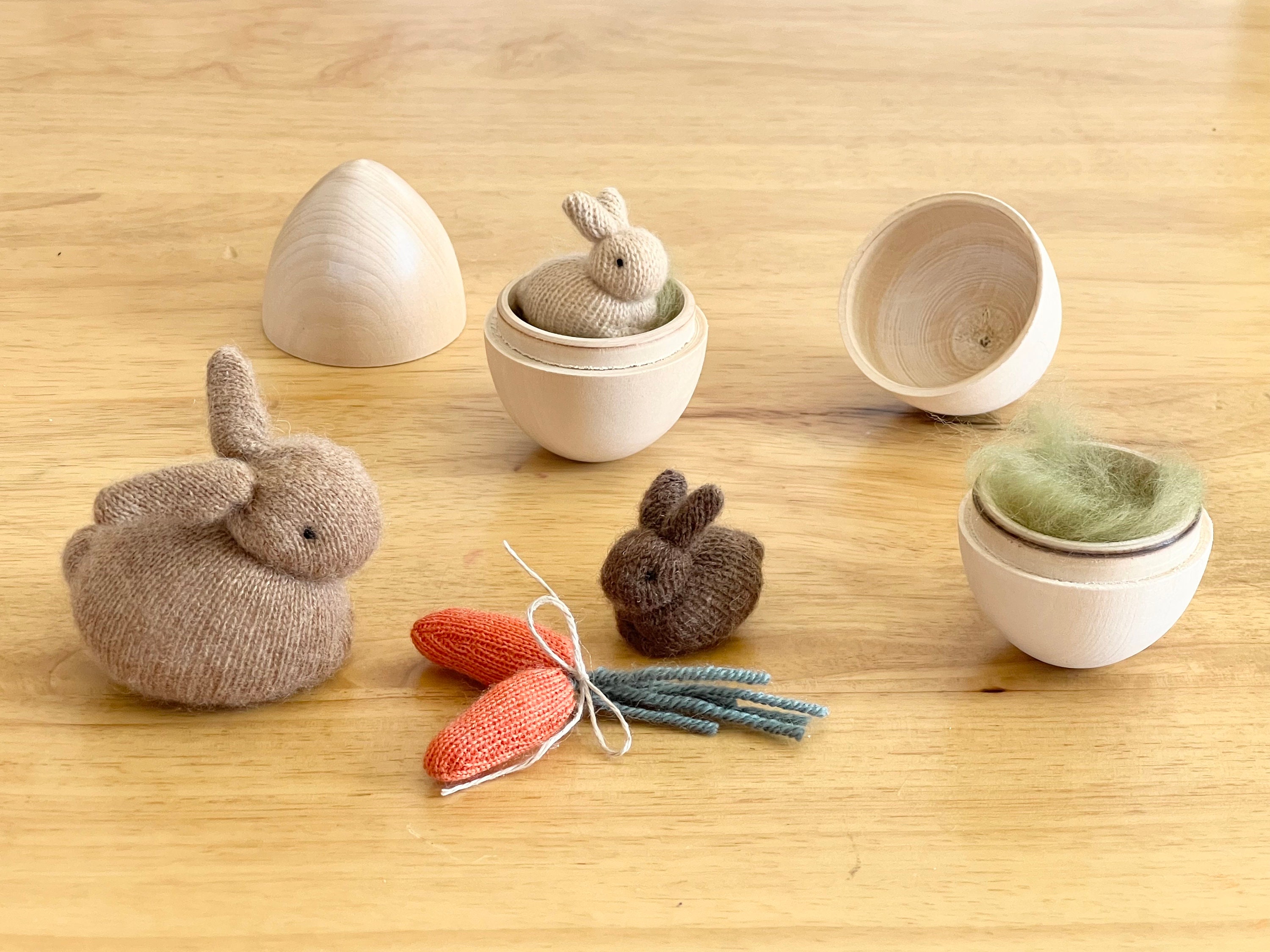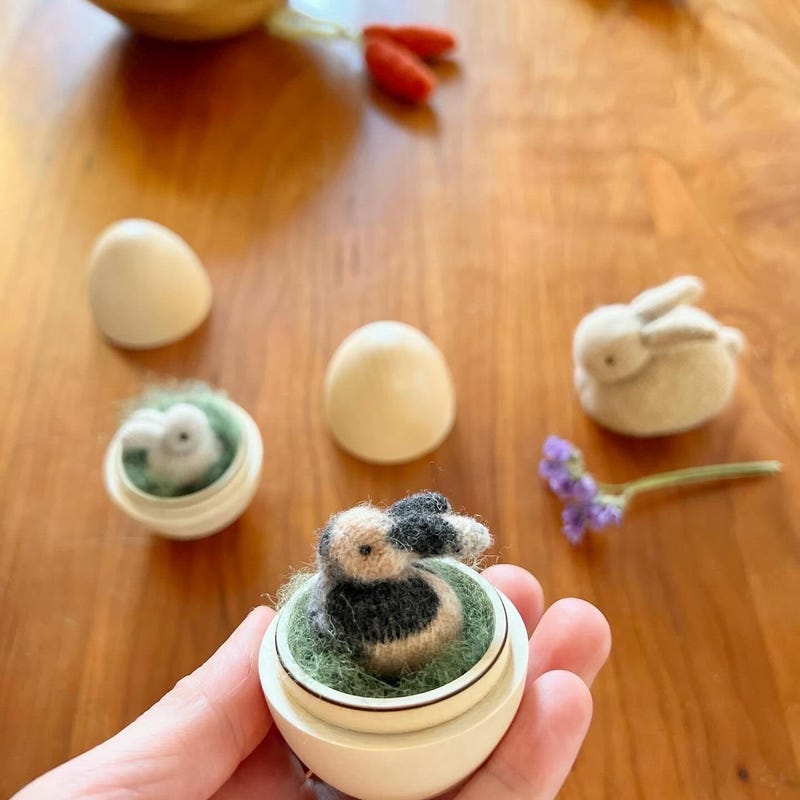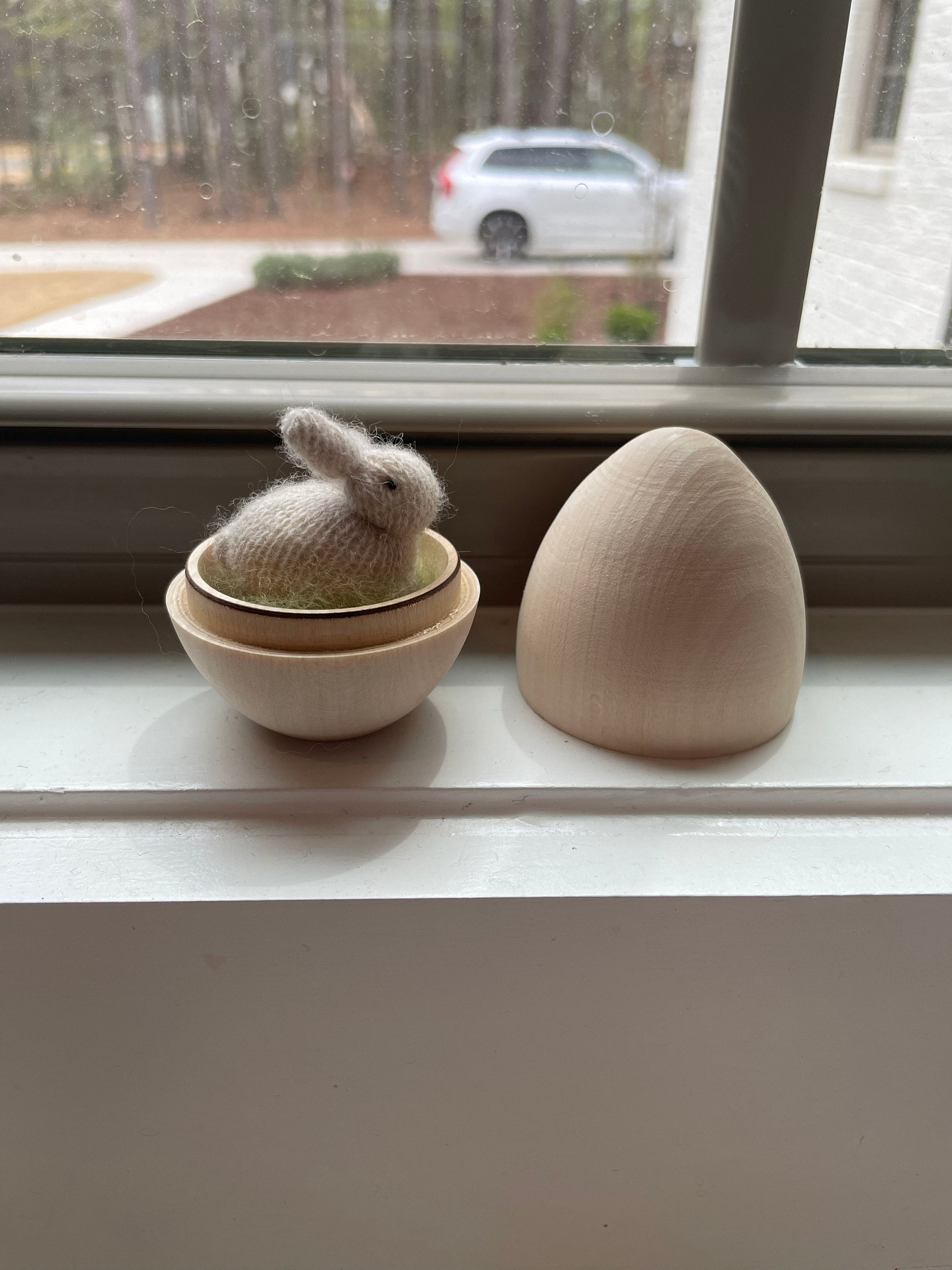 The gift set includes TWO hollow linden wood Easter eggs that each open up to reveal an adorable mini cashmere bunny inside, nestled in a bed of soft green wool batting. The egg is sanded smooth and left completely natural (they could be painted, oiled, or enjoyed as is). Eggs are unique in shape and coloration and are approximately 2 3/4" tall and 2 1/8" in diameter. Some may have slight color inconsistencies or faint knots.