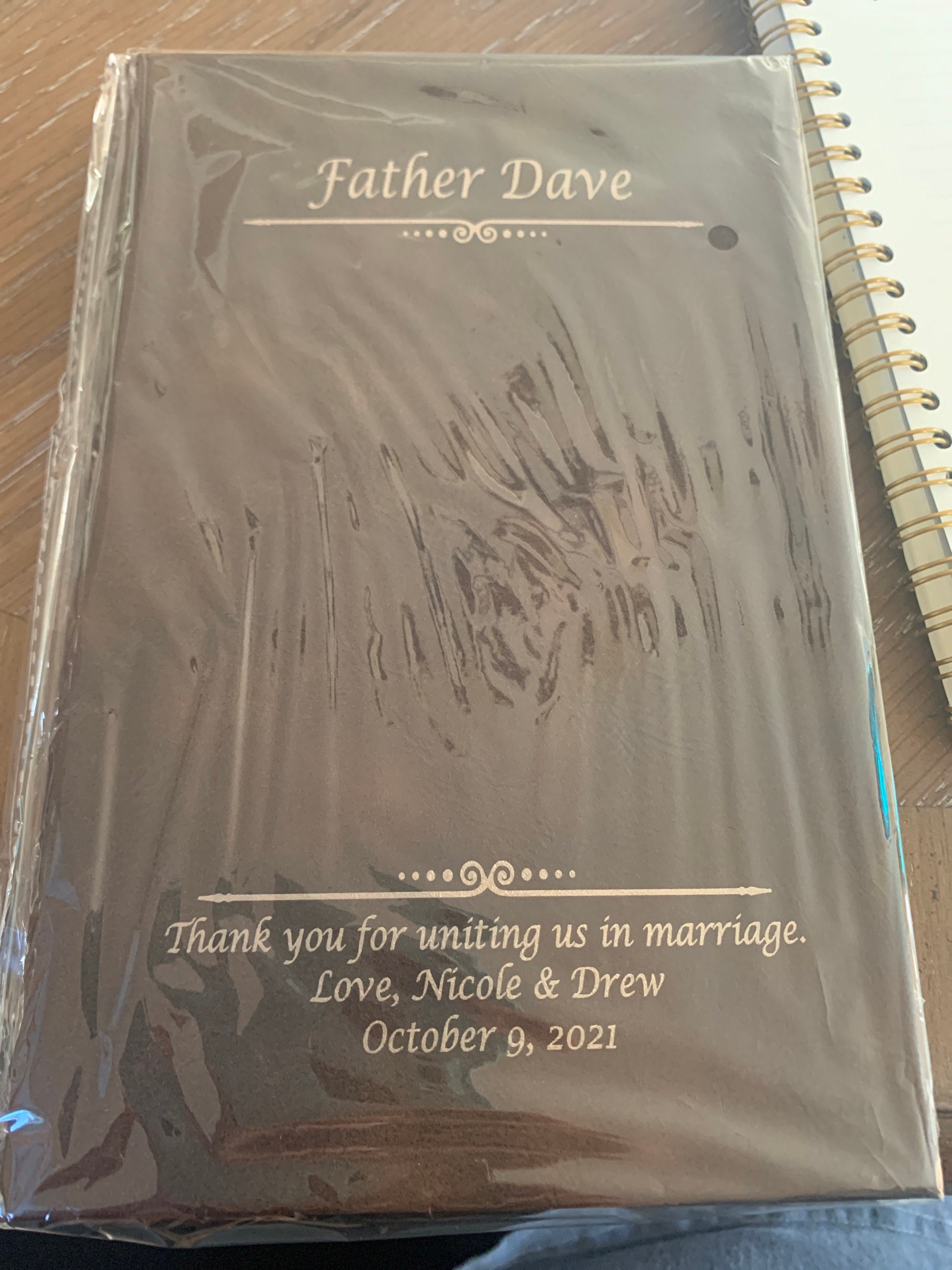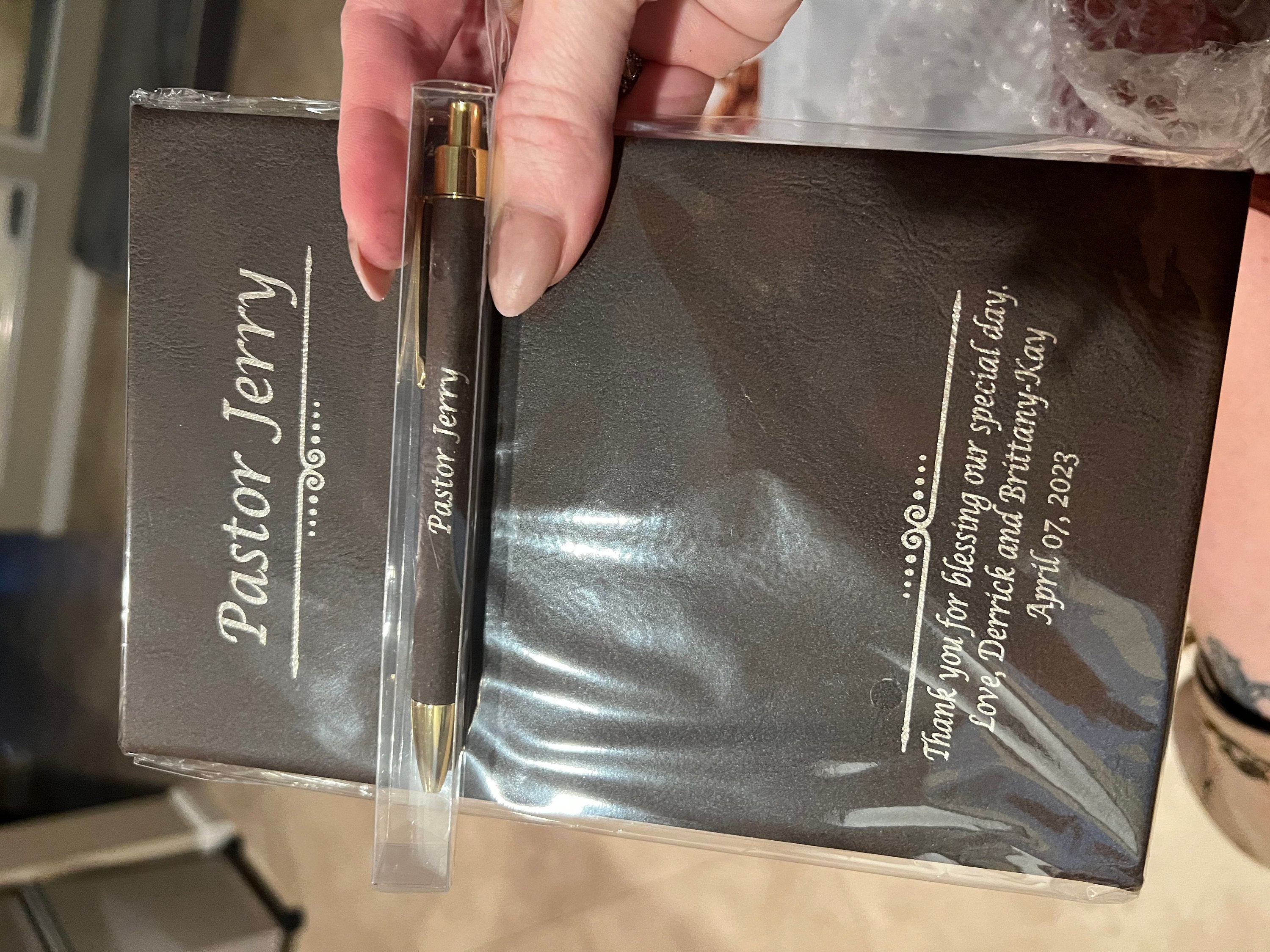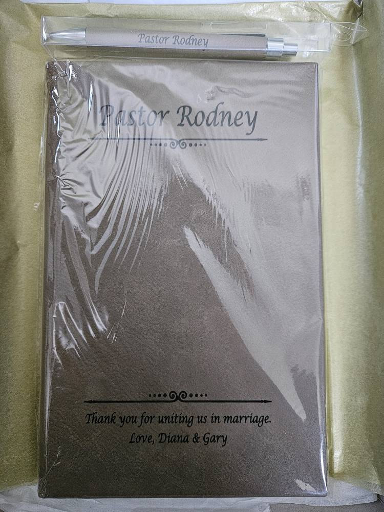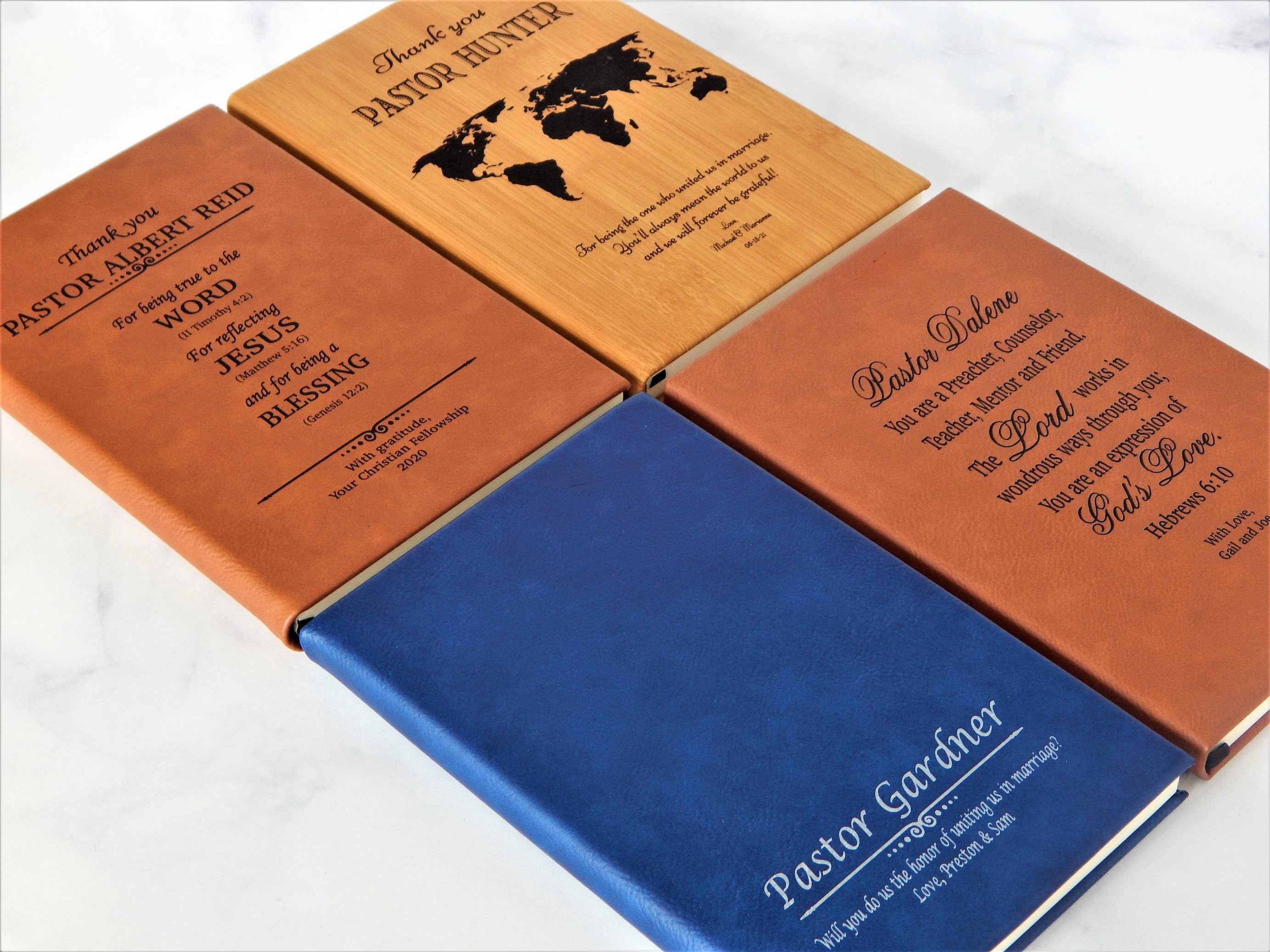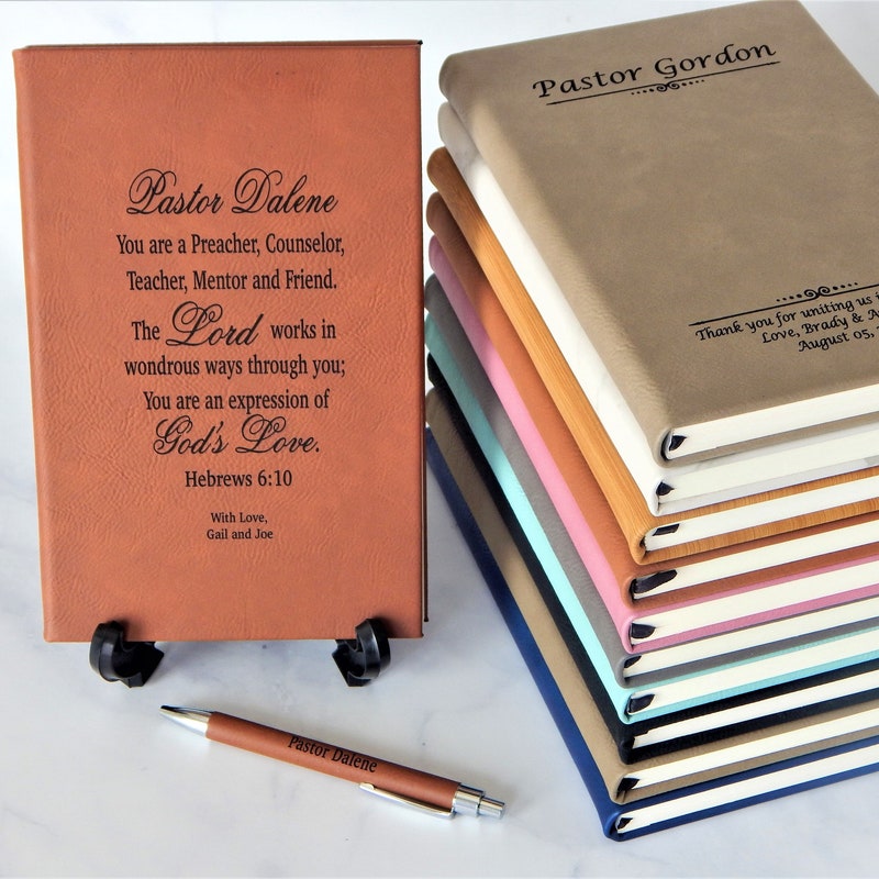 This personalized engraved journal is the perfect thank you gift for a community leader, pastor, Catholic priest, minister, religious leader, youth leader, or any spiritual leader, male or female. It is a creative way to thank your bishop, deacon, pastor's wife, or any church helper for their outstanding service to the body of Christ. Professionally engraved in Texas, USA, our custom leather notebooks are the ideal Christian gift for wedding officiants, missionary retirements, pastor appreciation day, Father's Day, Christmas, birthdays, anniversaries, ordination, thanksgiving, or other religious celebrations! They can be personalized with any text, logo, poem, or Bible verse to create a memorable gift for your spiritual leader. These customizable notebook journal gifts will impress the recipient. Elevate your gift giving experience with a thoughtful, one-of-a-kind gift that will be treasured for years to come. With a classic design and customizable touch, this leather journal is more than just a gift, it is a symbol of love, connection, and memorable moments. This custom notebook is a great personalized gift that is perfect for celebrating religious occasions.