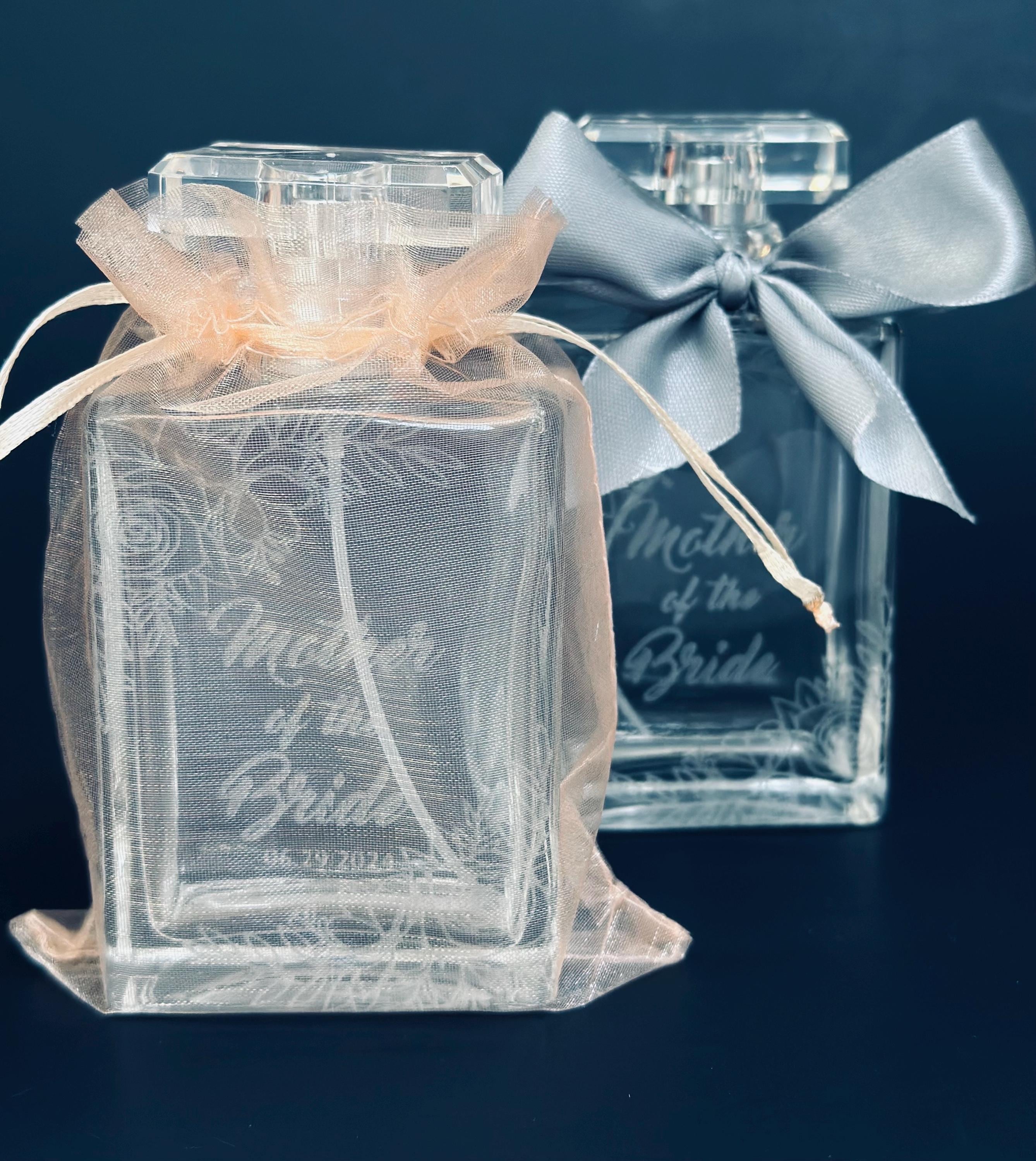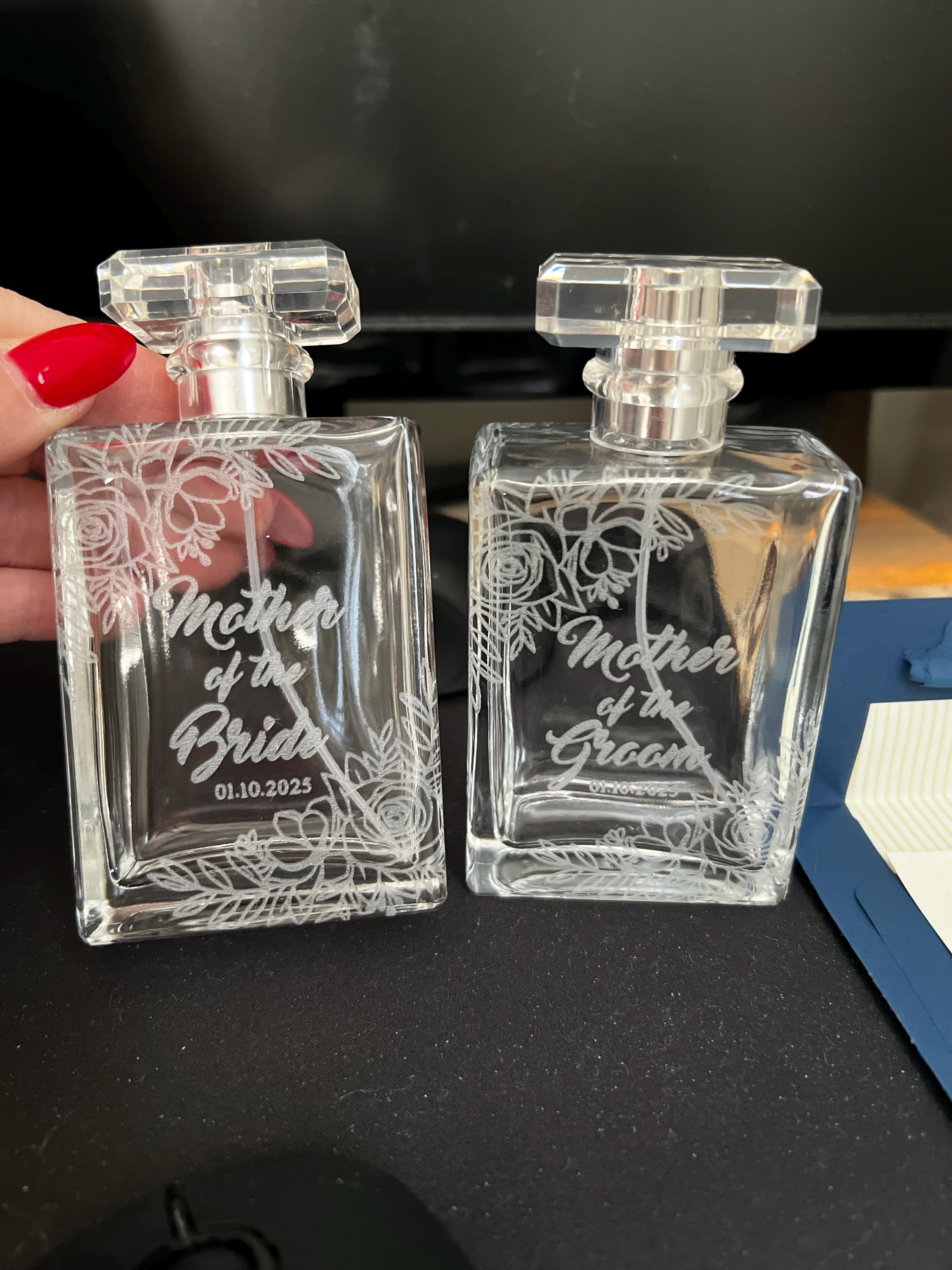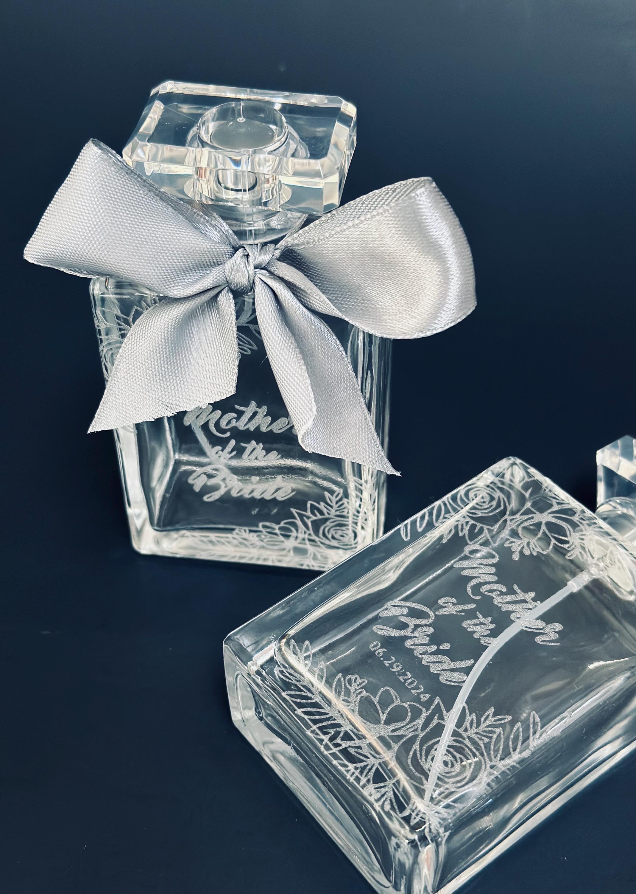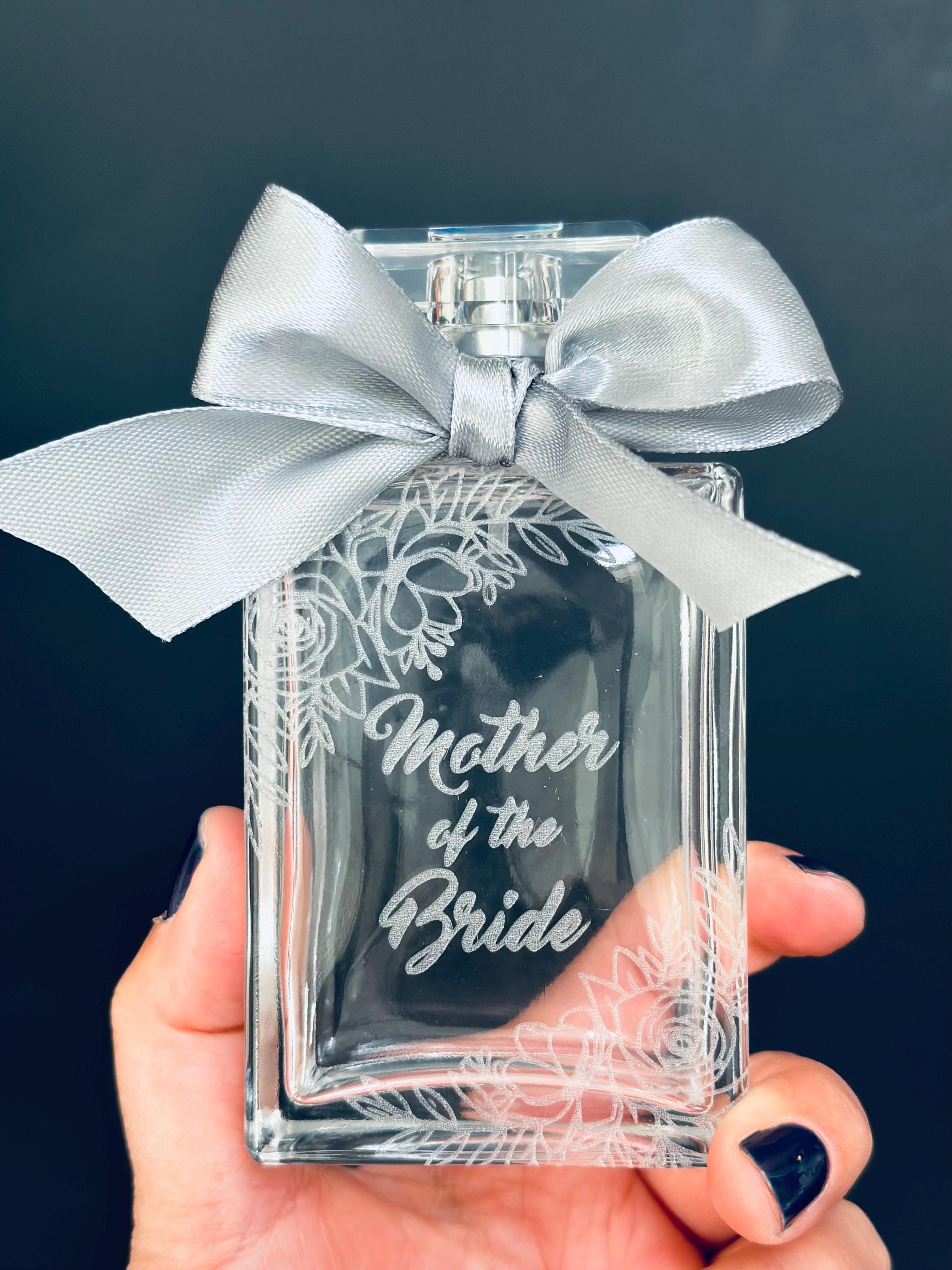 This engraved (empty) perfume bottle is the perfect gift for the Mother of the Bride and the Mother of the Groom! Our laser engraver adds the design onto an empty 3.4 oz perfume bottle. If you would like to add a date to it, please let us know in the personalize section at checkout.