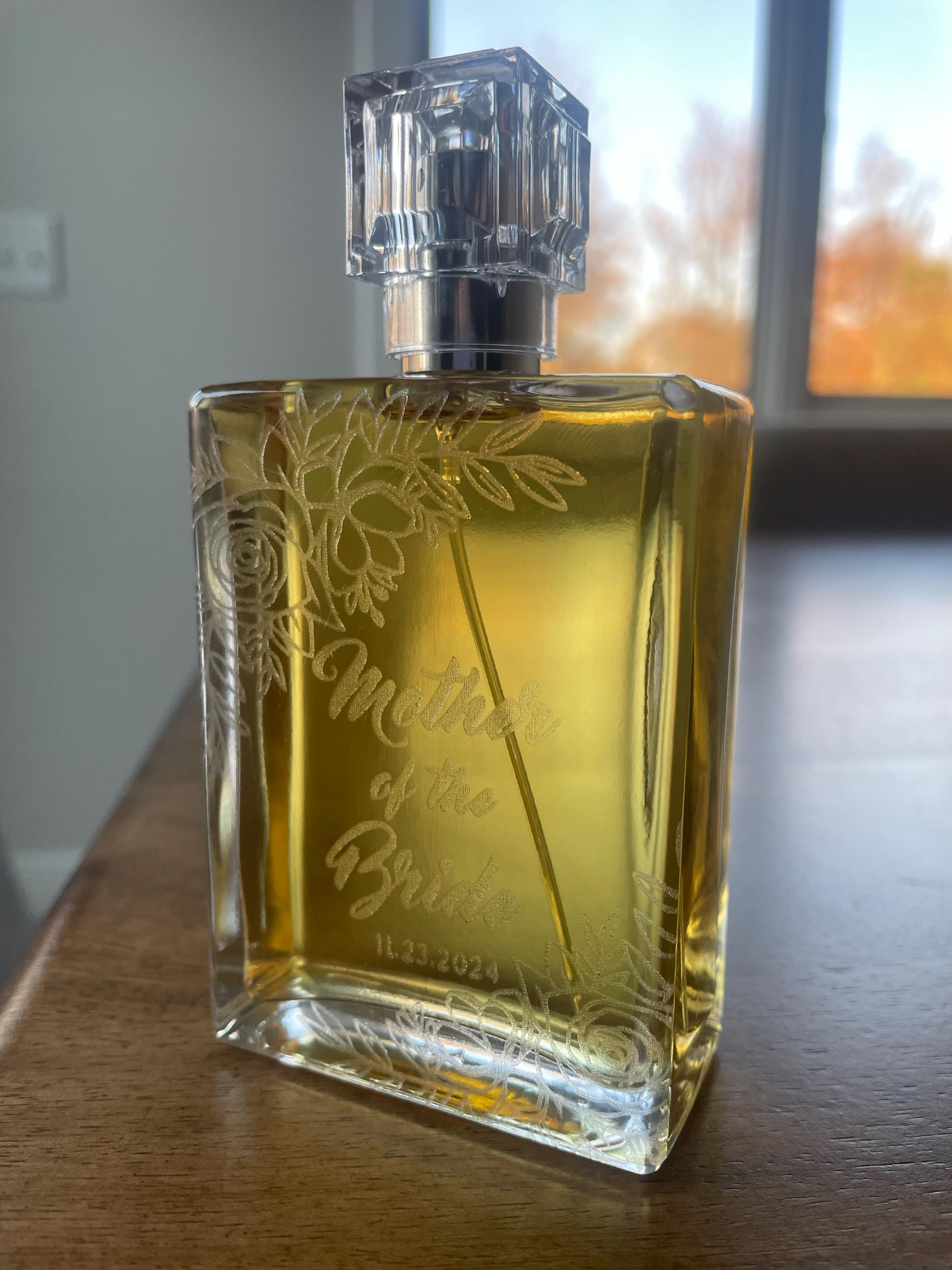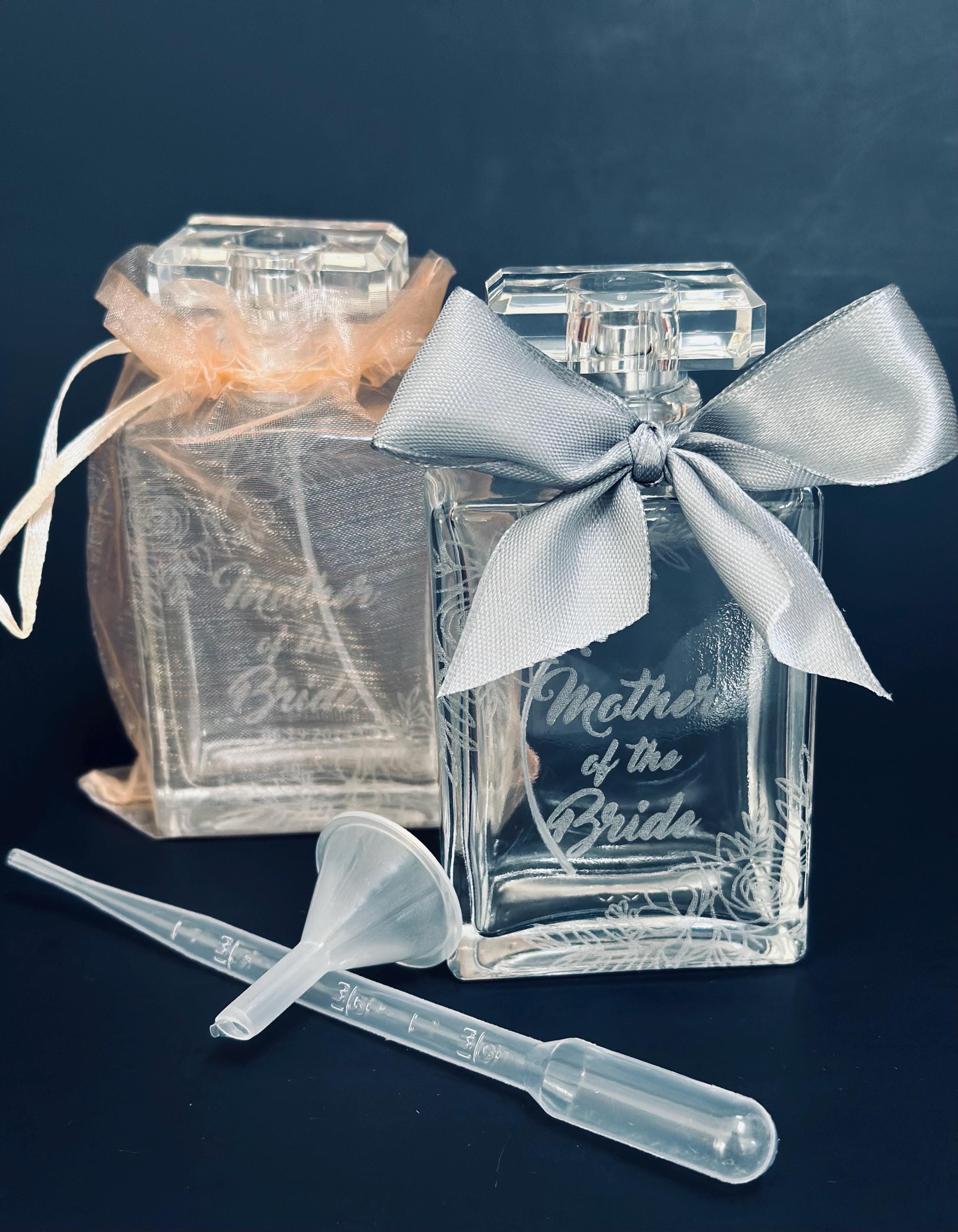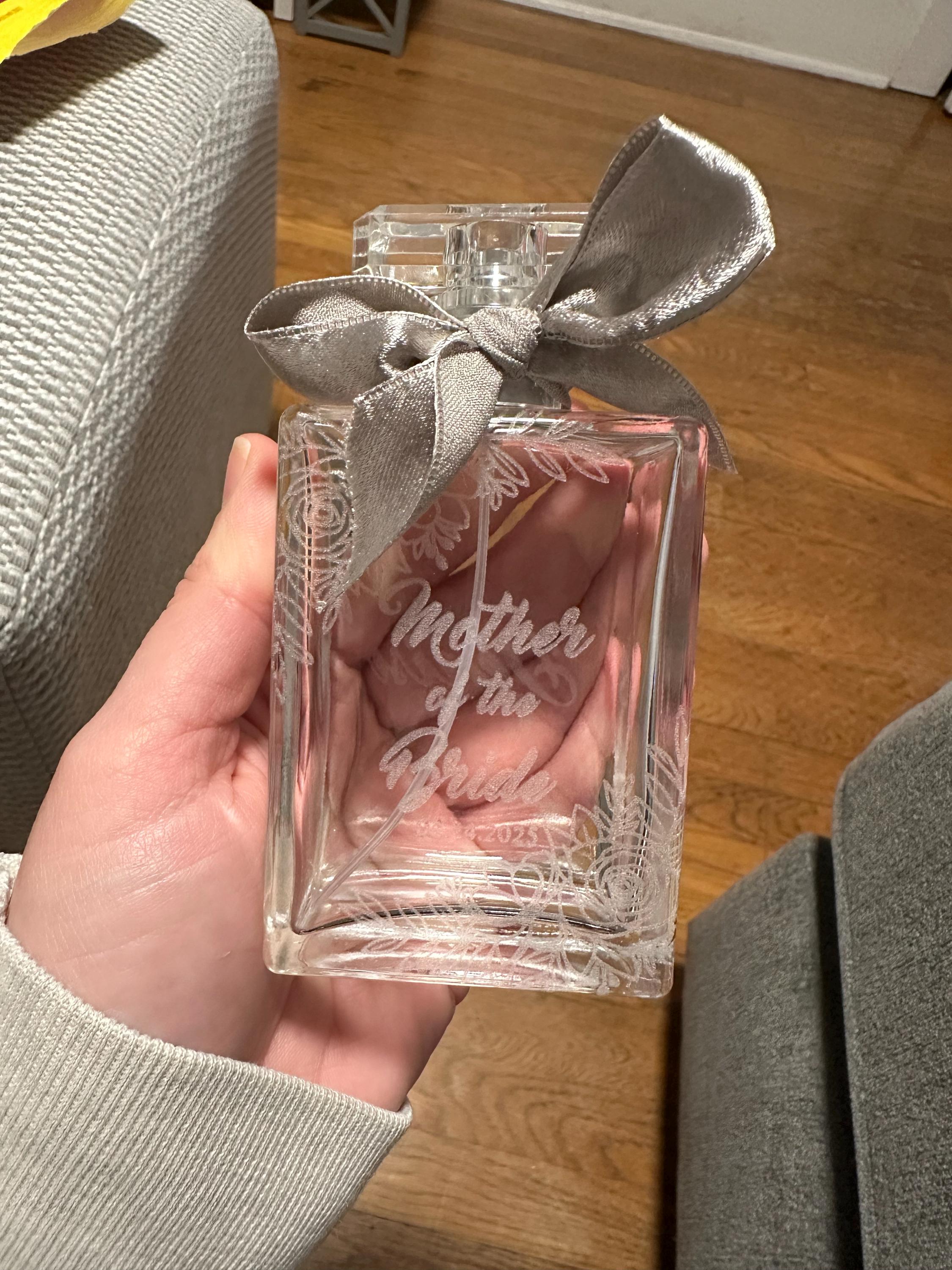 This engraved (empty) perfume bottle is the perfect gift for the Mother of the Bride and the Mother of the Groom! Our laser engraver adds the design onto an empty 3.4 oz perfume bottle. If you would like to add a date to it, please let us know in the personalize section at checkout.