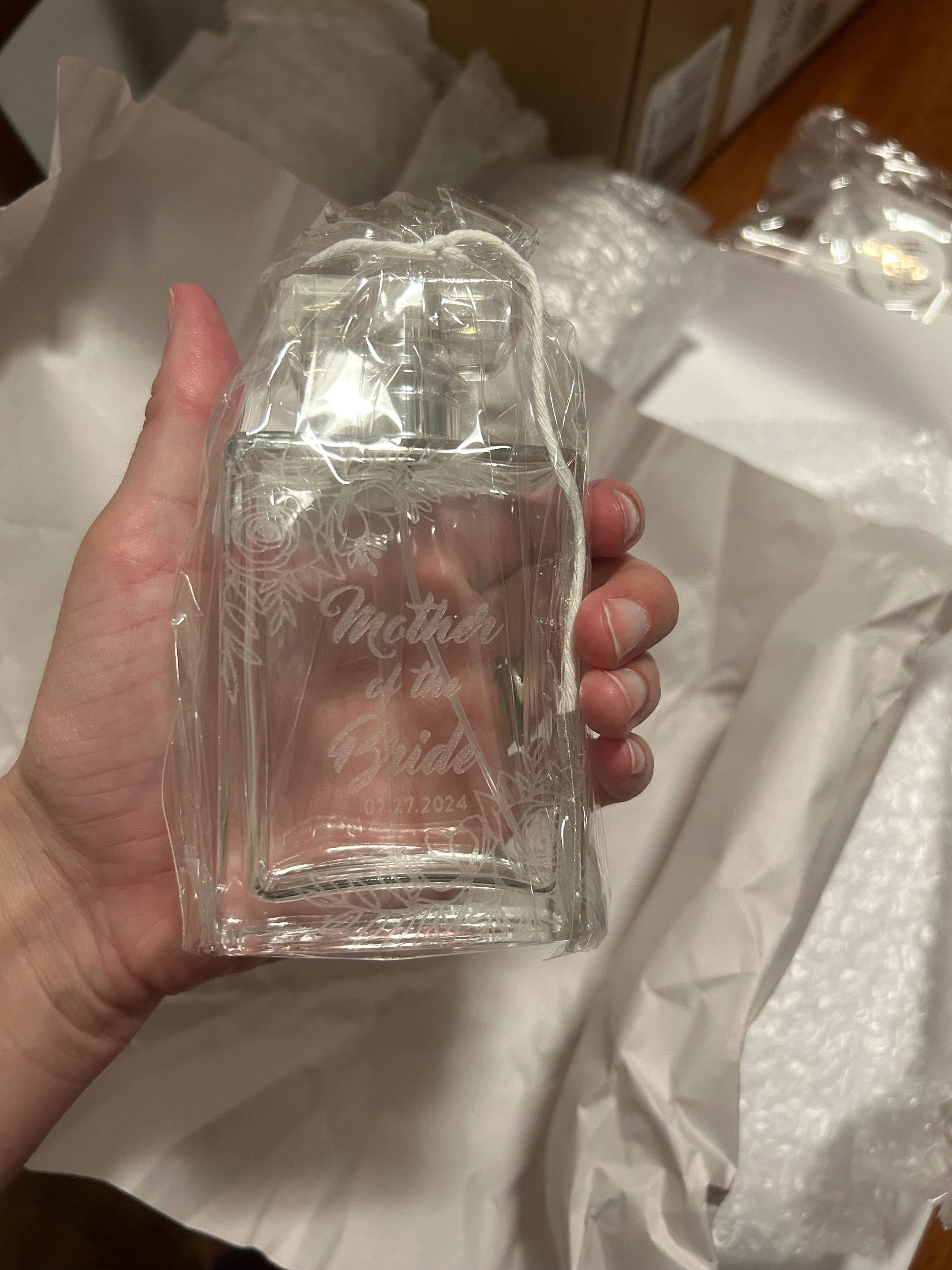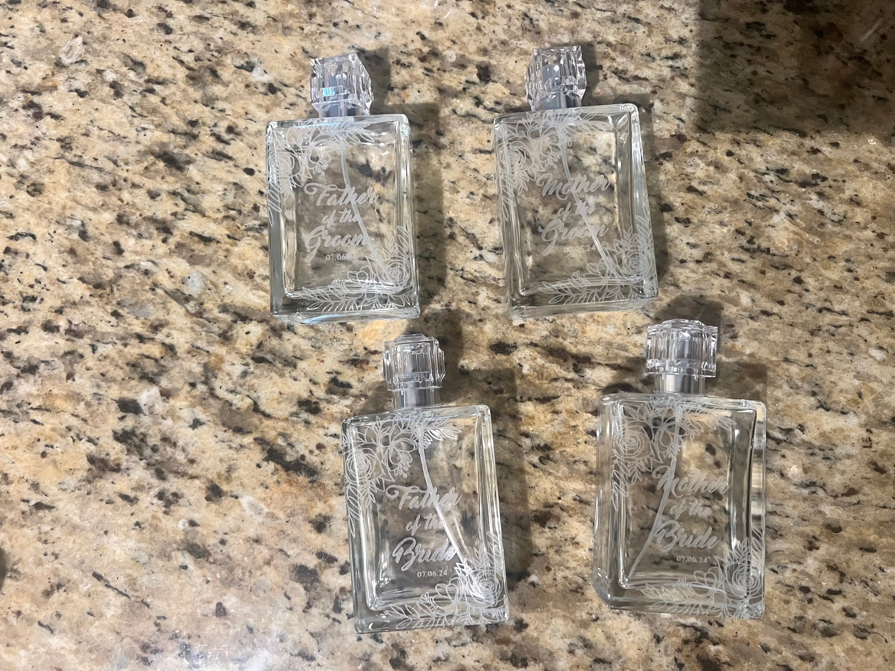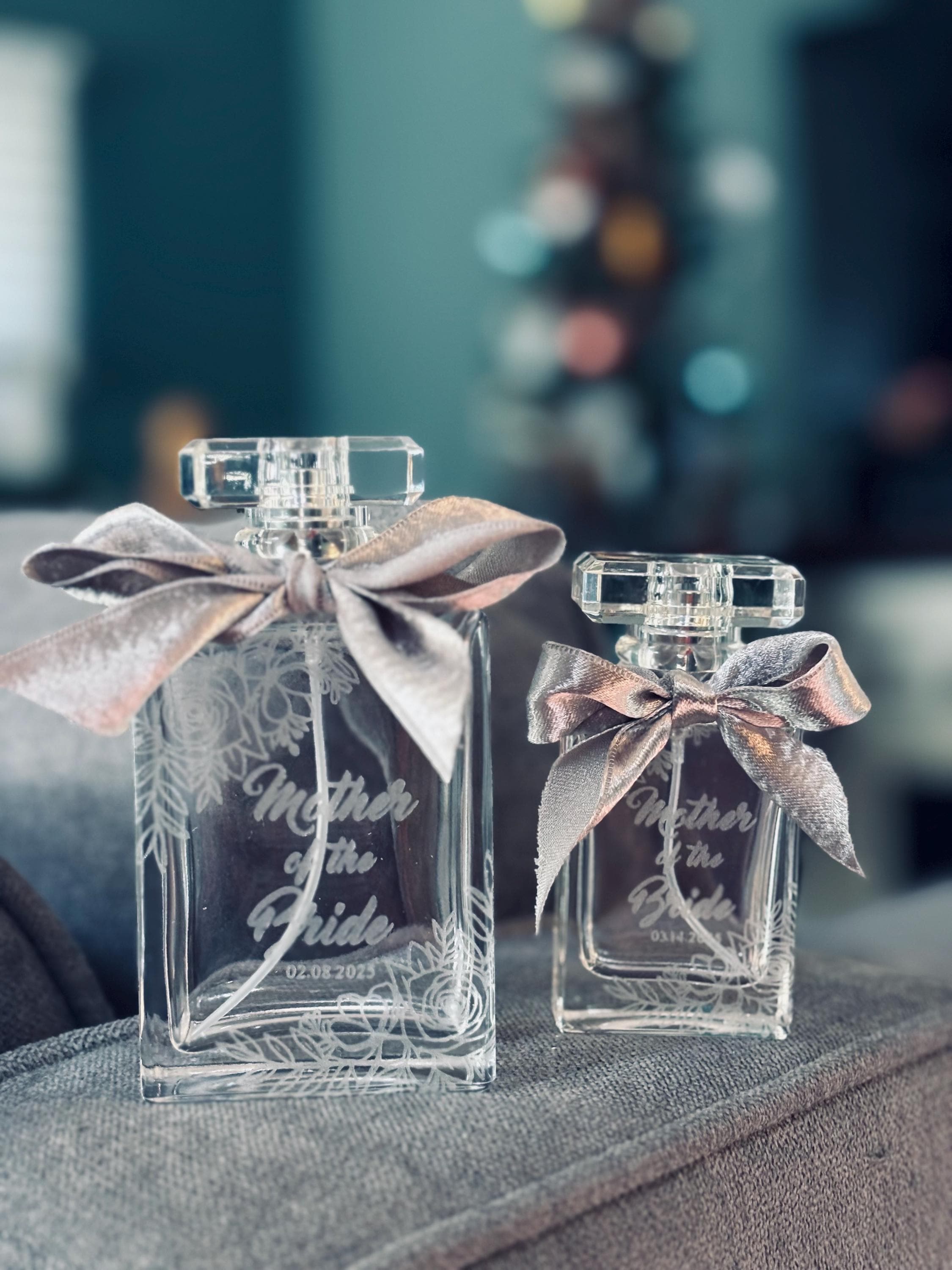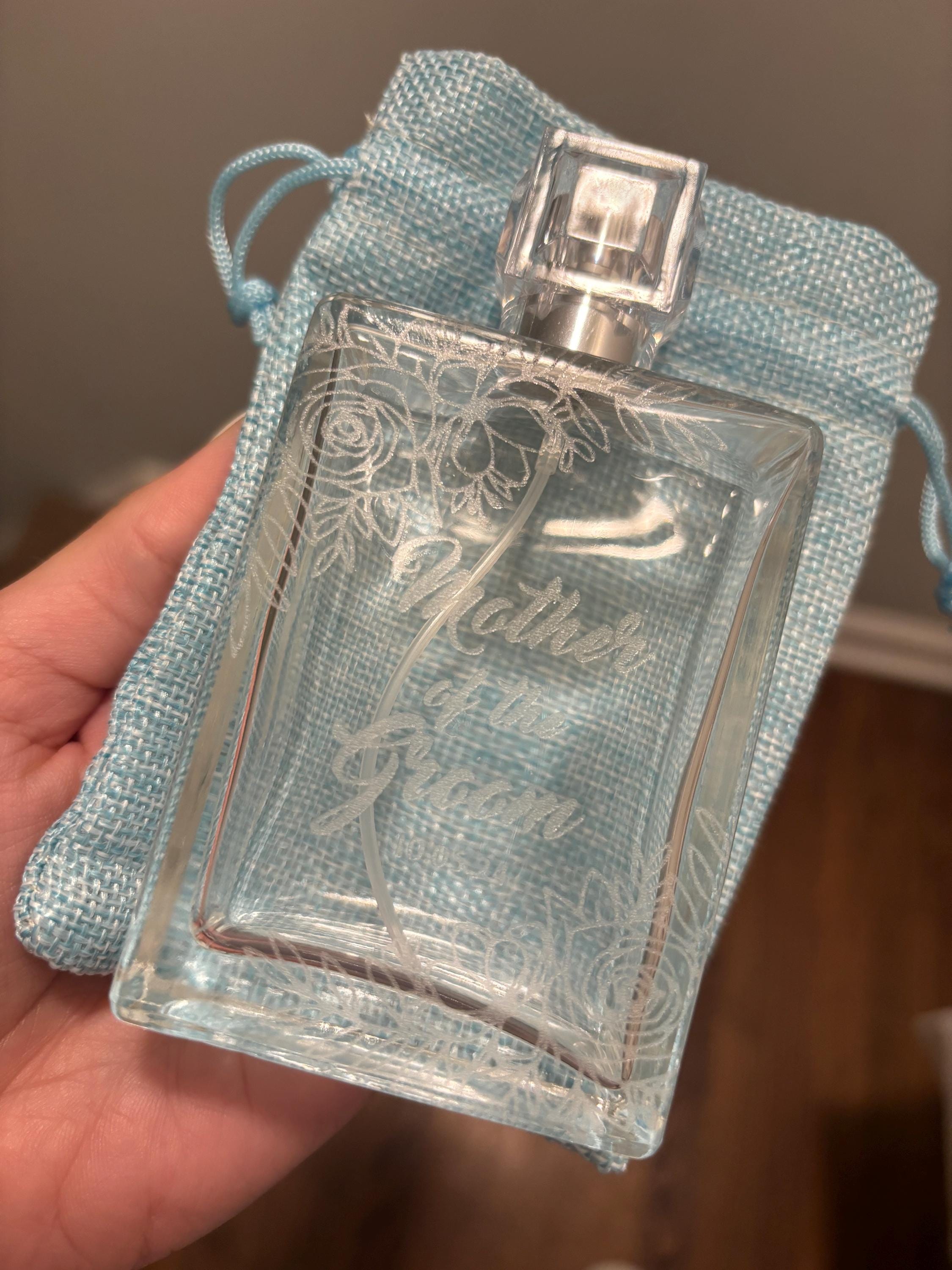 This engraved (empty) perfume bottle is the perfect gift for the Mother of the Bride and the Mother of the Groom! Our laser engraver adds the design onto an empty 3.4 oz perfume bottle. If you would like to add a date to it, please let us know in the personalize section at checkout.