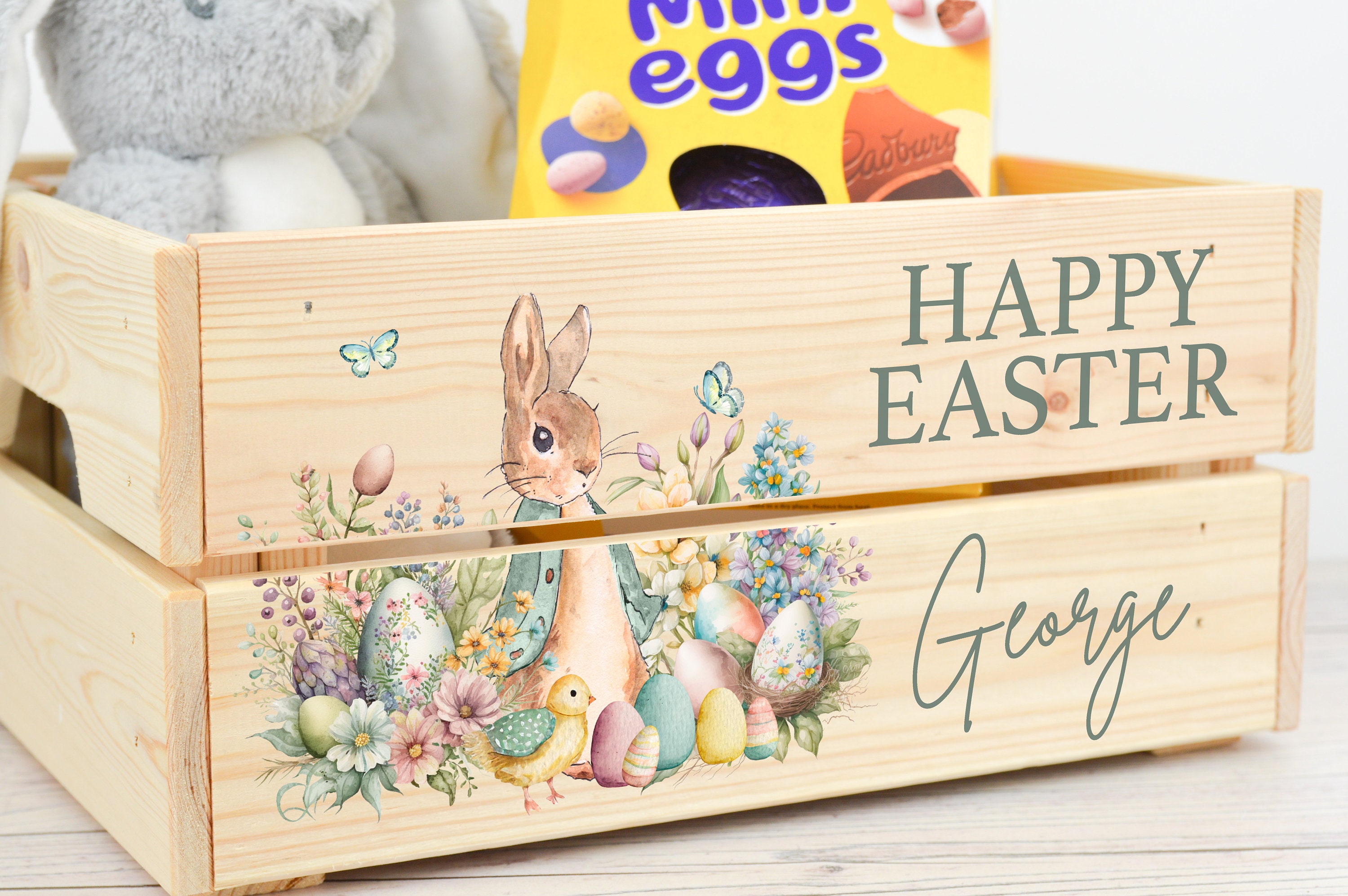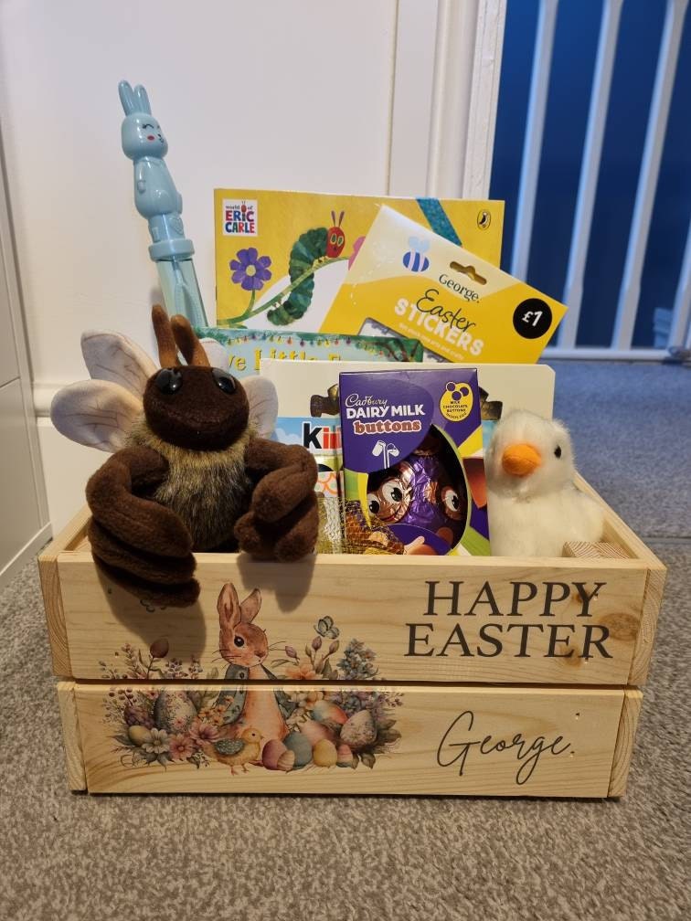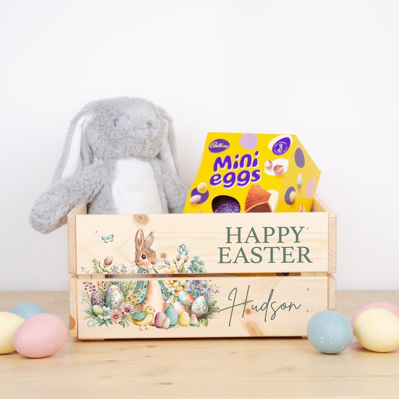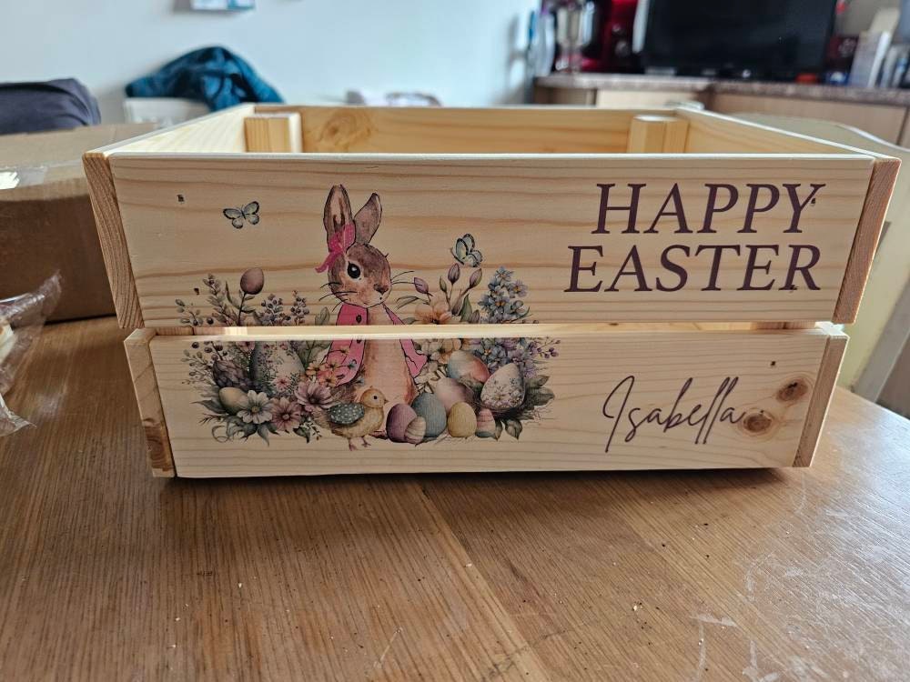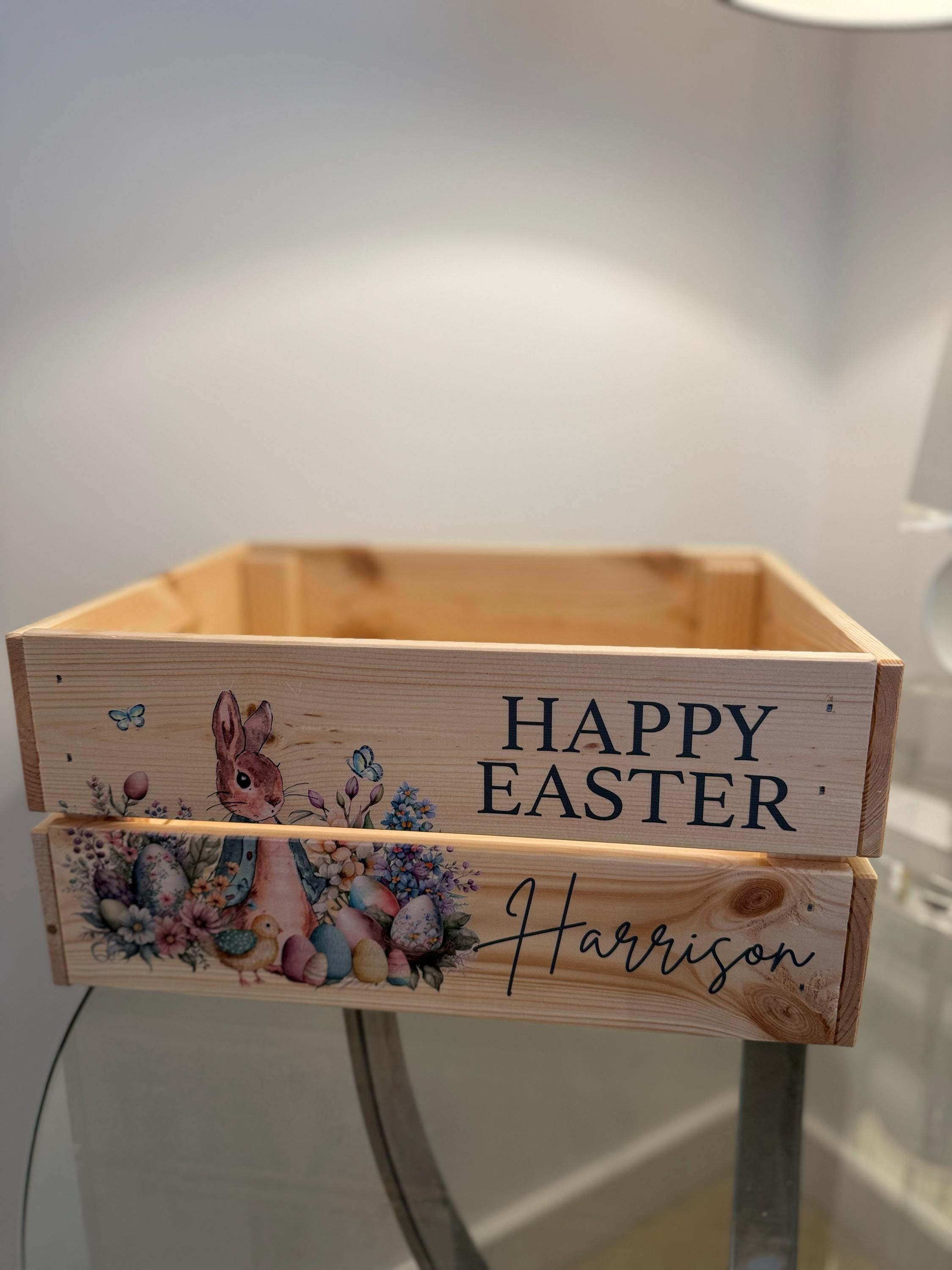 These personalised Easter crates are perfect for chocolates, sweets or toys - perfect for Easter treats! These crates can be printed with any name, perfect for adding a special touch to any Easter celebration.