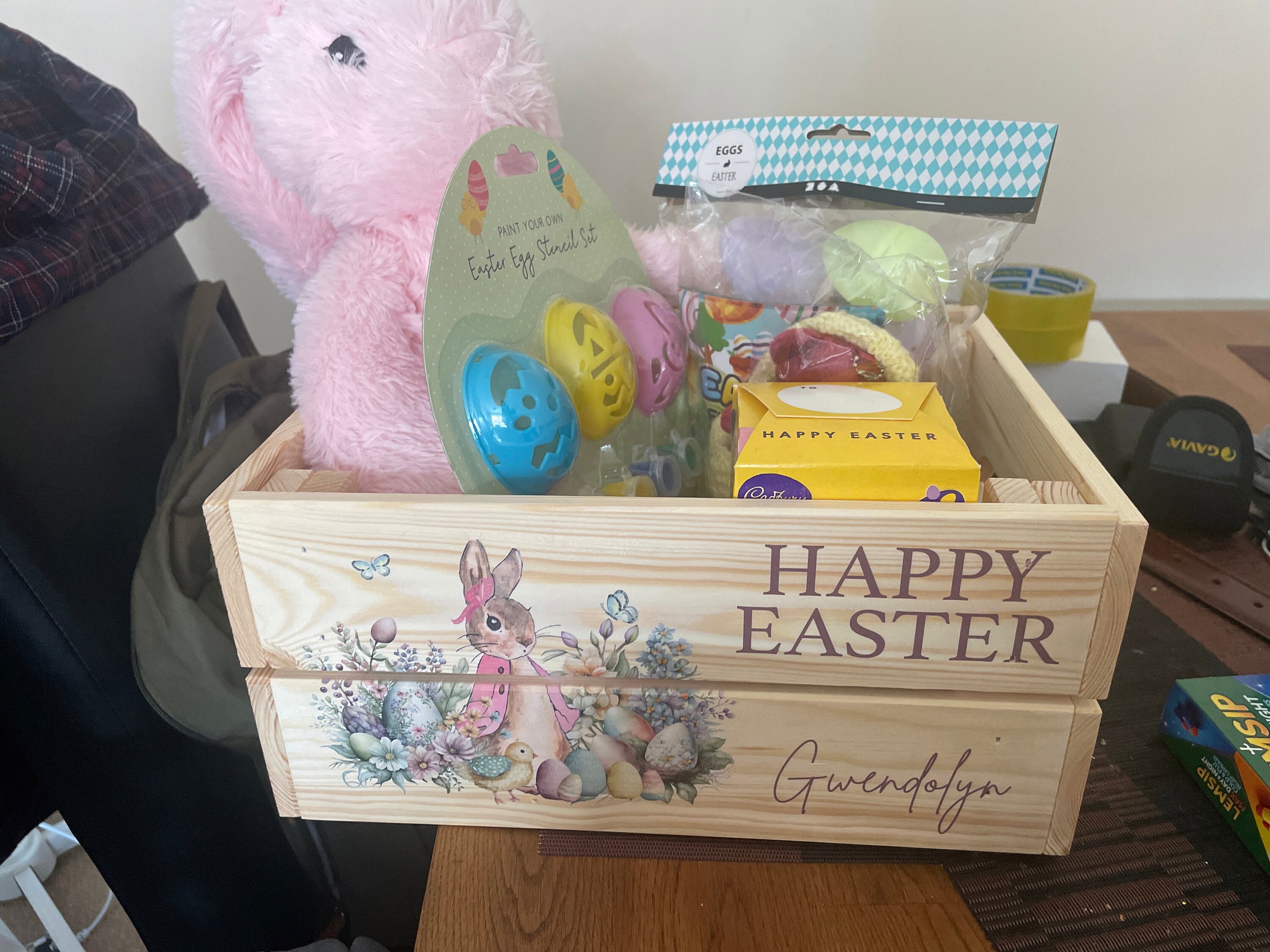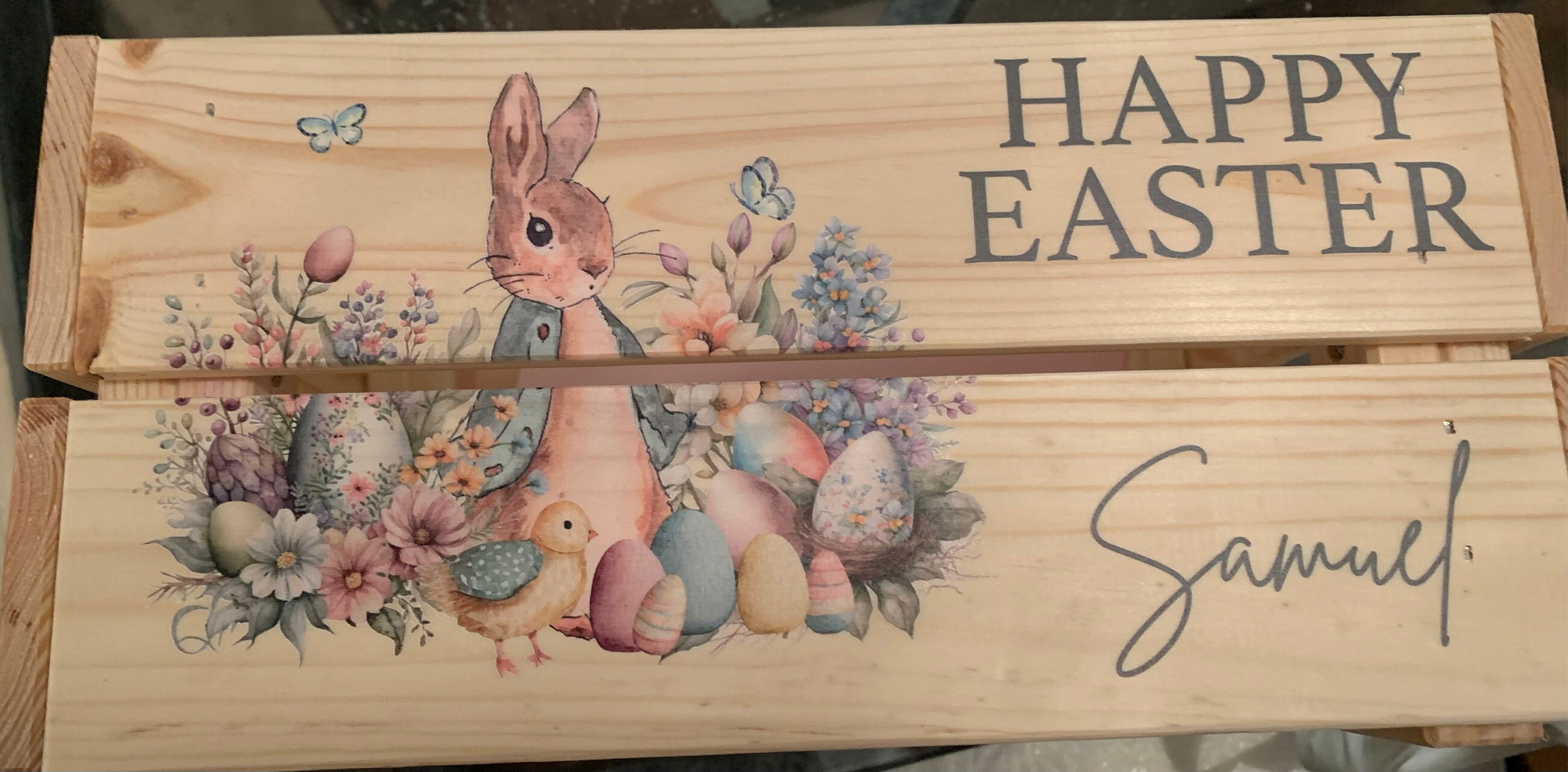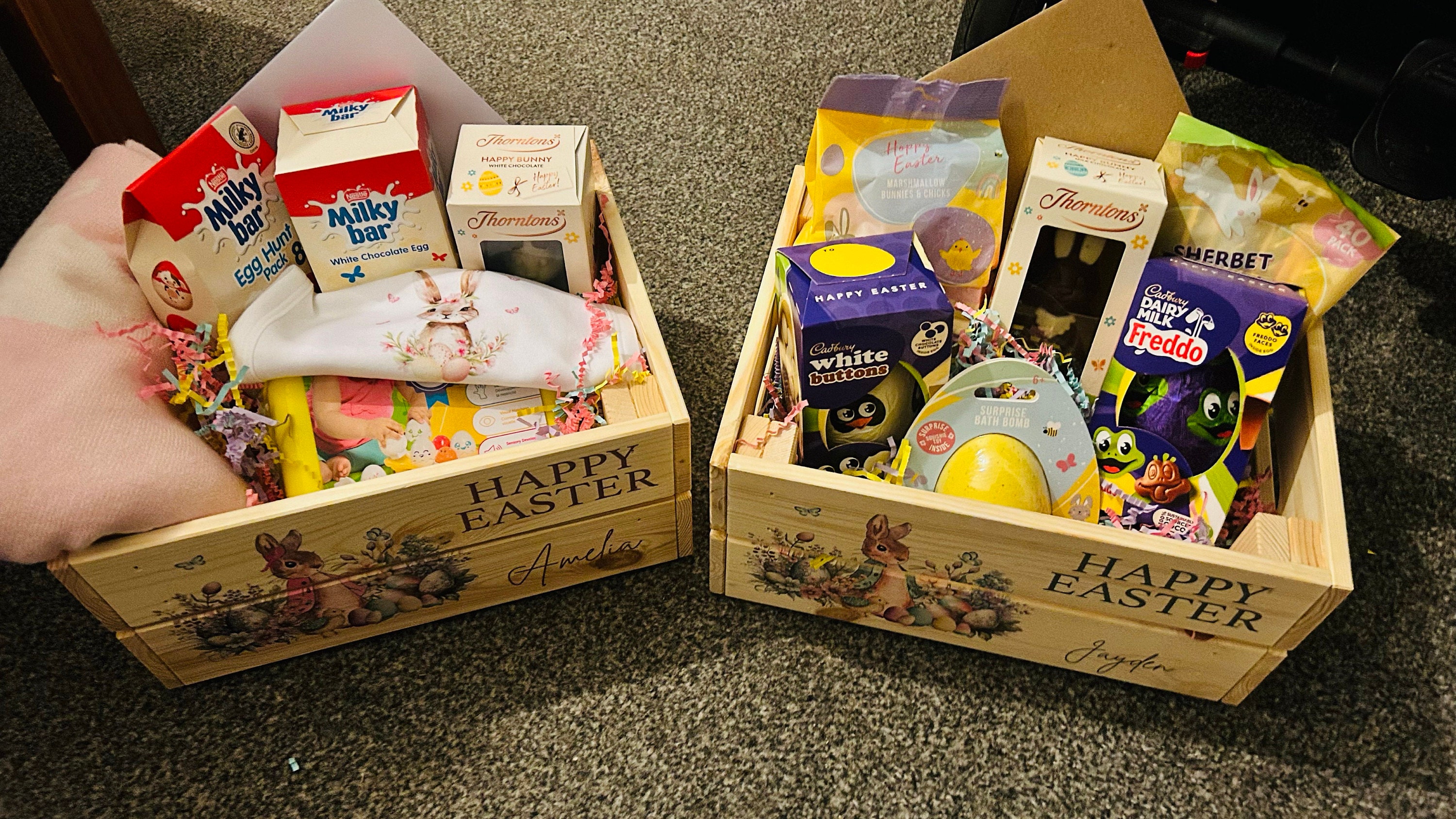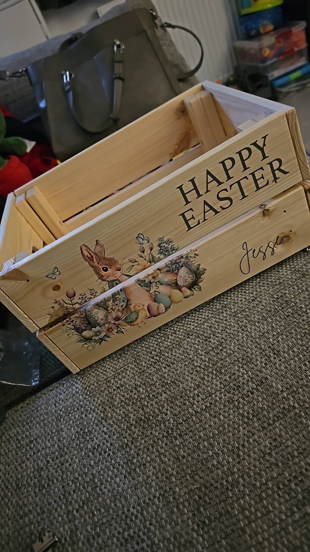 These personalised Easter crates are perfect for chocolates, sweets or toys - perfect for Easter treats! These crates can be printed with any name, perfect for adding a special touch to any Easter celebration.