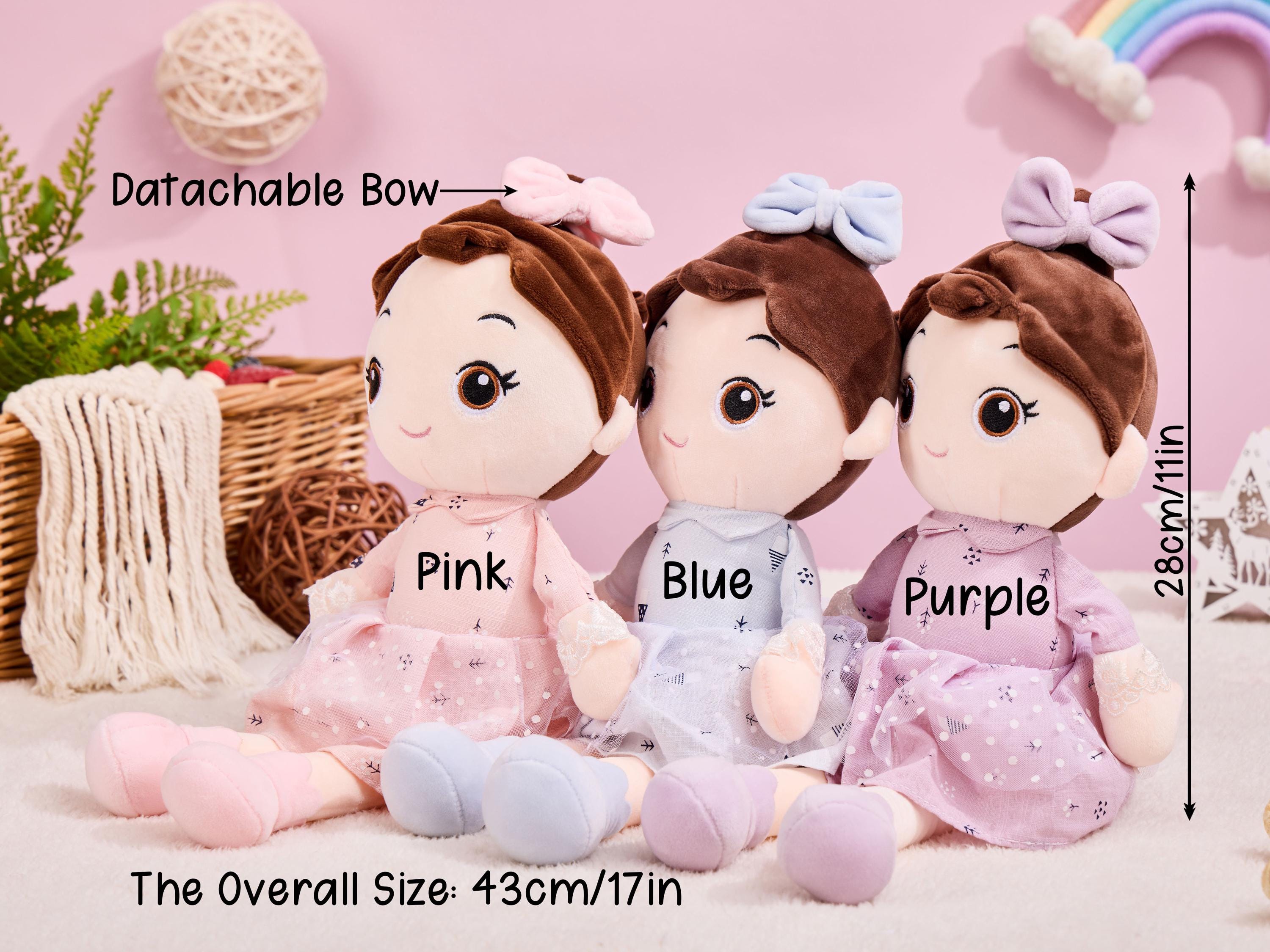 3. Doll Colors: We offer blue, pink, and purple for your choice, and each doll is adorable and cute.