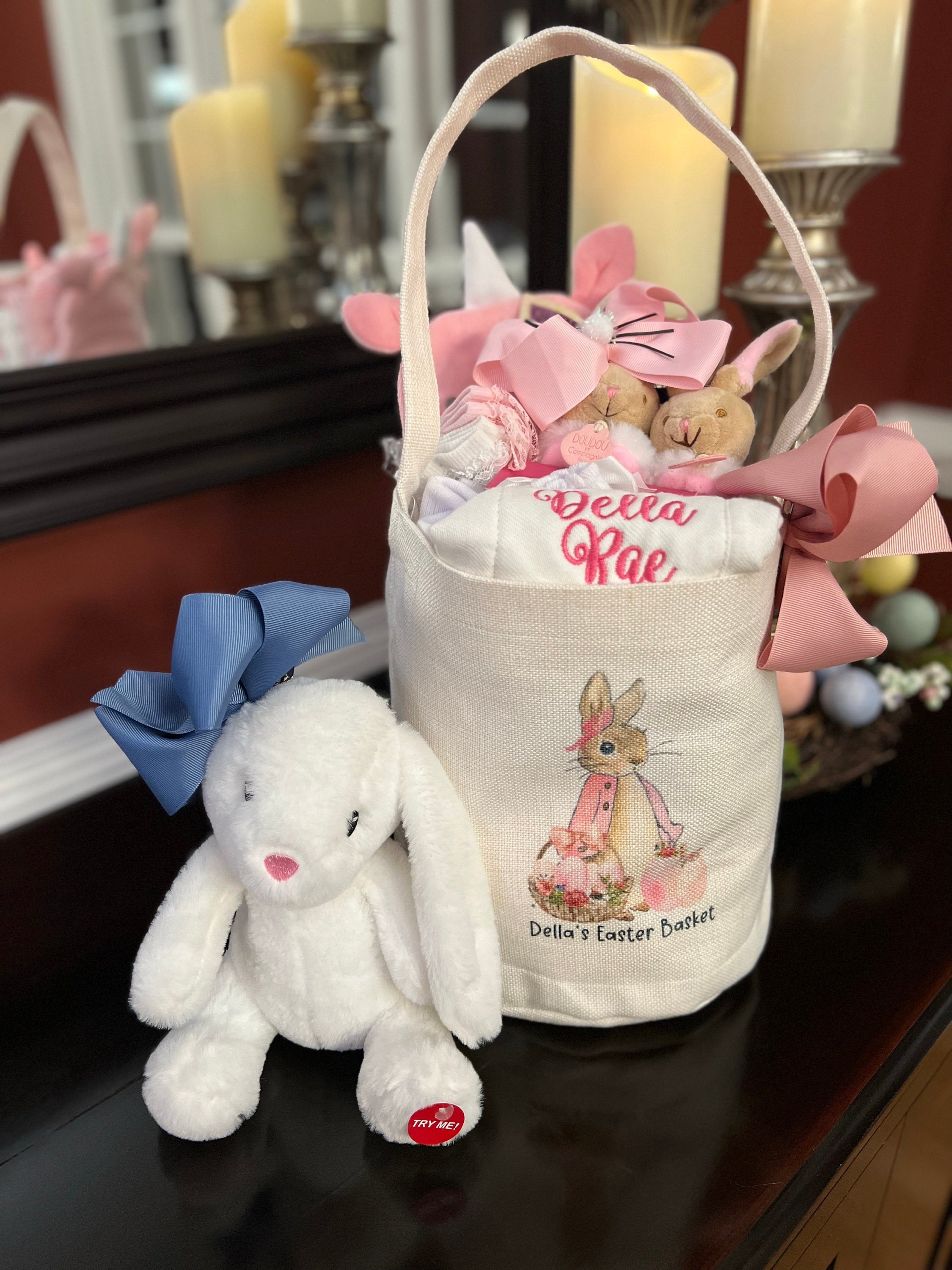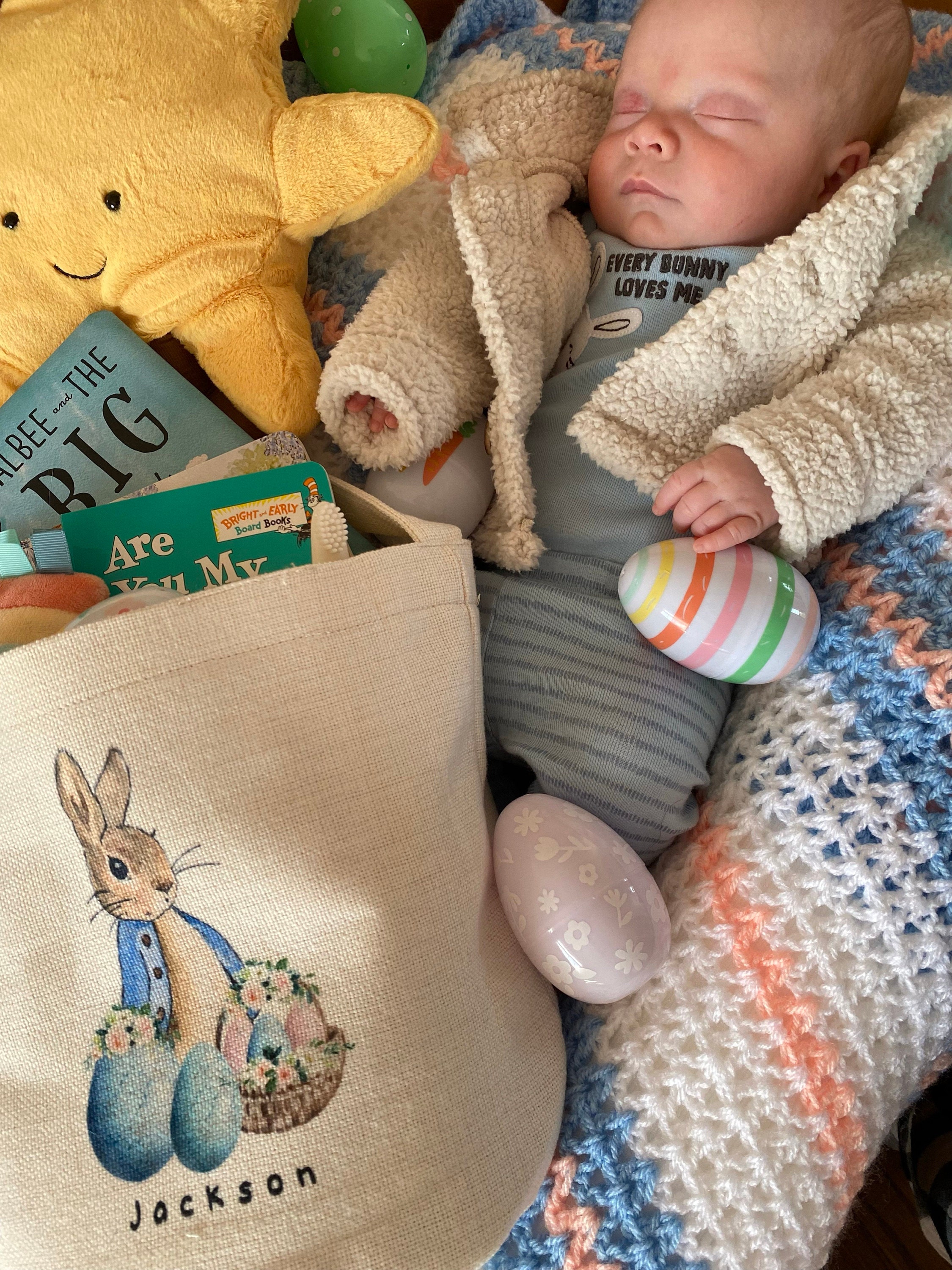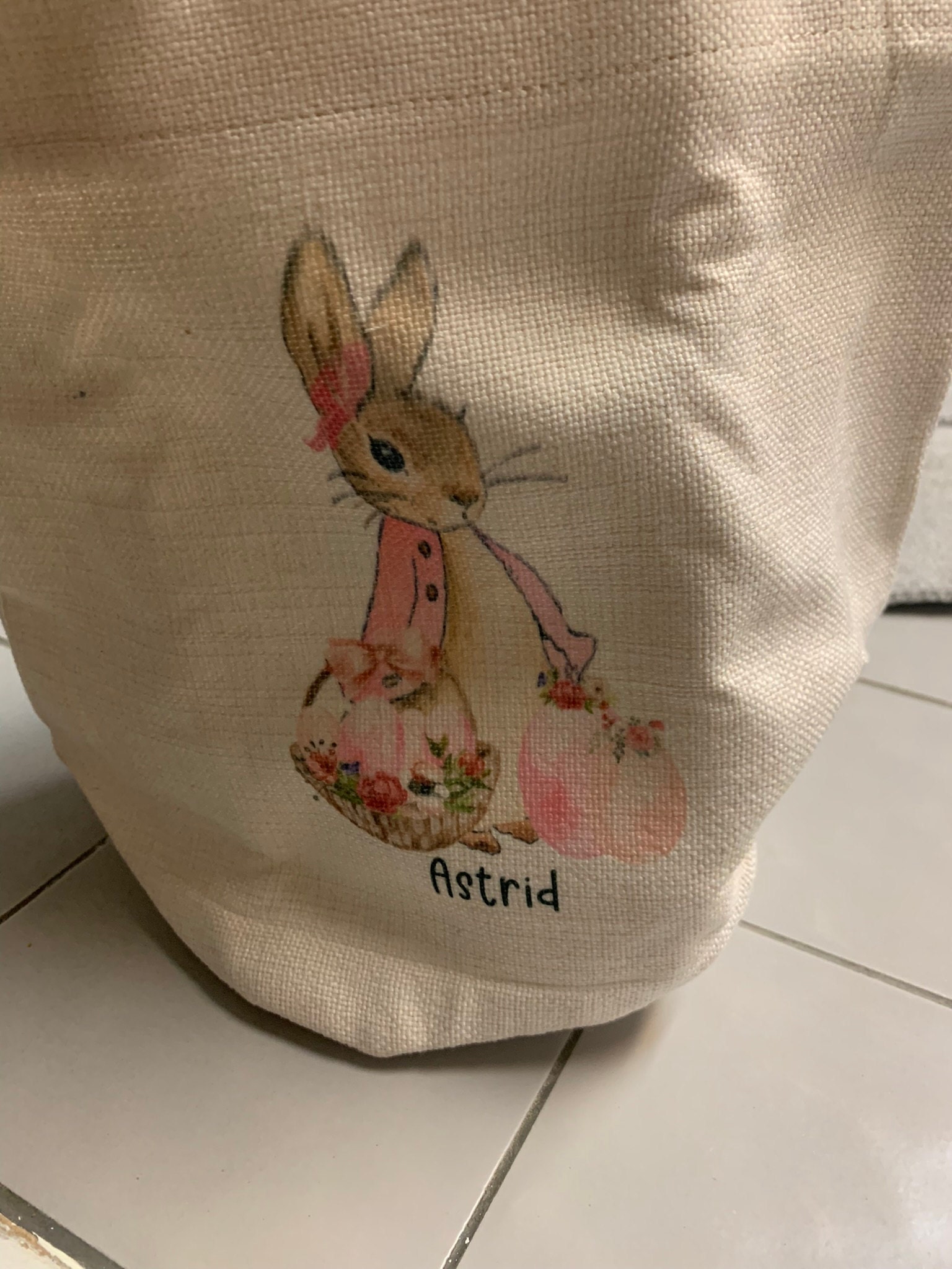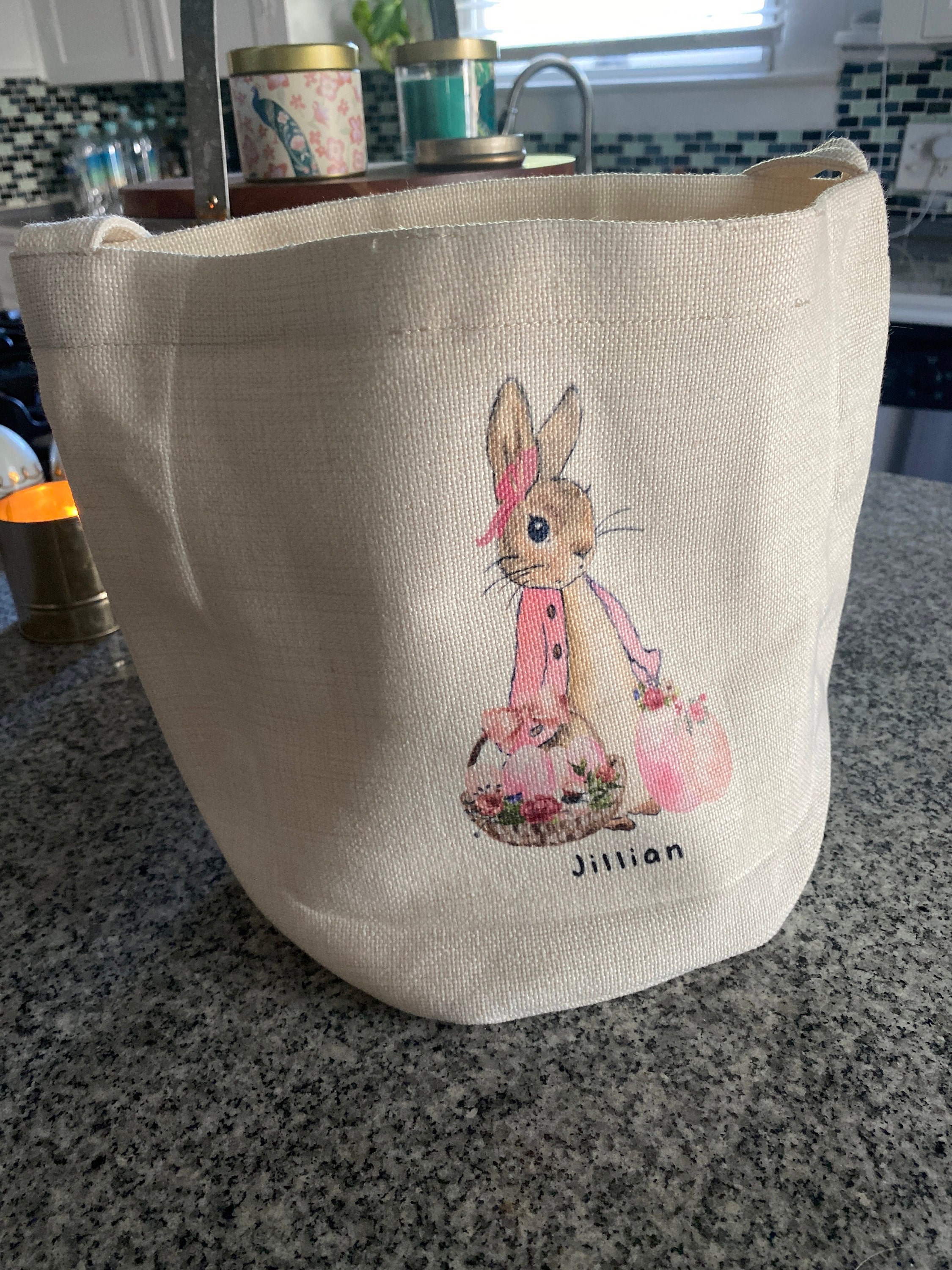 Customize an Easter Basket! The perfect gift for a first Easter, or first time celebrating together, or to have a memorable family gathering. The basket is functionable for holding gifts Easter morning, or for an Easter egg hunt, or other creative uses. The ink transfered image will last without cracking or fading for this item to be folded away as a meaningful keepsake.